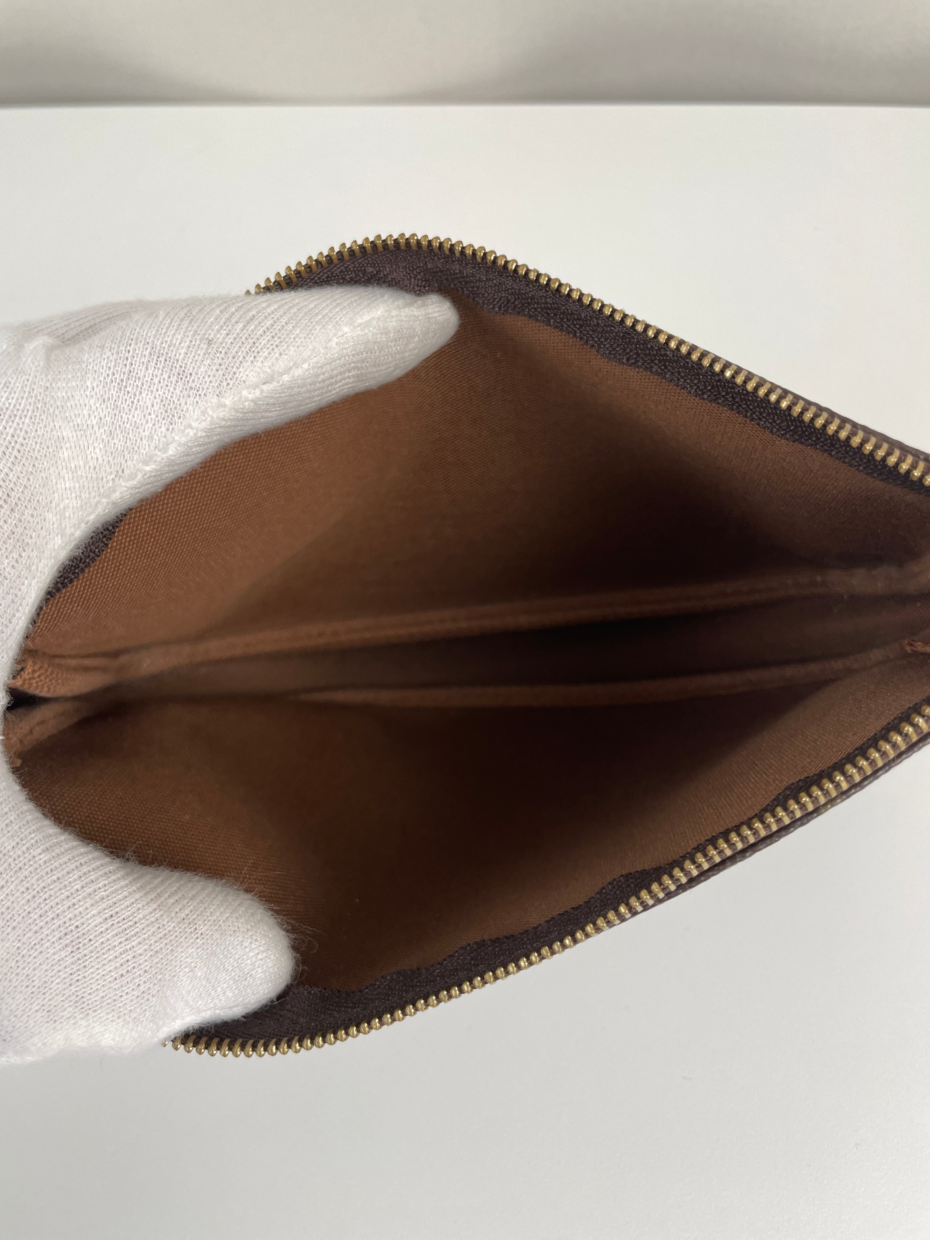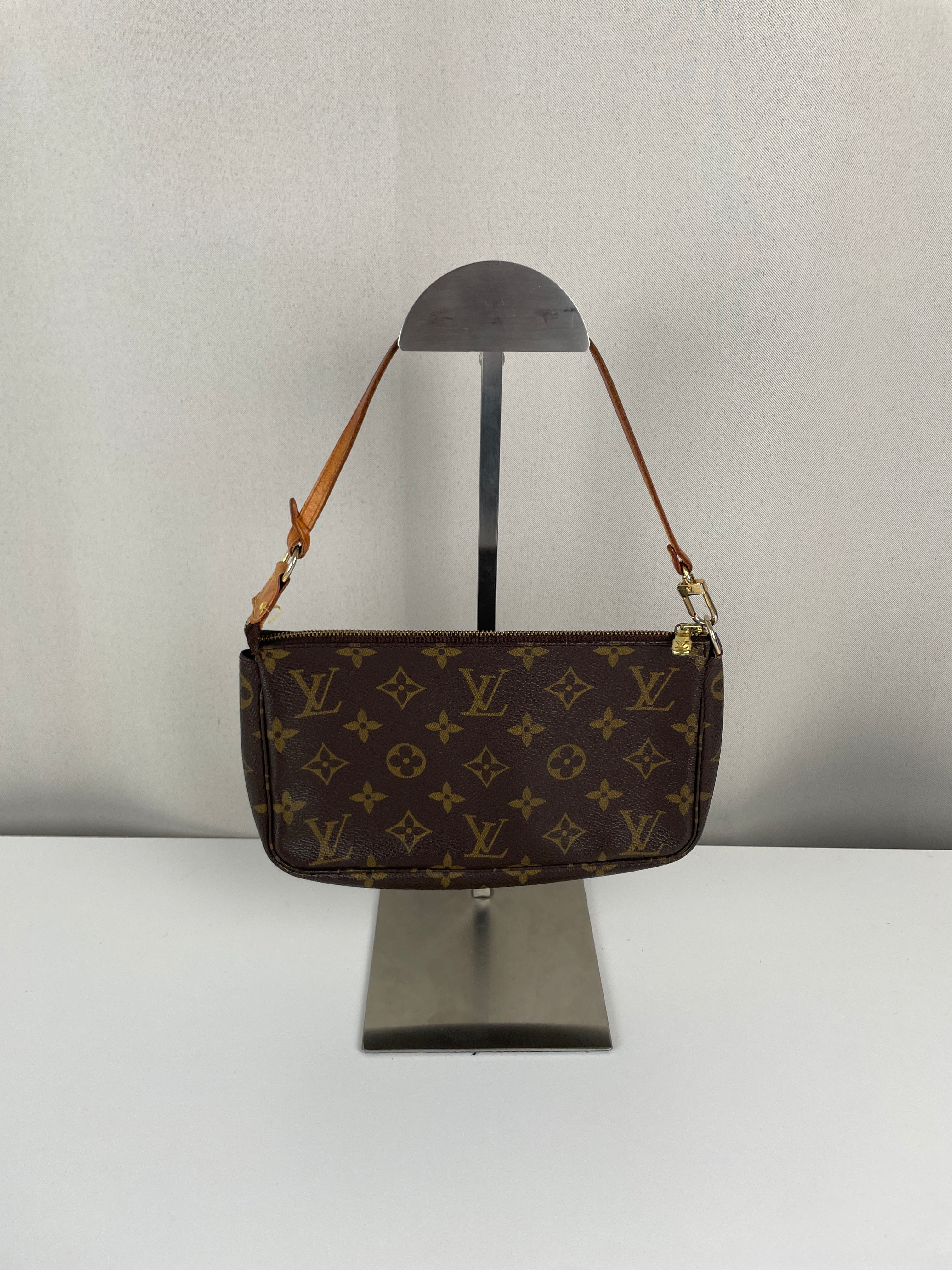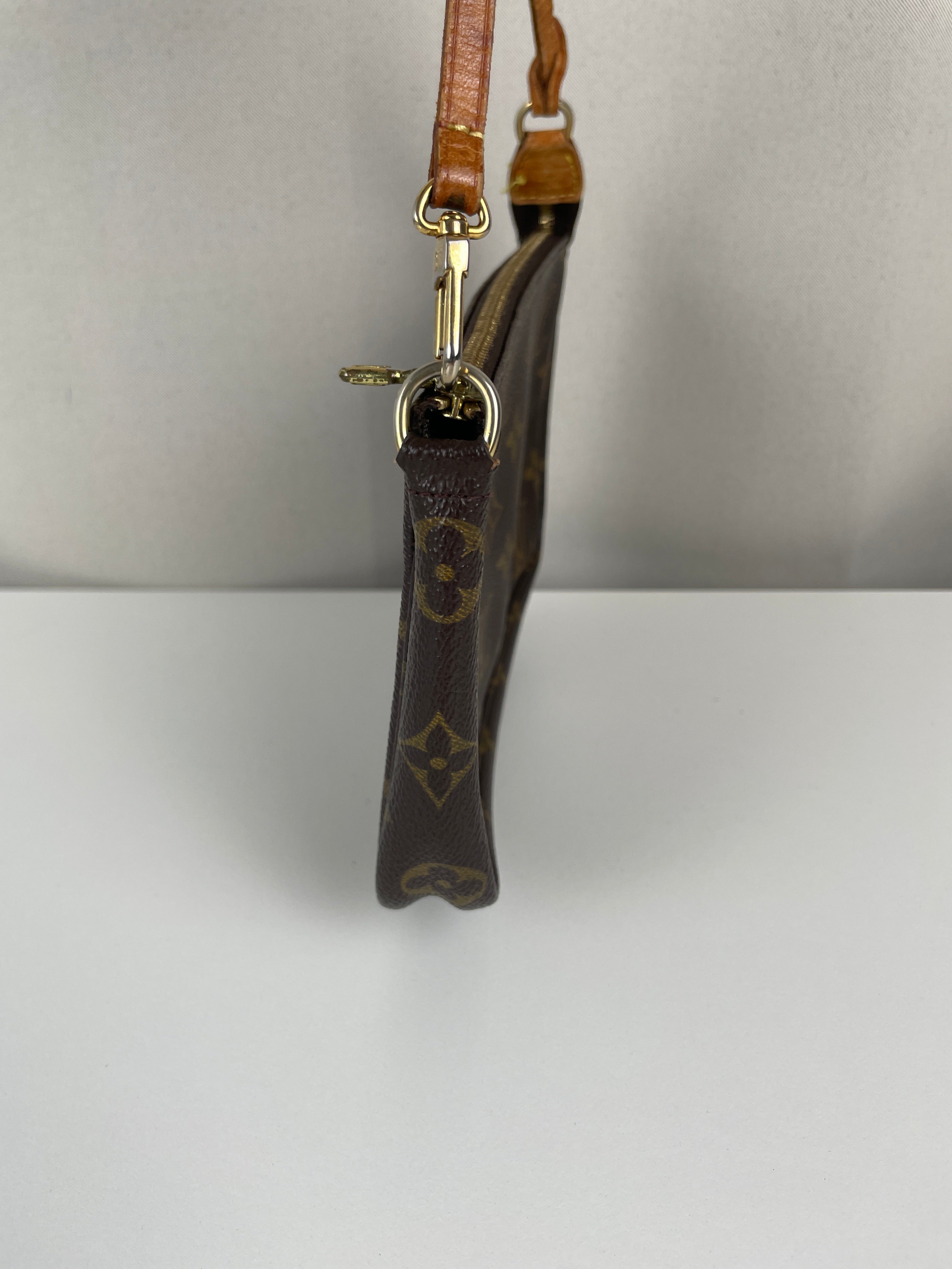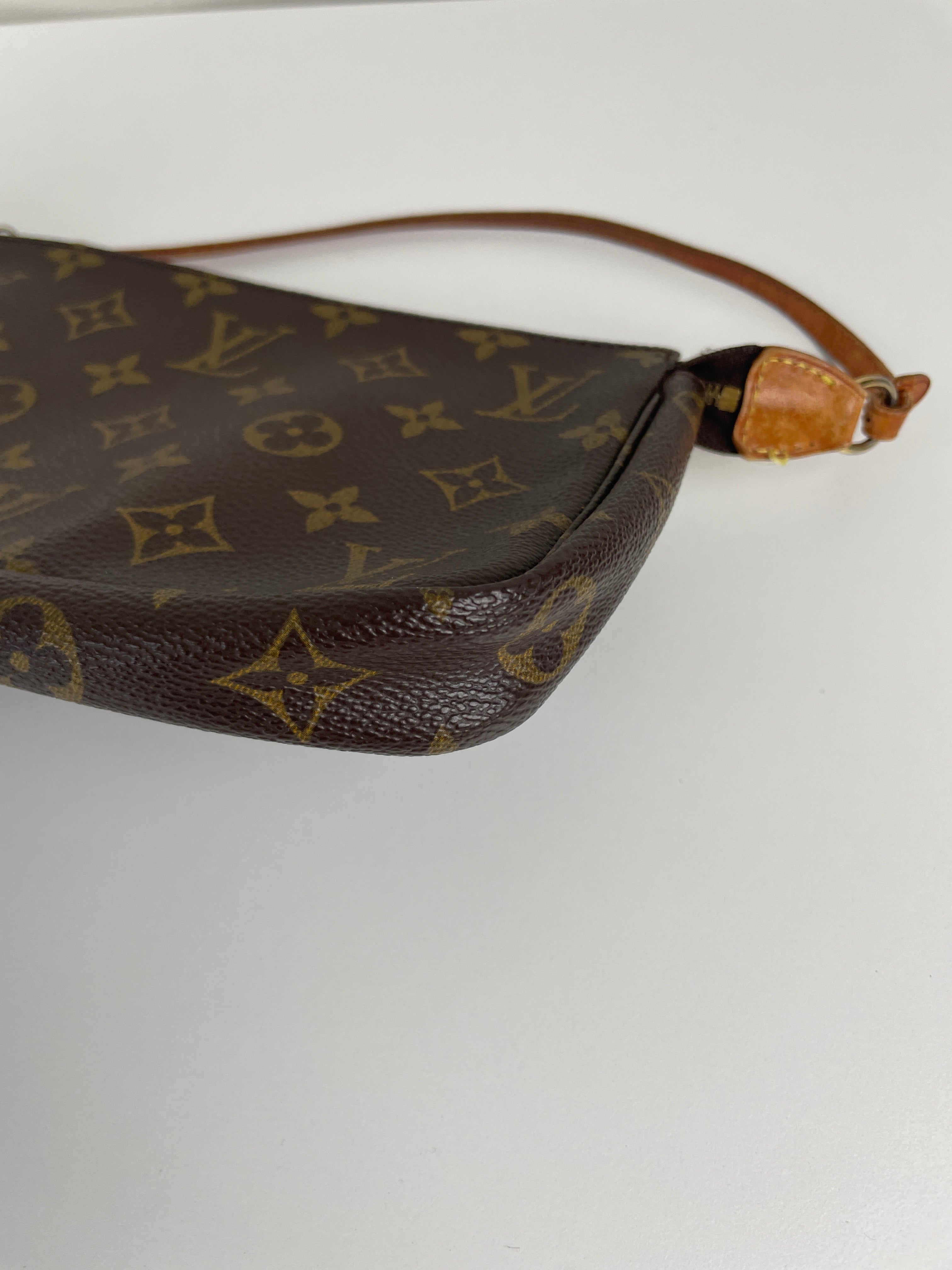 This Louis Vuitton Pochette Accessoire is in good condition. The canvas and the corners are in good condition. The leather part on the bag is little bit used and the seam is a little bit damaged. The strap is in good condition. The interior is in good condition.