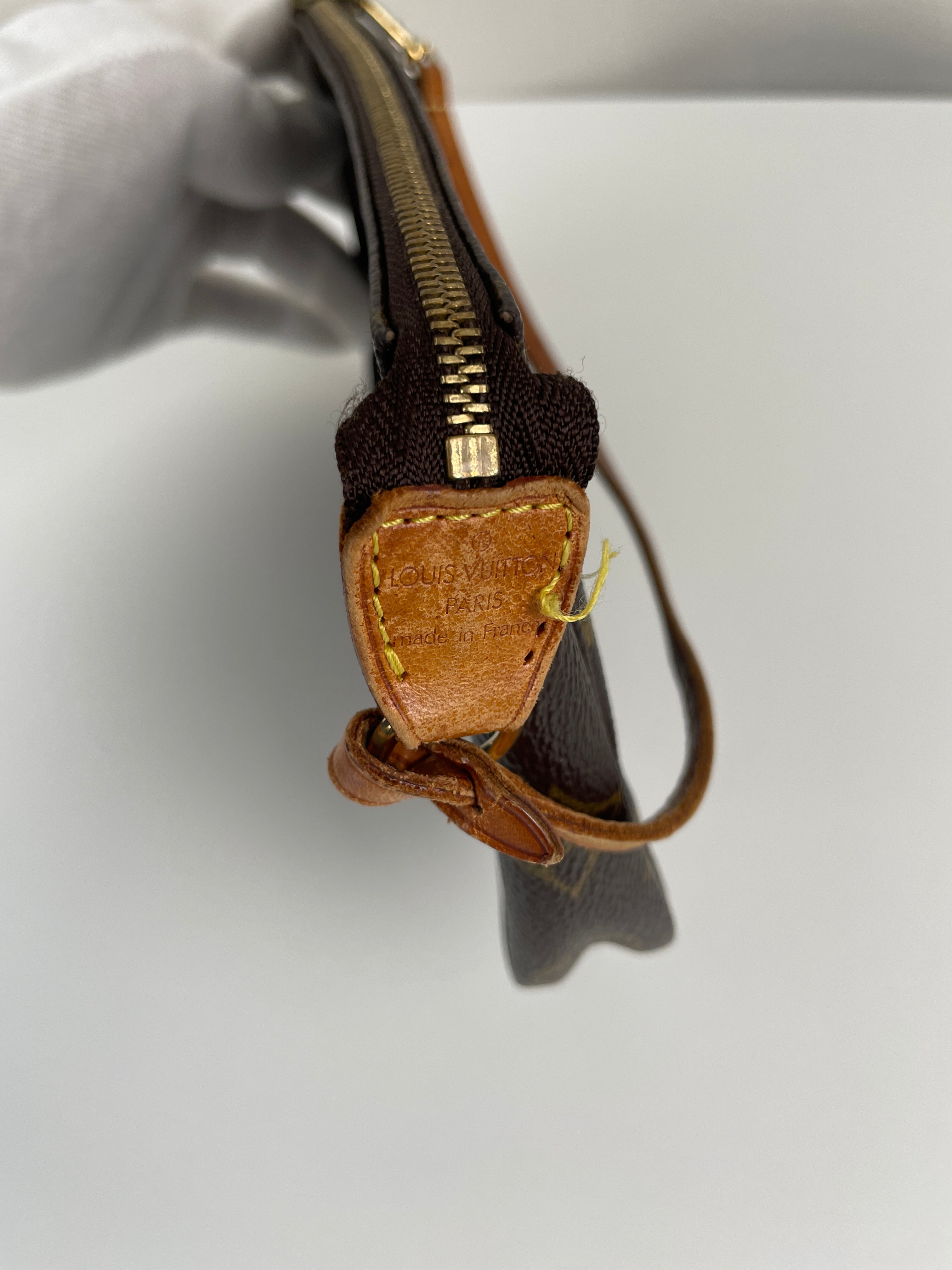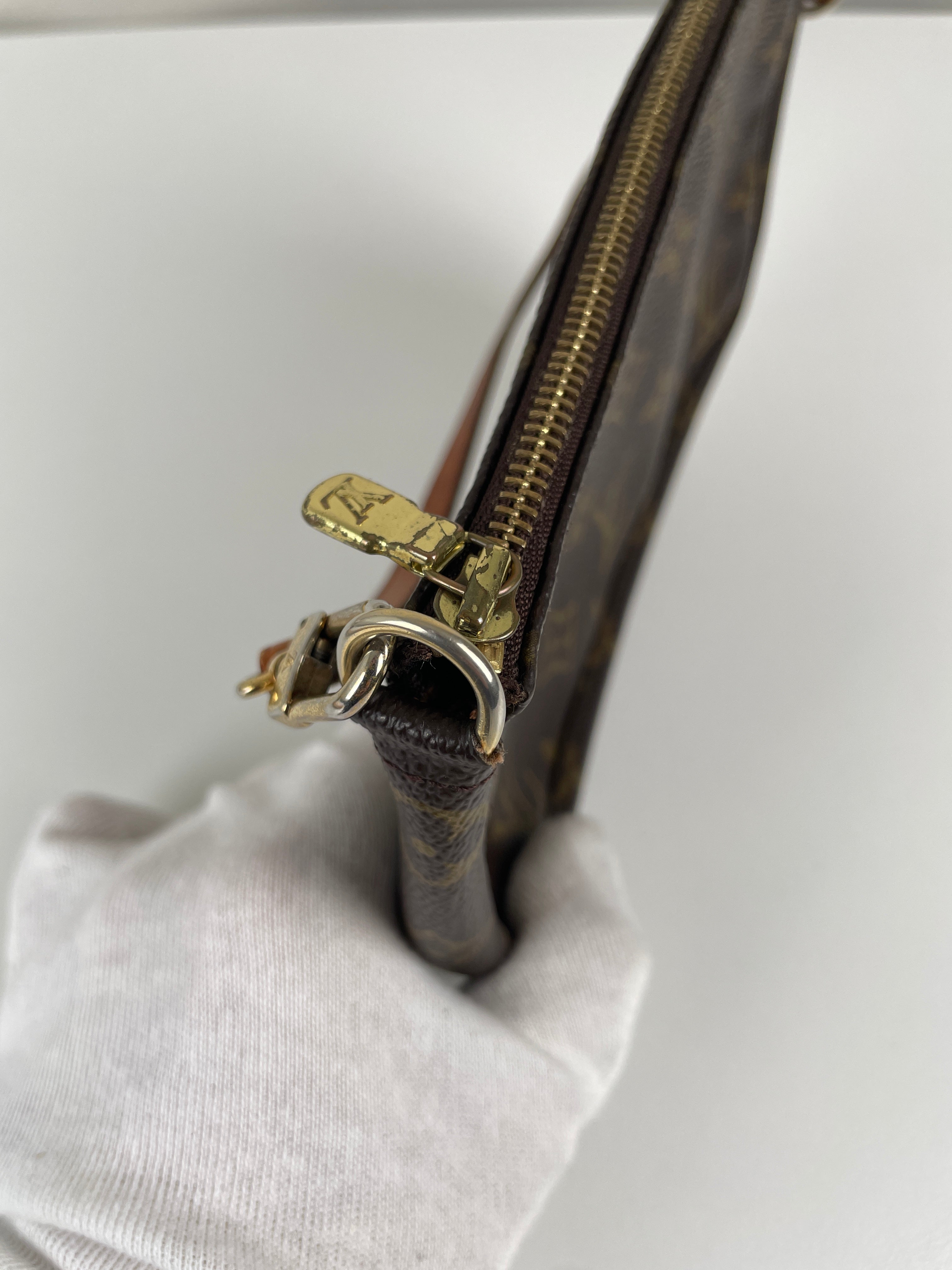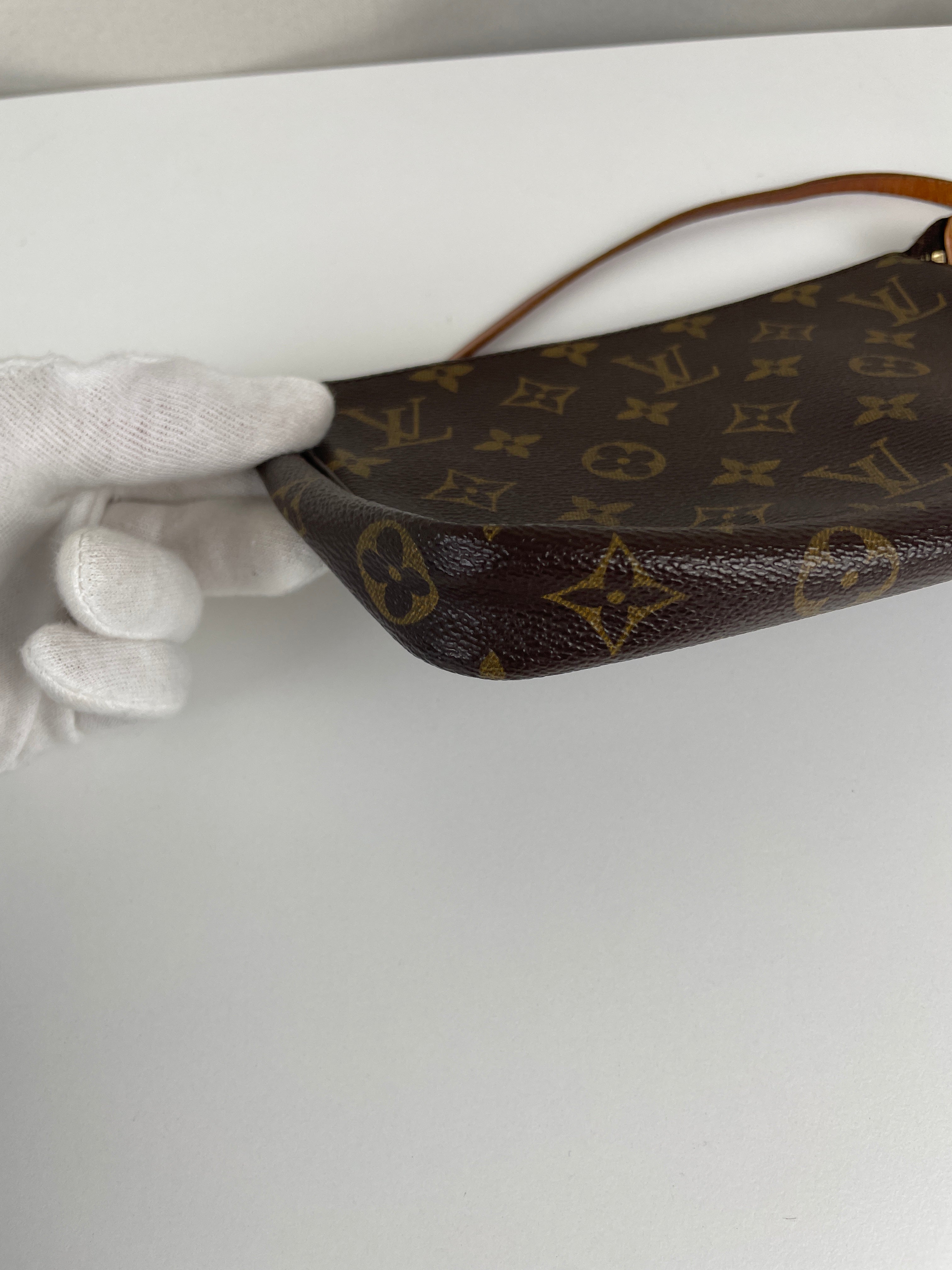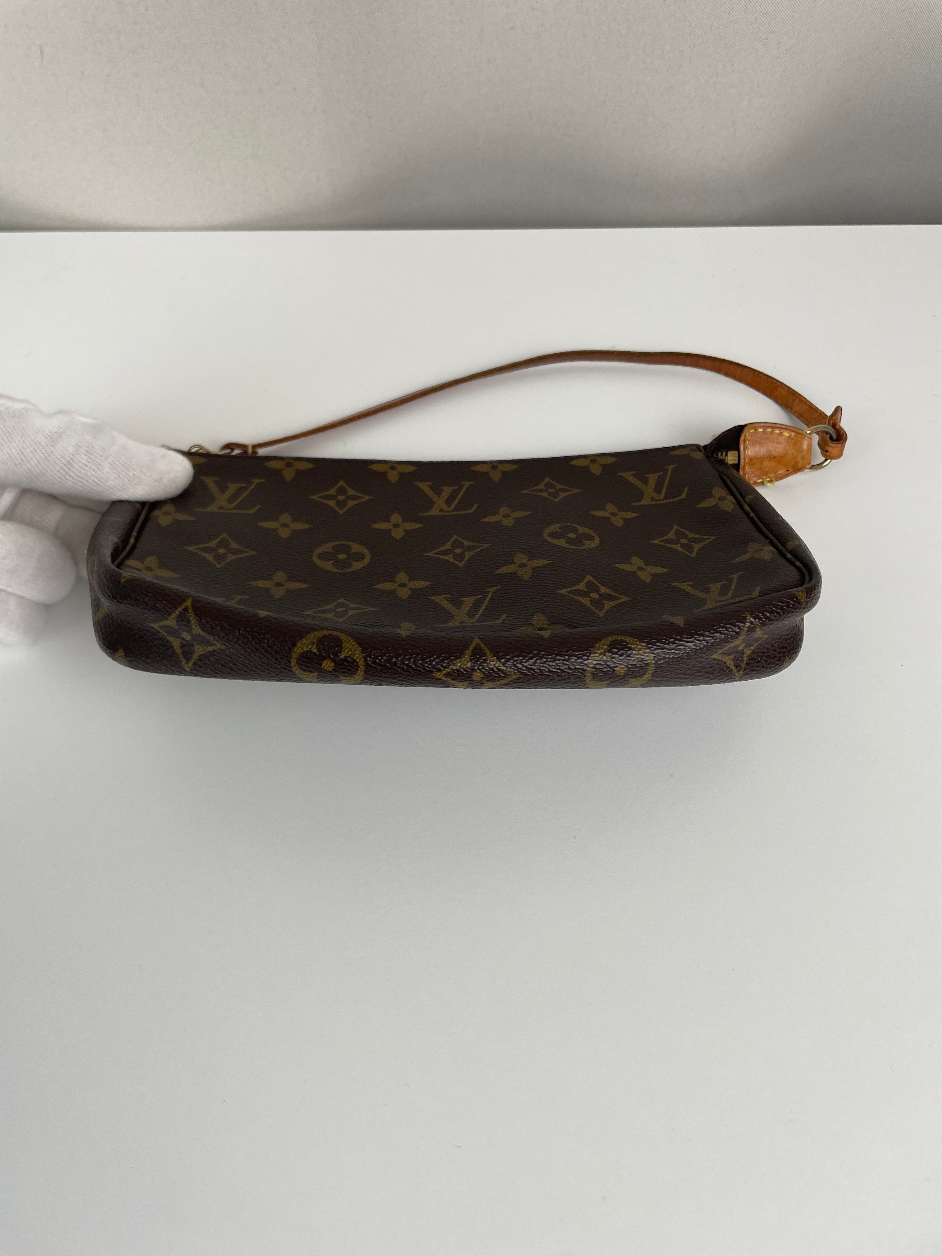 This Louis Vuitton Pochette Accessoire is in good condition. The canvas and the corners are in good condition. The leather part on the bag is little bit used and the seam is a little bit damaged. The strap is in good condition. The interior is in good condition.