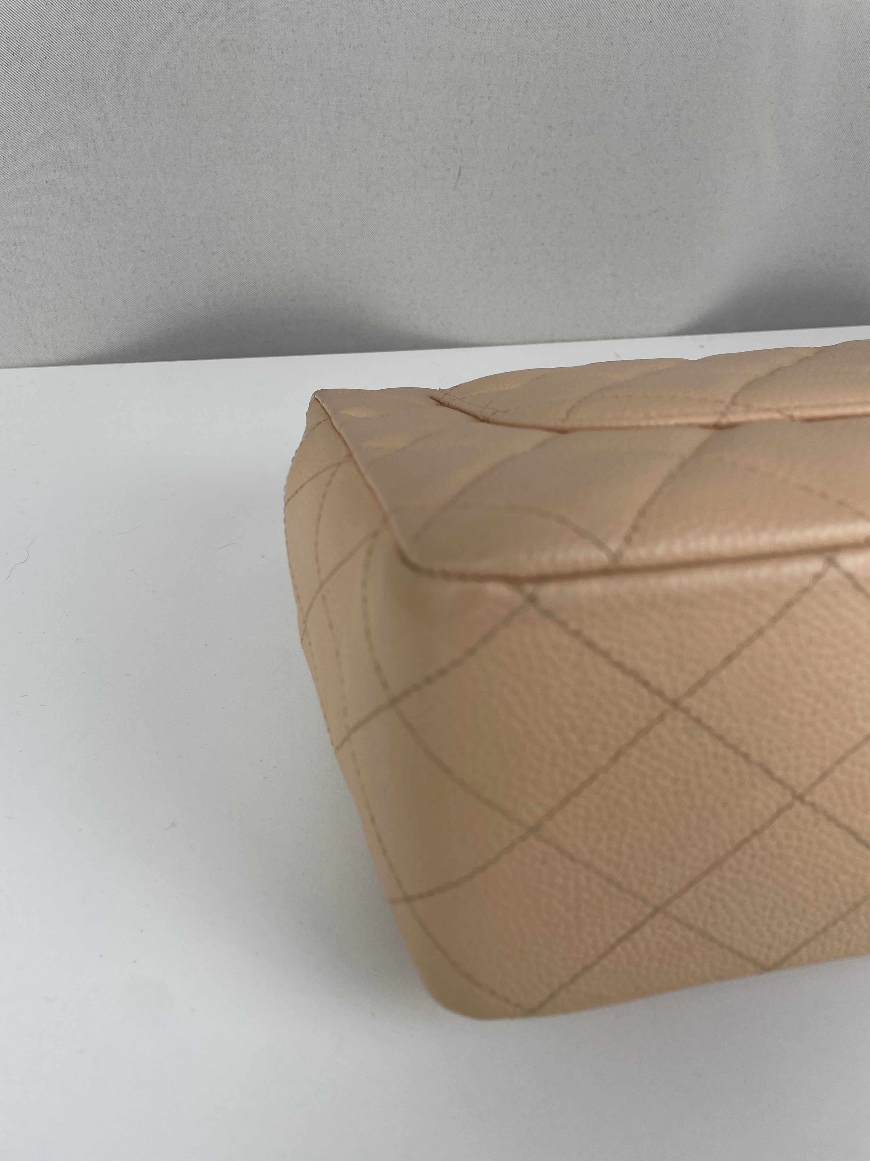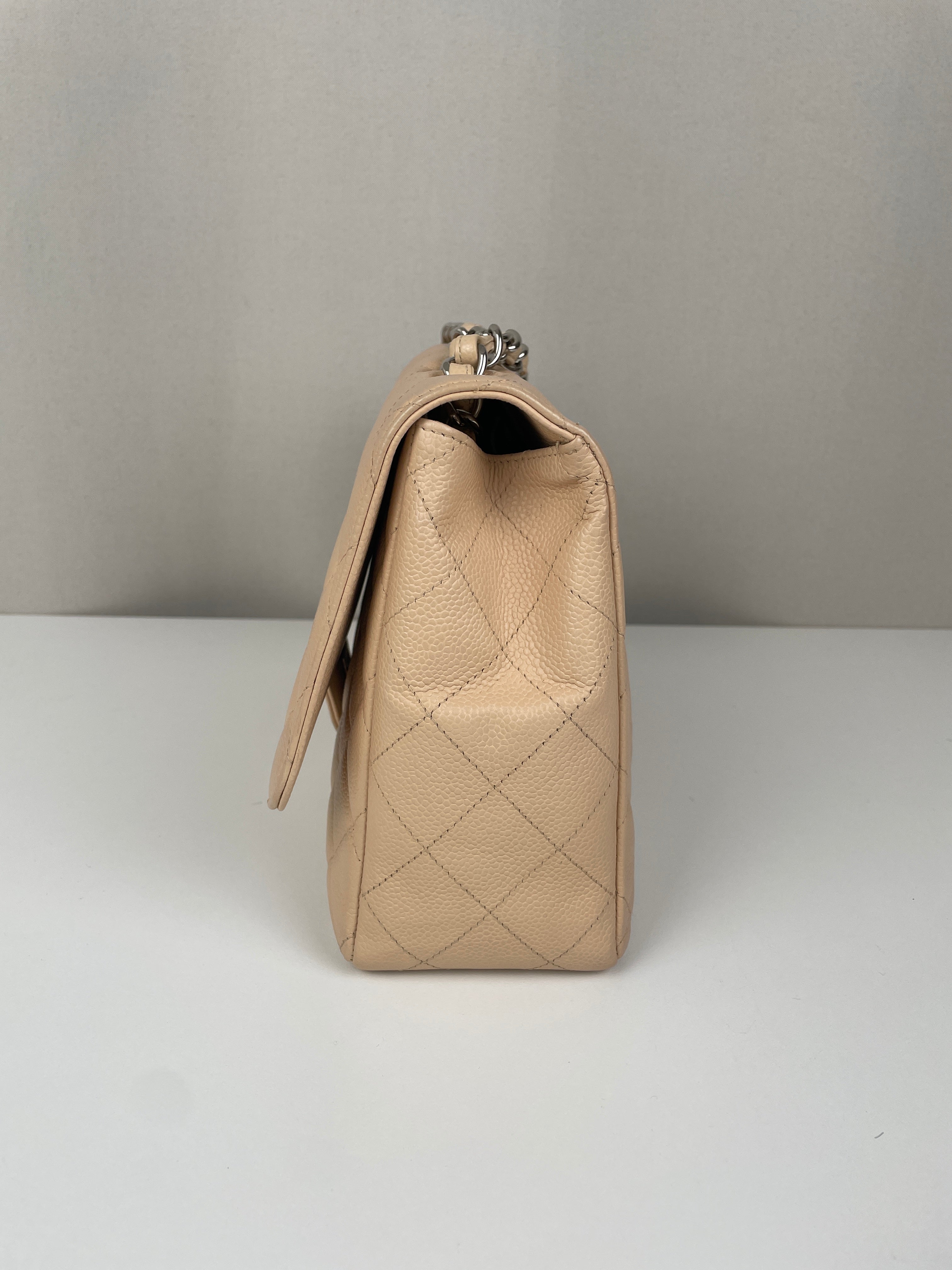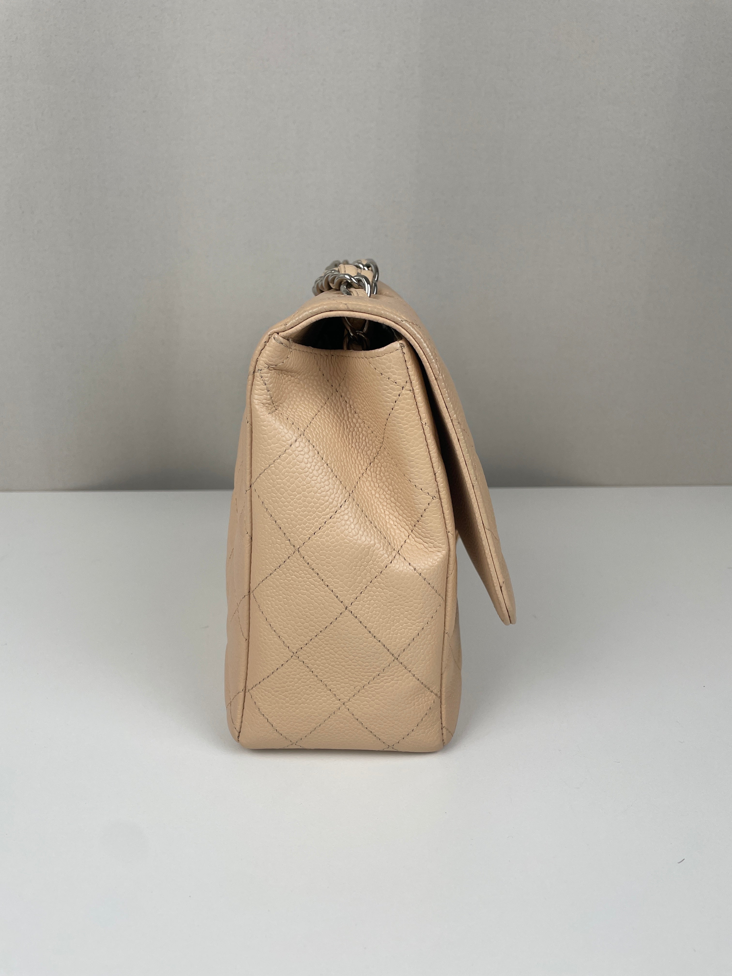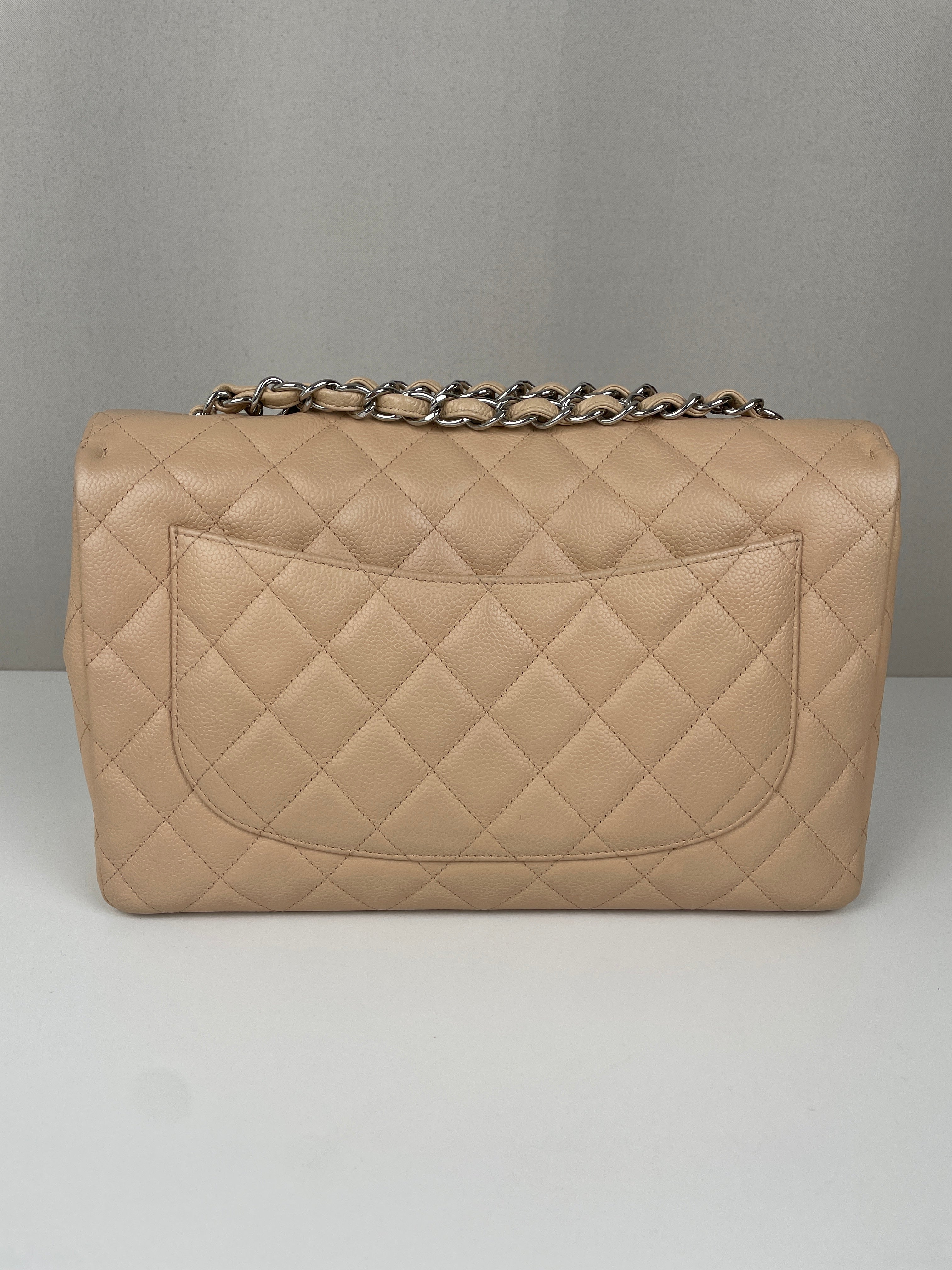 This Chanel Jumbo beige grained leather is in very good condition. The leather is in very good condition. The corners are in very good condition. The hardware is in very good condition and silver. Very good inside condition. The left part of the pocket is a bit damaged due to use. The bags comes with hologram, authentification card, dustbag and a bag organiser.