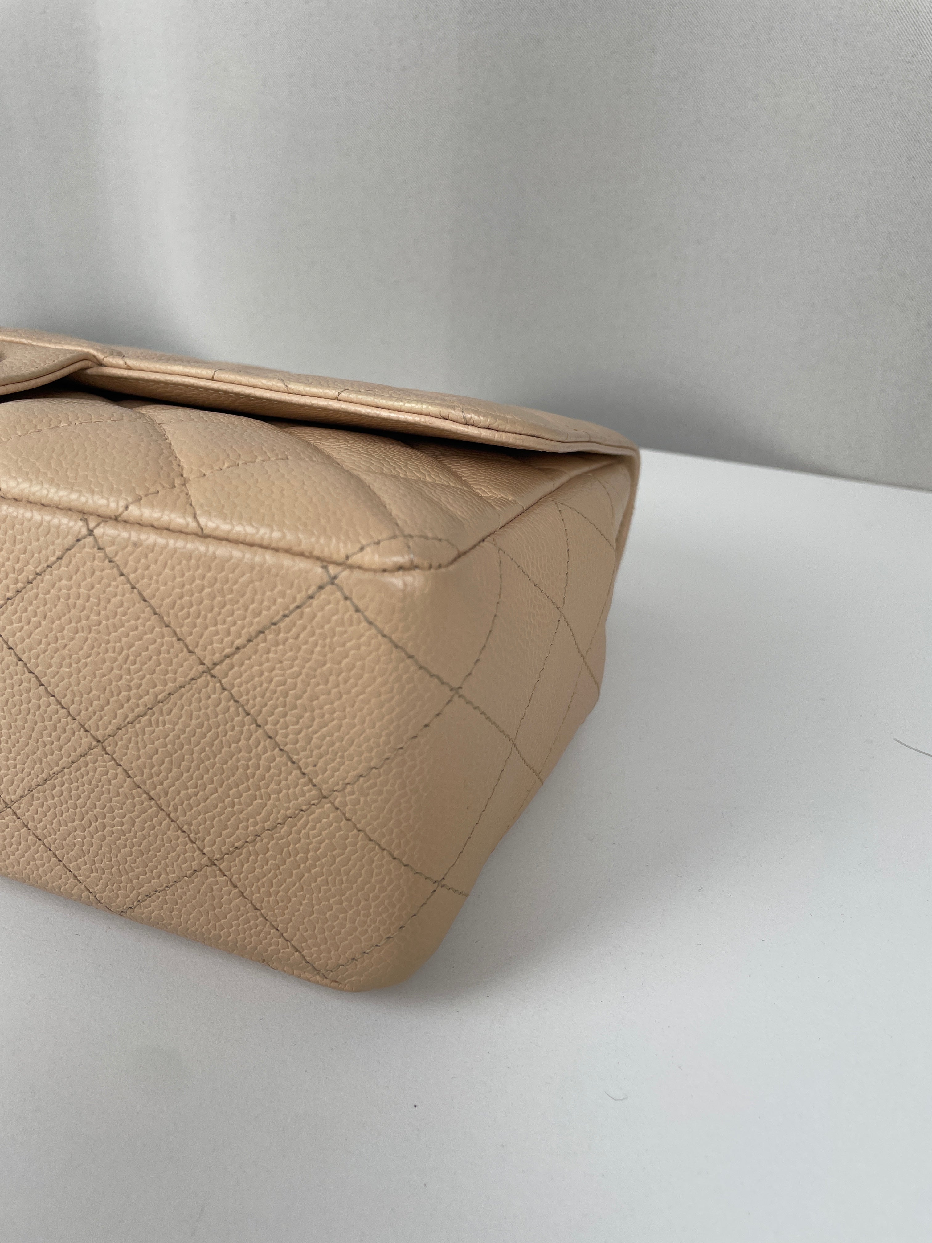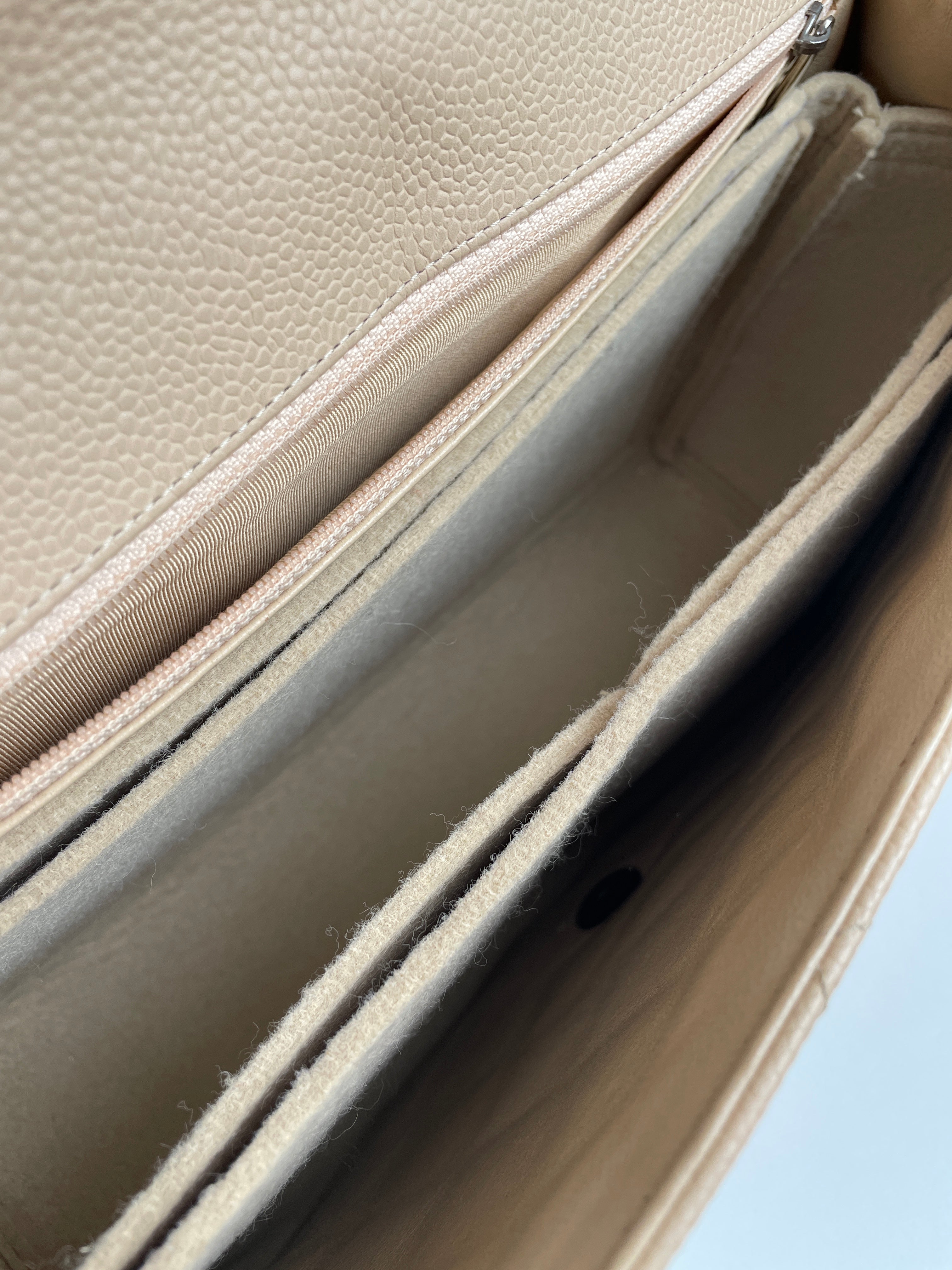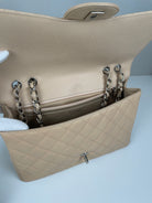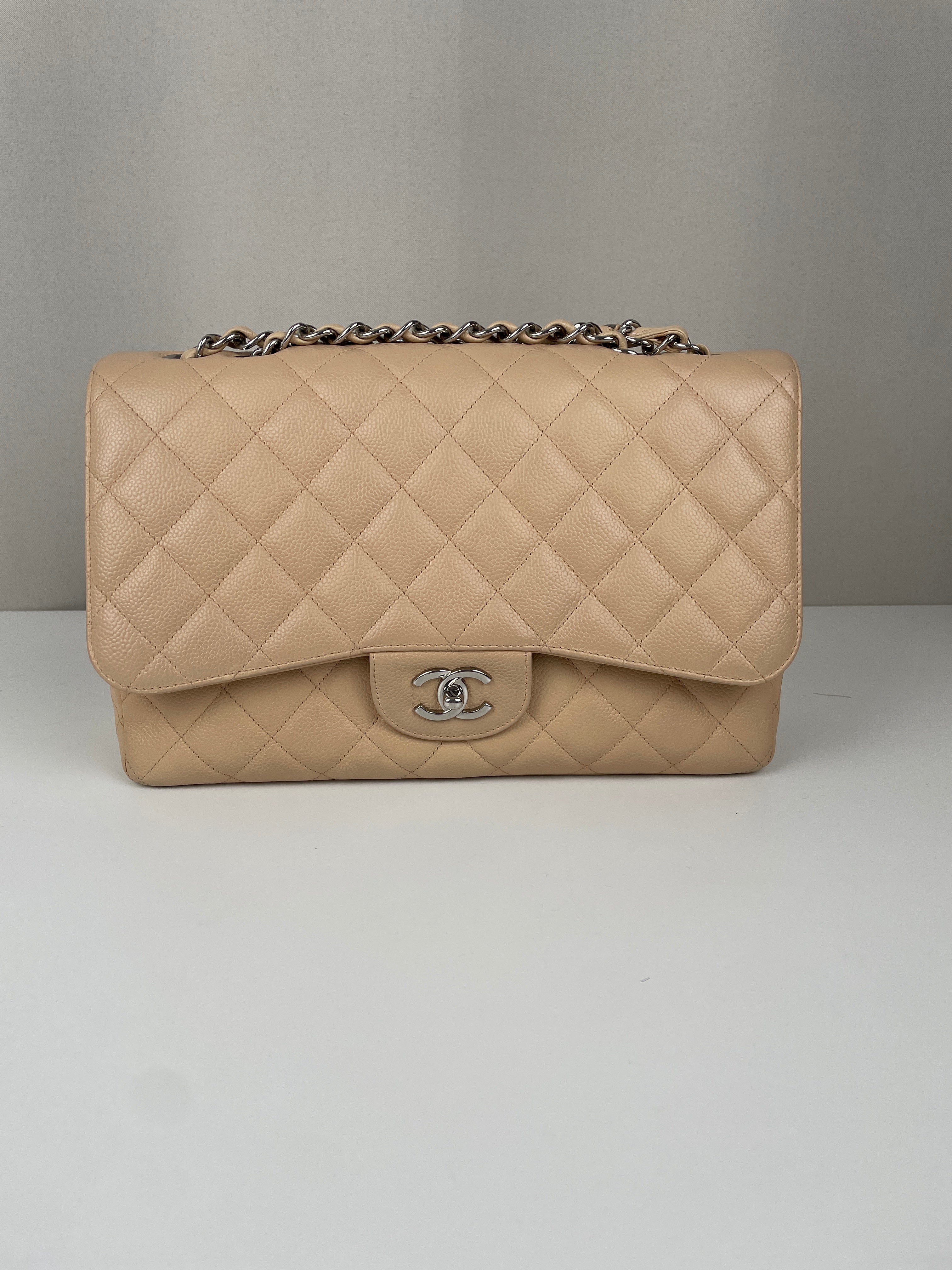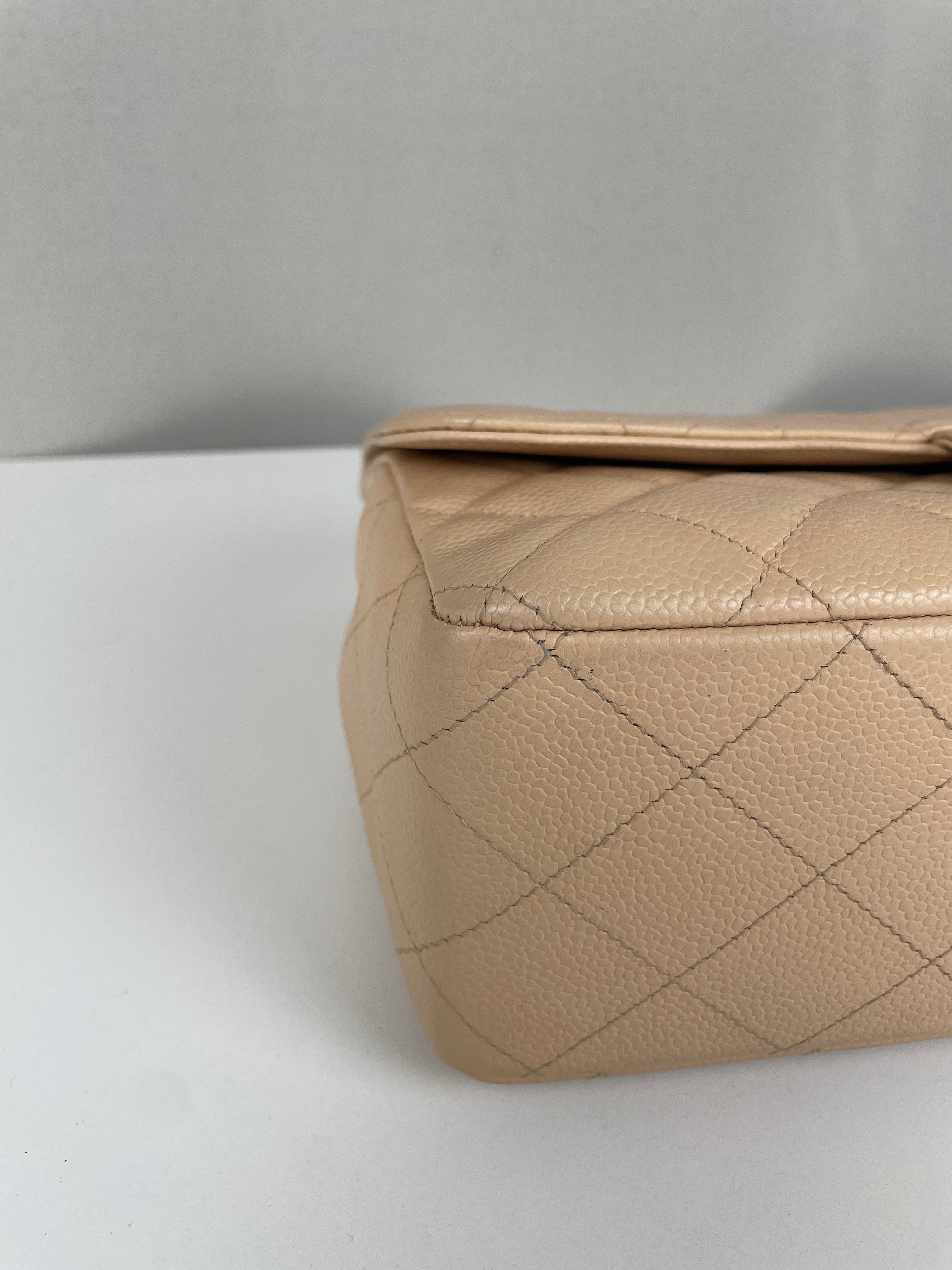 This Chanel Jumbo beige grained leather is in very good condition. The leather is in very good condition. The corners are in very good condition. The hardware is in very good condition and silver. Very good inside condition. The left part of the pocket is a bit damaged due to use. The bags comes with hologram, authentification card, dustbag and a bag organiser.
