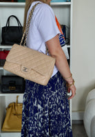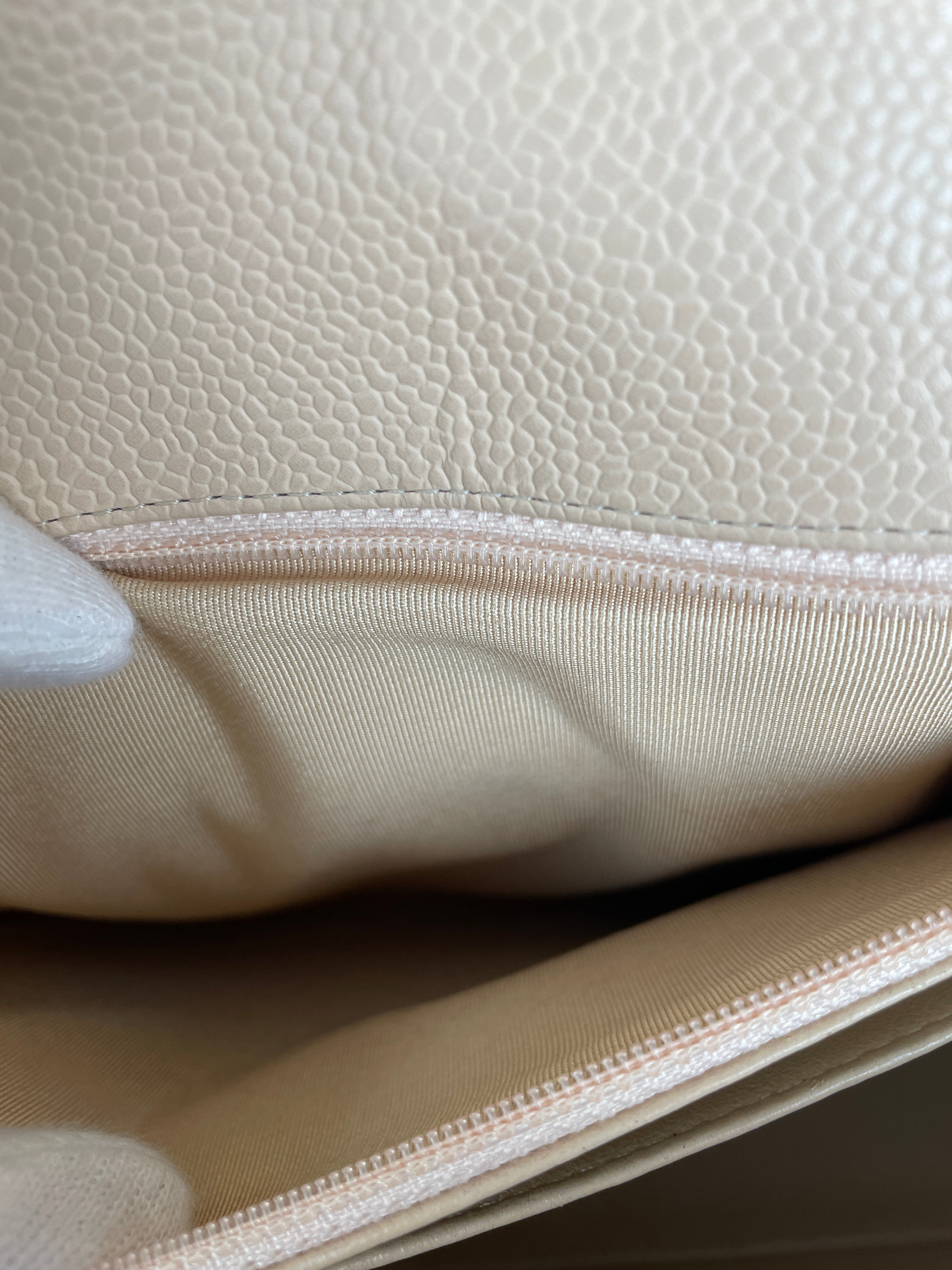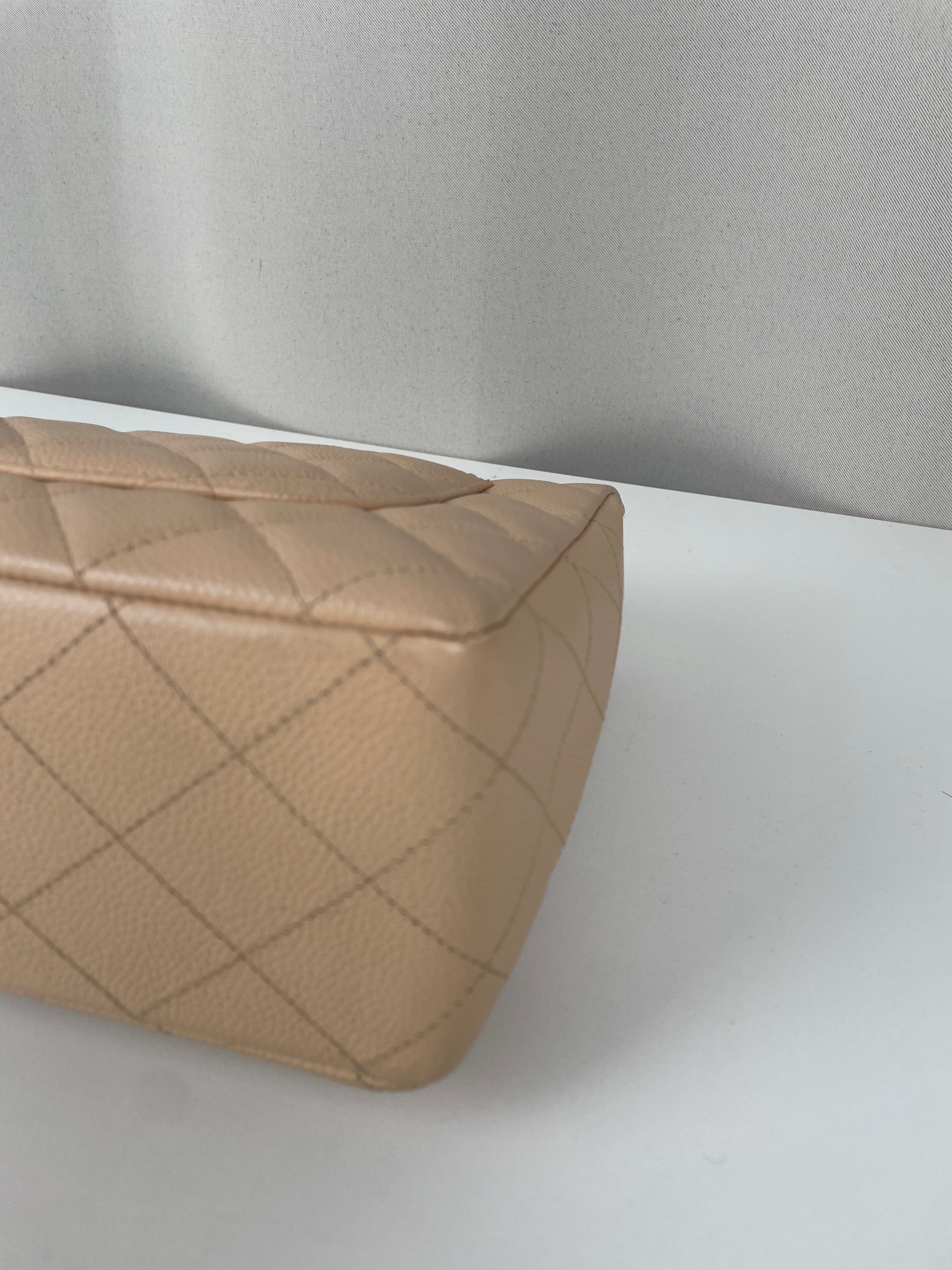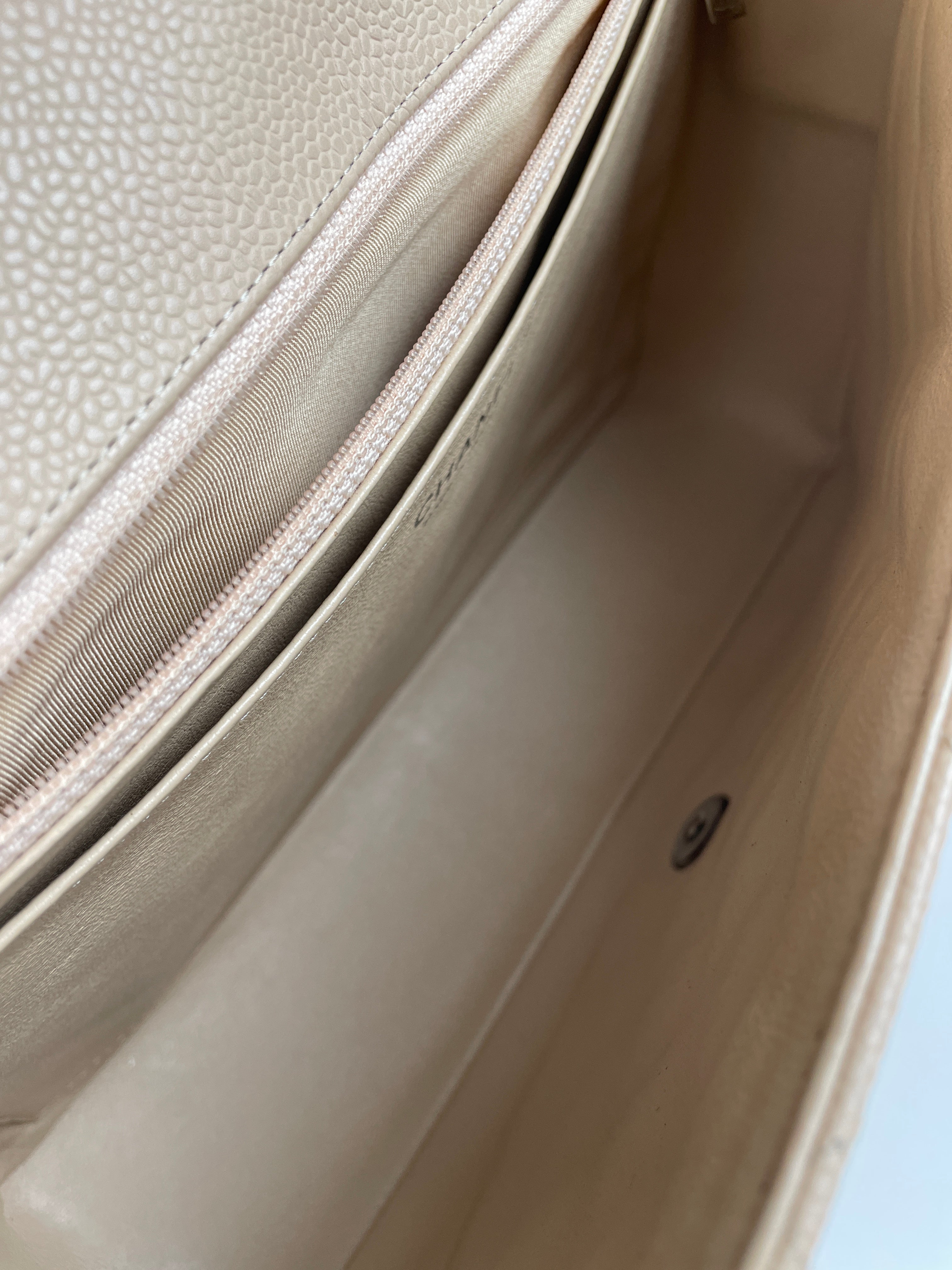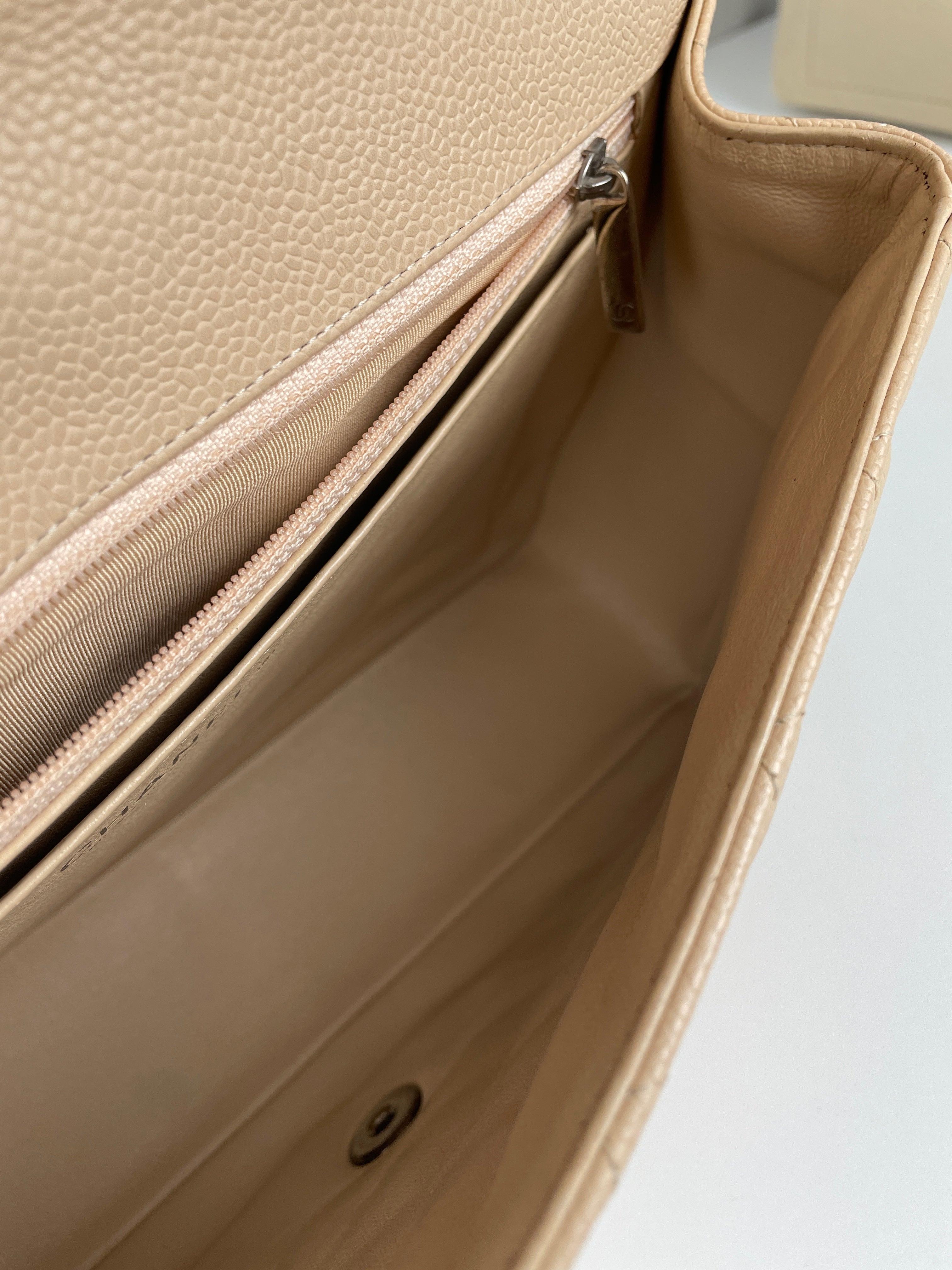 This Chanel Jumbo beige grained leather is in very good condition. The leather is in very good condition. The corners are in very good condition. The hardware is in very good condition and silver. Very good inside condition. The left part of the pocket is a bit damaged due to use. The bags comes with hologram, authentification card, dustbag and a bag organiser.