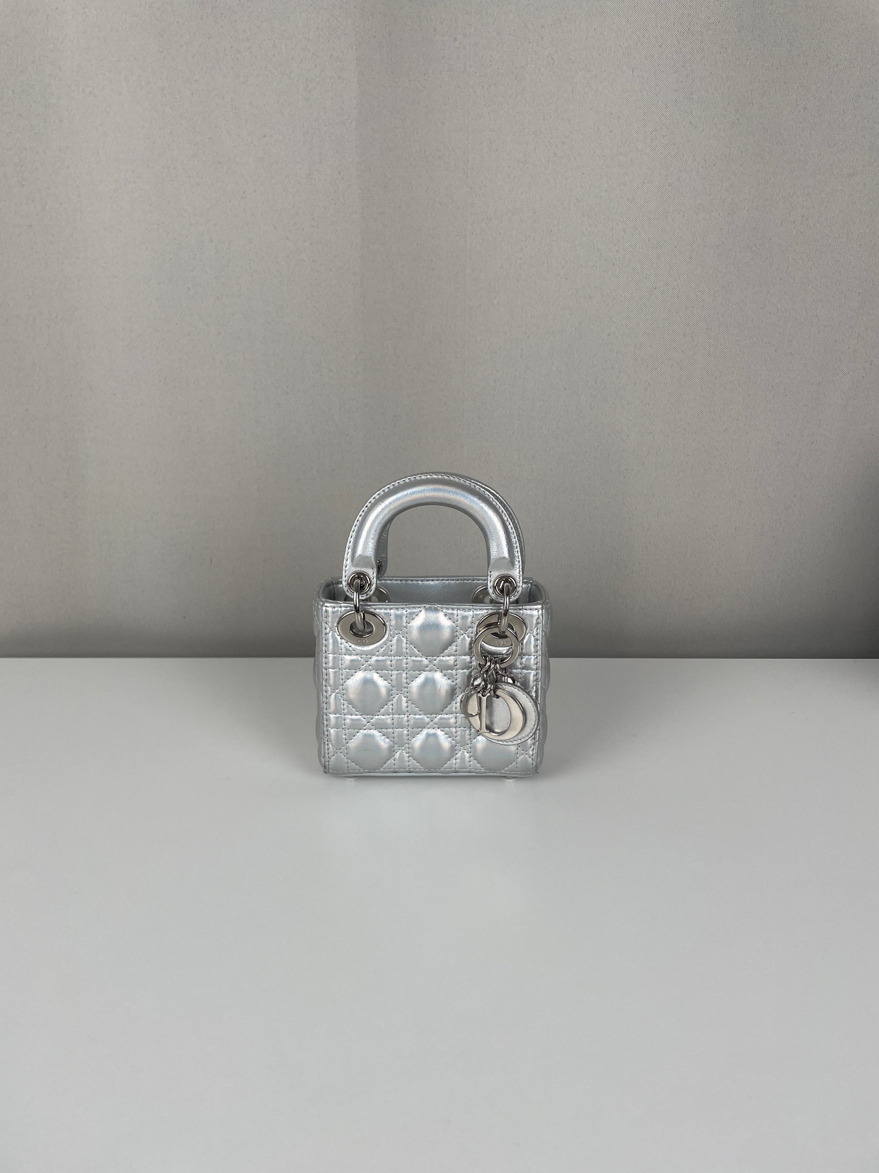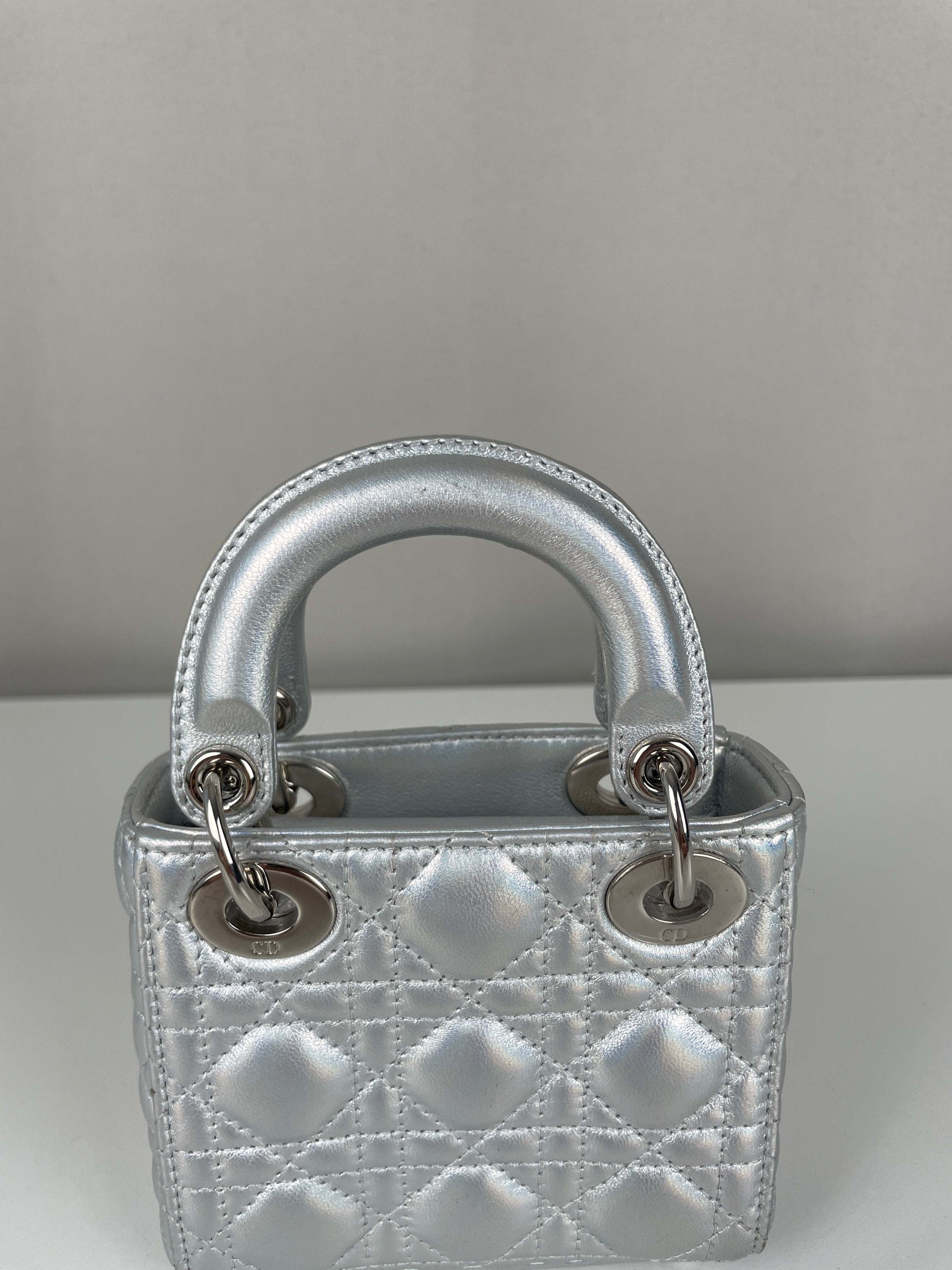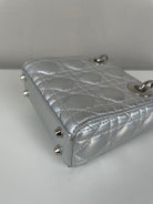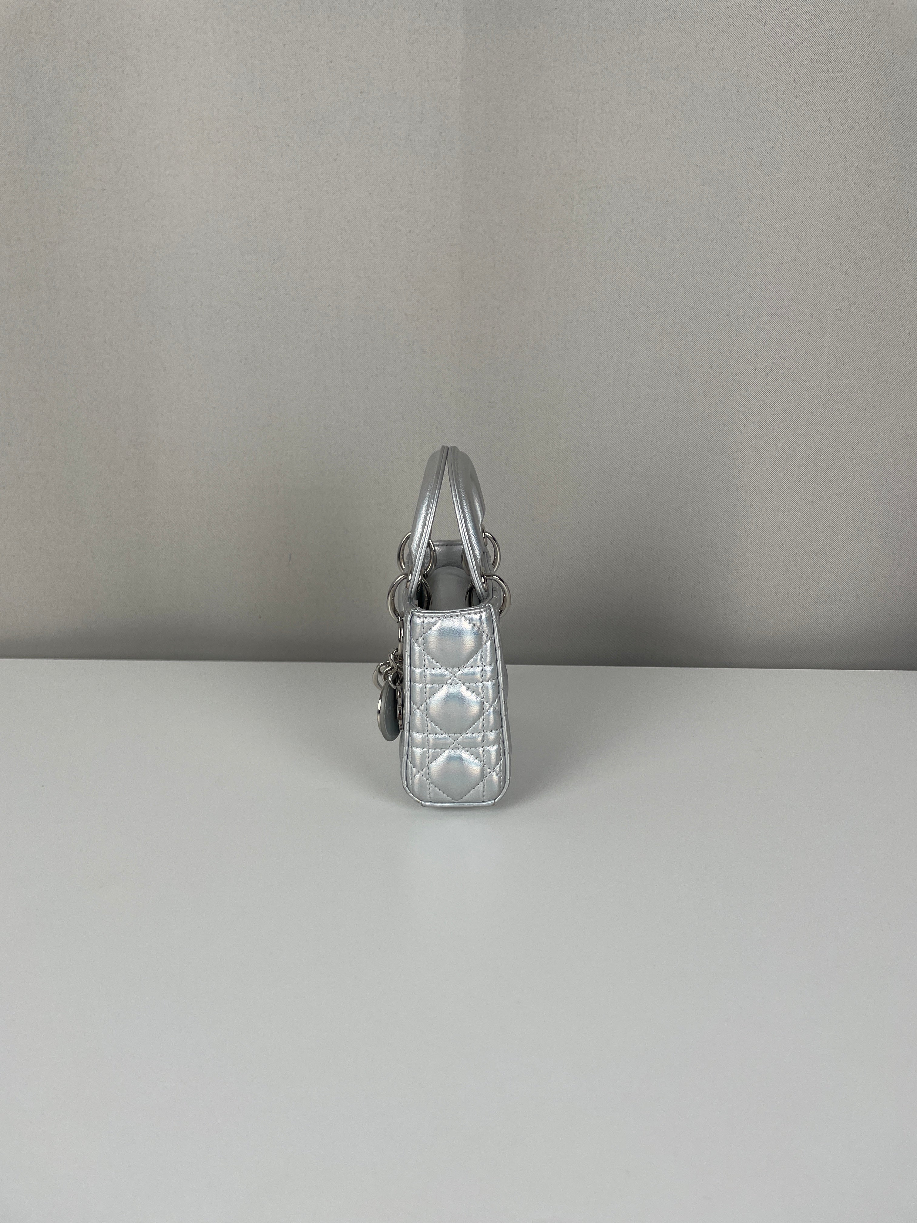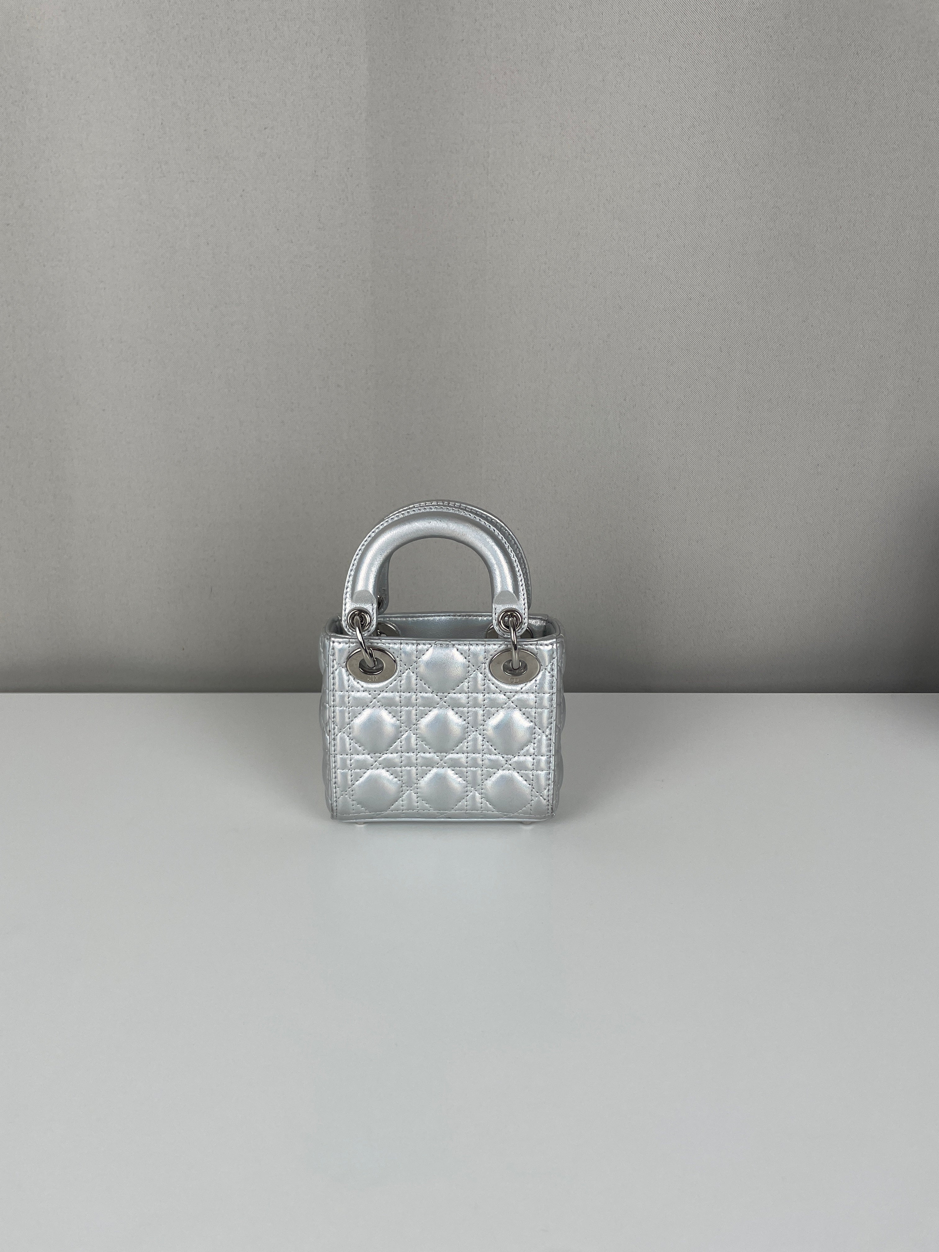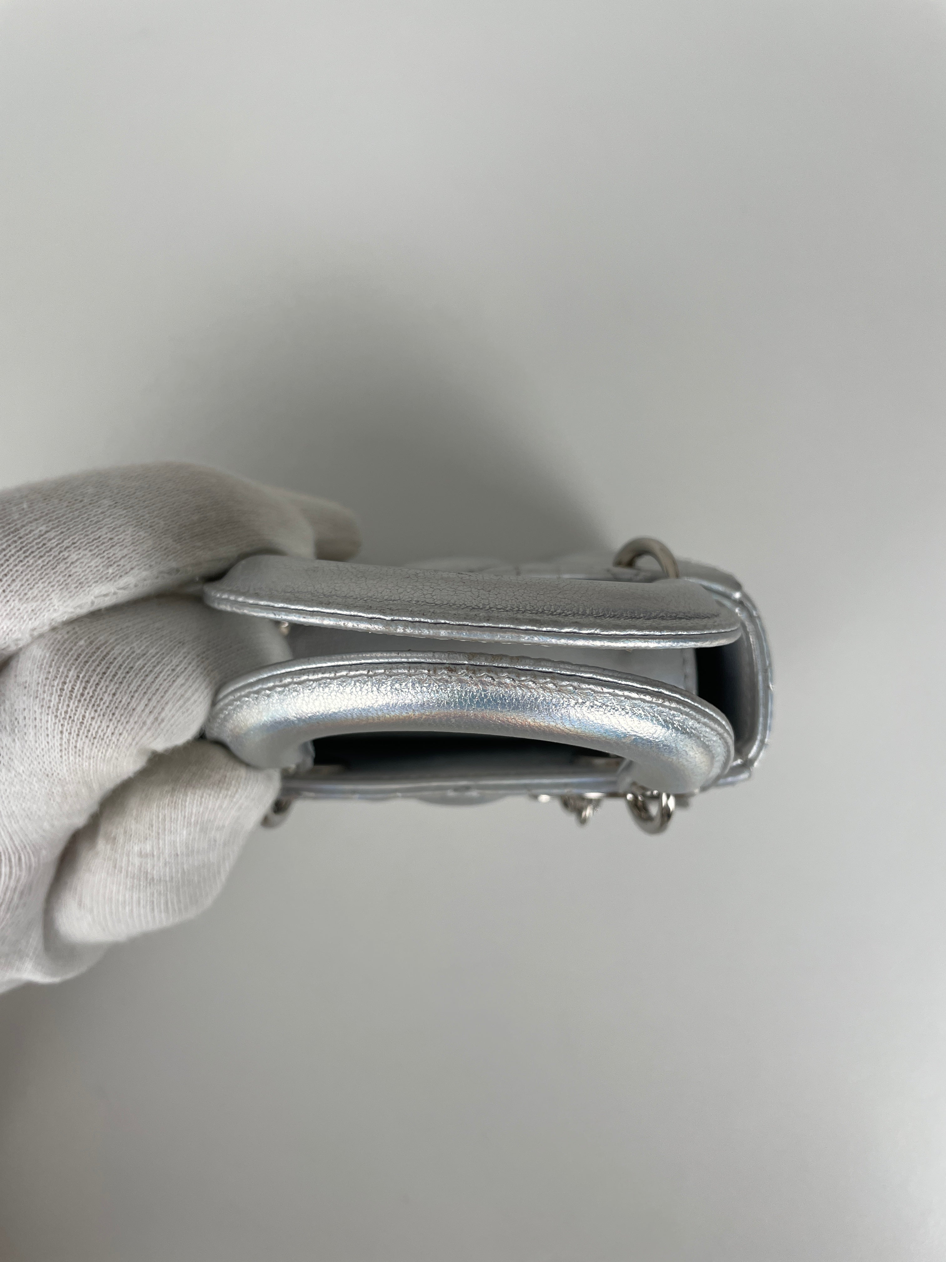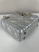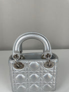 This Dior Micro Lady Dior in metallic silver is a dazzling reinterpretation of a House icon. Crafted in shimmering silver-tone leather with the signature cannage stitching, this miniature version captures all the elegance and structure of the original Lady Dior. Adorned with the classic Dior charms and a delicate removable strap, it's a statement piece that blends sophistication with playful charm perfect for collectors and fashion enthusiasts alike. This pre-owned luxury accessory showcases the exceptional craftsmanship that Dior is celebrated for.