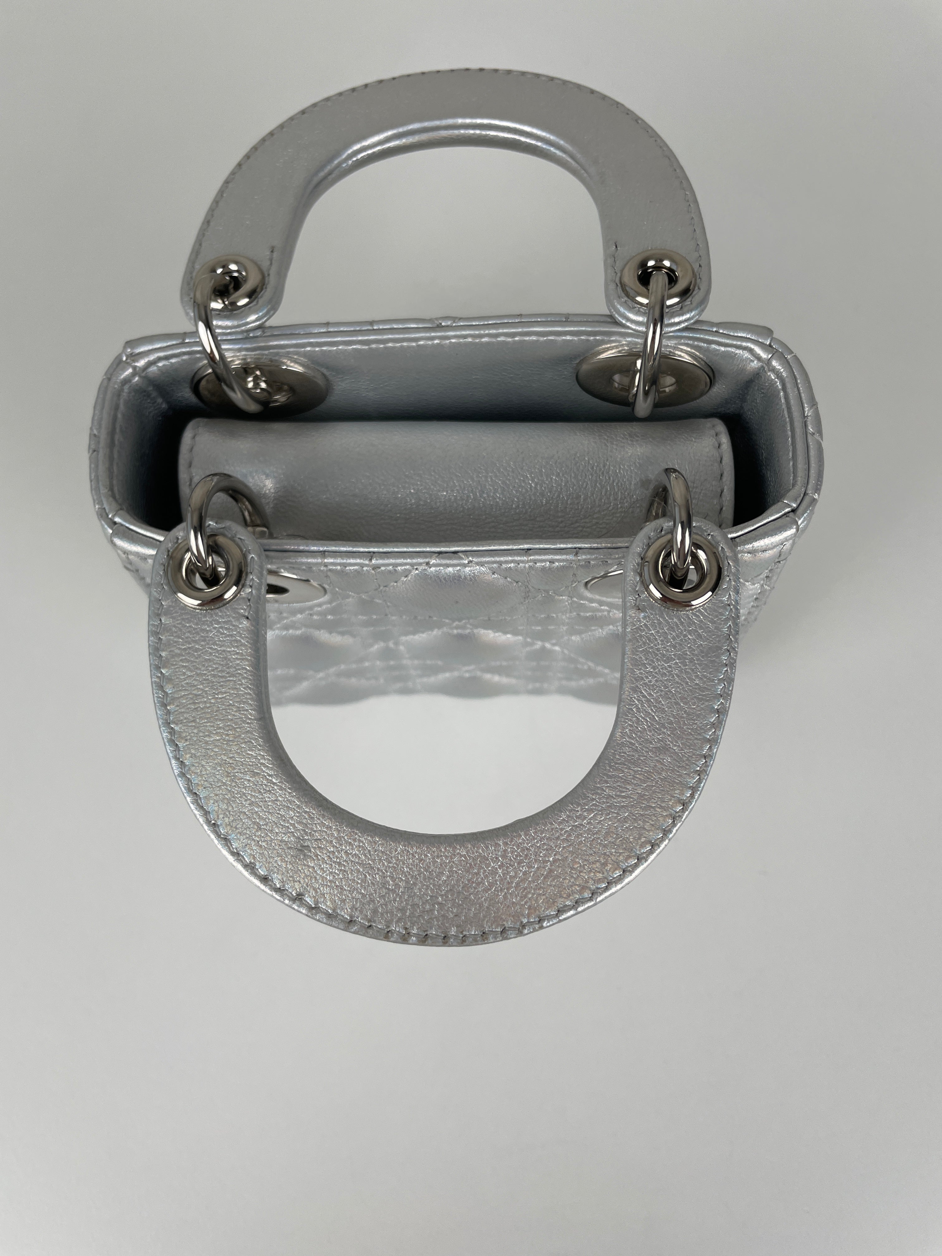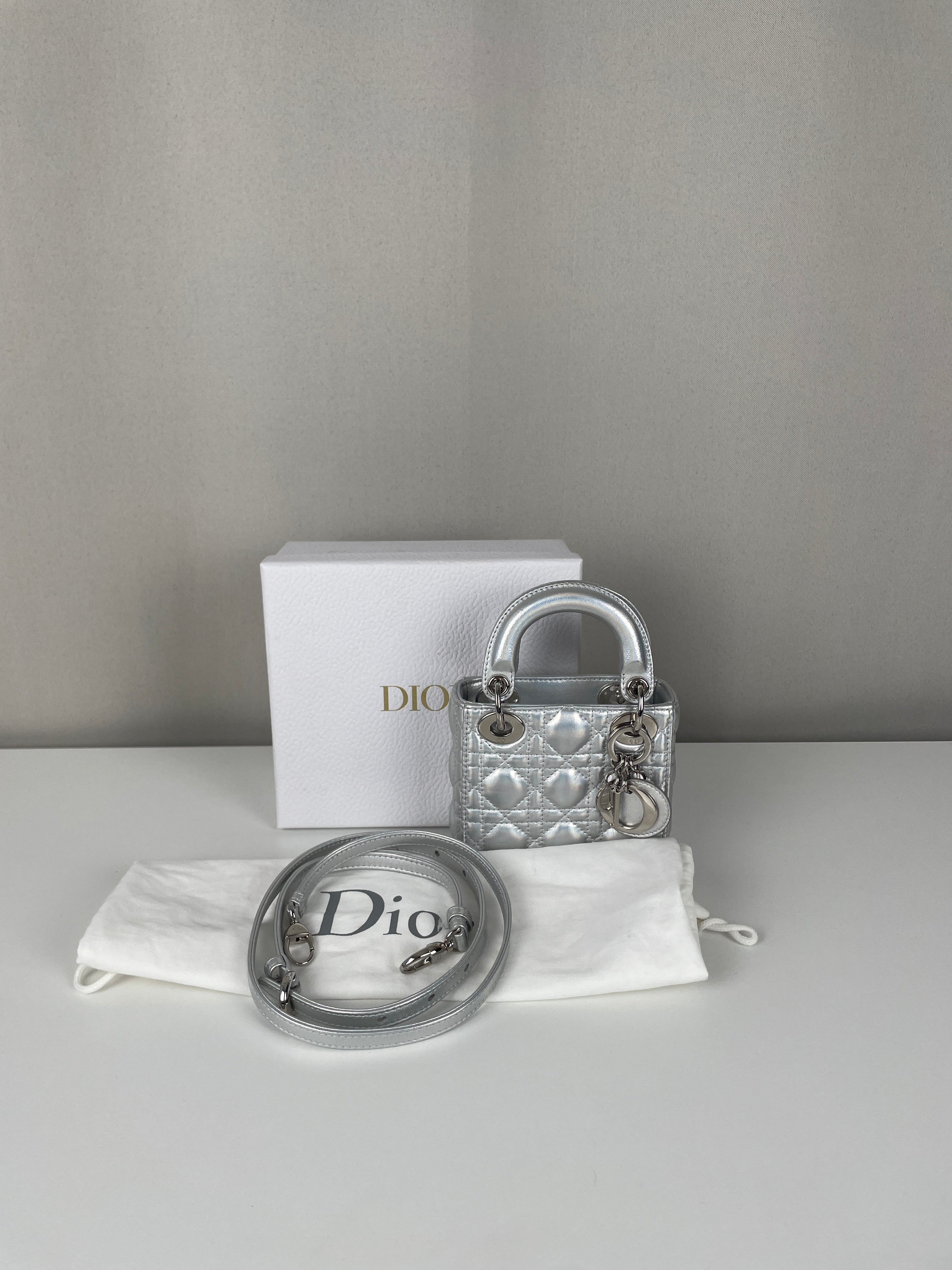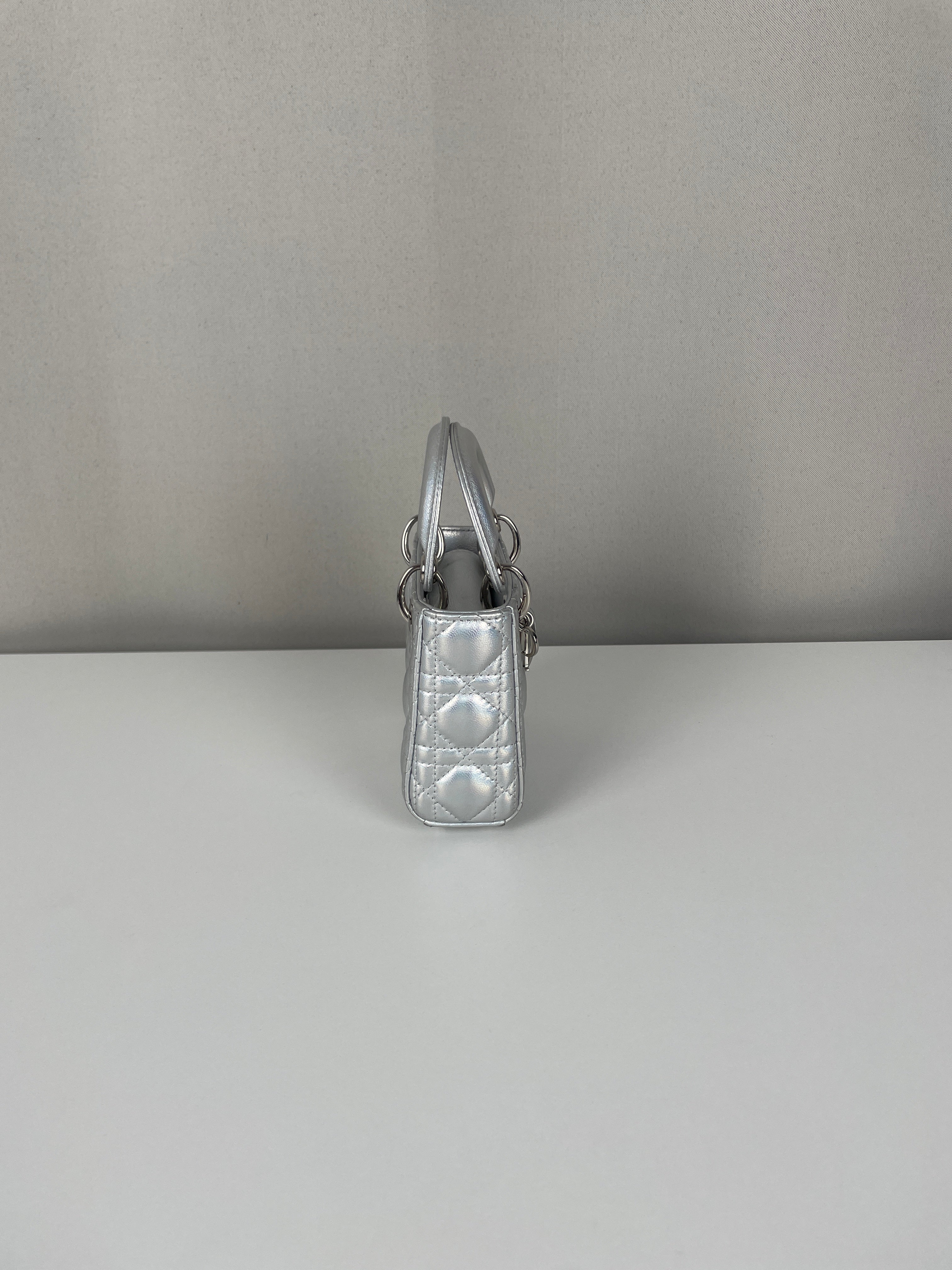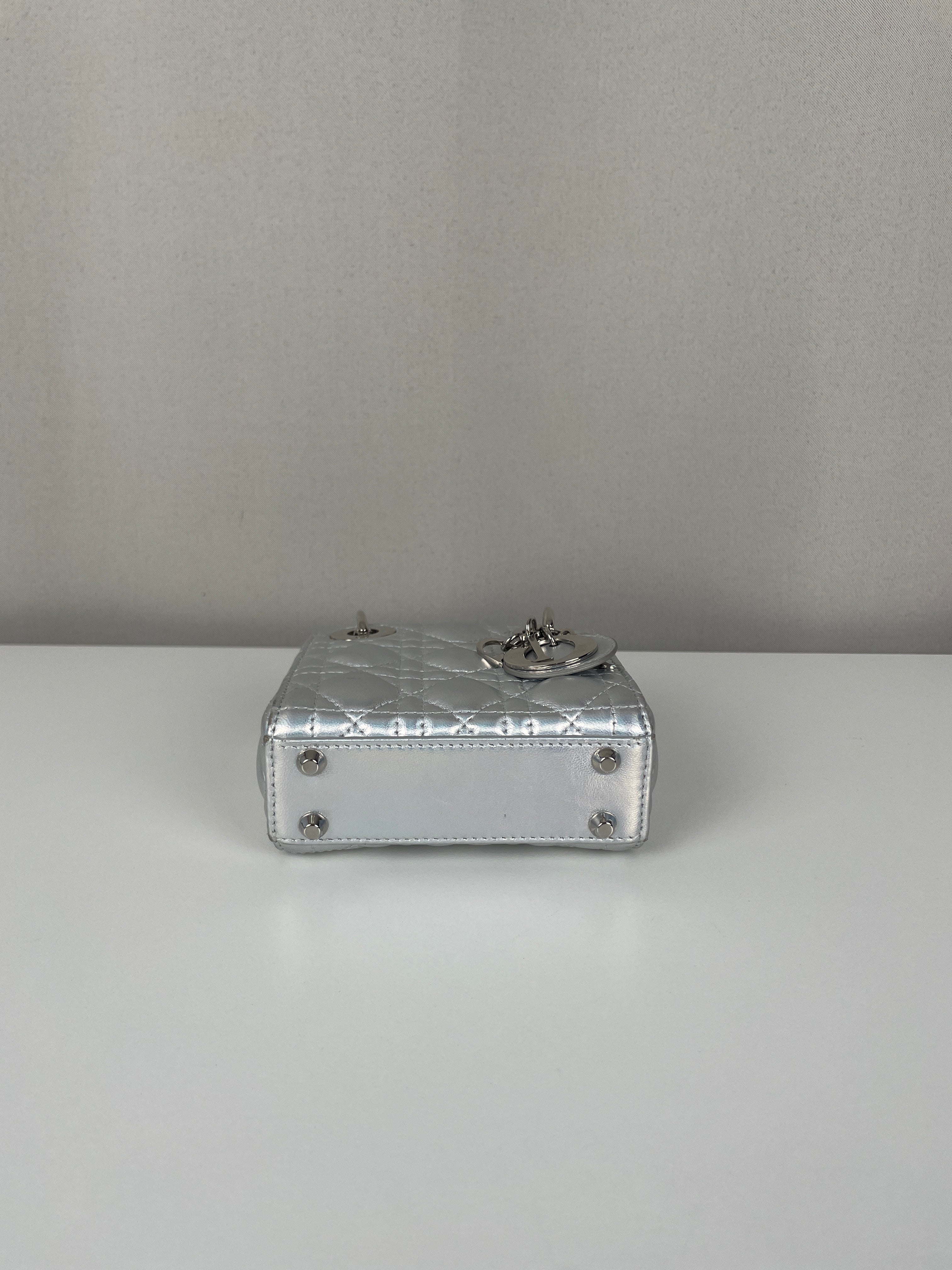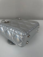 This Dior Micro Lady Dior in metallic silver is a dazzling reinterpretation of a House icon. Crafted in shimmering silver-tone leather with the signature cannage stitching, this miniature version captures all the elegance and structure of the original Lady Dior. Adorned with the classic Dior charms and a delicate removable strap, it's a statement piece that blends sophistication with playful charm perfect for collectors and fashion enthusiasts alike. This pre-owned luxury accessory showcases the exceptional craftsmanship that Dior is celebrated for.