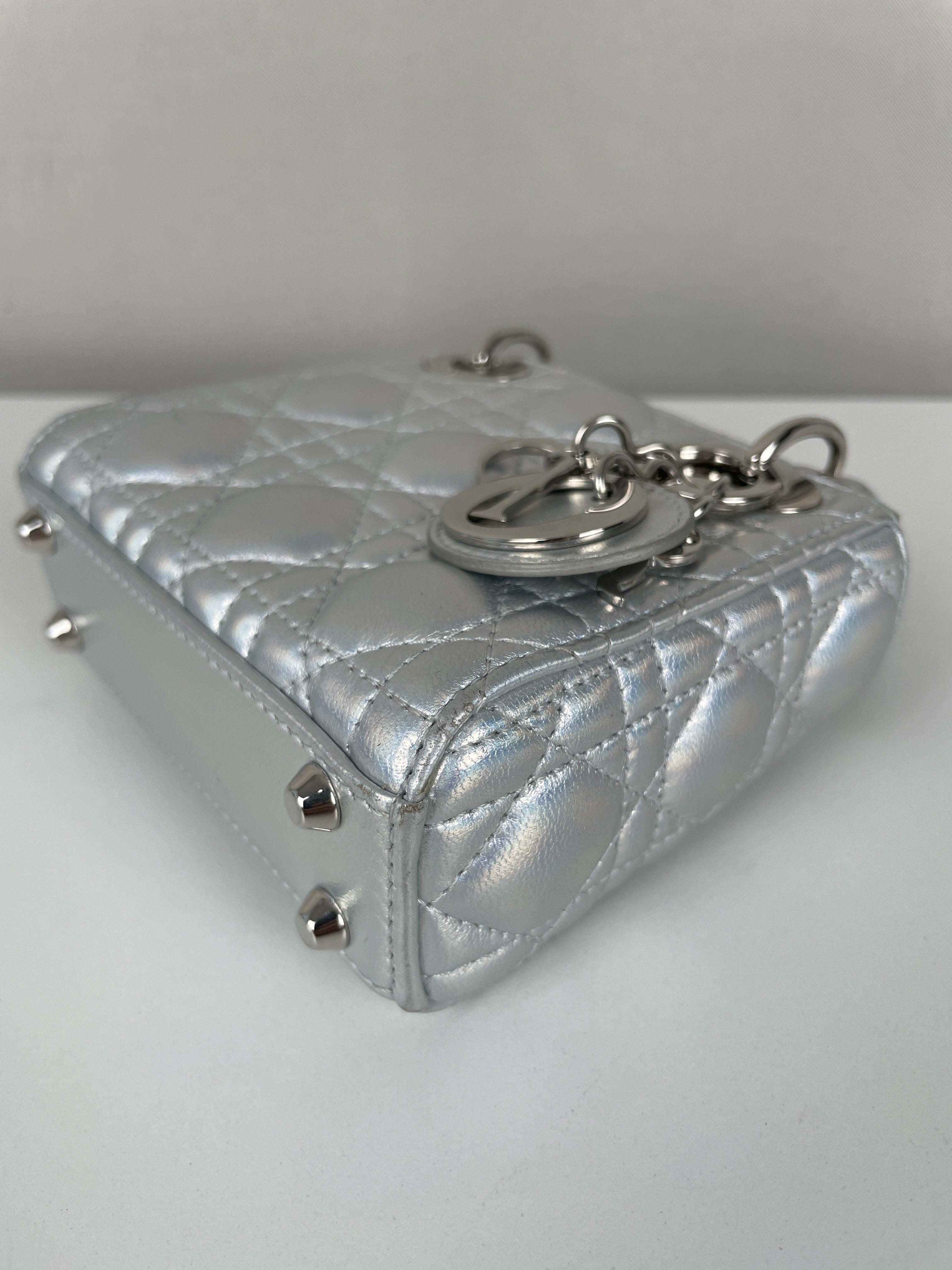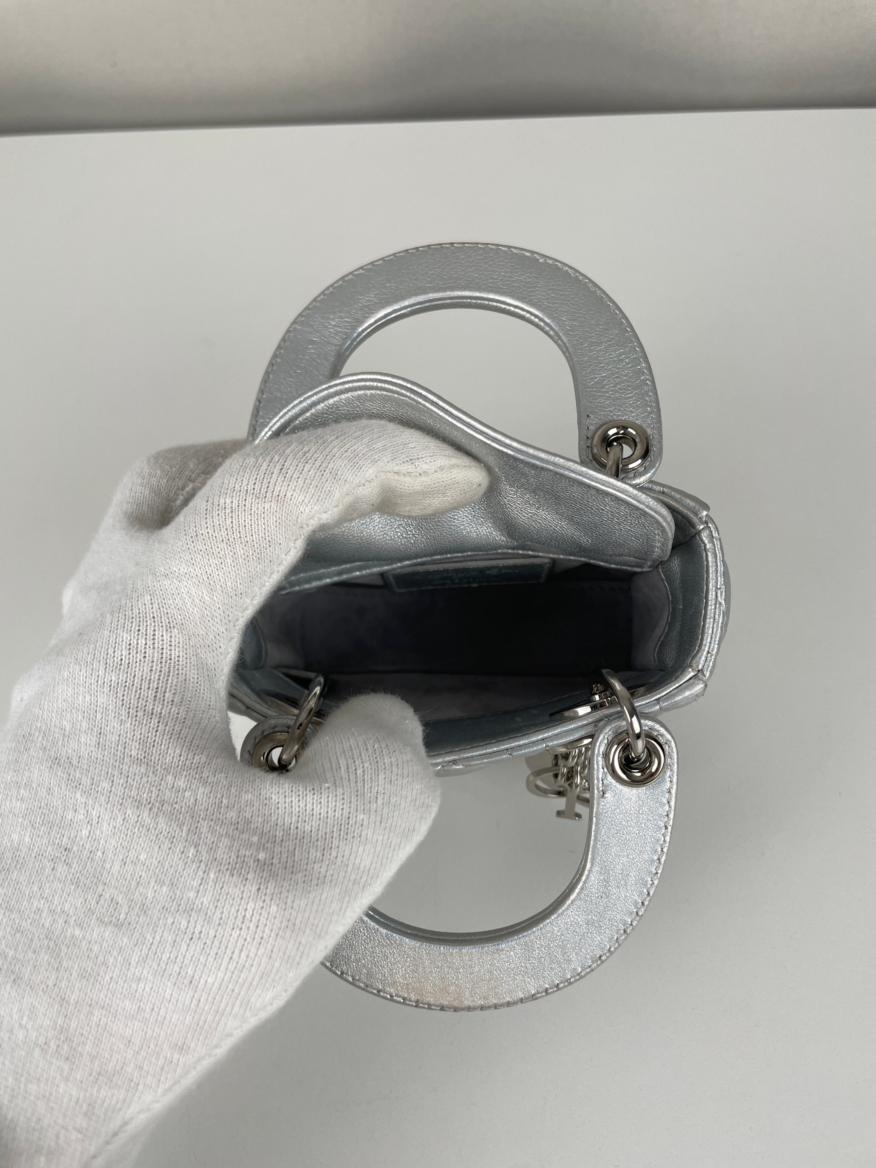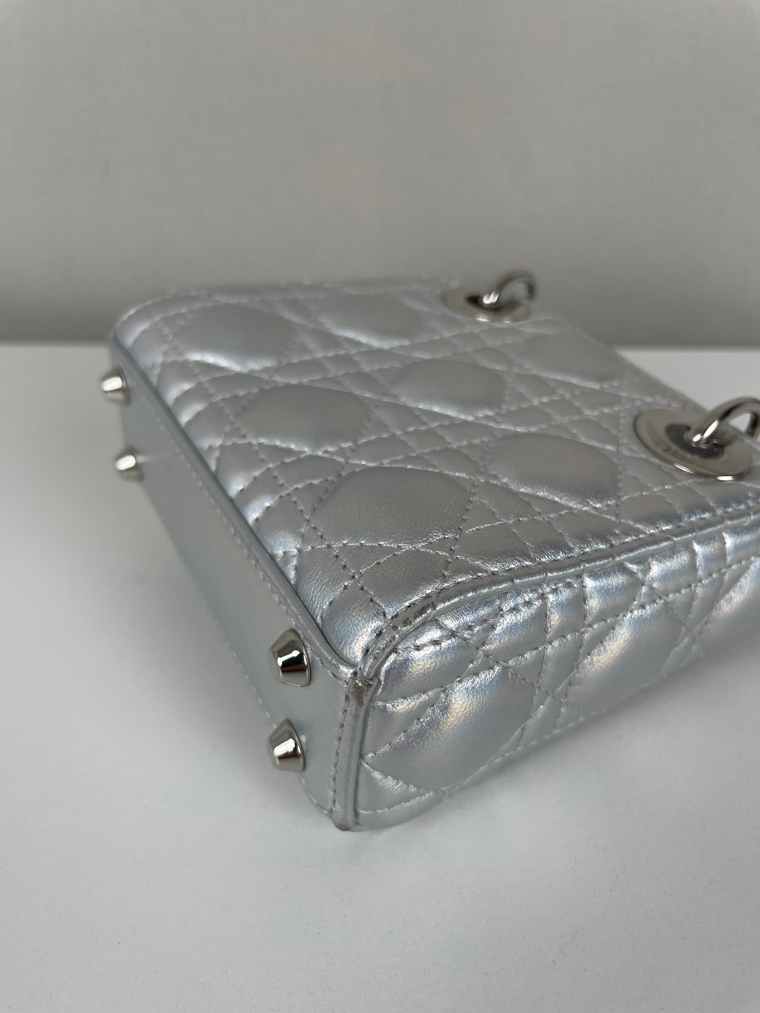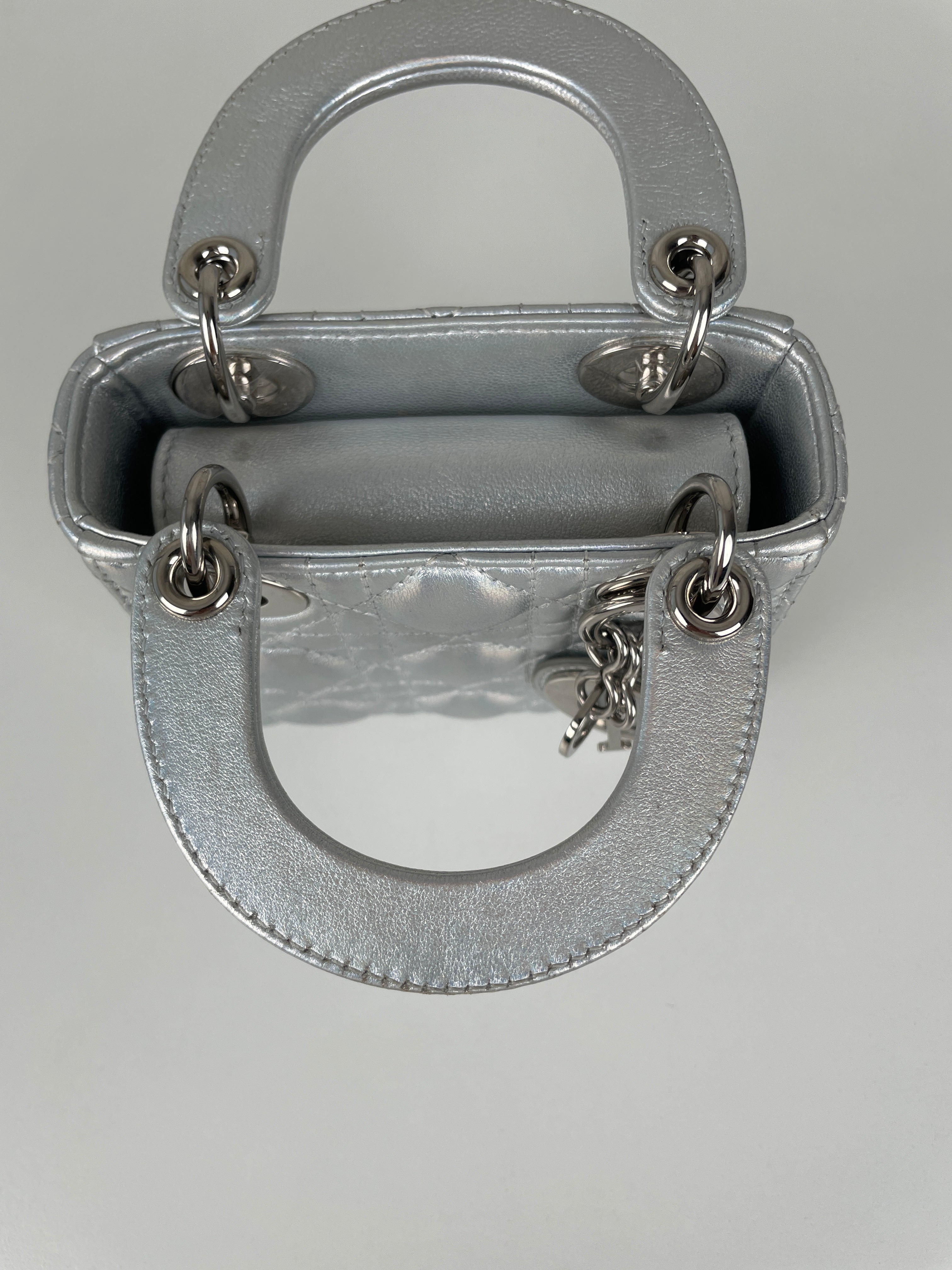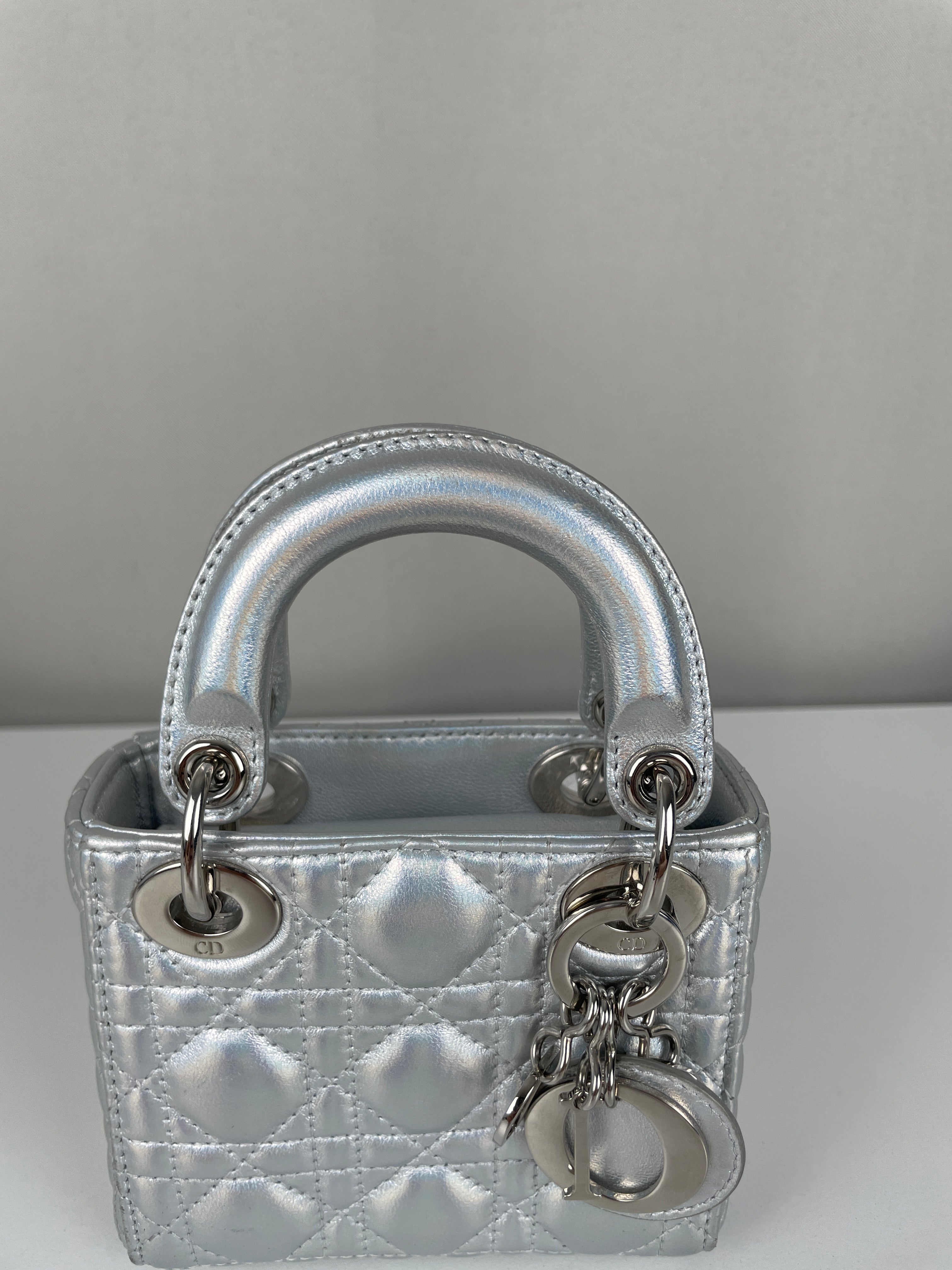 This Dior Micro Lady Dior in metallic silver is a dazzling reinterpretation of a House icon. Crafted in shimmering silver-tone leather with the signature cannage stitching, this miniature version captures all the elegance and structure of the original Lady Dior. Adorned with the classic Dior charms and a delicate removable strap, it's a statement piece that blends sophistication with playful charm perfect for collectors and fashion enthusiasts alike. This pre-owned luxury accessory showcases the exceptional craftsmanship that Dior is celebrated for.