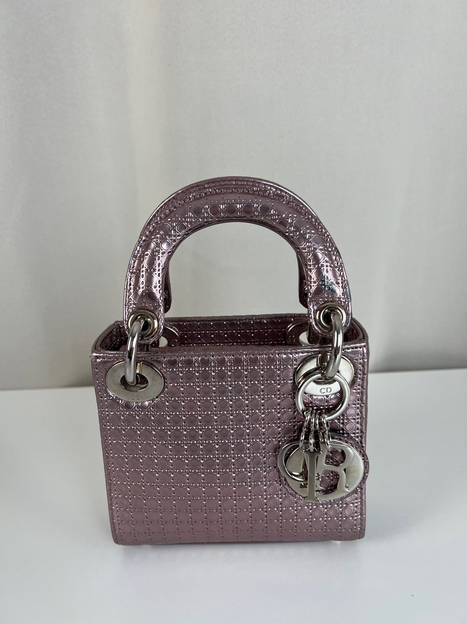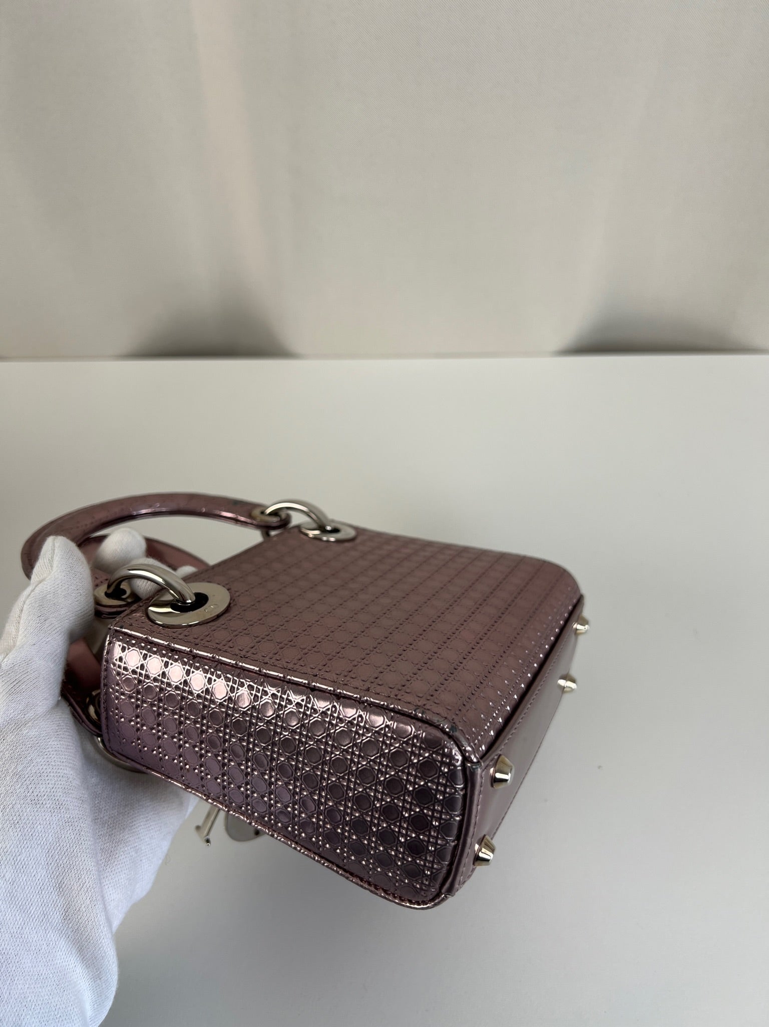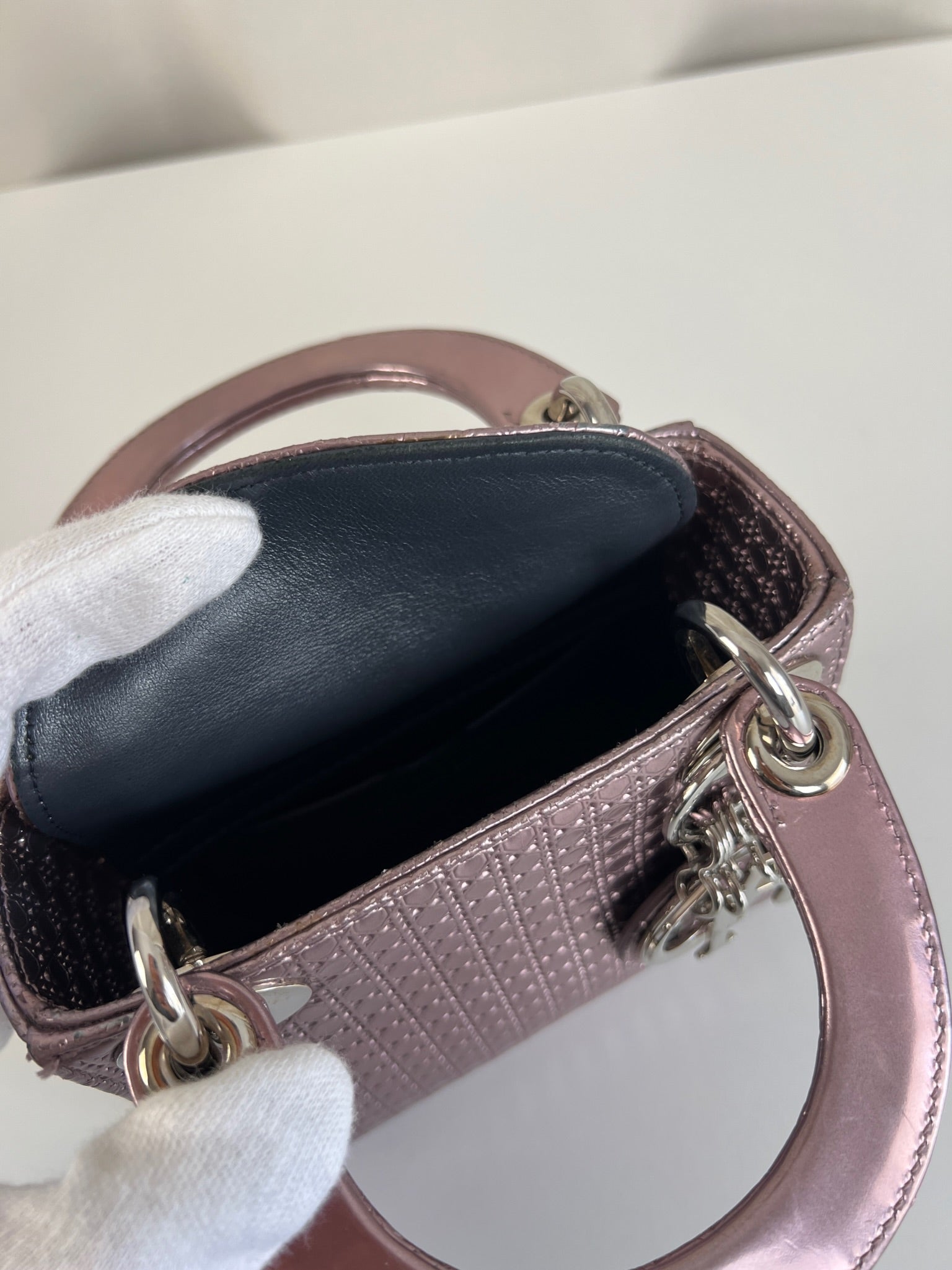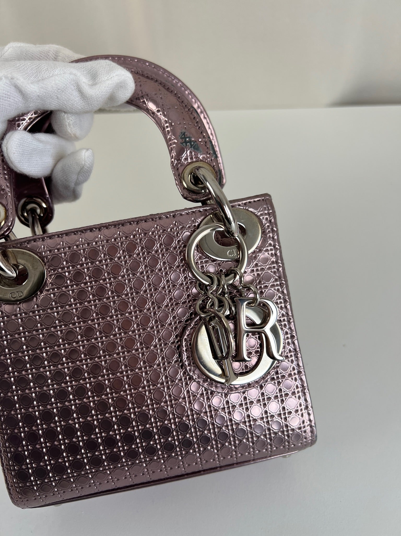 This Lady Dior Micro Metallic Rose Pink is in very good condition. The leather is in very good condition. The corners are little bit rubbed. The handles has little scratches and have stains/mark. The strap is in very good condition. The interior is in very good condition.