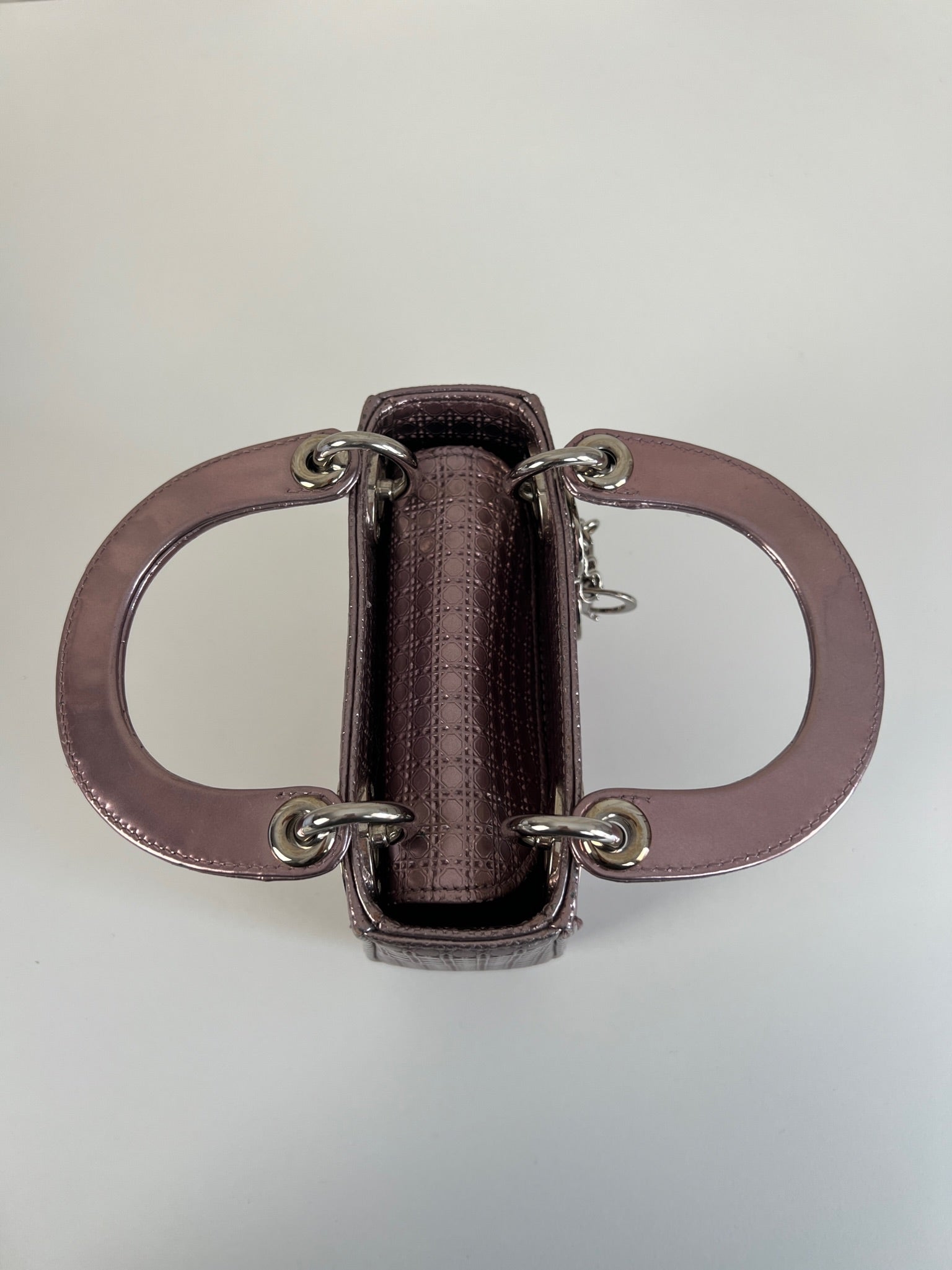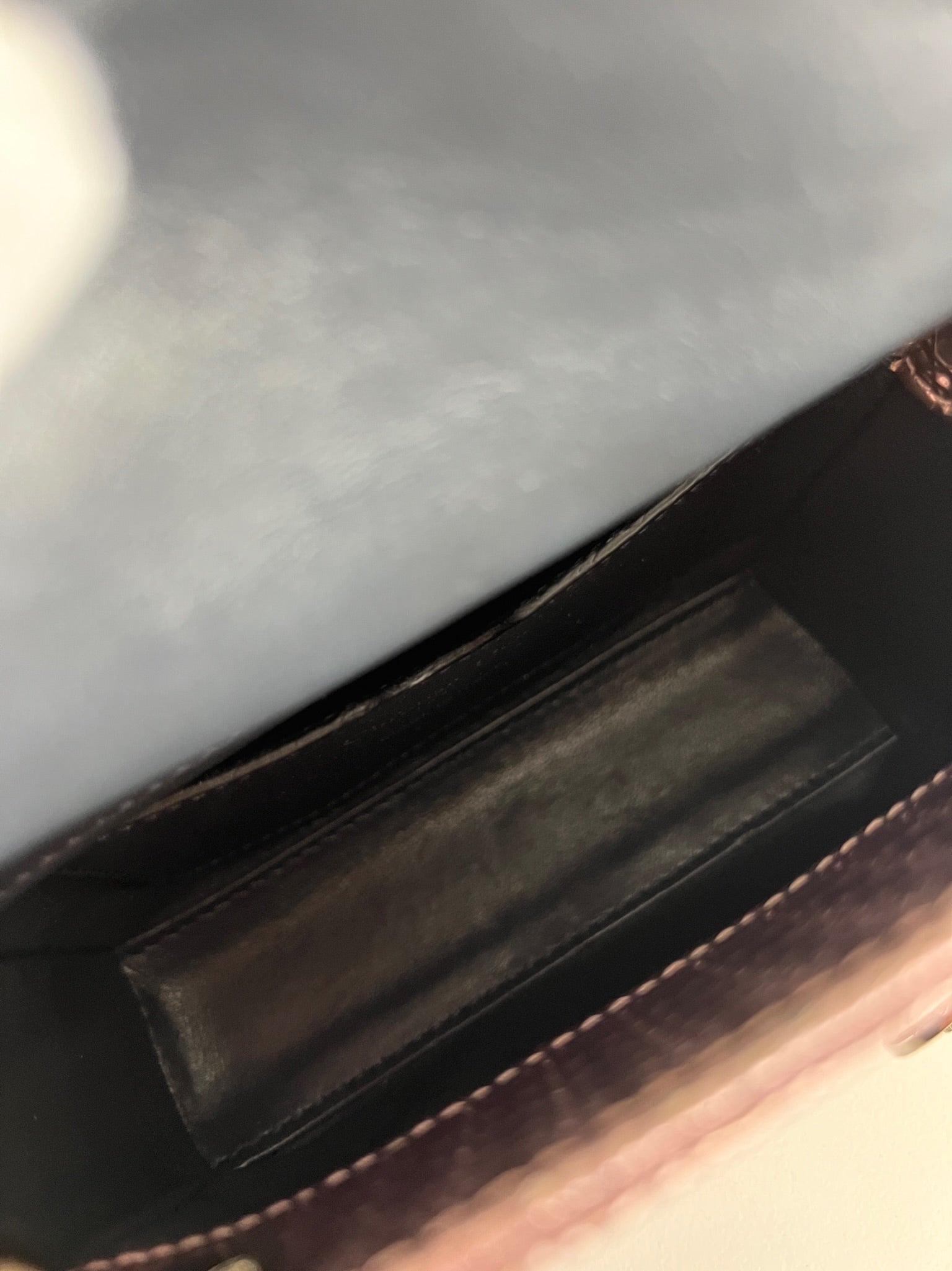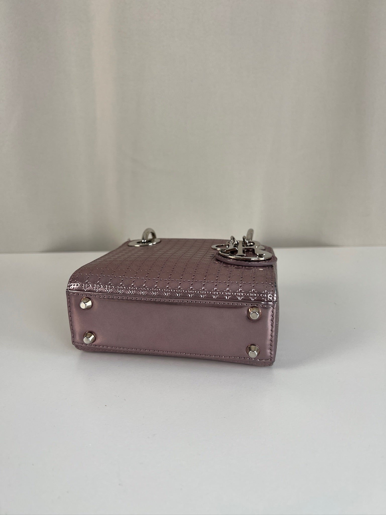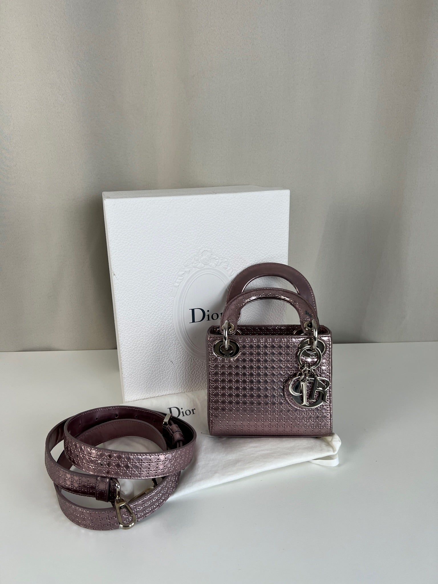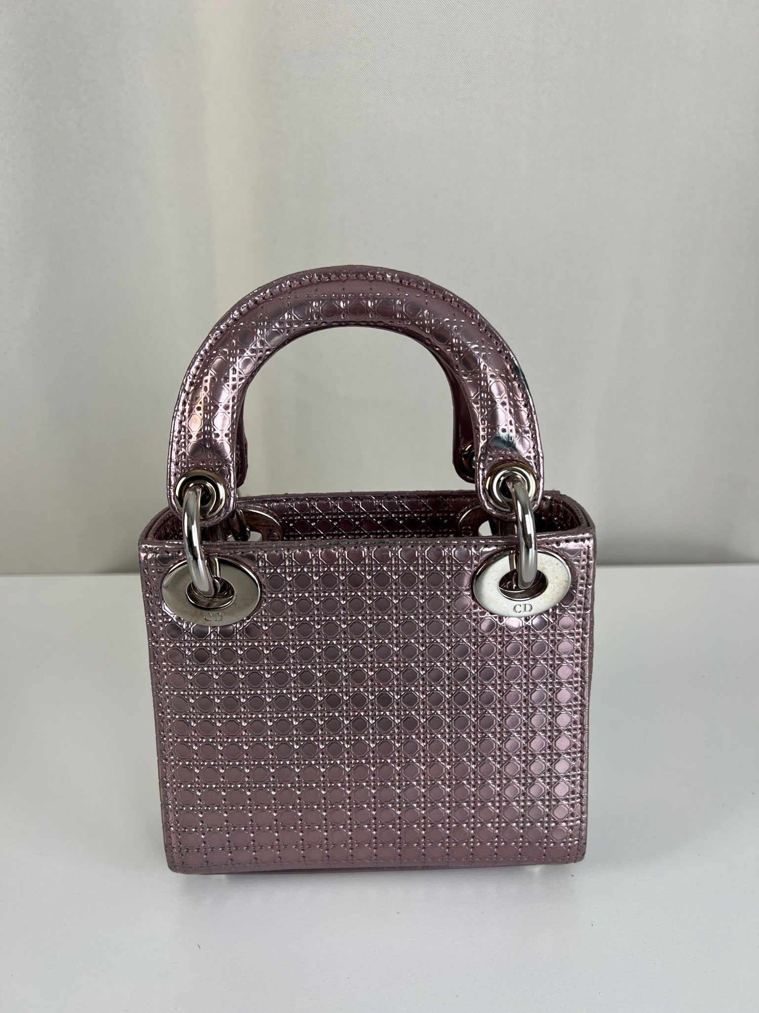 This Lady Dior Micro Metallic Rose Pink is in very good condition. The leather is in very good condition. The corners are little bit rubbed. The handles has little scratches and have stains/mark. The strap is in very good condition. The interior is in very good condition.