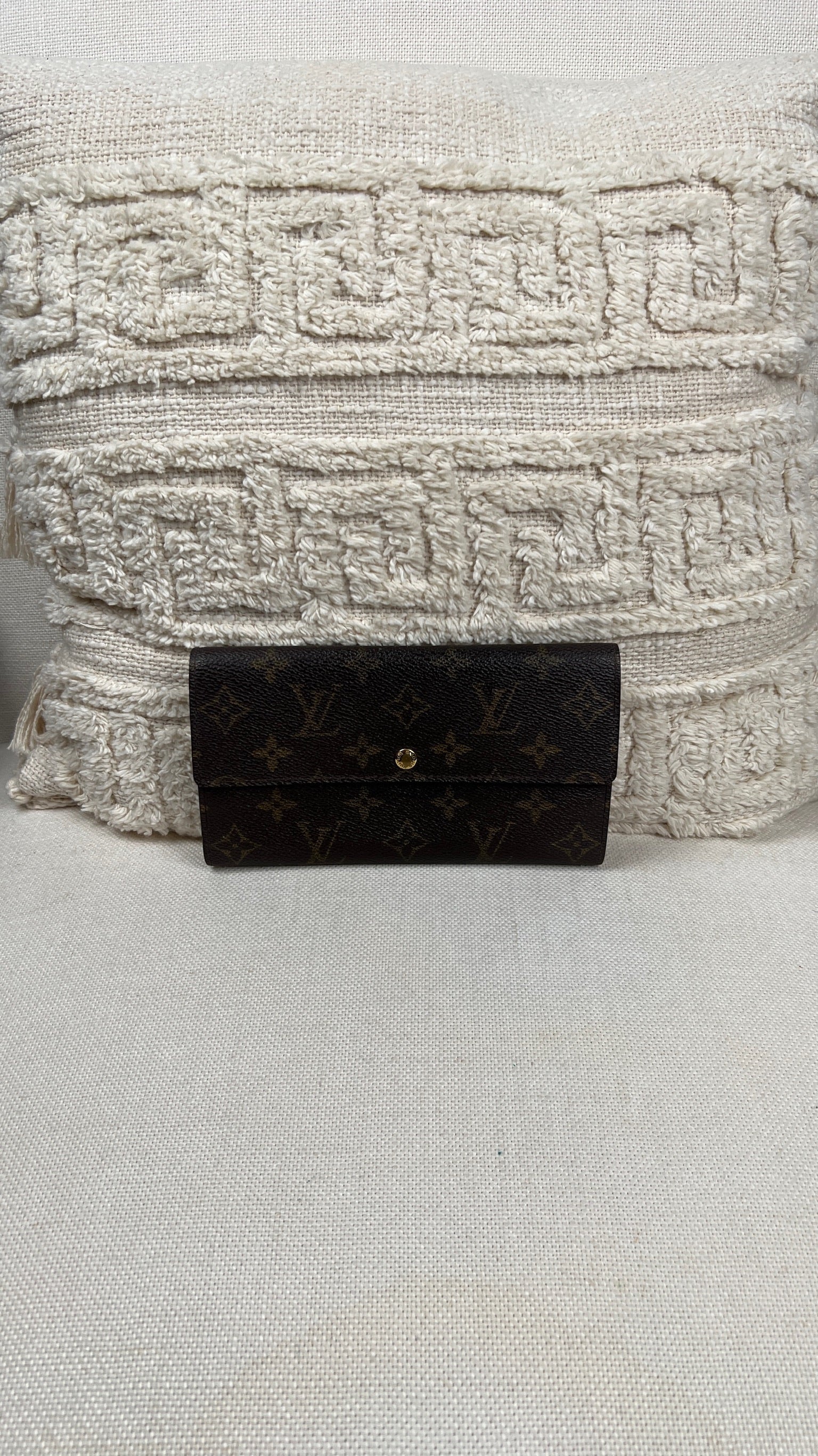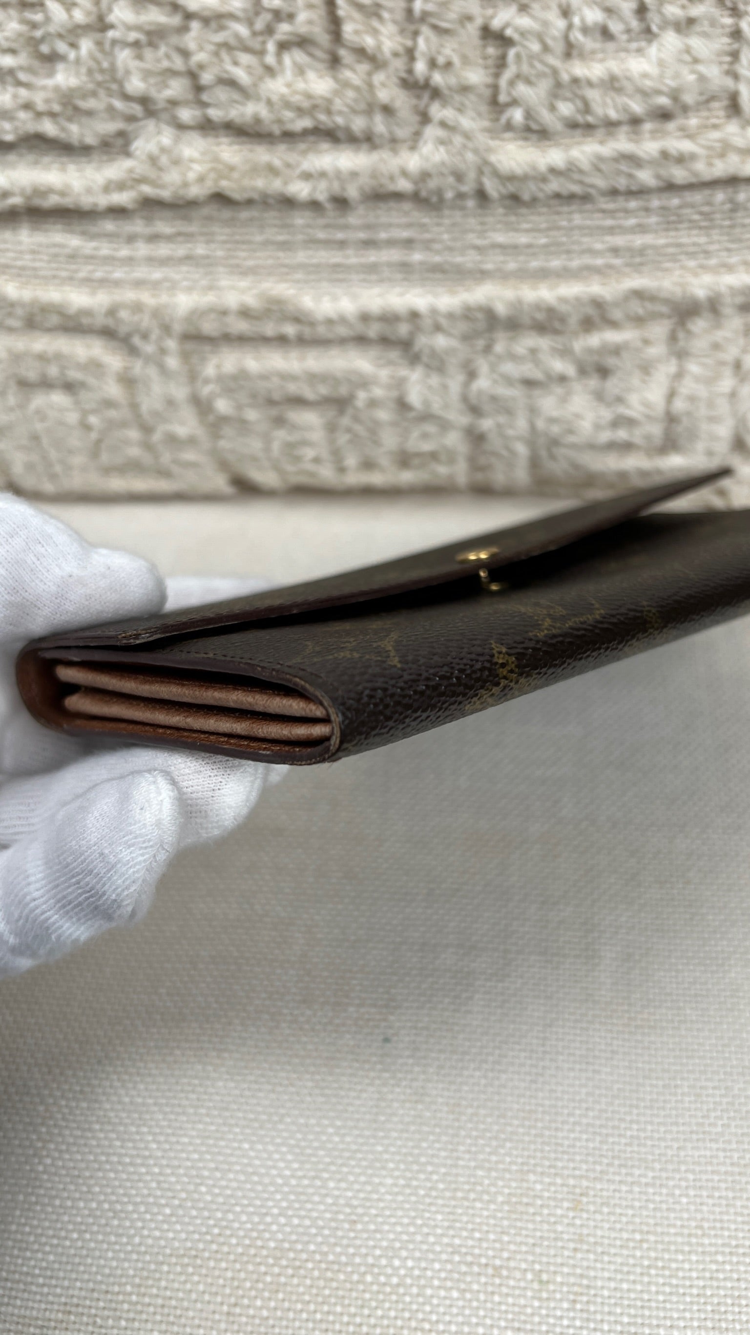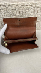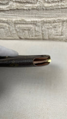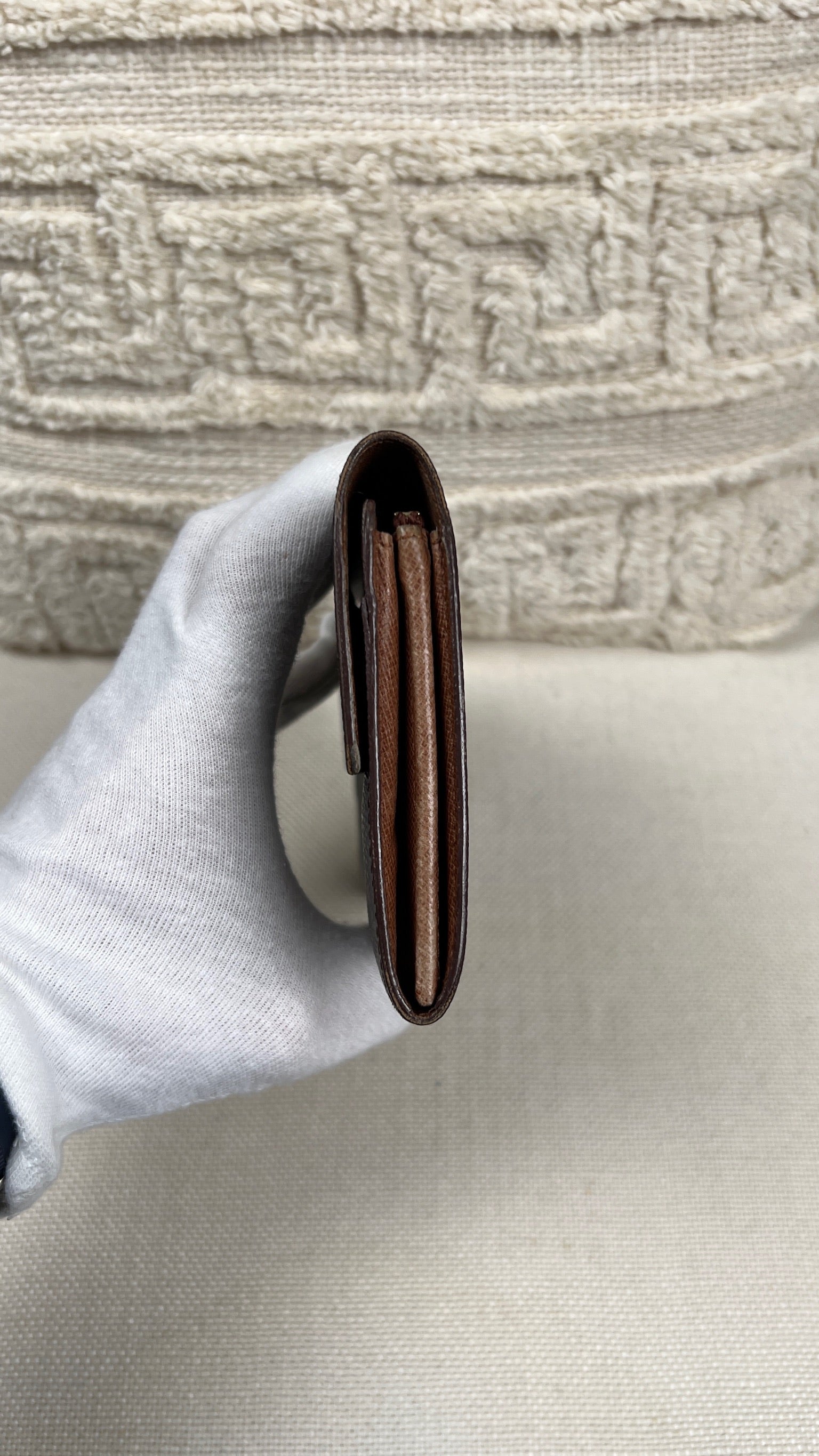 This Louis Vuitton Sarah wallet is in fair / good condition. The canva is in very good condition. The corners are in good condition. The interior is in ok / good condition, but has signs of wear on the zipper pocket and flap. The button is worn from normal use. Sides also shows some signs of wear.