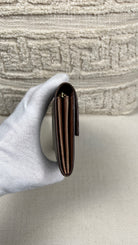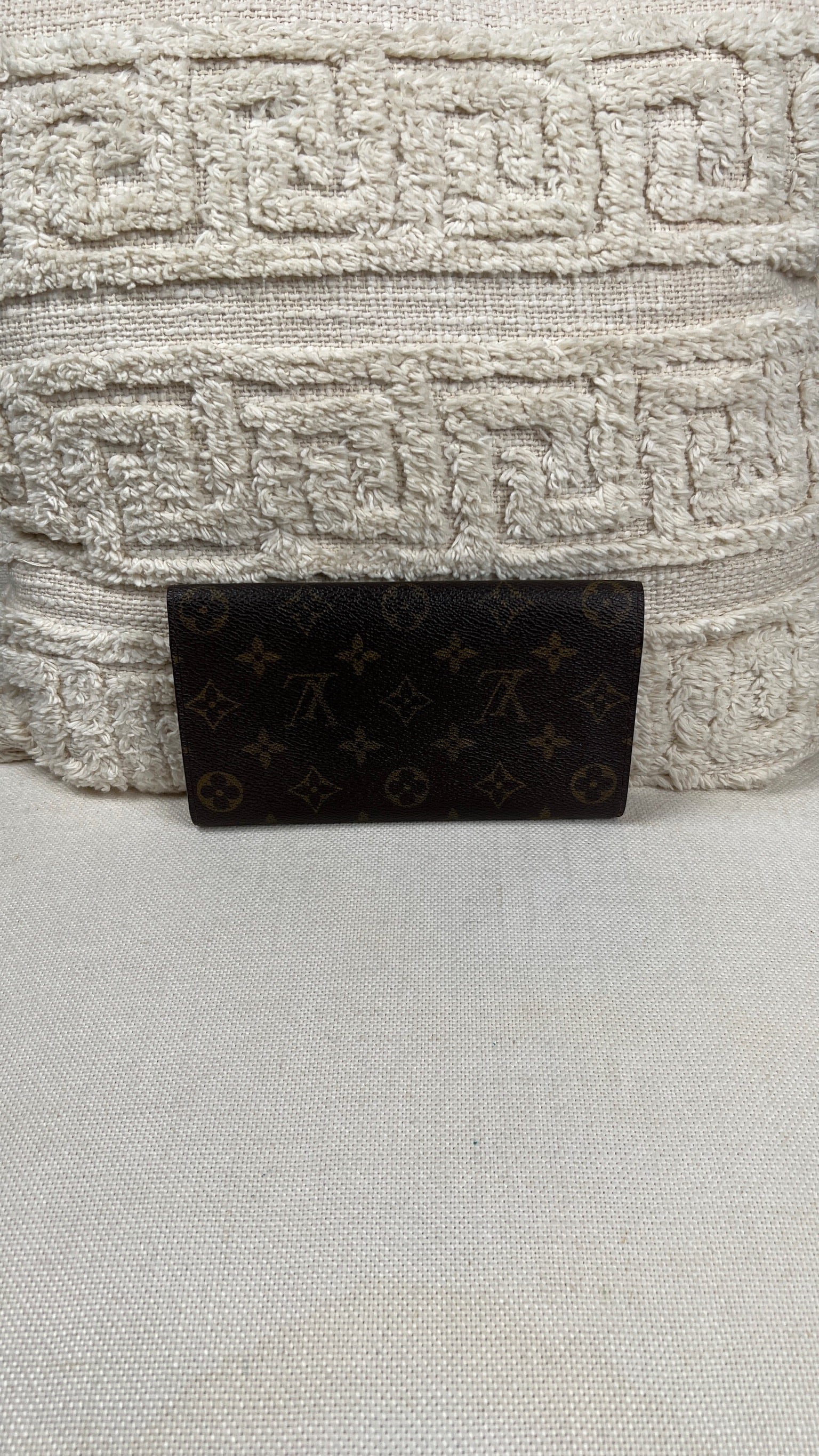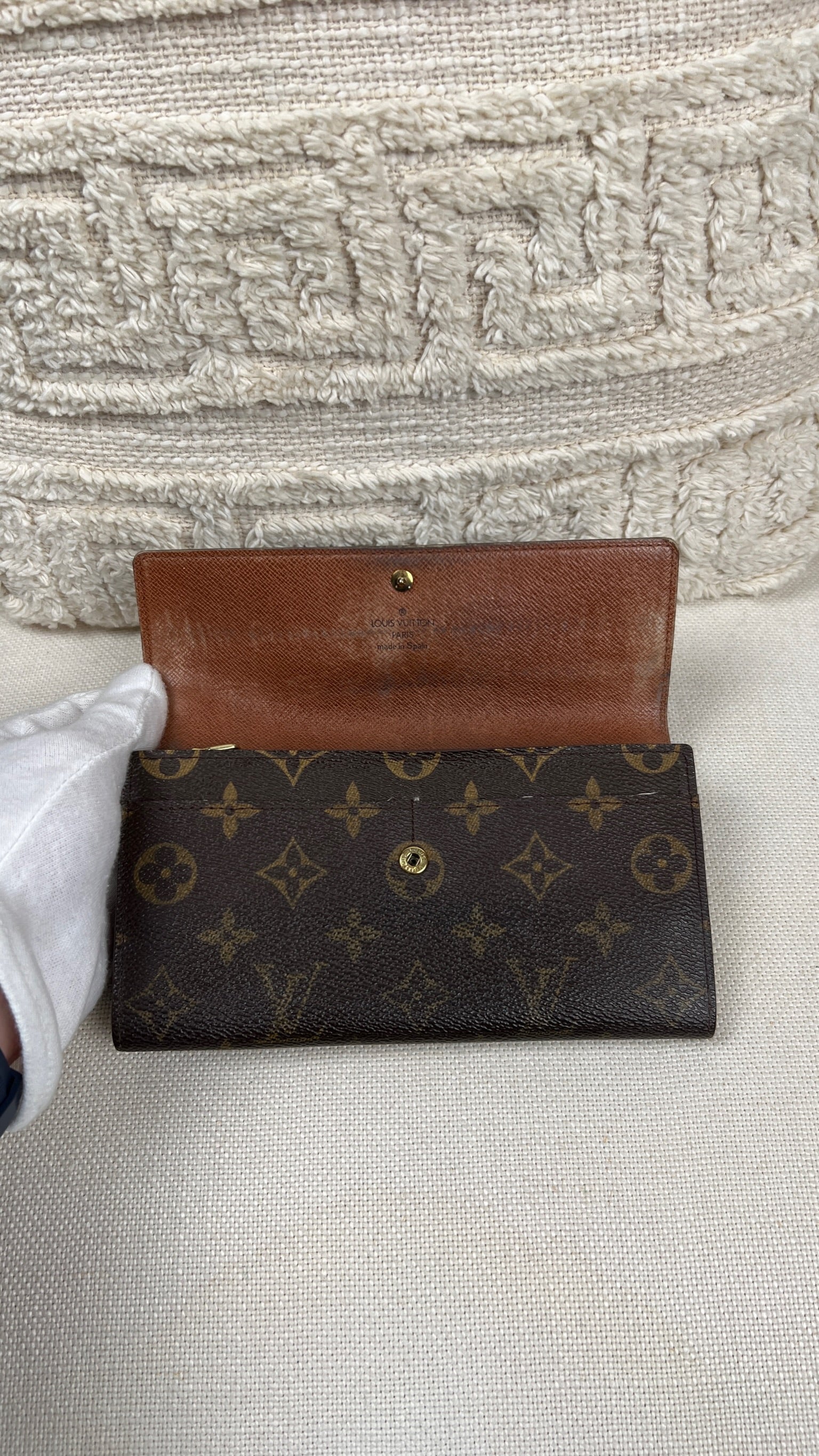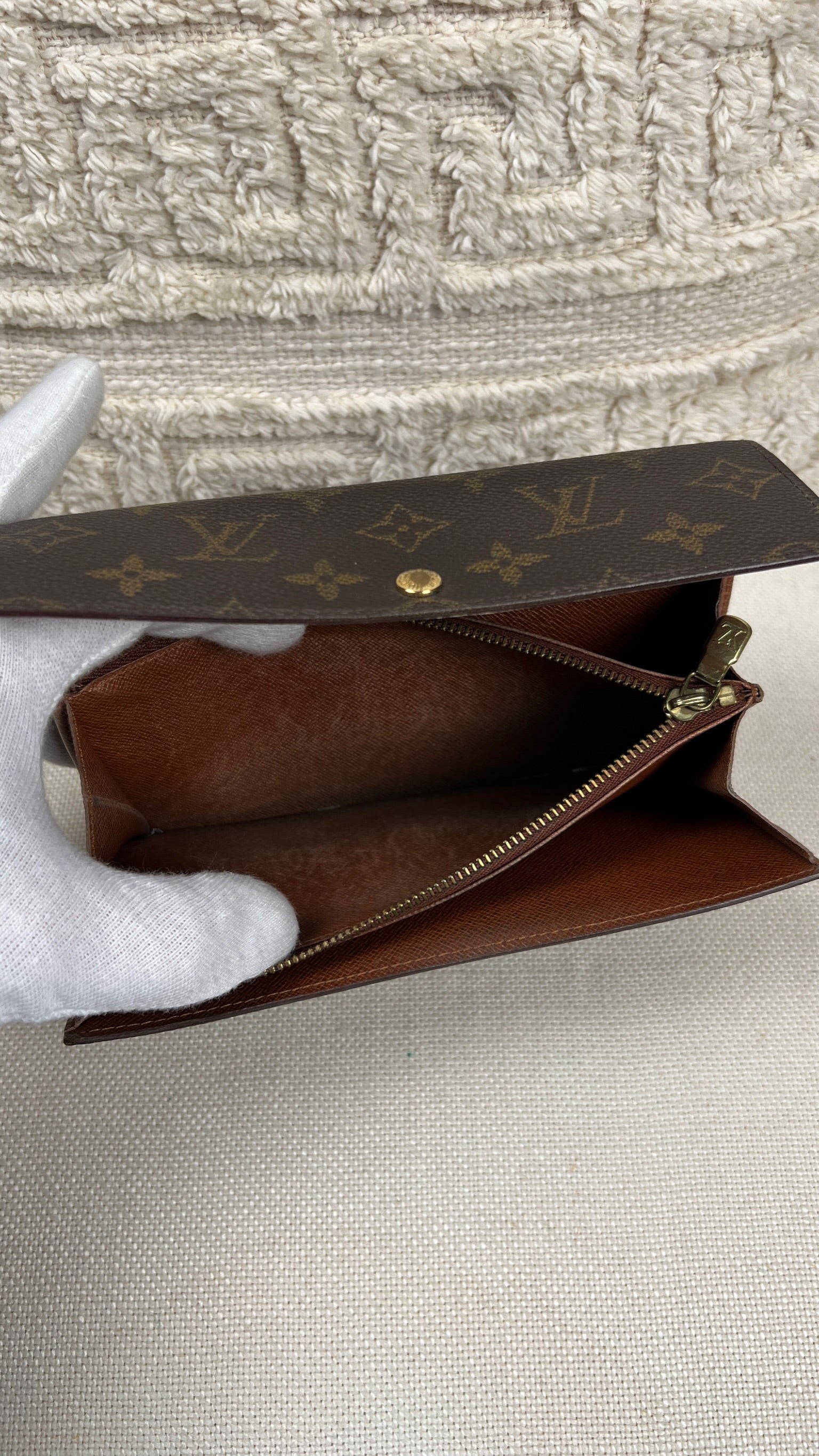 This Louis Vuitton Sarah wallet is in fair / good condition. The canva is in very good condition. The corners are in good condition. The interior is in ok / good condition, but has signs of wear on the zipper pocket and flap. The button is worn from normal use. Sides also shows some signs of wear.