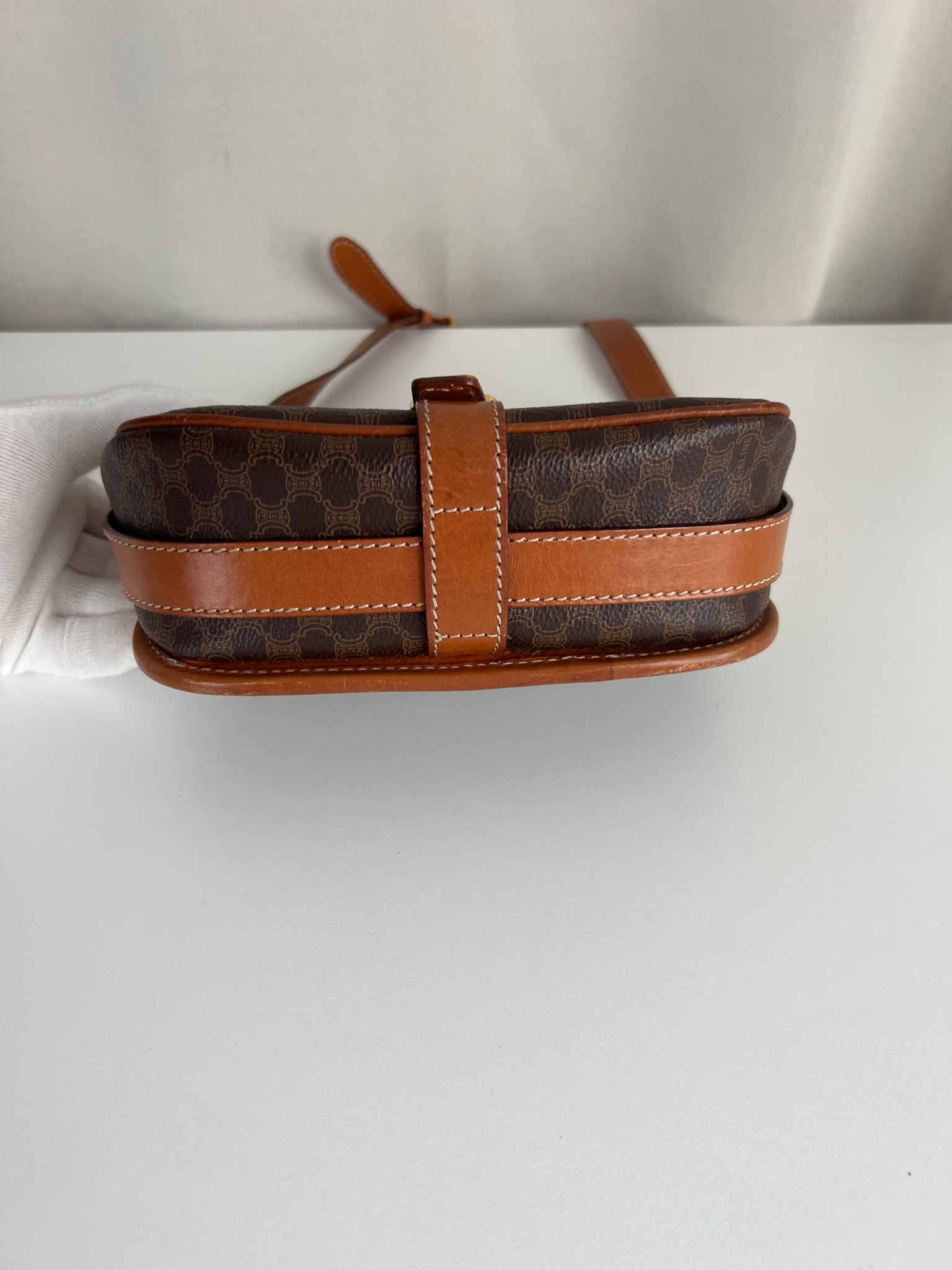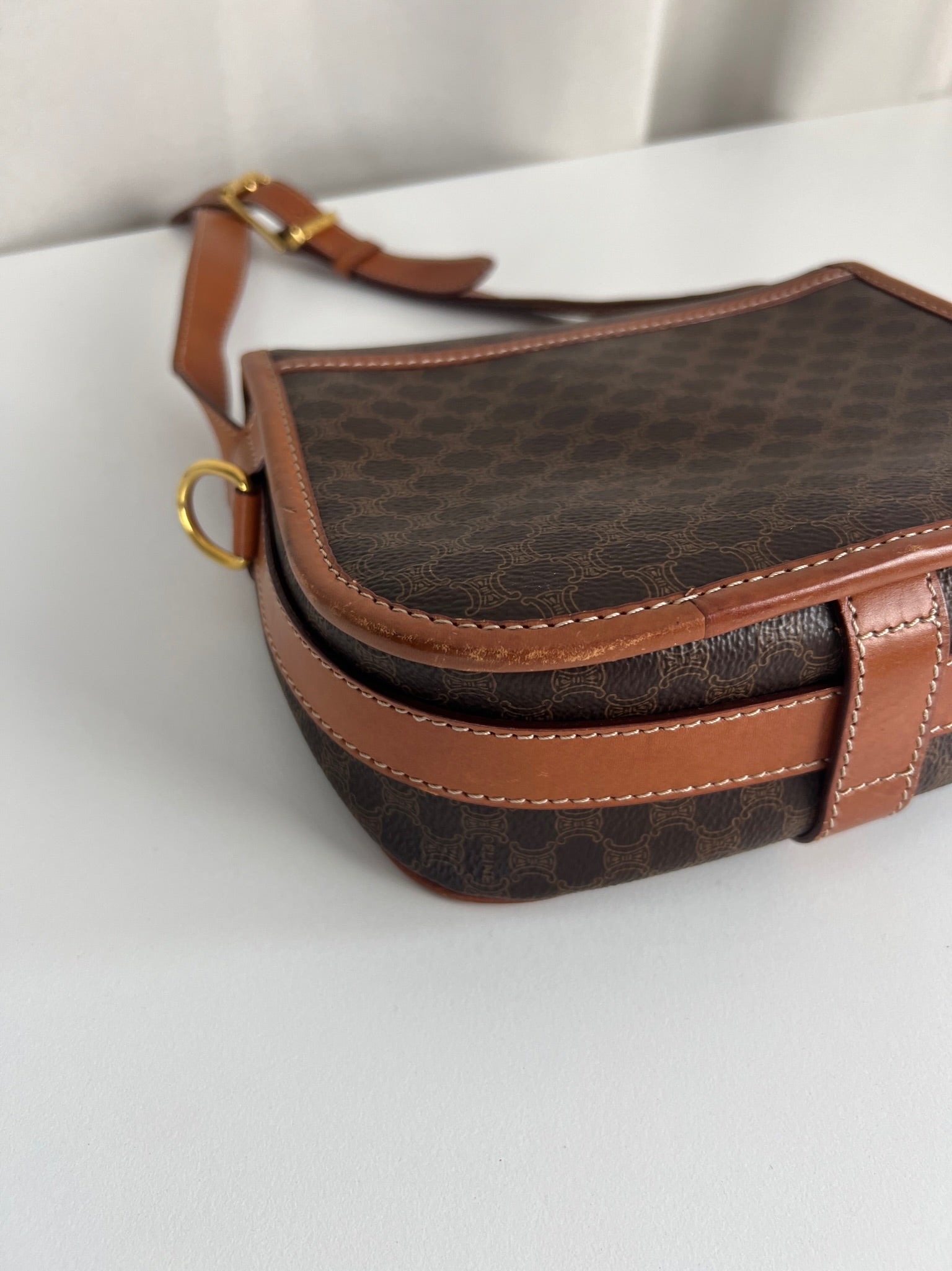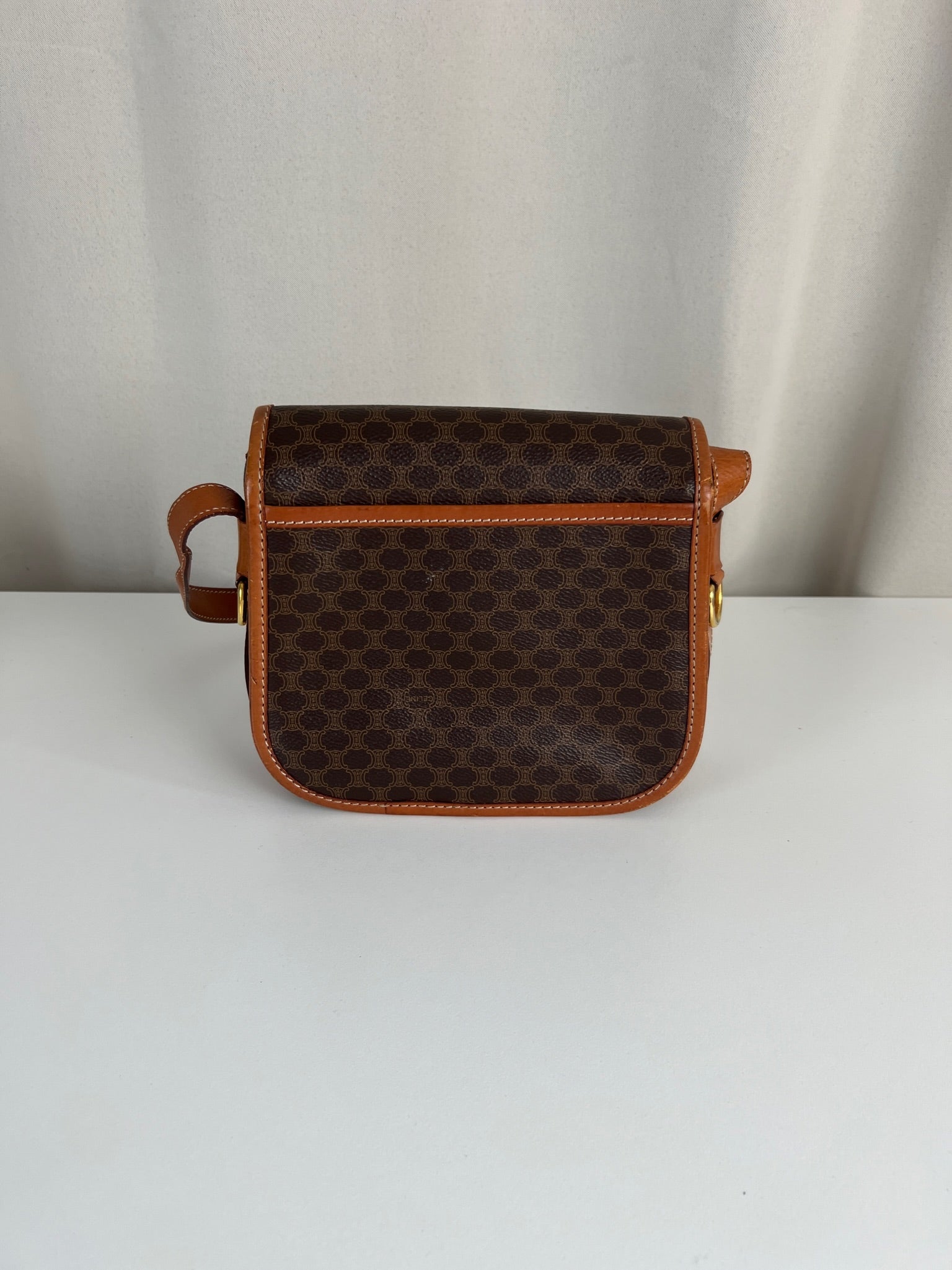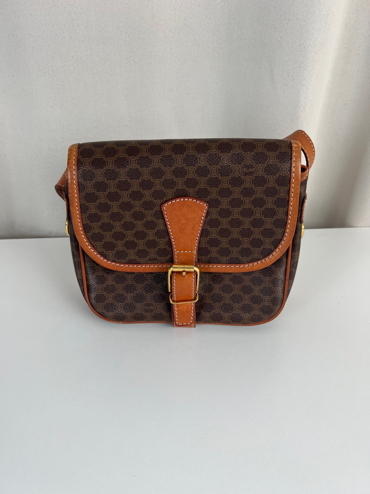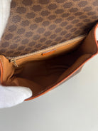 This Celine Macadam Shoulder Bag is in very good condition. You can wear it crossbody. The canvas is in very good condition. The corners and sides are in good condition, a little bit rubbed. The strap is in very good condition and you can adjust it. Tee hardware is in very good condition. The interior is in very good condition too.