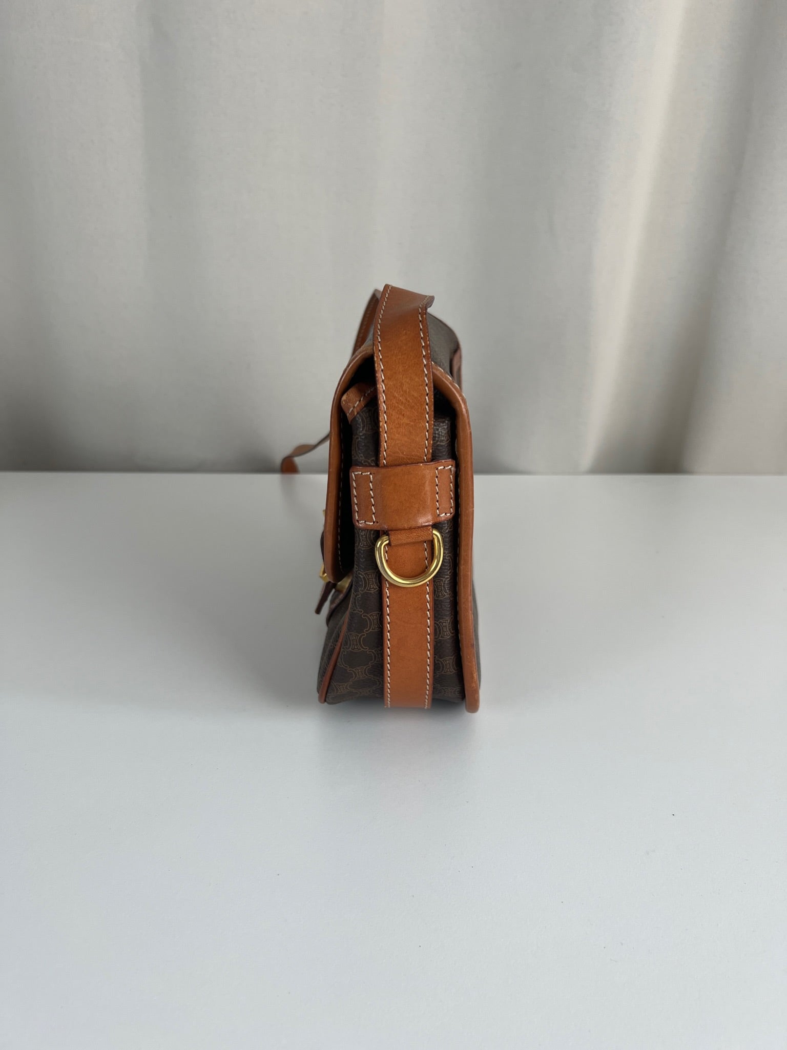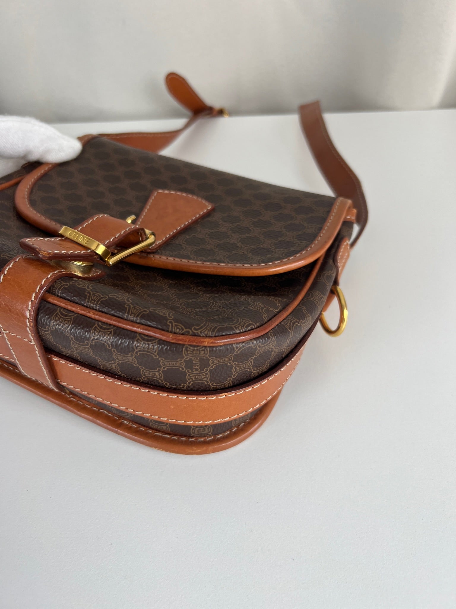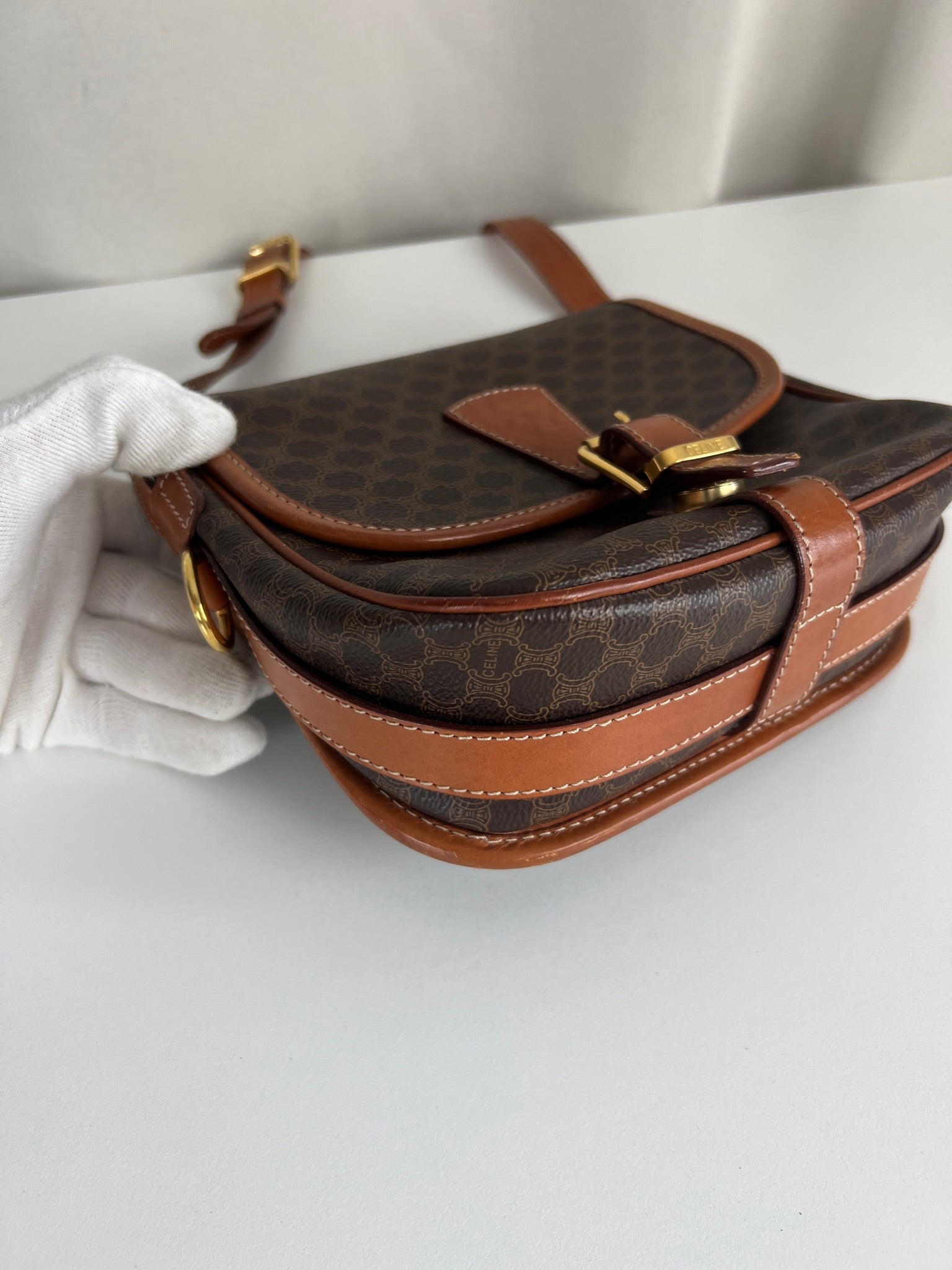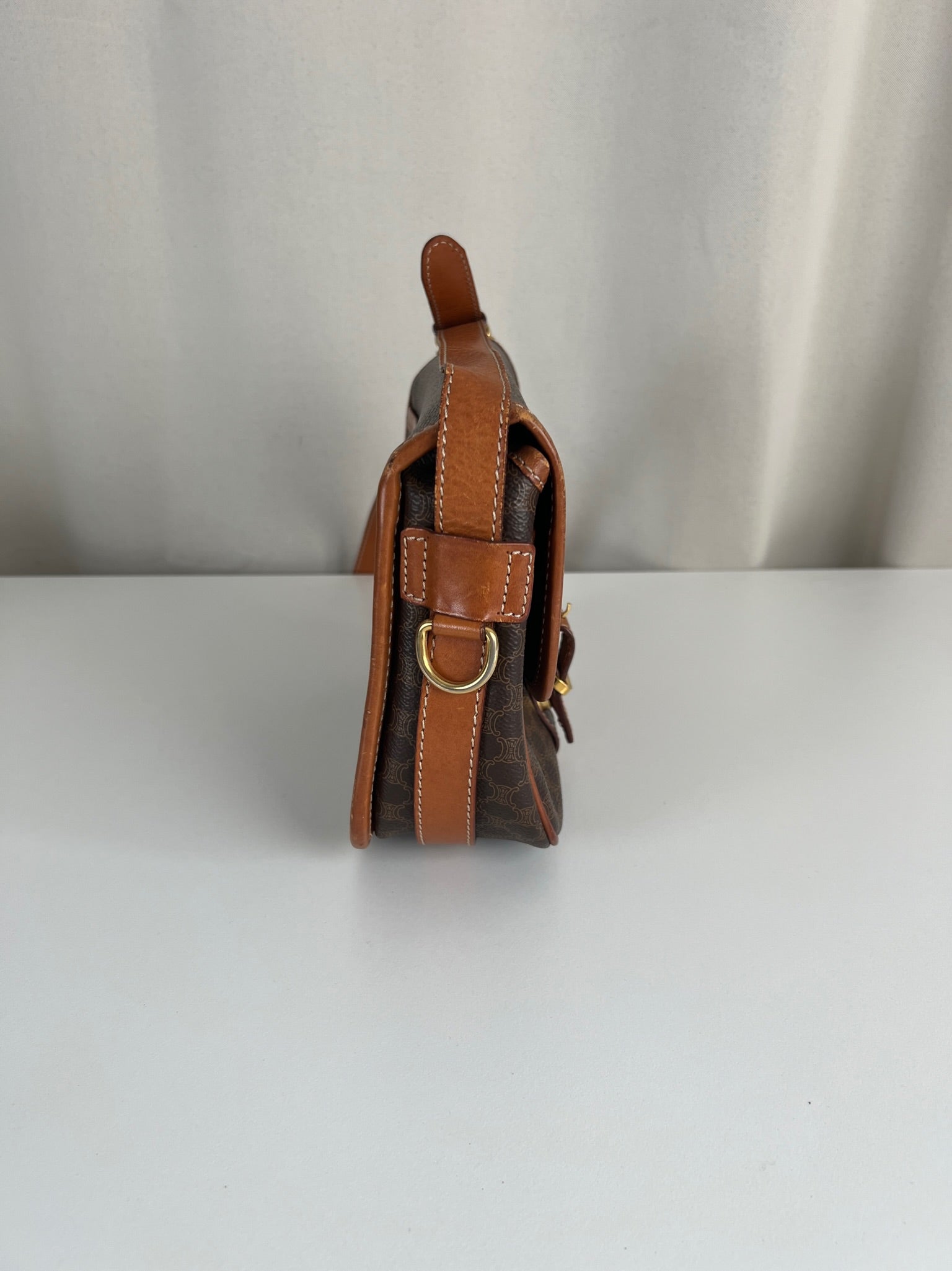 This Celine Macadam Shoulder Bag is in very good condition. You can wear it crossbody. The canvas is in very good condition. The corners and sides are in good condition, a little bit rubbed. The strap is in very good condition and you can adjust it. Tee hardware is in very good condition. The interior is in very good condition too.