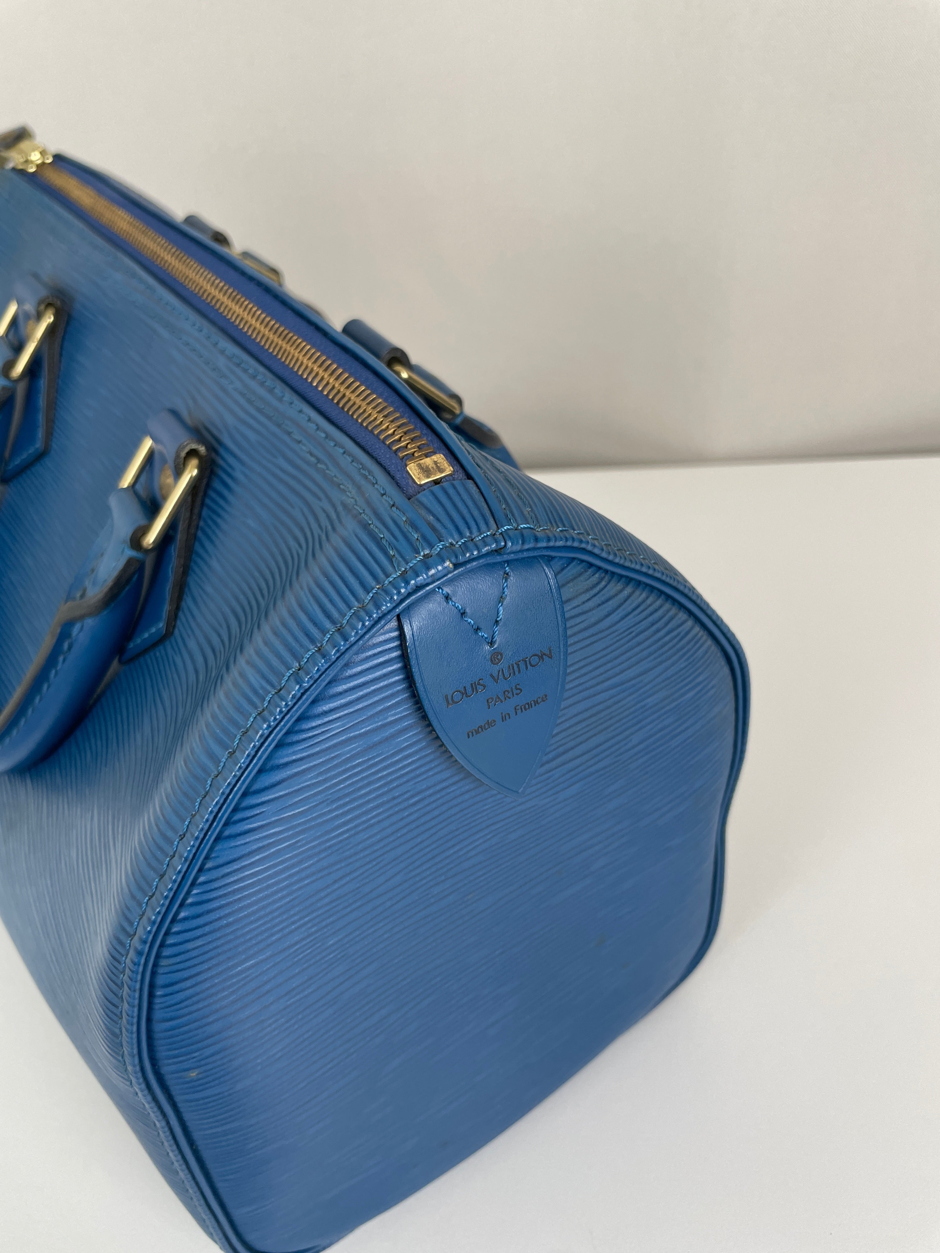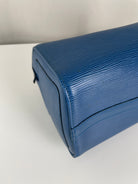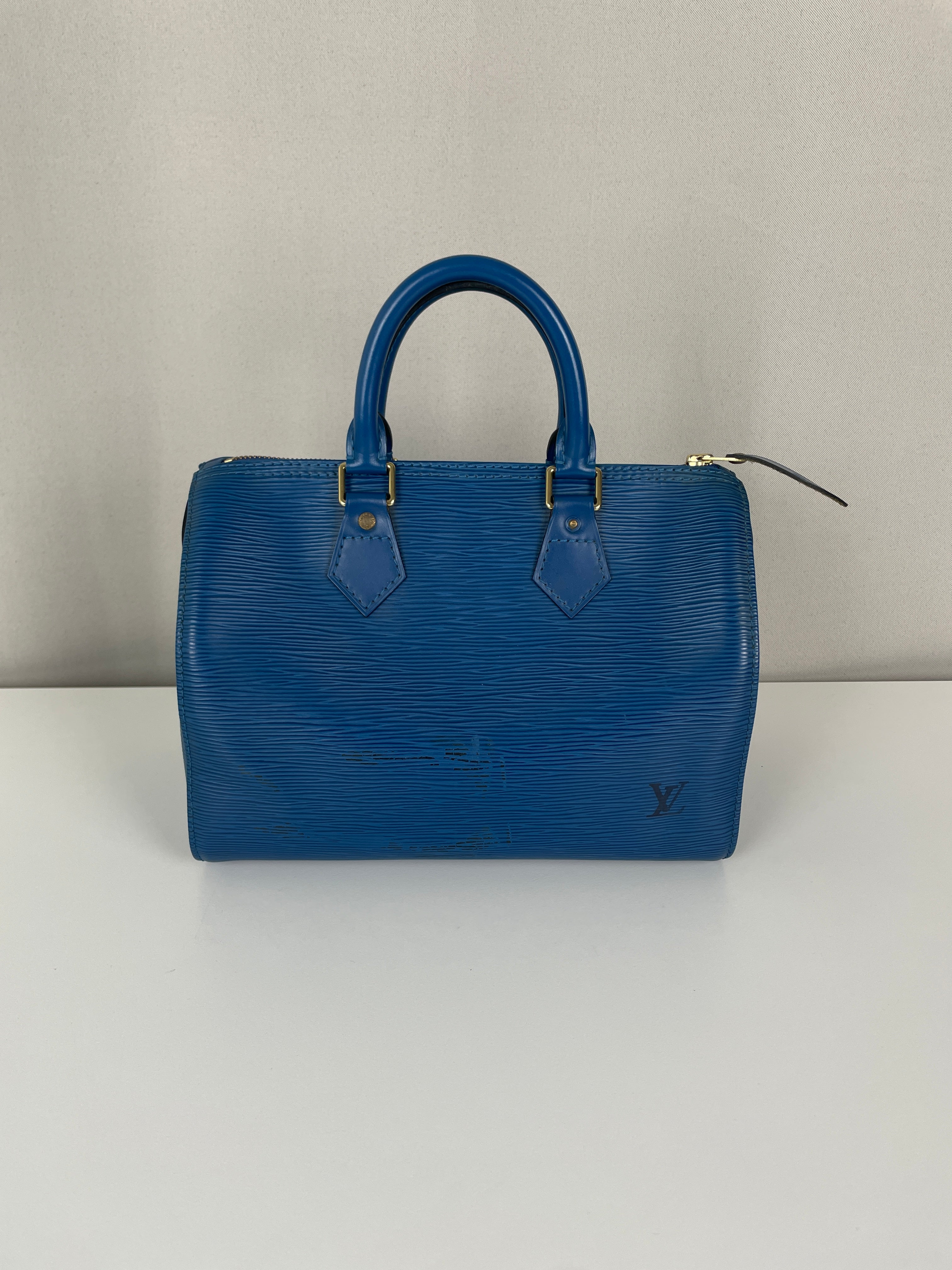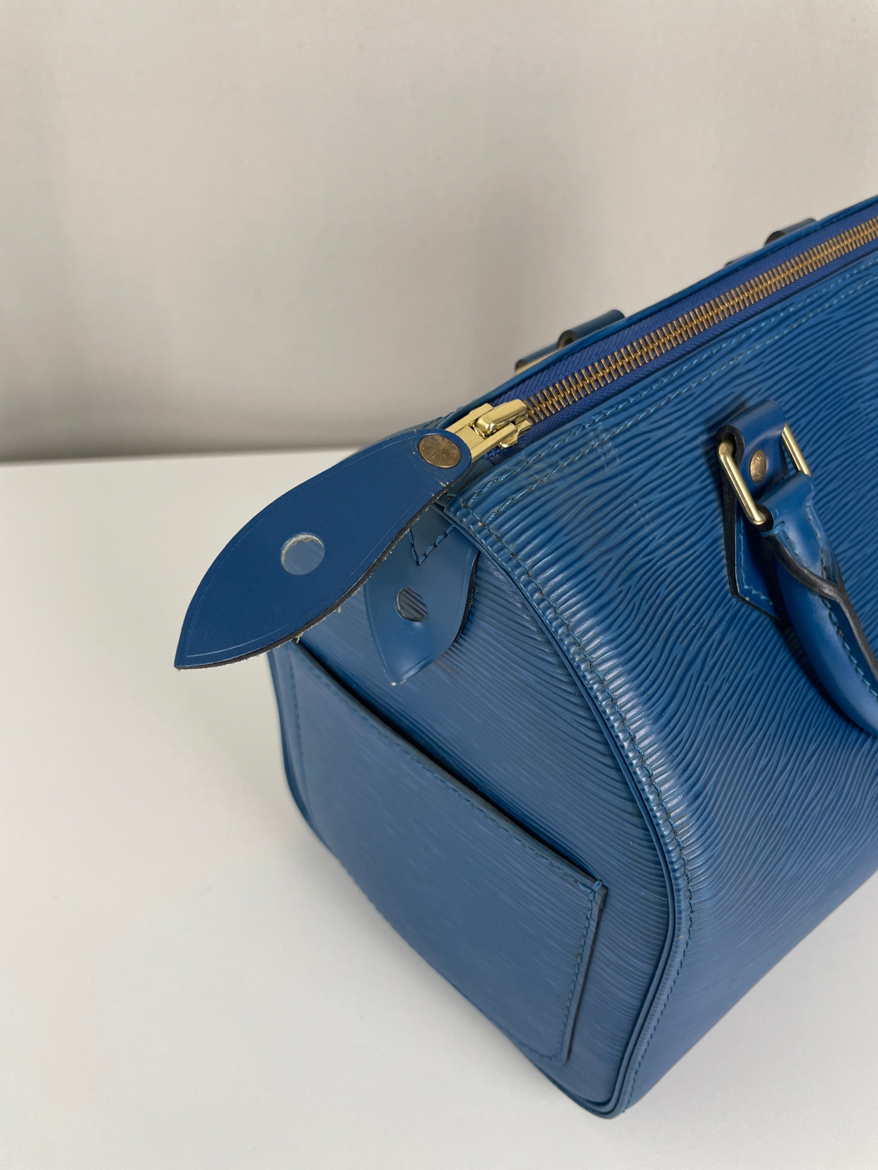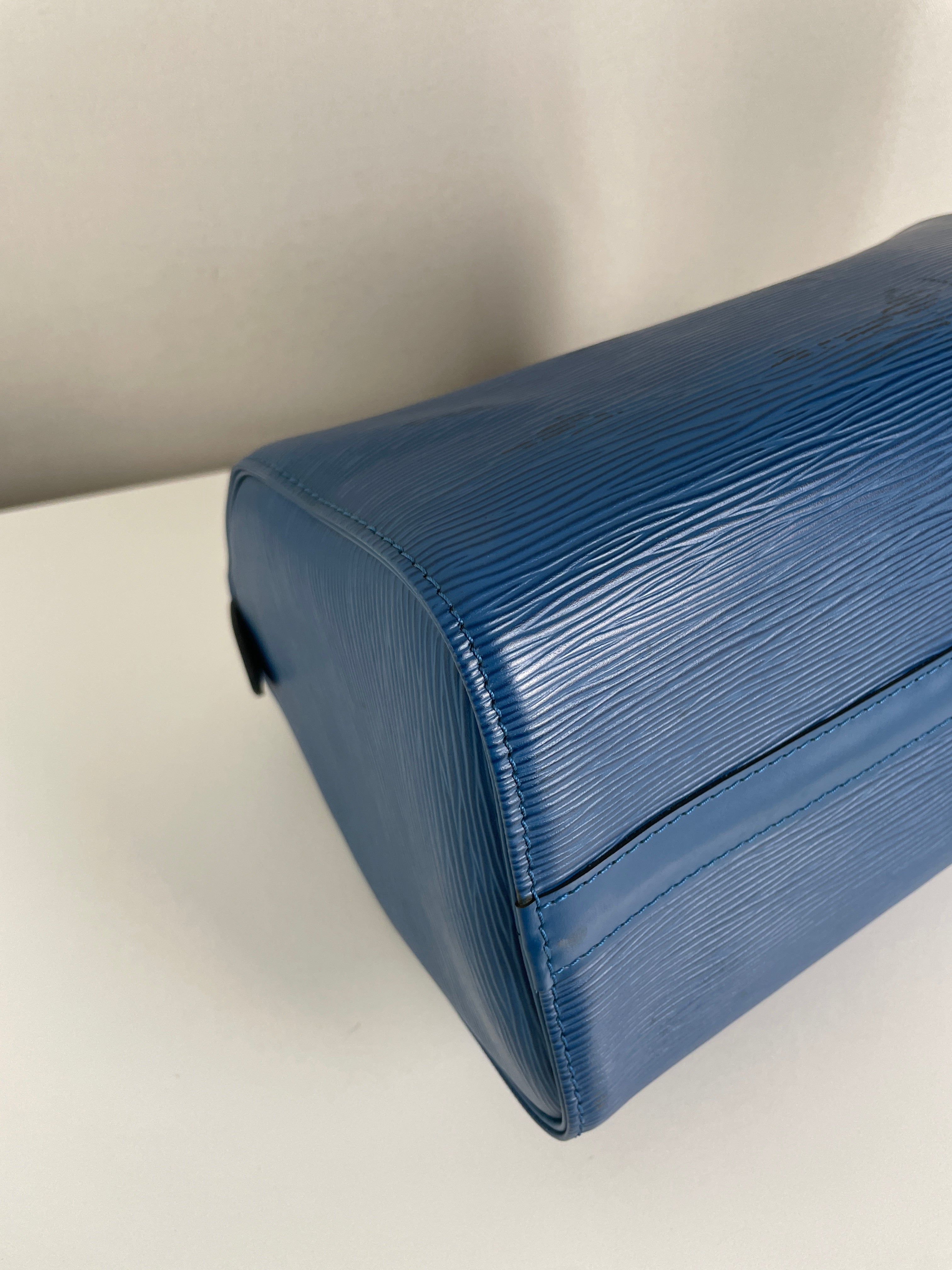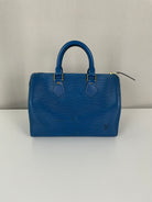 The Louis Vuitton Speedy 25 in blue Epi leather is a timeless icon of sophistication and practicality. Compact yet spacious, it is the perfect daily companion. Despite some minor signs of wear and a broken rivet, this bag remains a beautiful piece full of character and charm, highlighting the quality of Louis Vuitton craftsmanship.