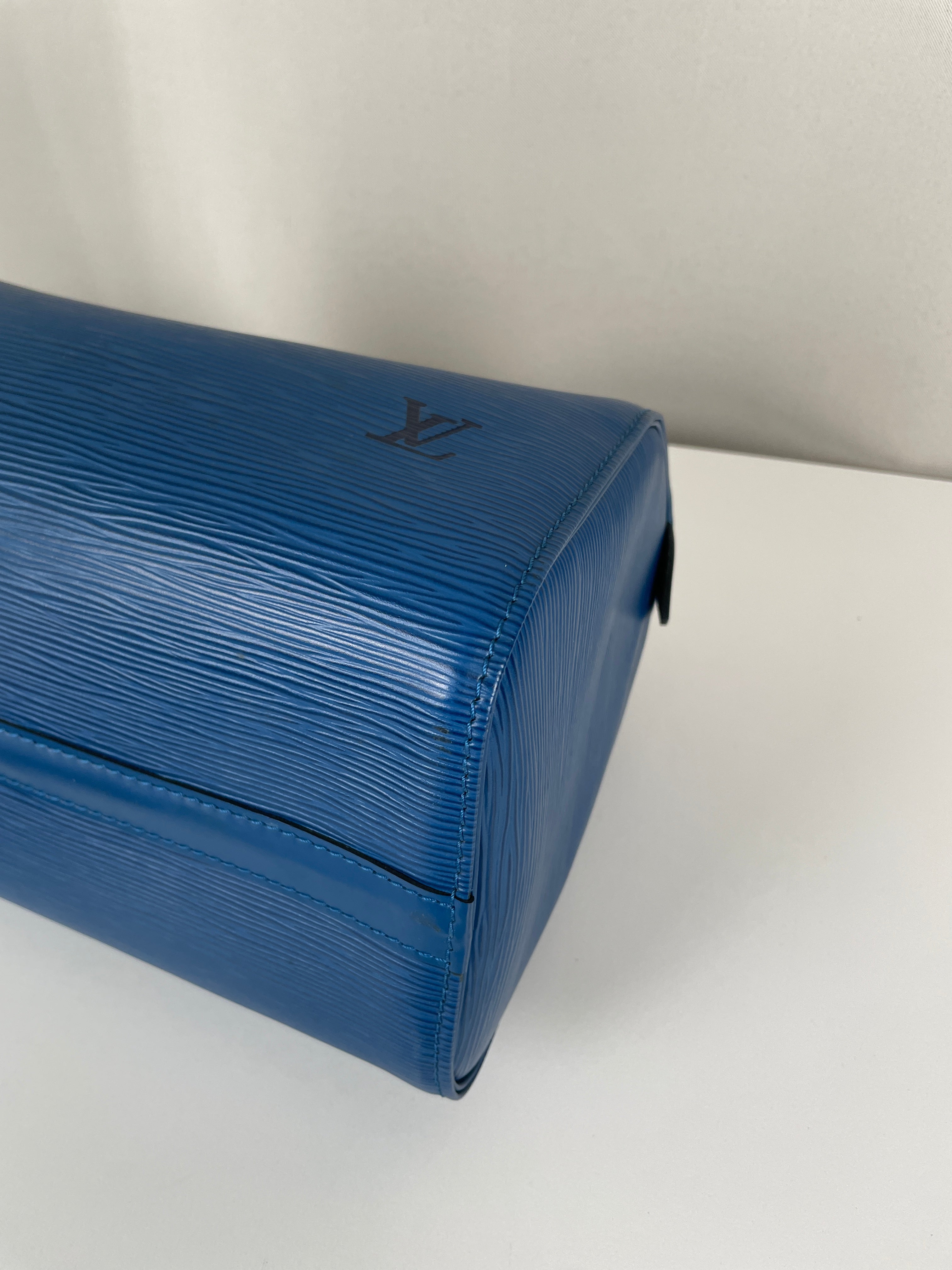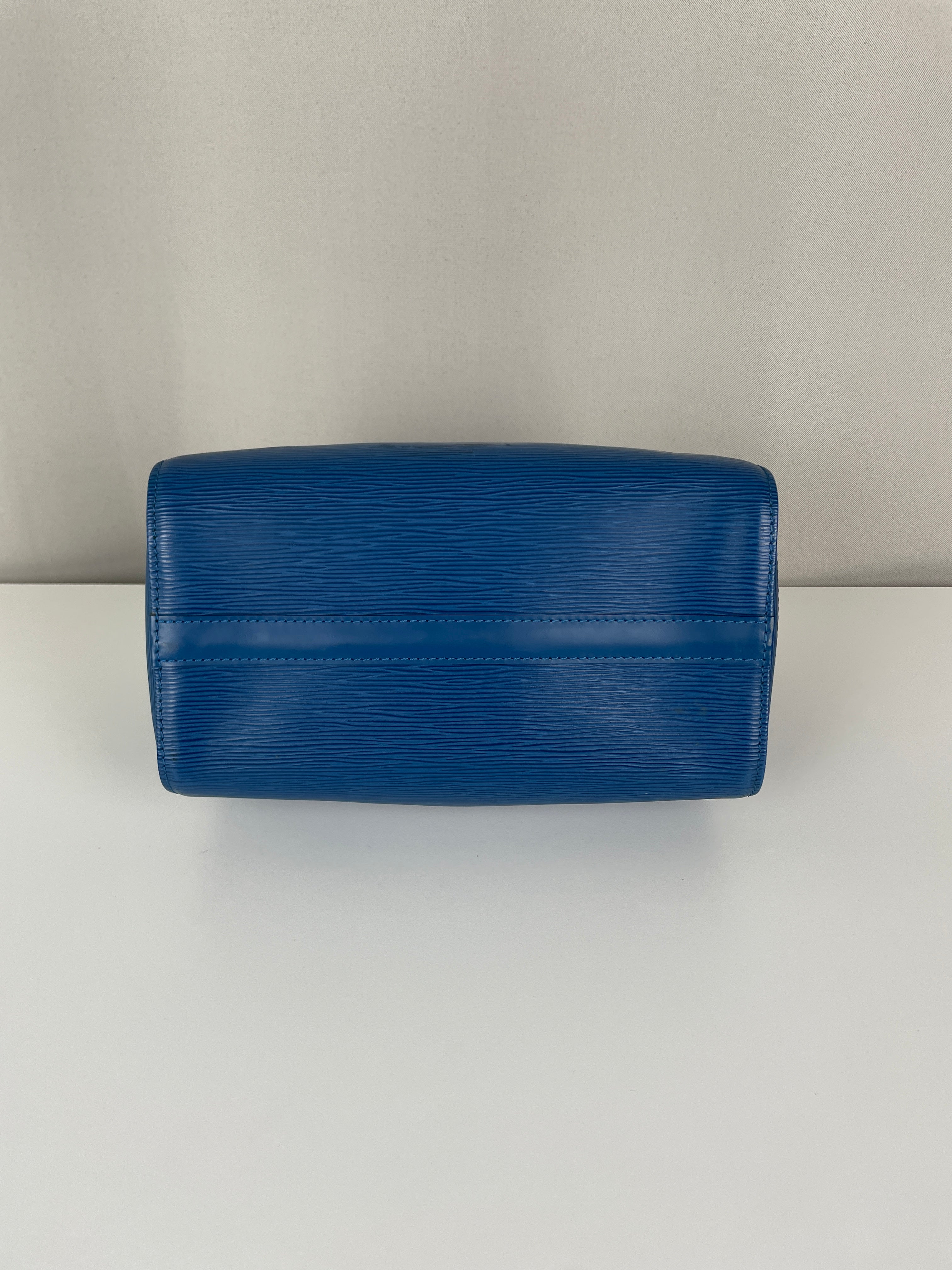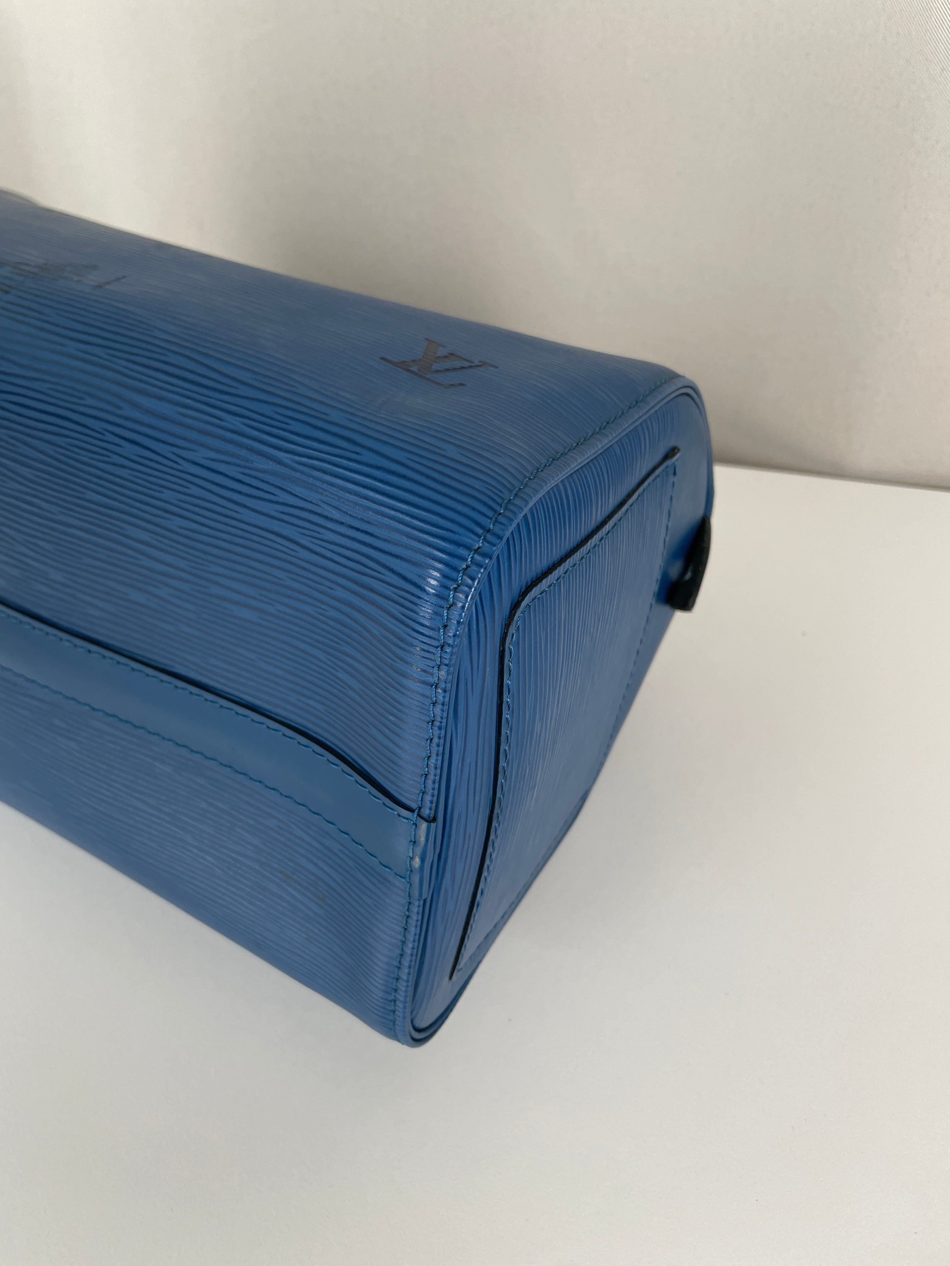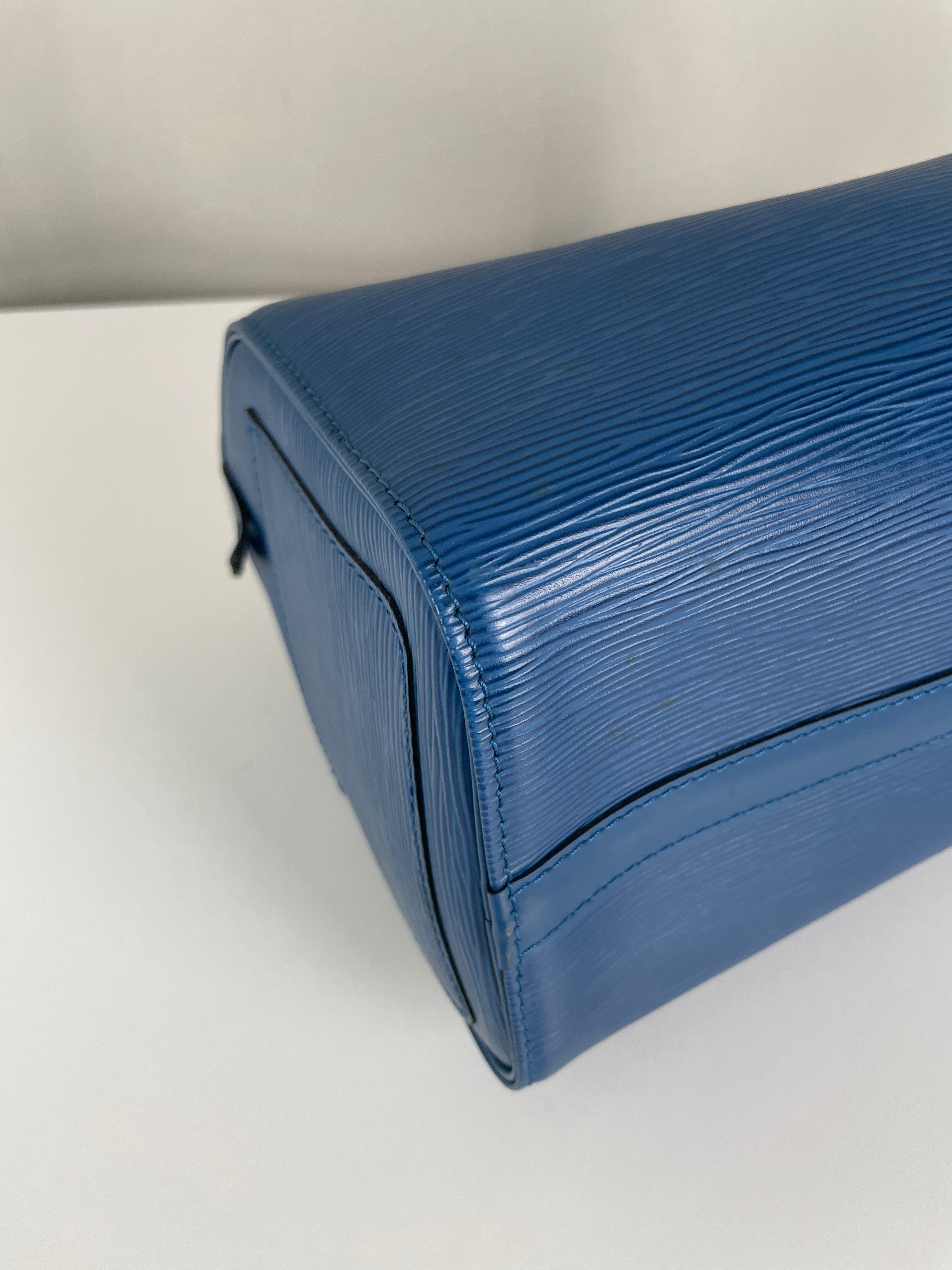 The Louis Vuitton Speedy 25 in blue Epi leather is a timeless icon of sophistication and practicality. Compact yet spacious, it is the perfect daily companion. Despite some minor signs of wear and a broken rivet, this bag remains a beautiful piece full of character and charm, highlighting the quality of Louis Vuitton craftsmanship.