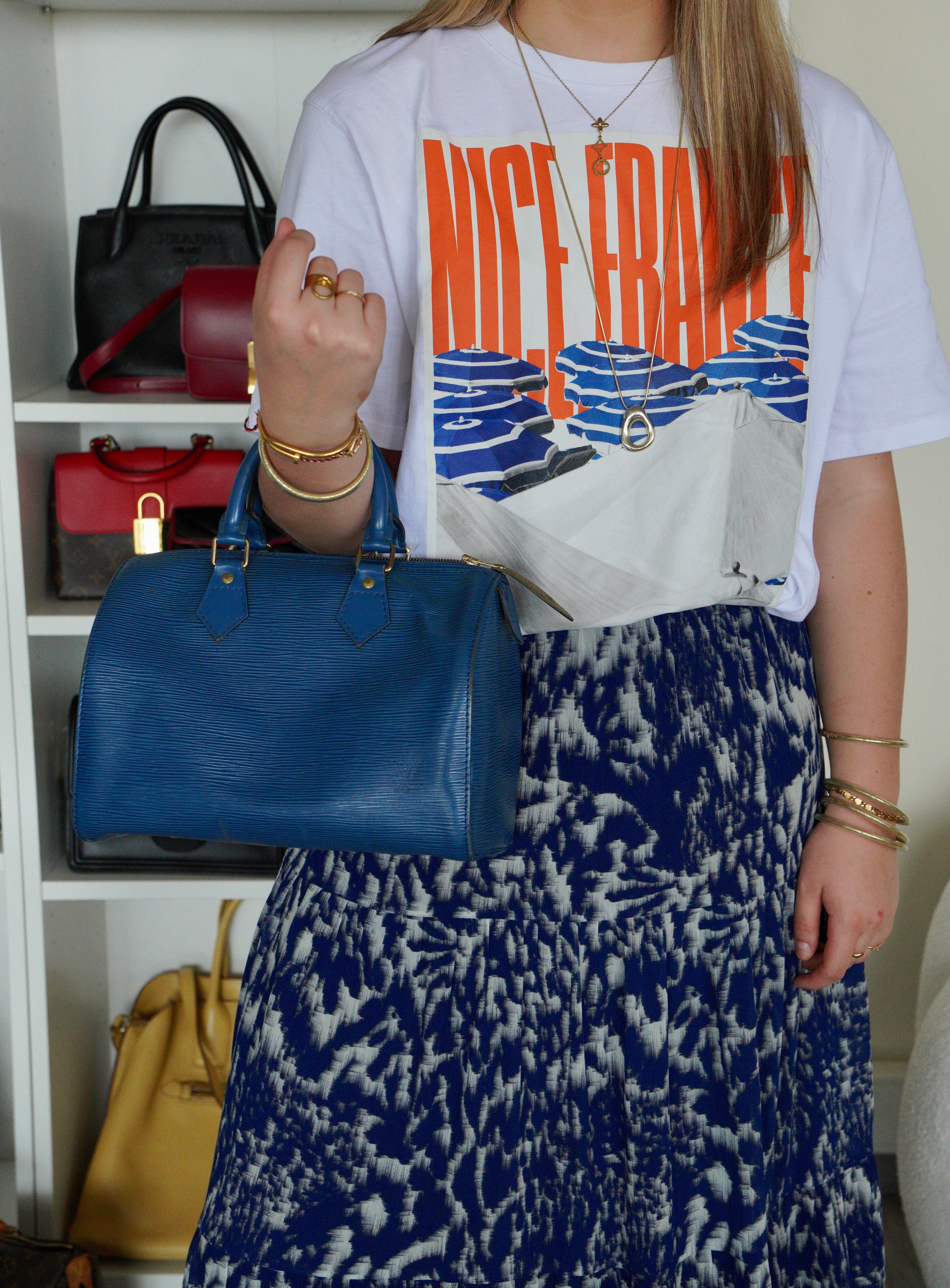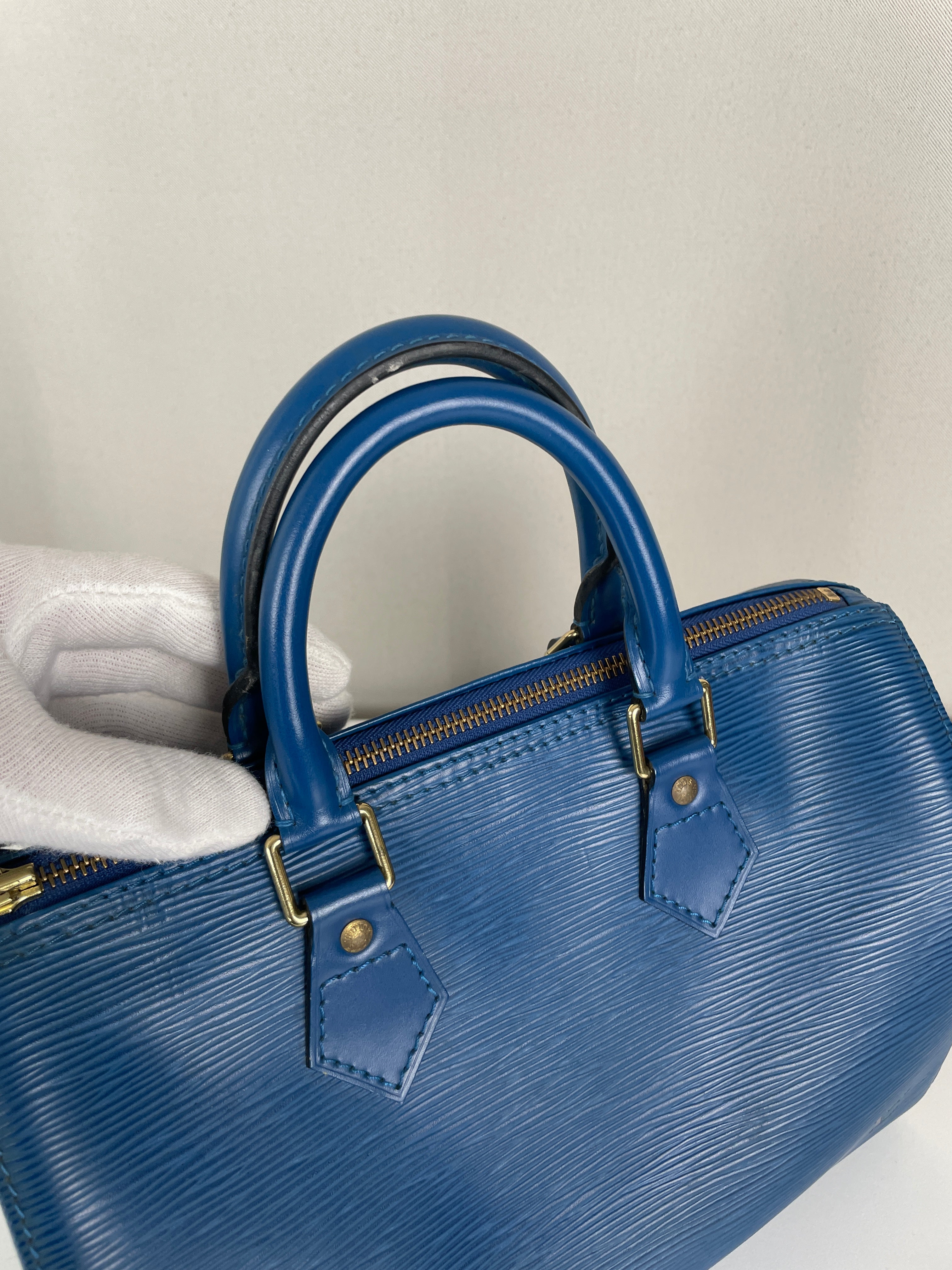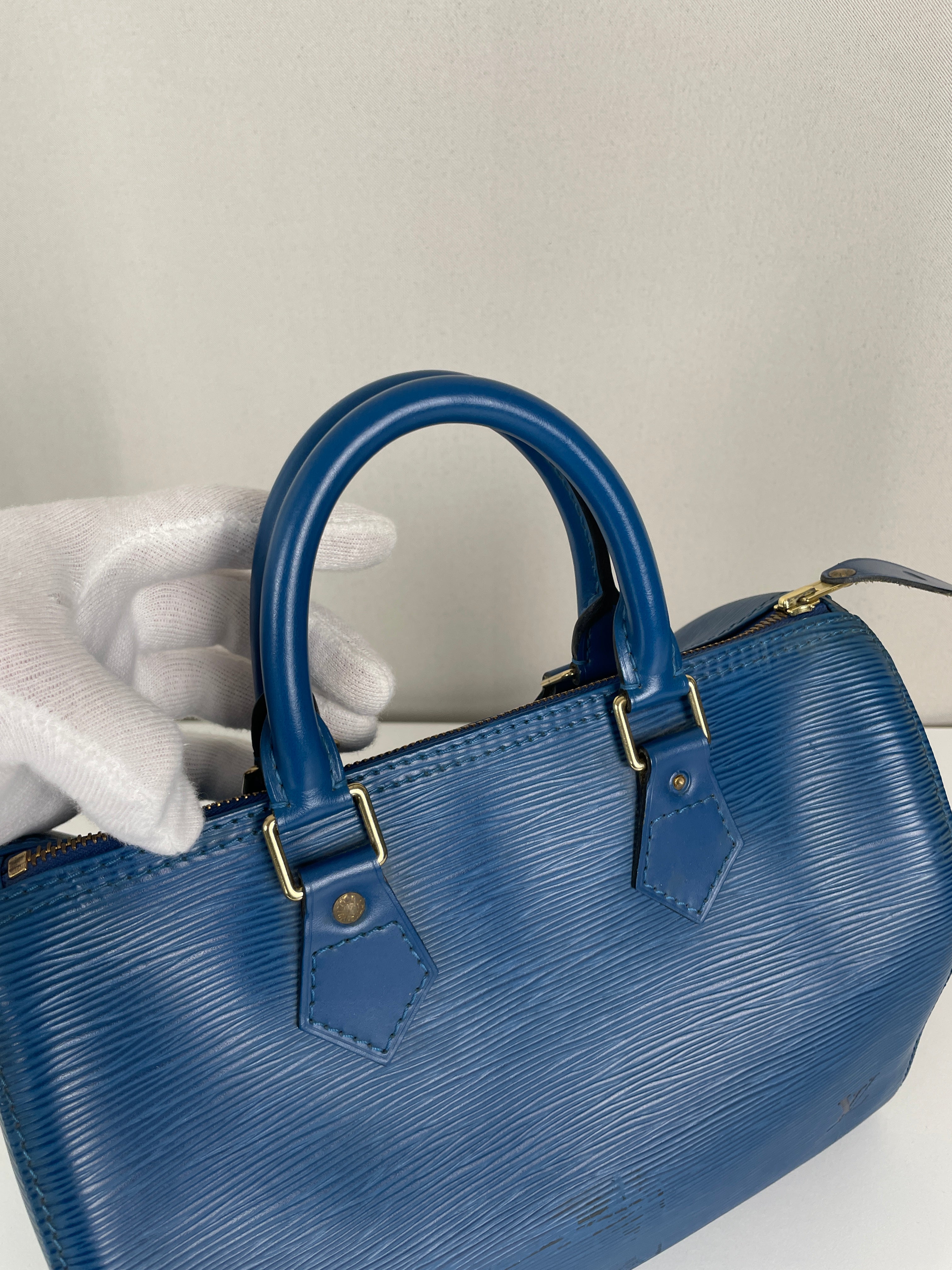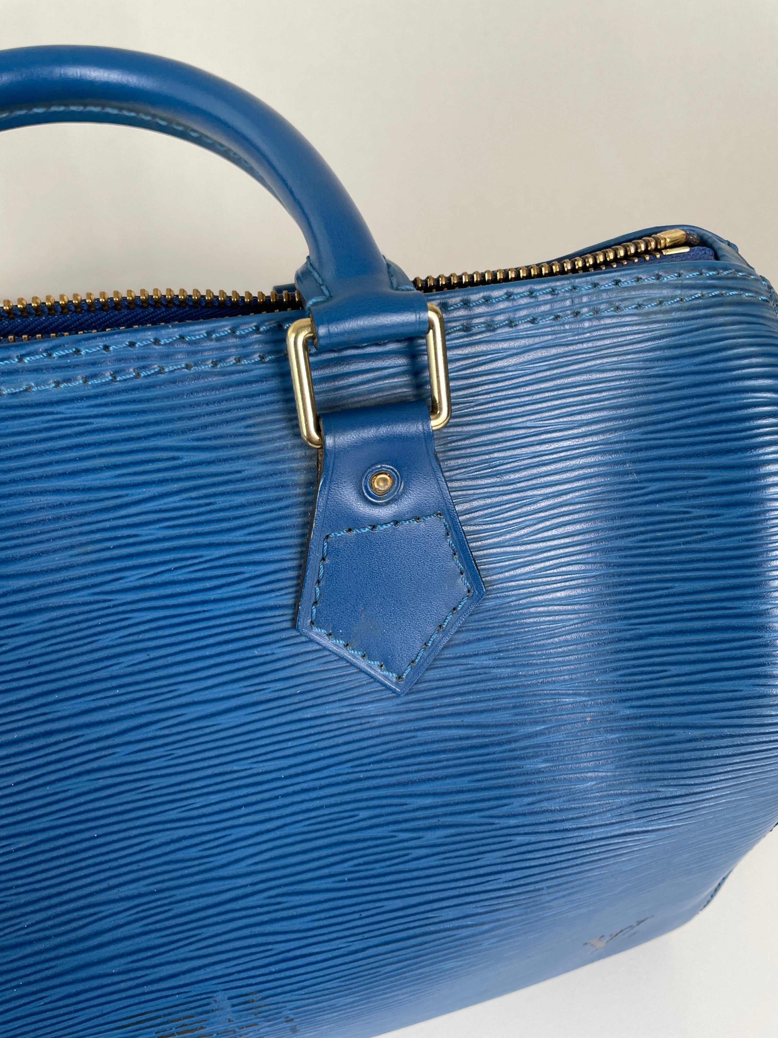 The Louis Vuitton Speedy 25 in blue Epi leather is a timeless icon of sophistication and practicality. Compact yet spacious, it is the perfect daily companion. Despite some minor signs of wear and a broken rivet, this bag remains a beautiful piece full of character and charm, highlighting the quality of Louis Vuitton craftsmanship.