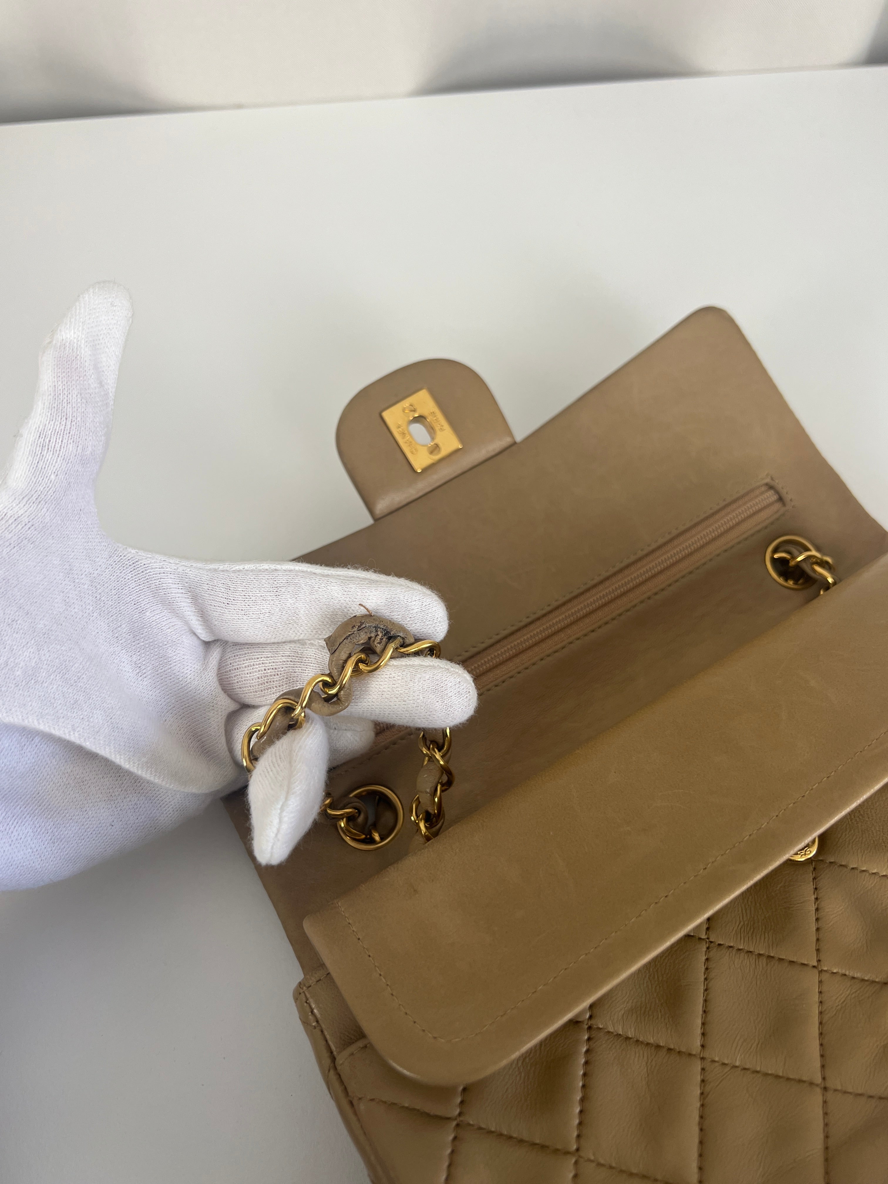 This Chanel double flap bag is in very good condition. The leather and the corners are in very good condition. The bag has been well repainted (it was also beige before). The interior is in very good condition with only small scratches. The strap is in good condition with only a small damage on one part (you can see on the photo). The hardware is in very good condition.