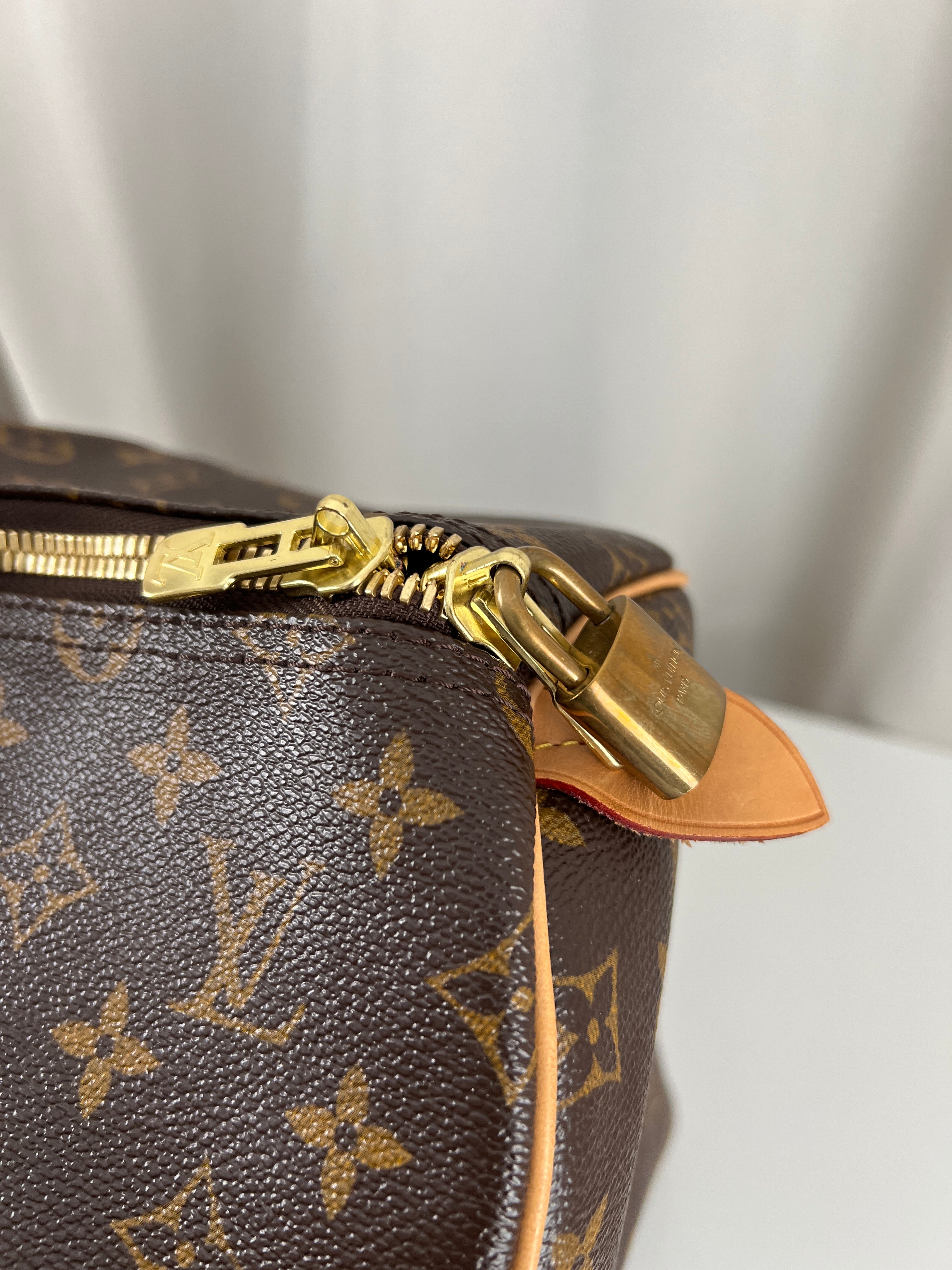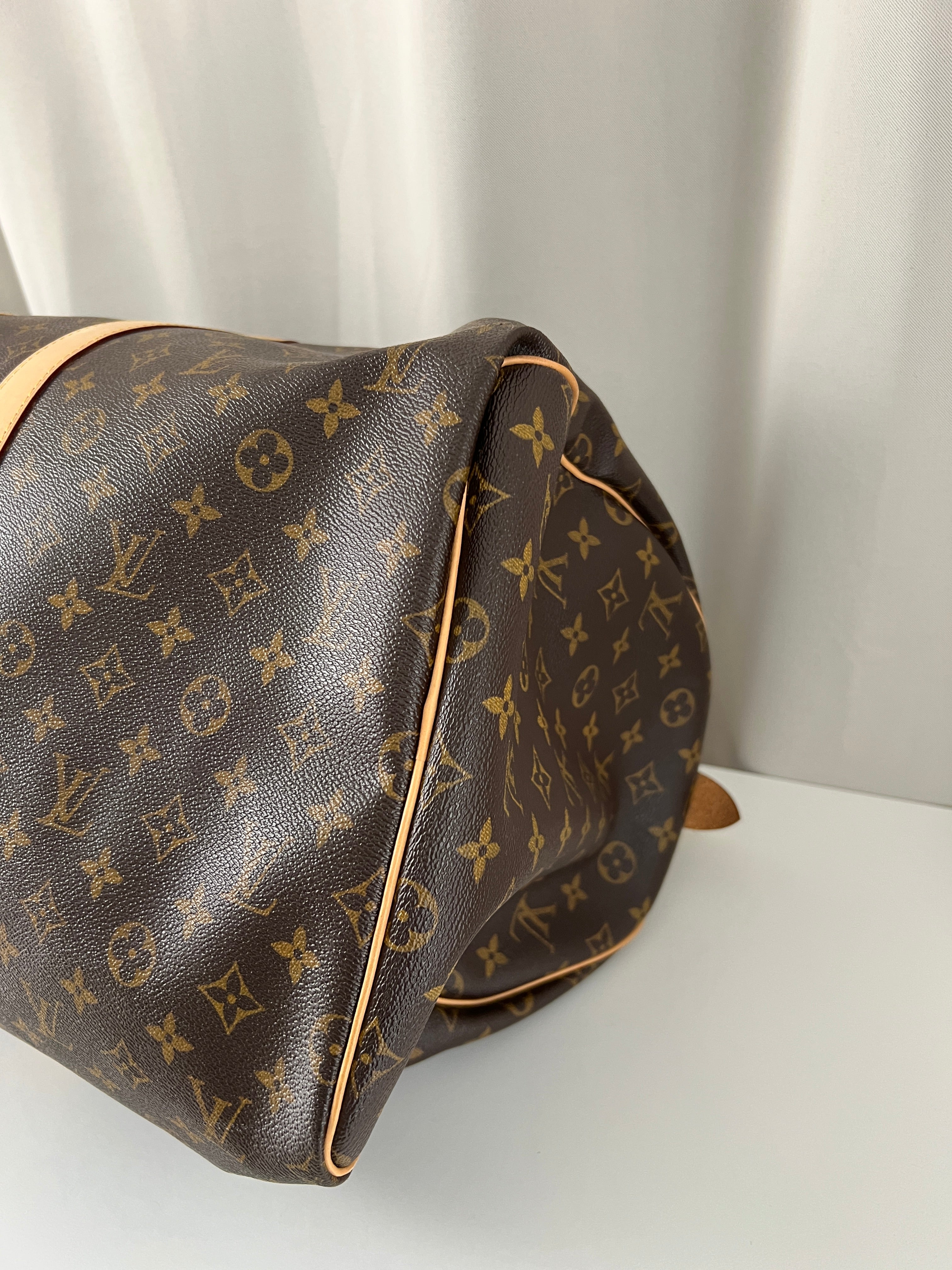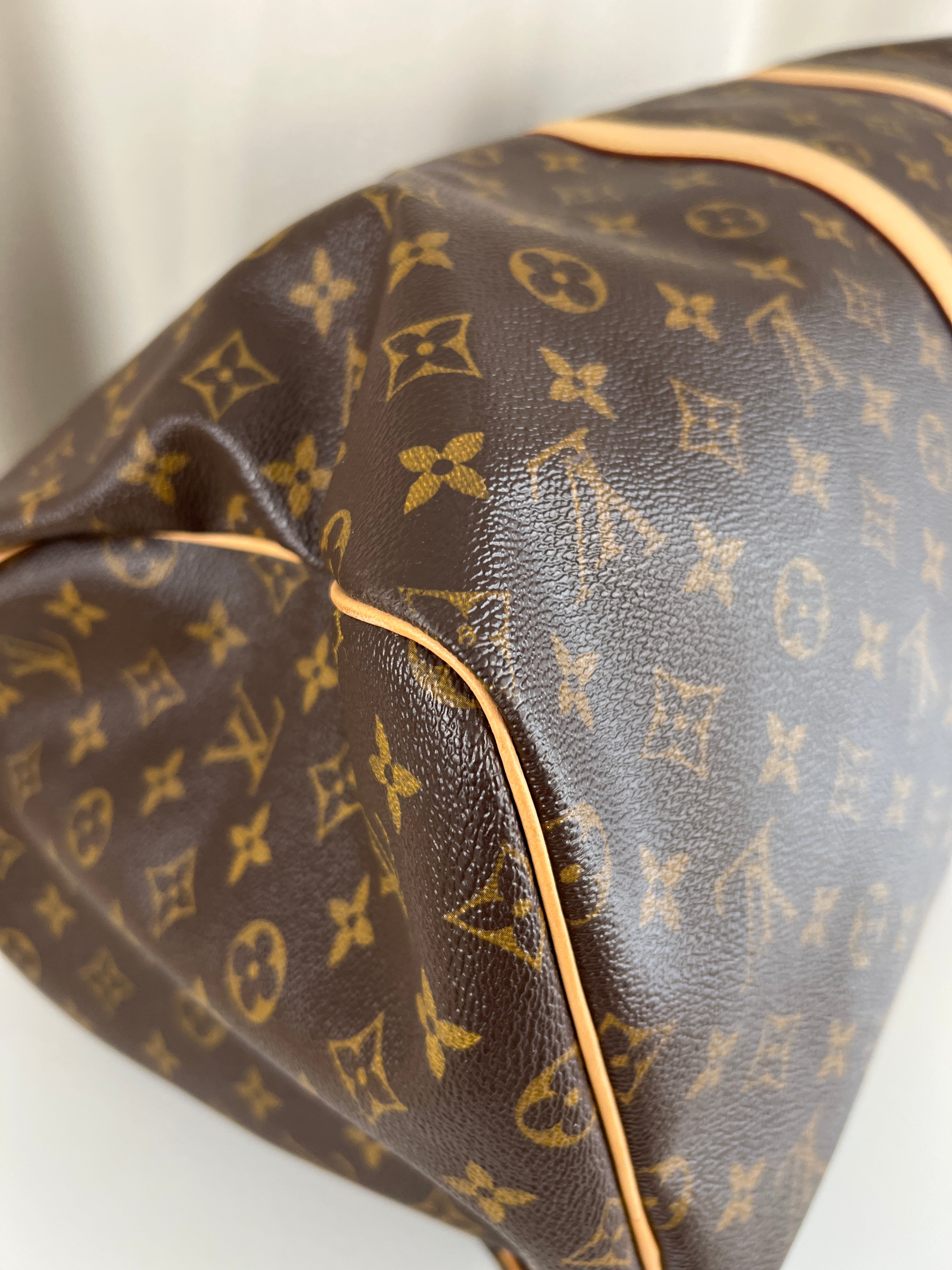 This Louis Vuitton Keepall is in very good condition. The leather is in very good condition very light with only small signs of wear. The canva is in very good condition. The corners are in perfect condition. The interior is in very good condition as well. The hardware is very lightly worn. Not used a lot it's a beautiful one. It comes with box and dustbag !