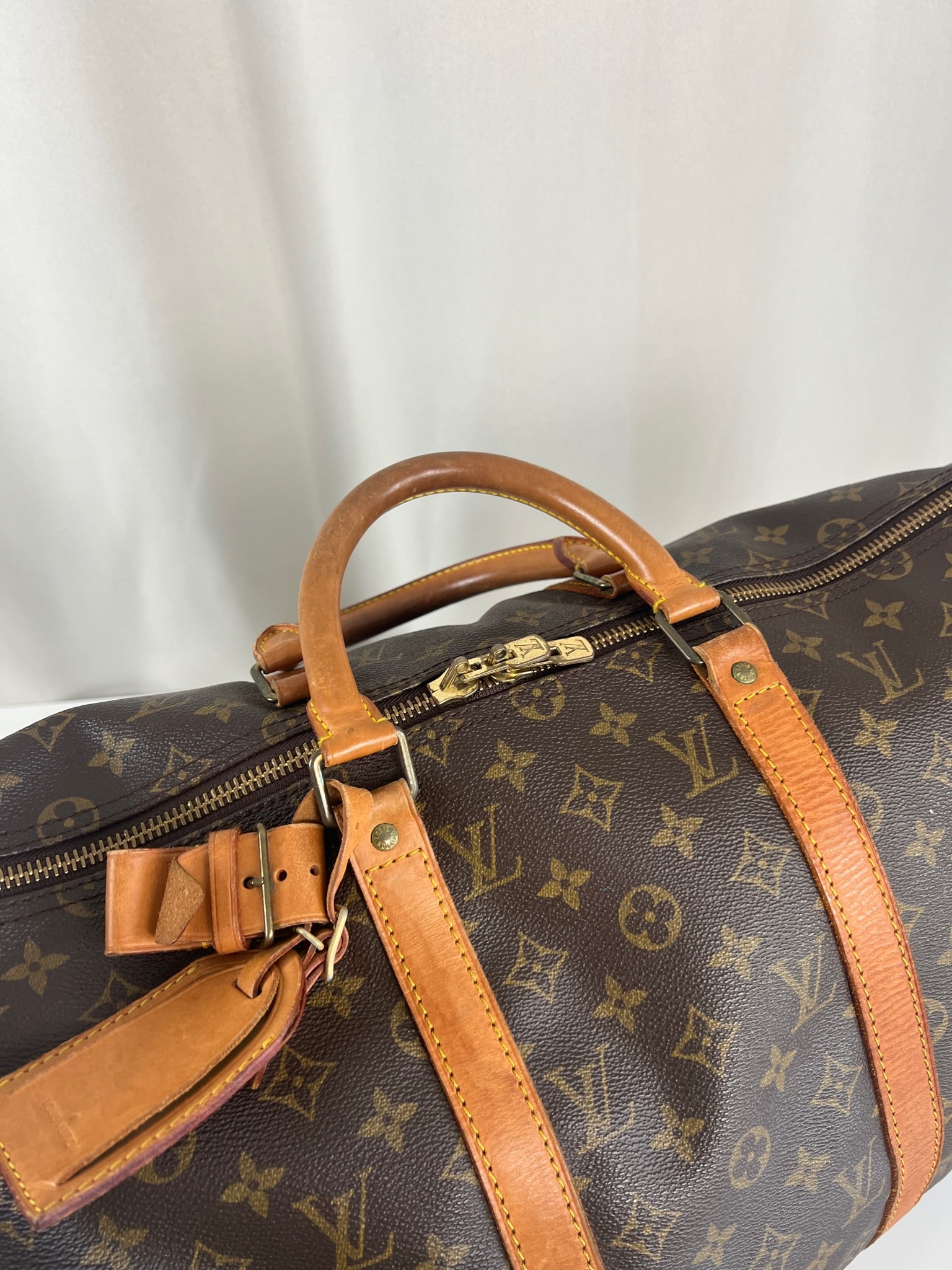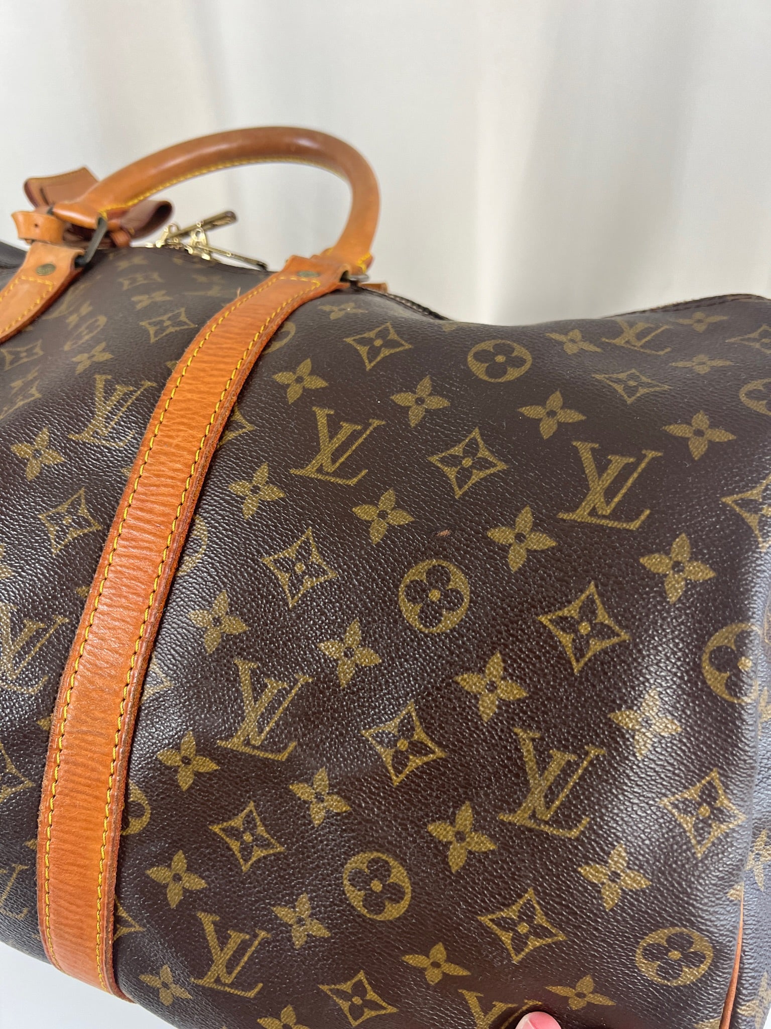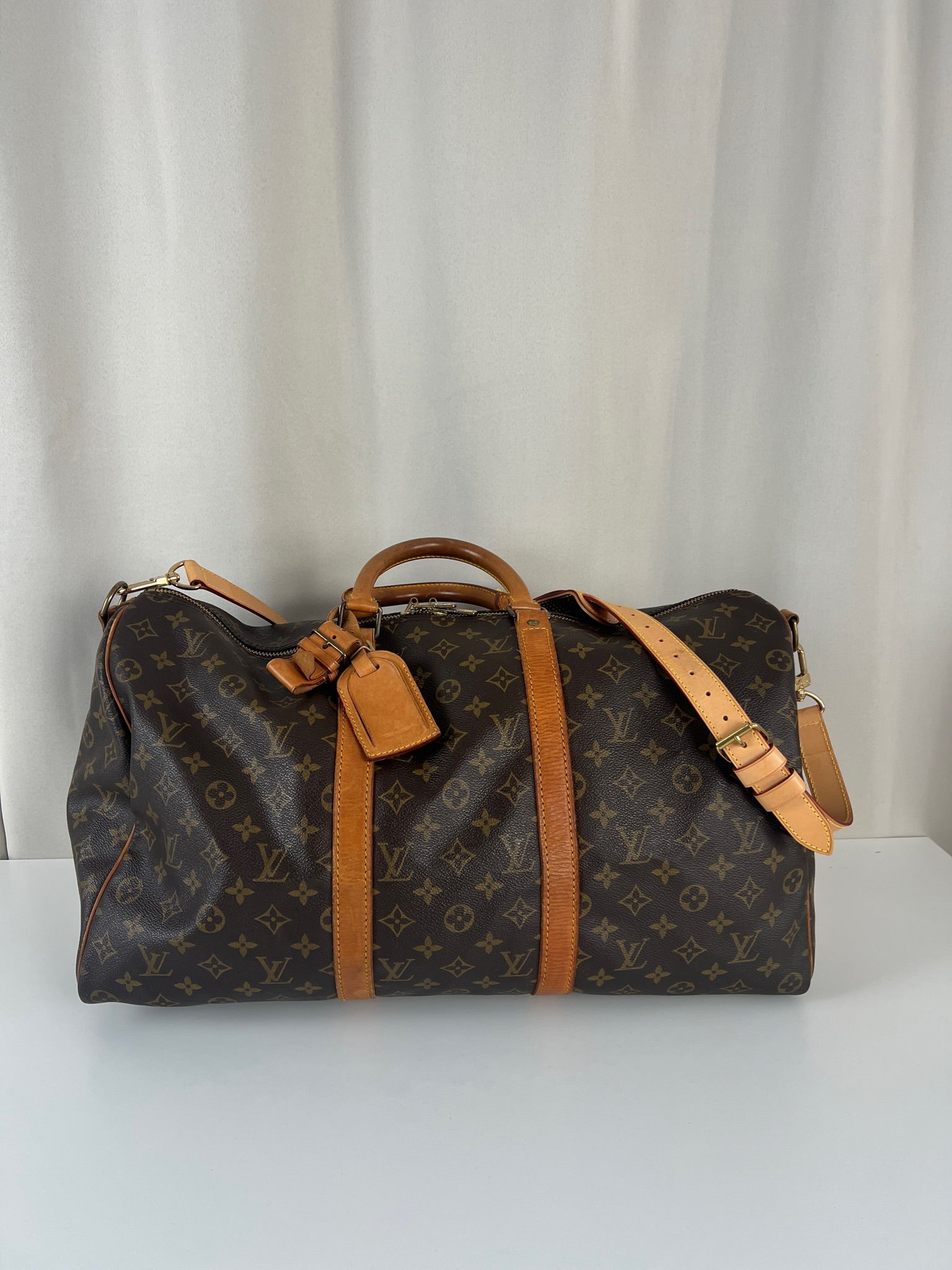 This Louis Vuitton Keepall 50 is in good / very good condition. The canvas is in very good condition. The leather is tanned and has some trace of wear/stains on the bottom mostly. The corners are a little rubbed. The handles are in good condition. The interior is in very good condition no stain. The strap is completely new.