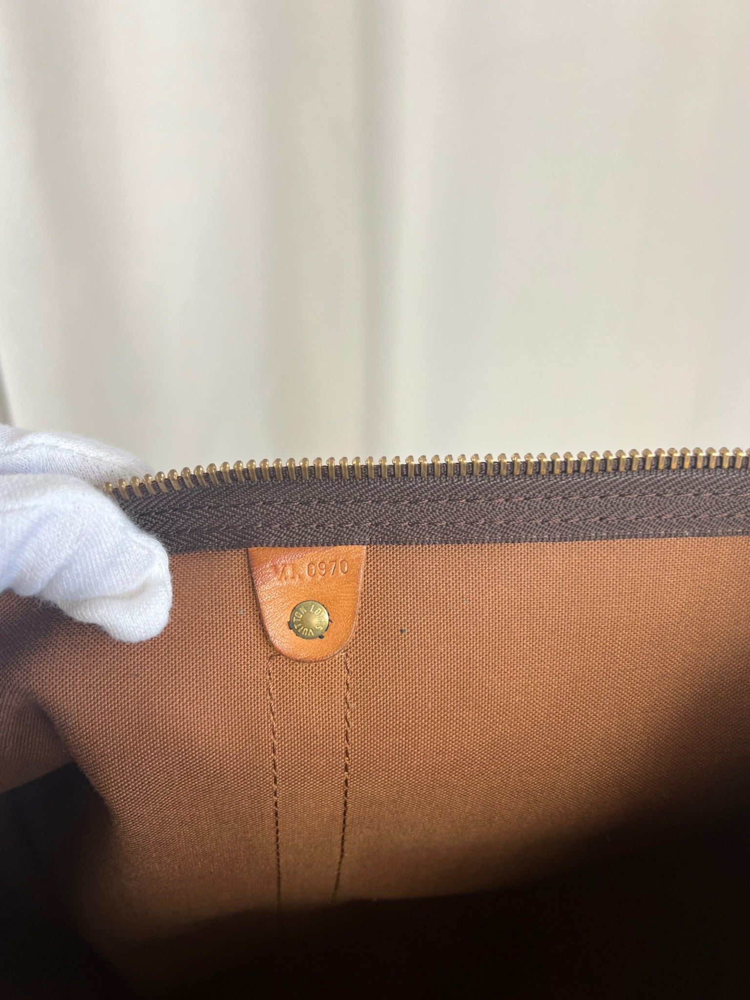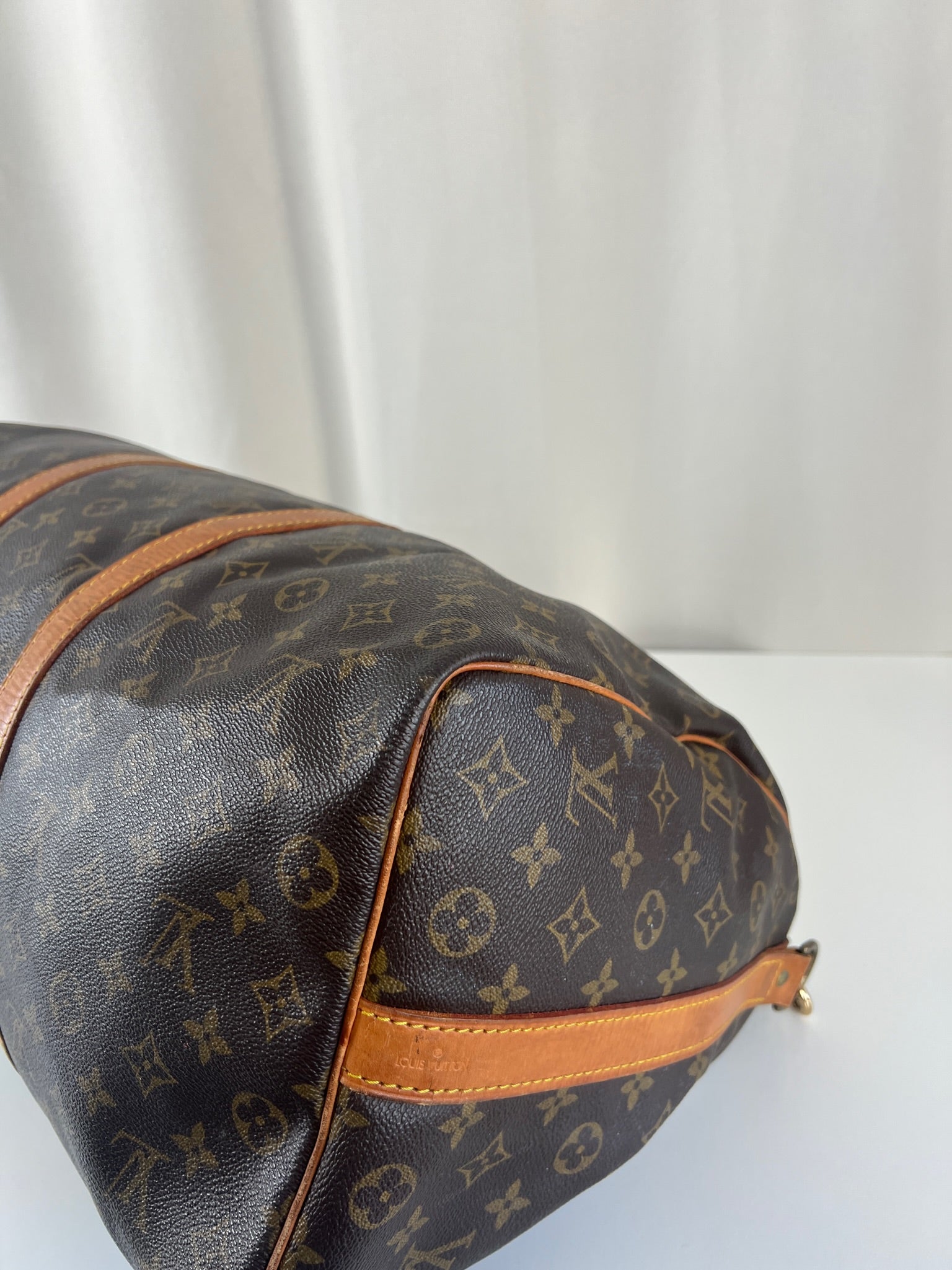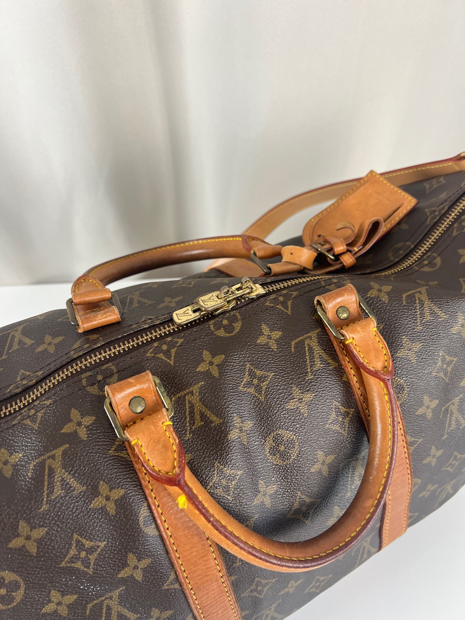This Louis Vuitton Keepall 50 is in good / very good condition. The canvas is in very good condition. The leather is tanned and has some trace of wear/stains on the bottom mostly. The corners are a little rubbed. The handles are in good condition. The interior is in very good condition no stain. The strap is completely new.