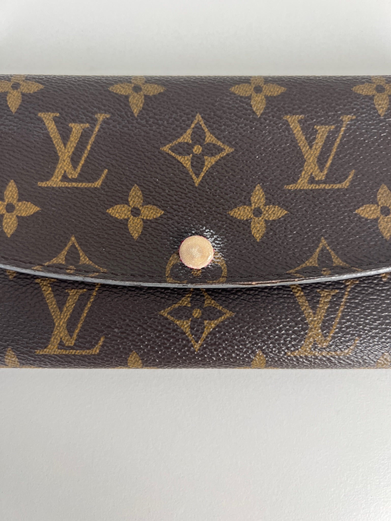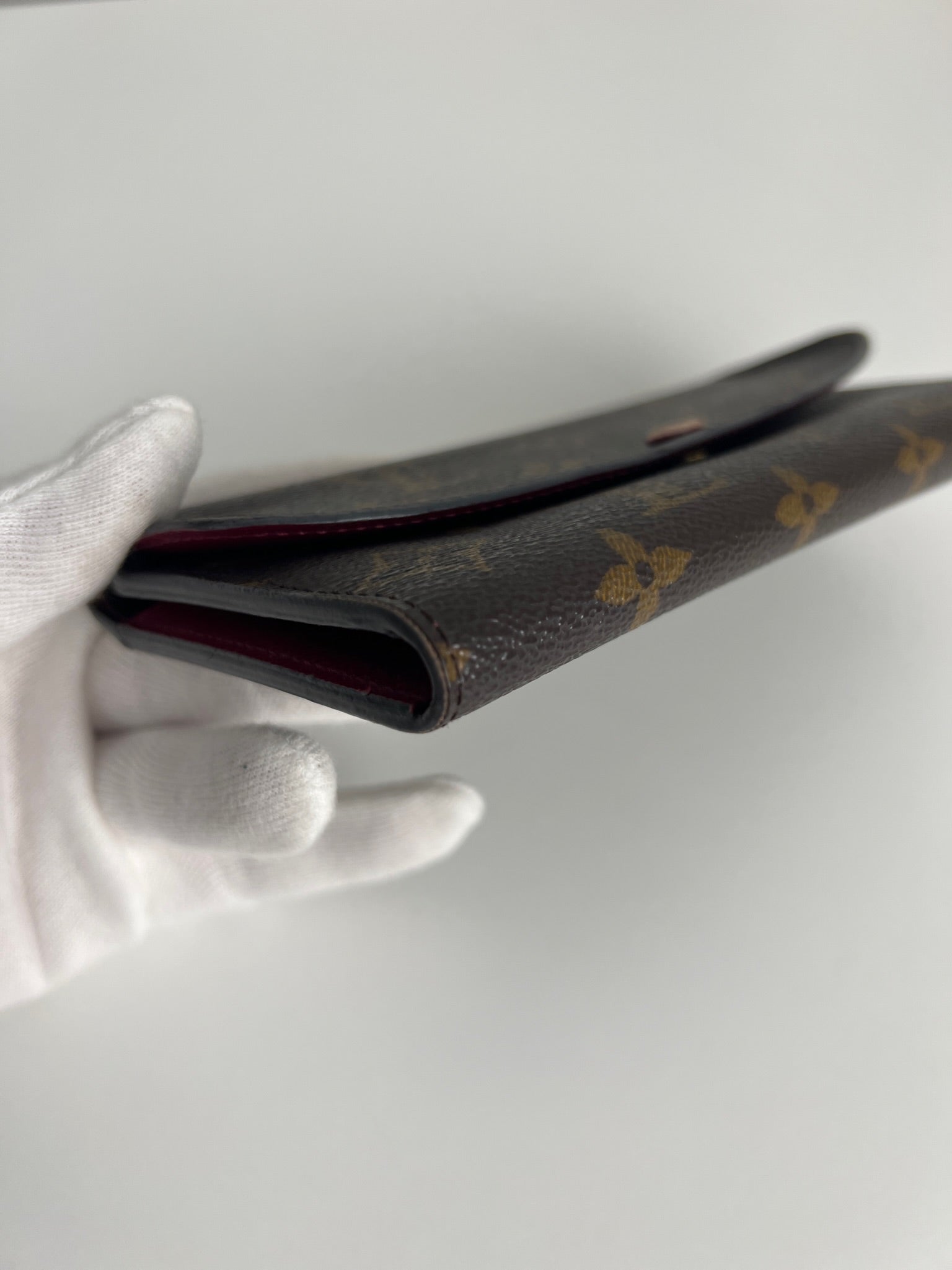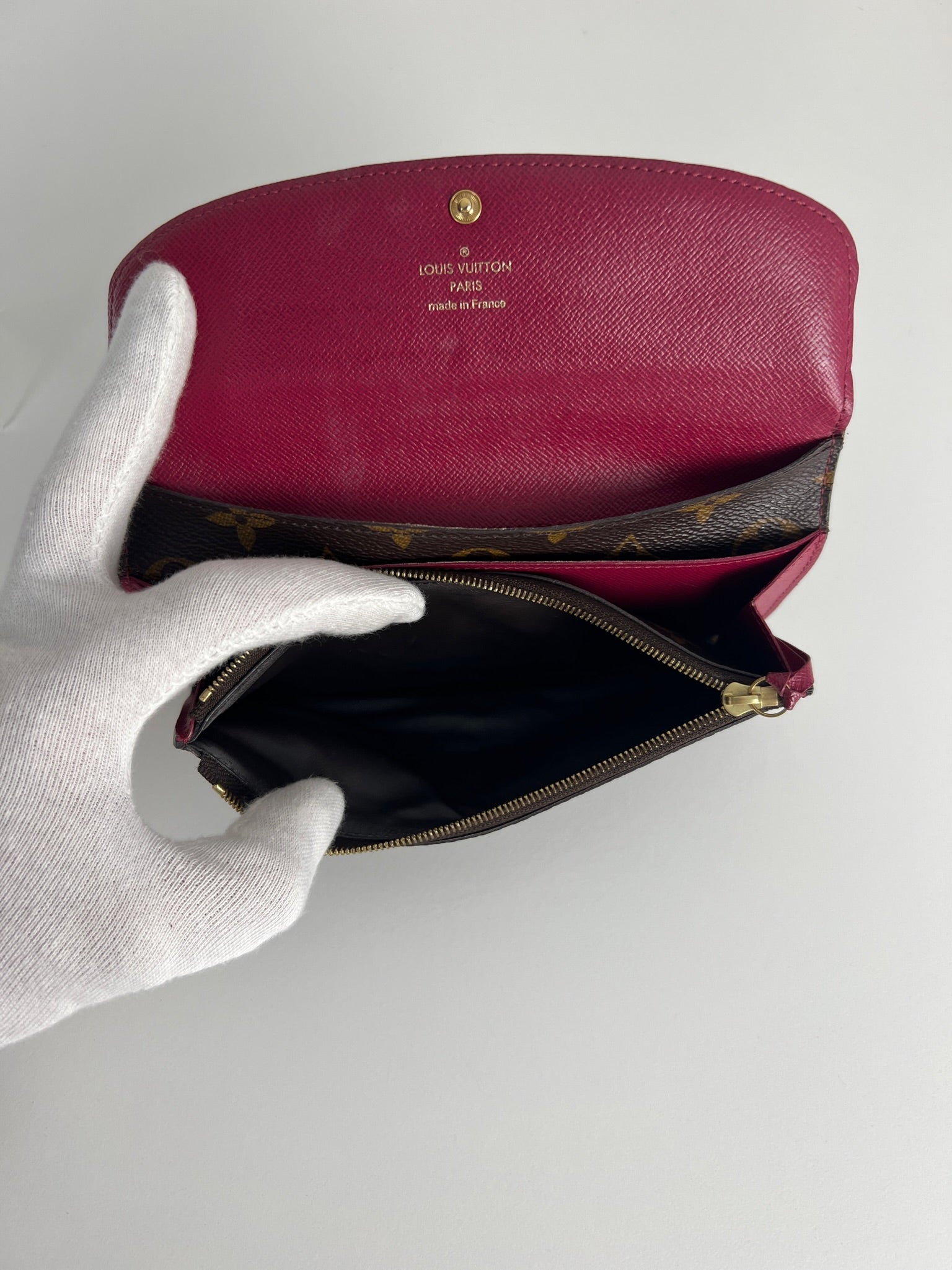 This Louis Vuitton Emilie Wallet is in good condition. The monogram canvas is in very good condition. We can see some signs of wear, trace on it due to use on the sides. The pression button is missing the leather part on top of it. It can be replaced. The interior is in very good condition.