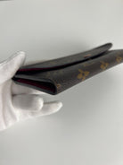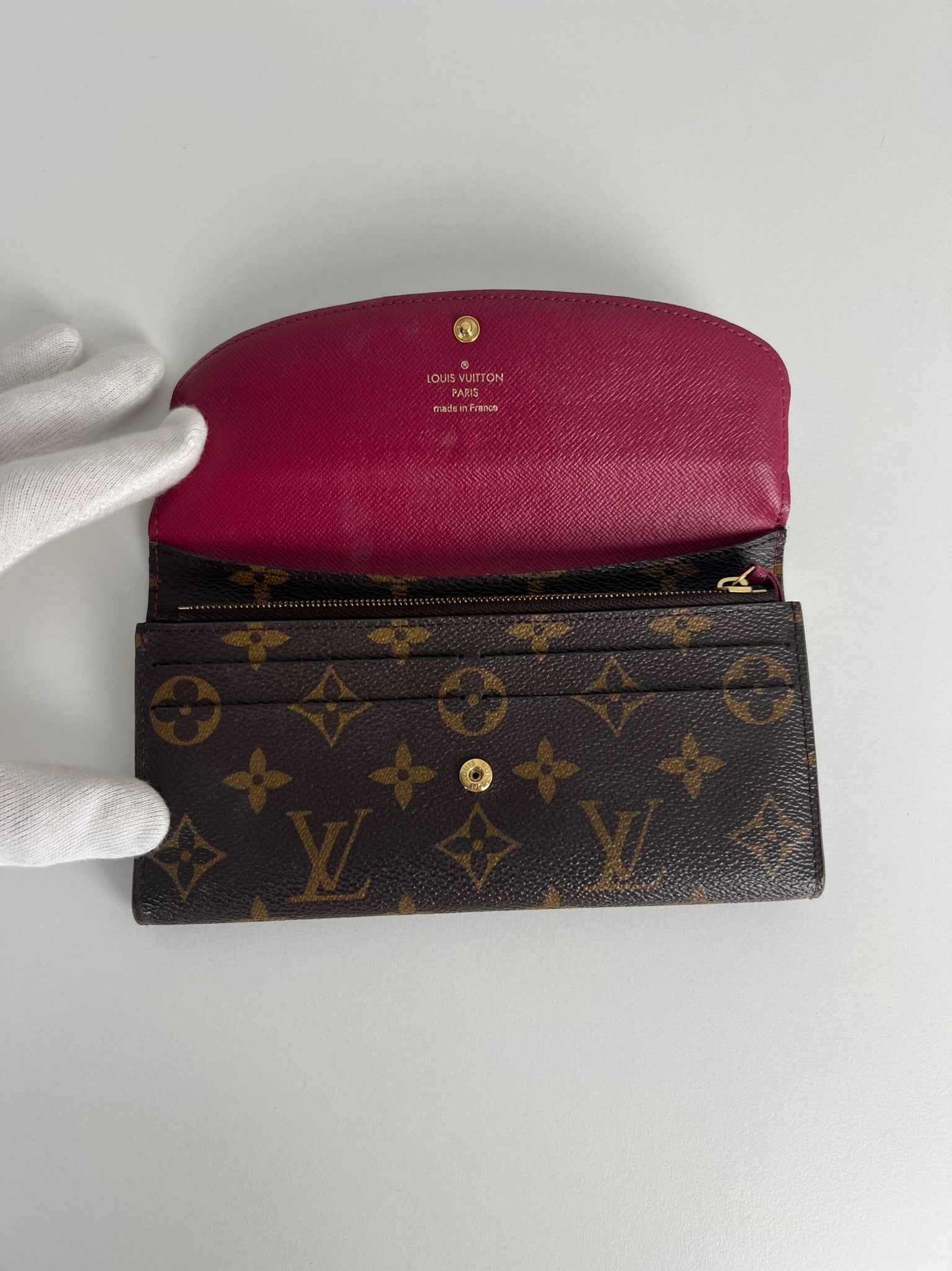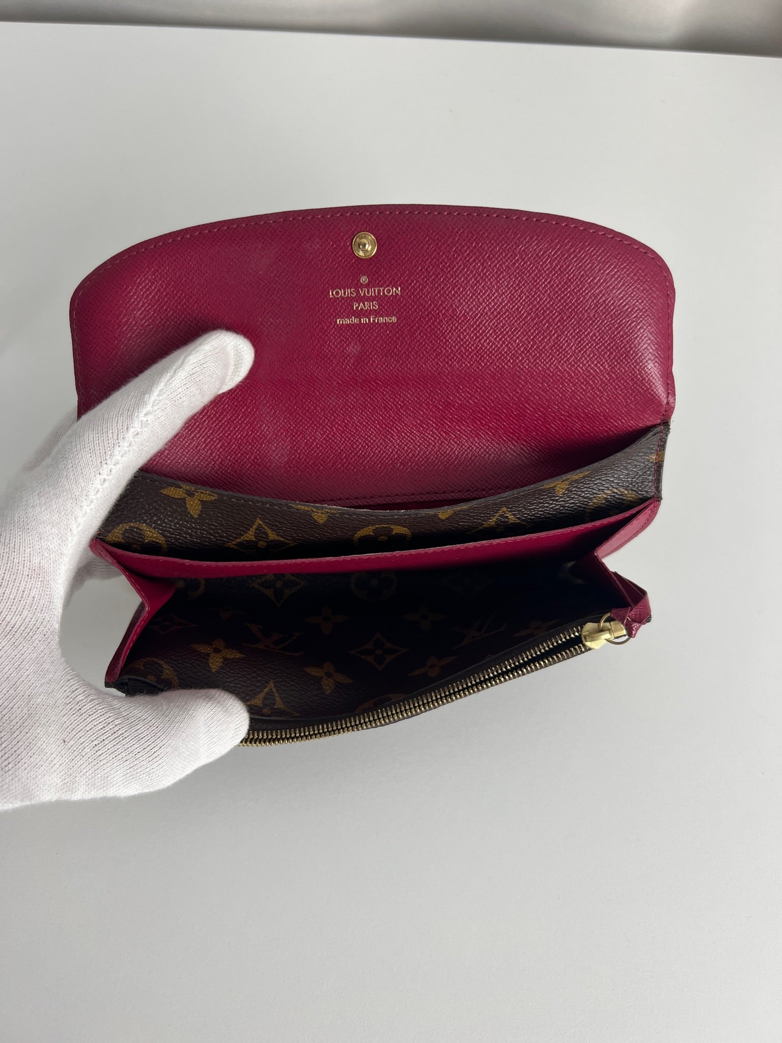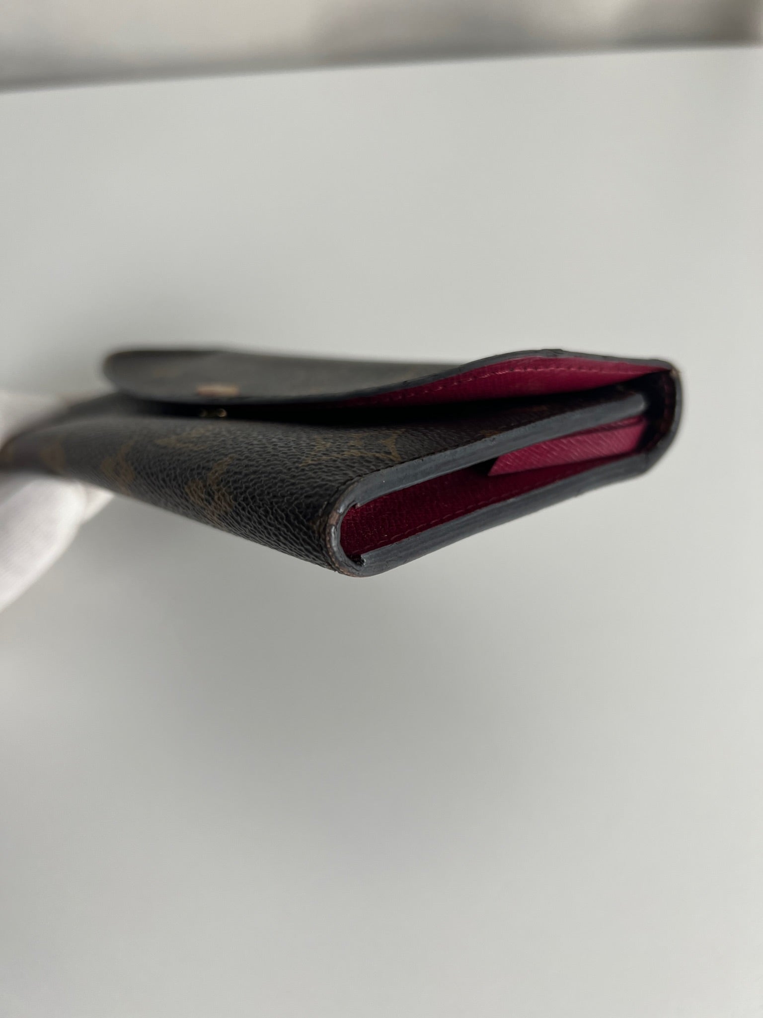 This Louis Vuitton Emilie Wallet is in good condition. The monogram canvas is in very good condition. We can see some signs of wear, trace on it due to use on the sides. The pression button is missing the leather part on top of it. It can be replaced. The interior is in very good condition.