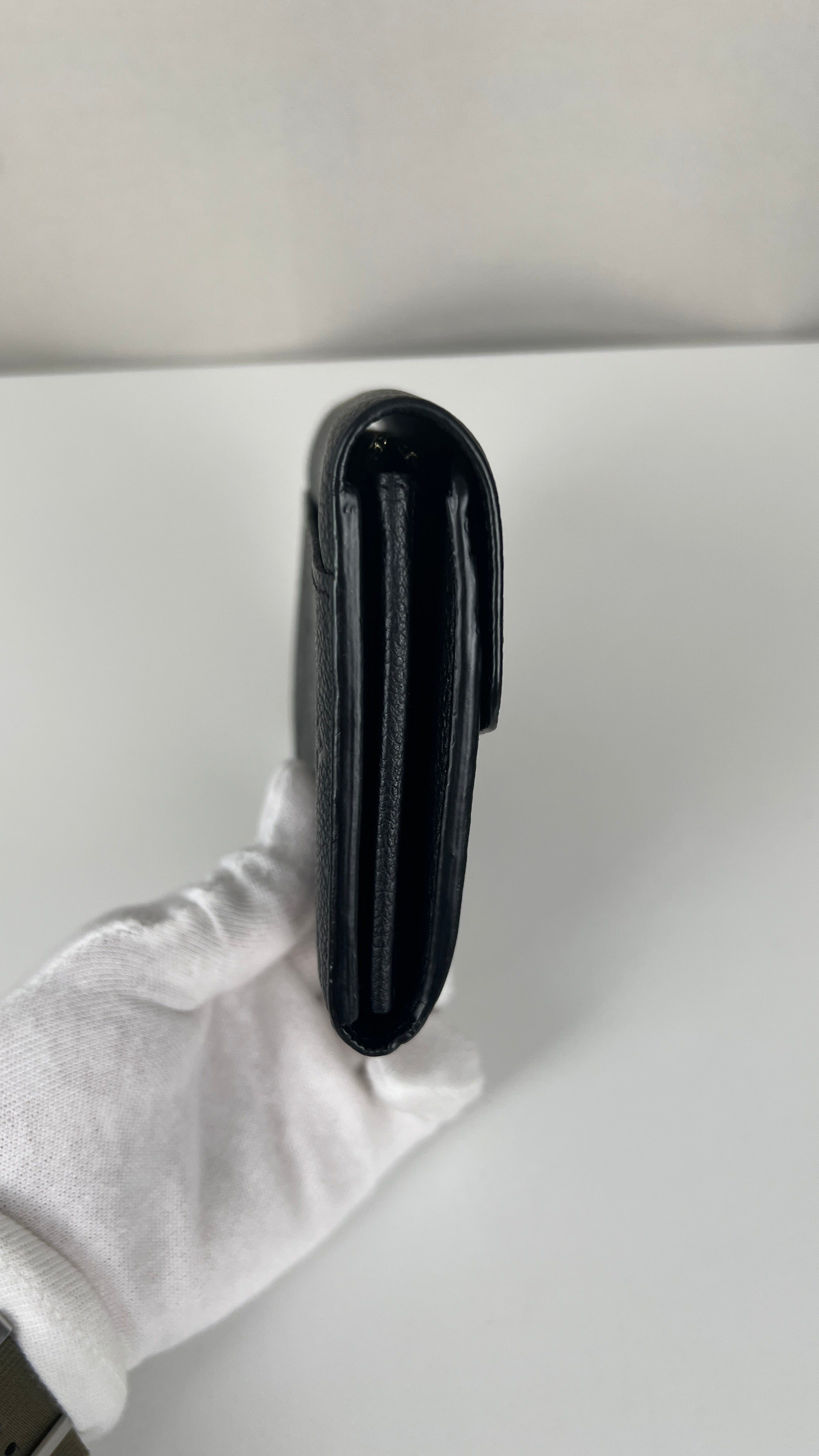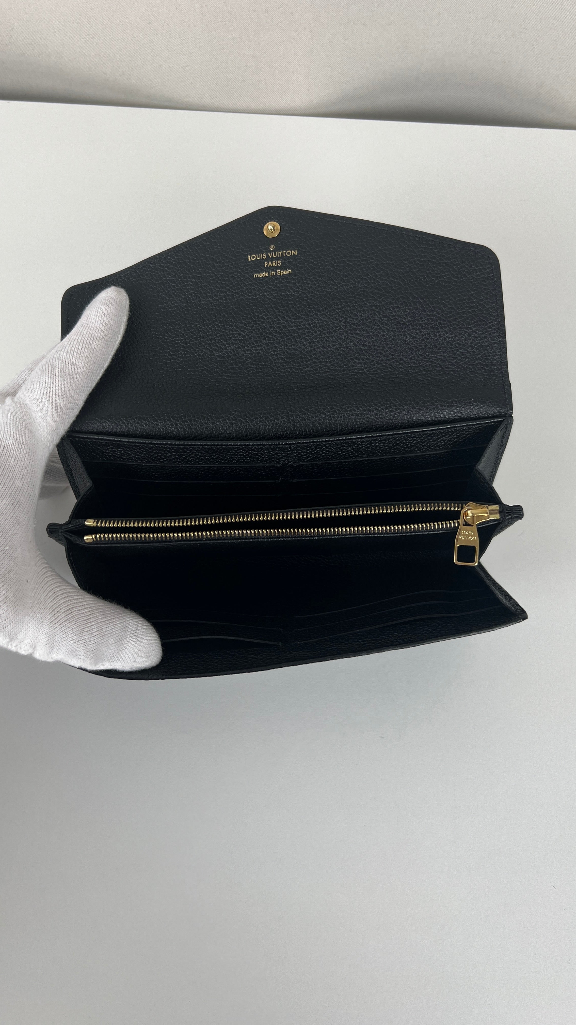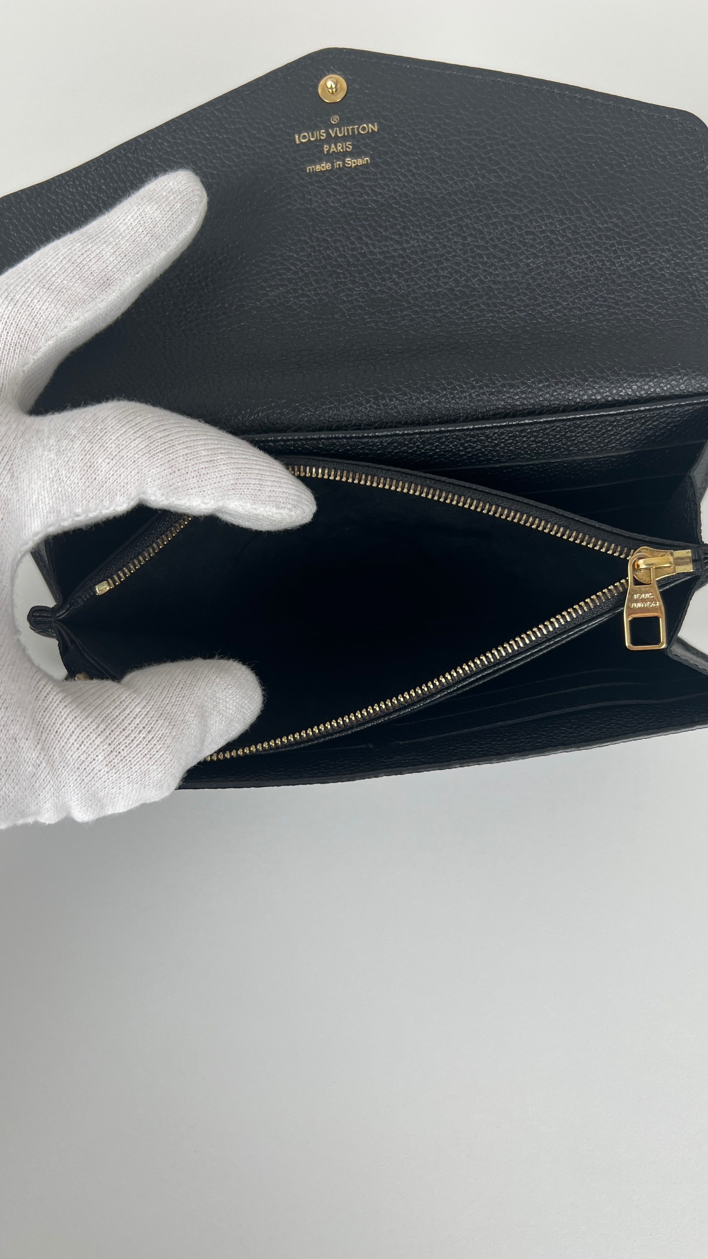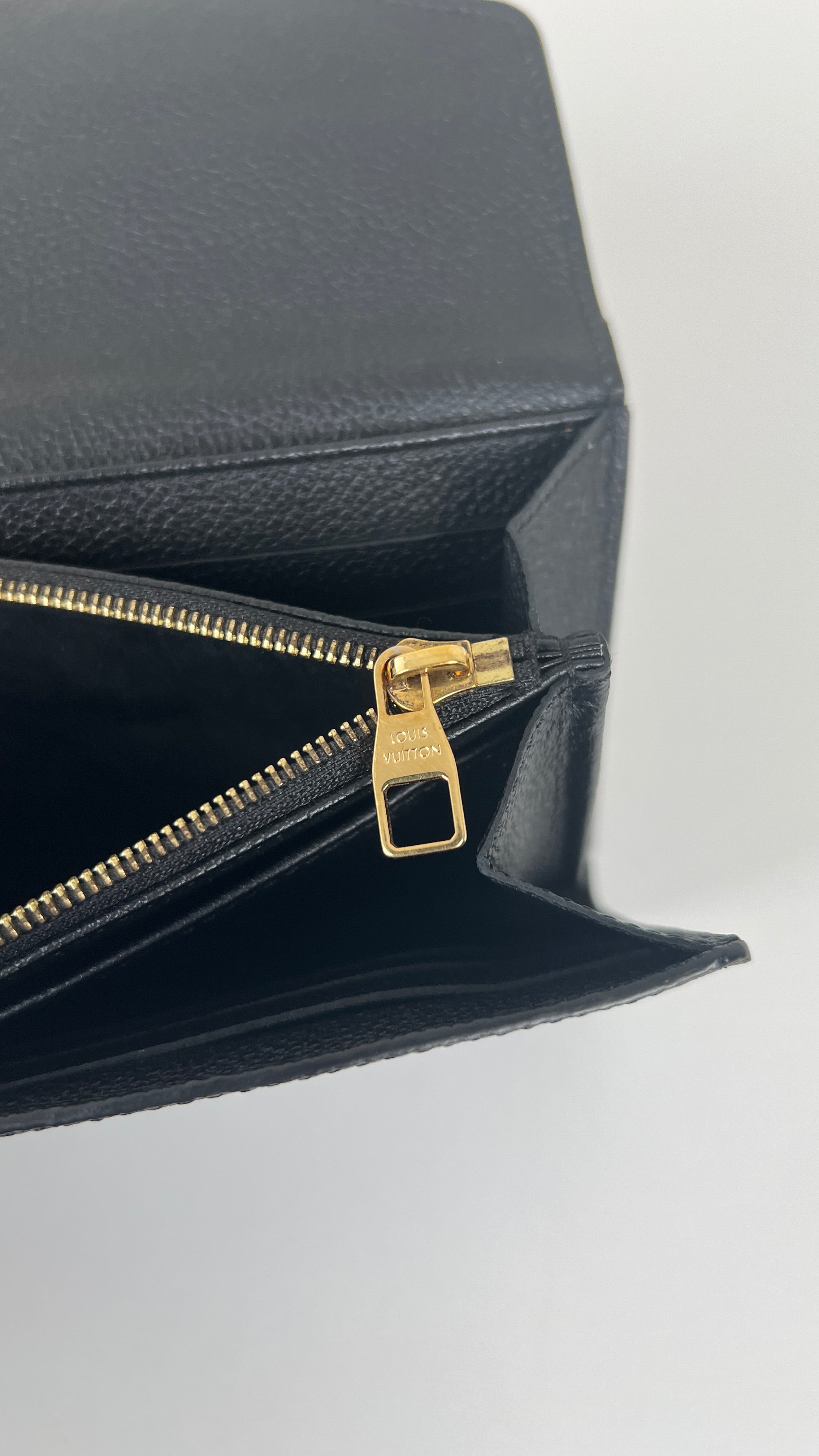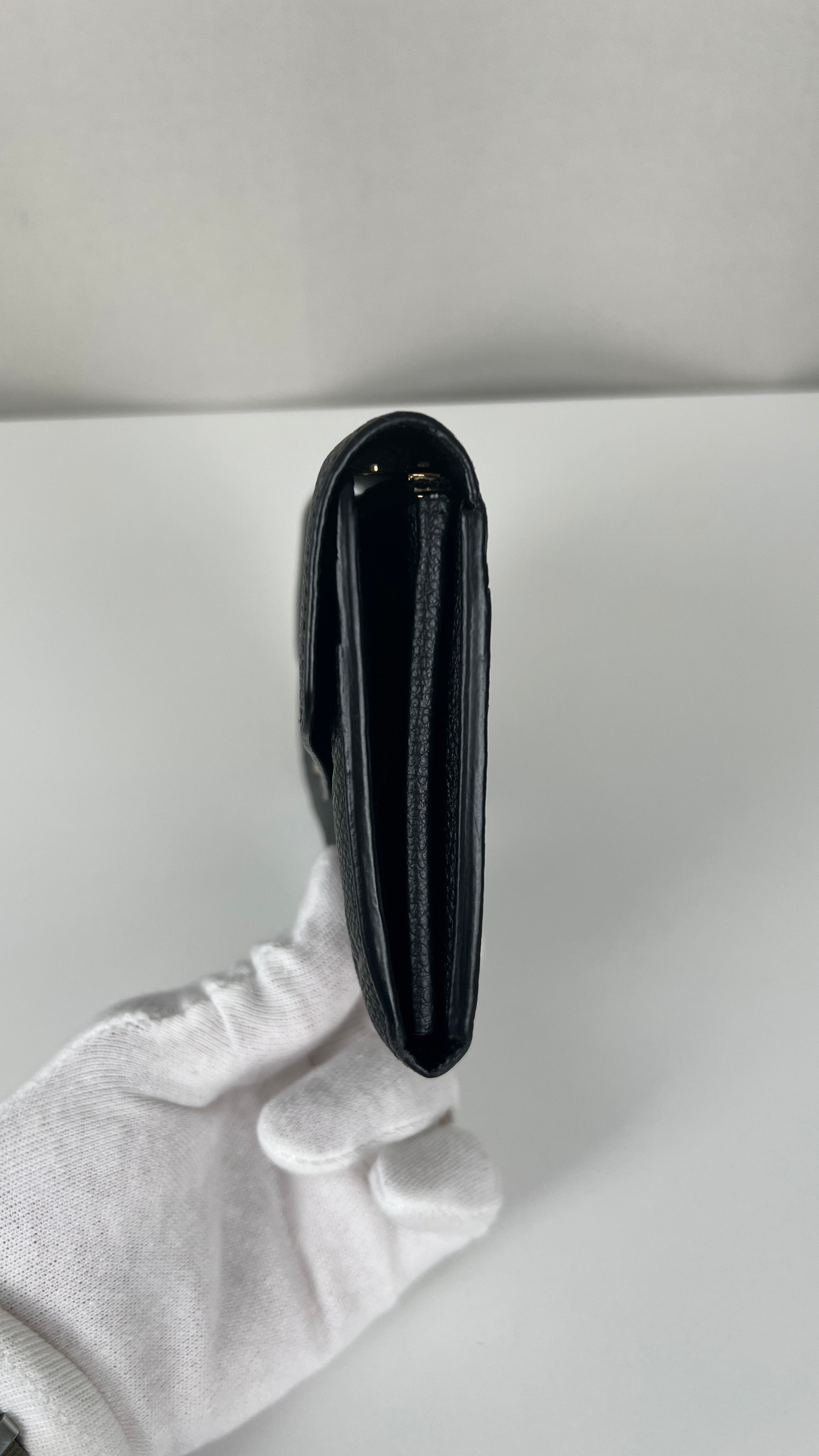 This Louis Vuitton Vuitton Sarah Empreinte wallet is in very good condition. The leather is in very good condition, few little trace of wear. The corners are in very good condition. The inside is in very good condition. The leather parts around the pin is a little bit rubbed. It comes with box, dustbag, invoice.
