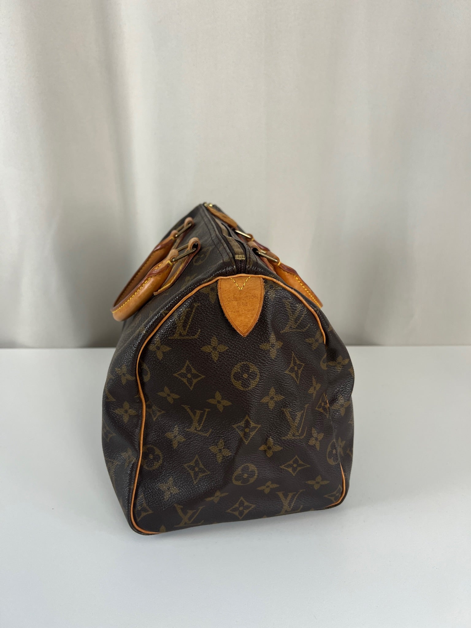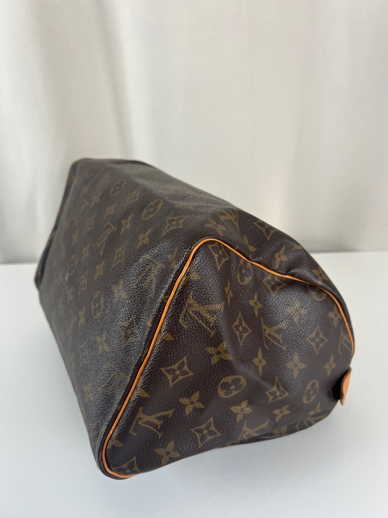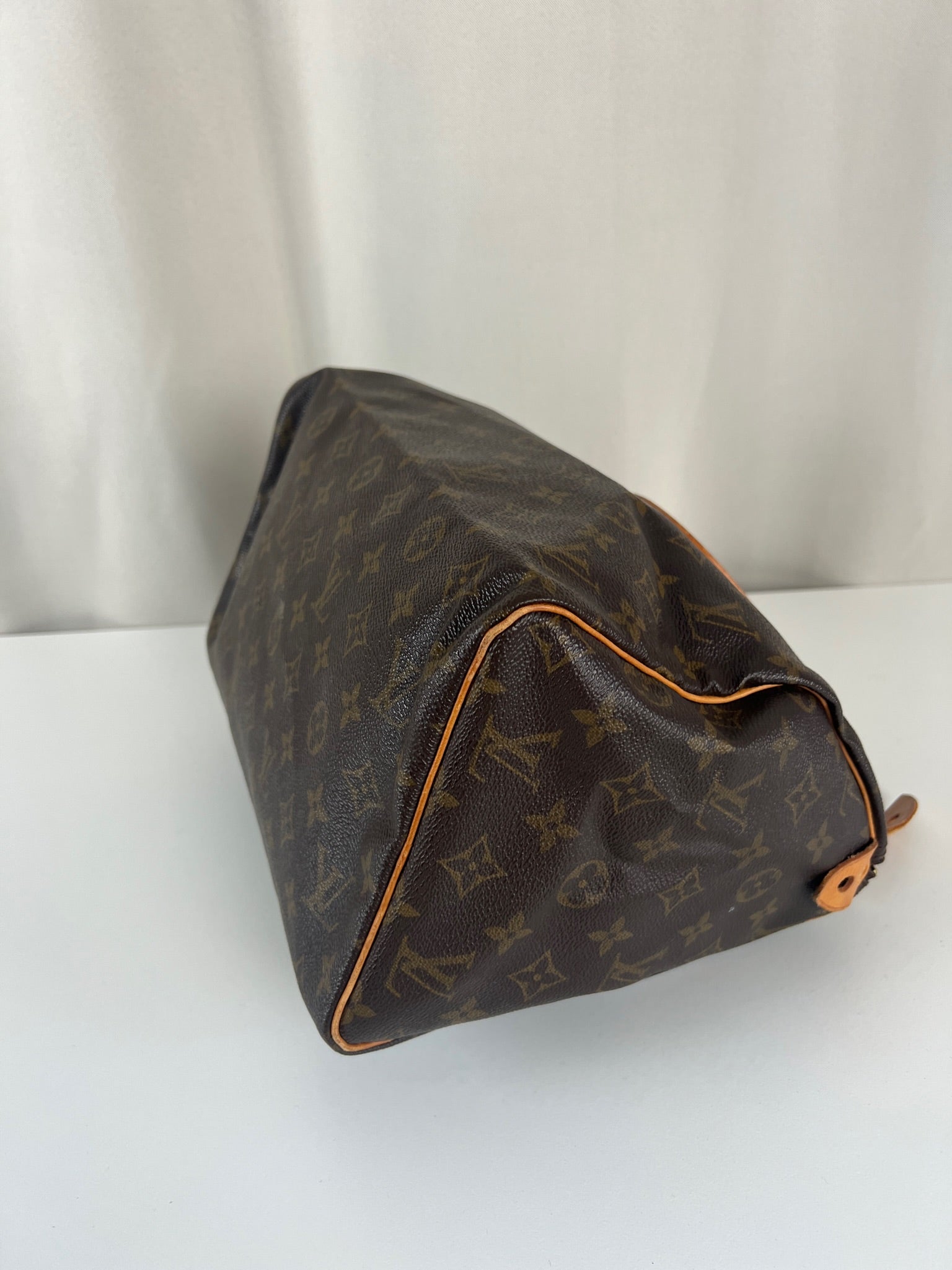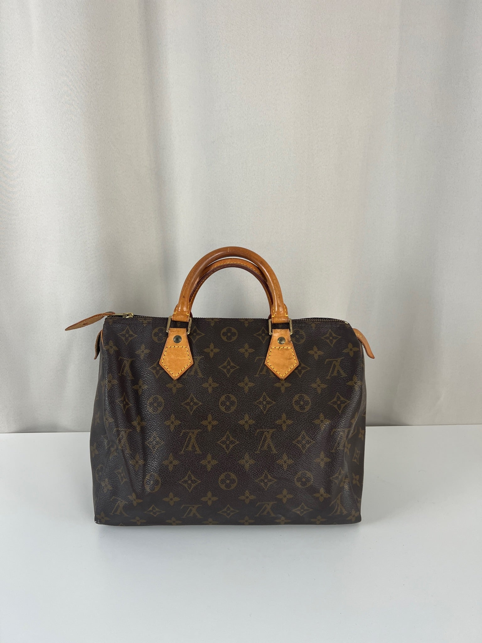 This Louis Vuitton Speedy 30 Monogram is in very good condition. The corners are little rubbed. The canvas is in very good condition.  The handles are tanned and in good condition. The leather parts on the zipper is in good condition. The interior is in good condition.
