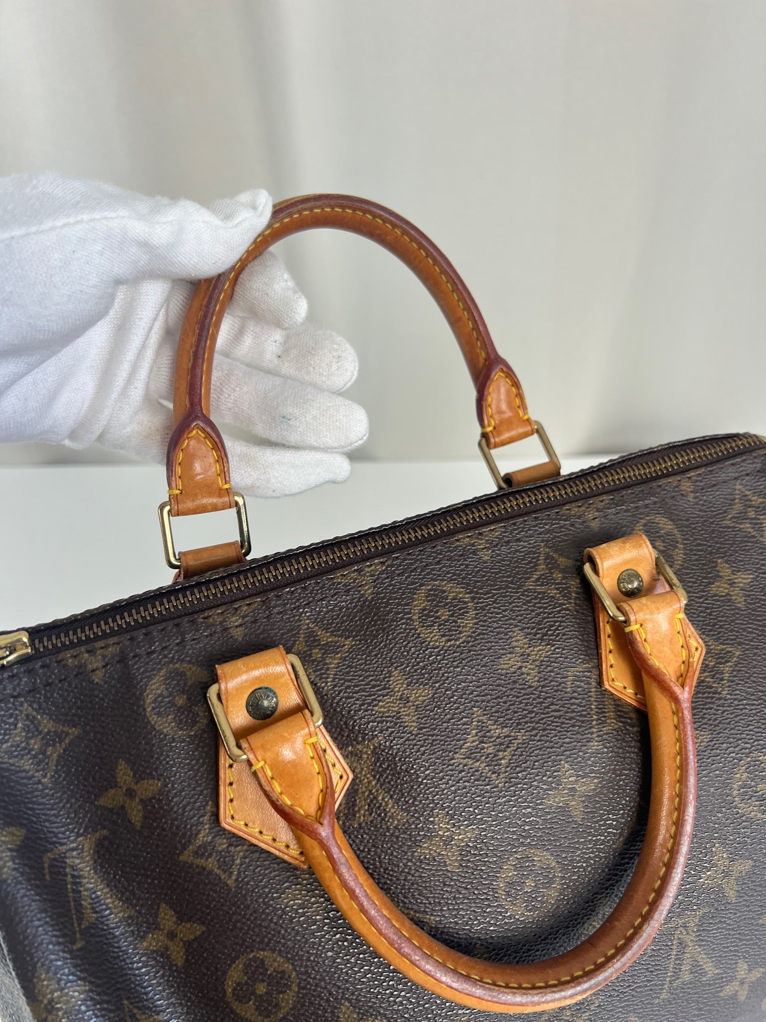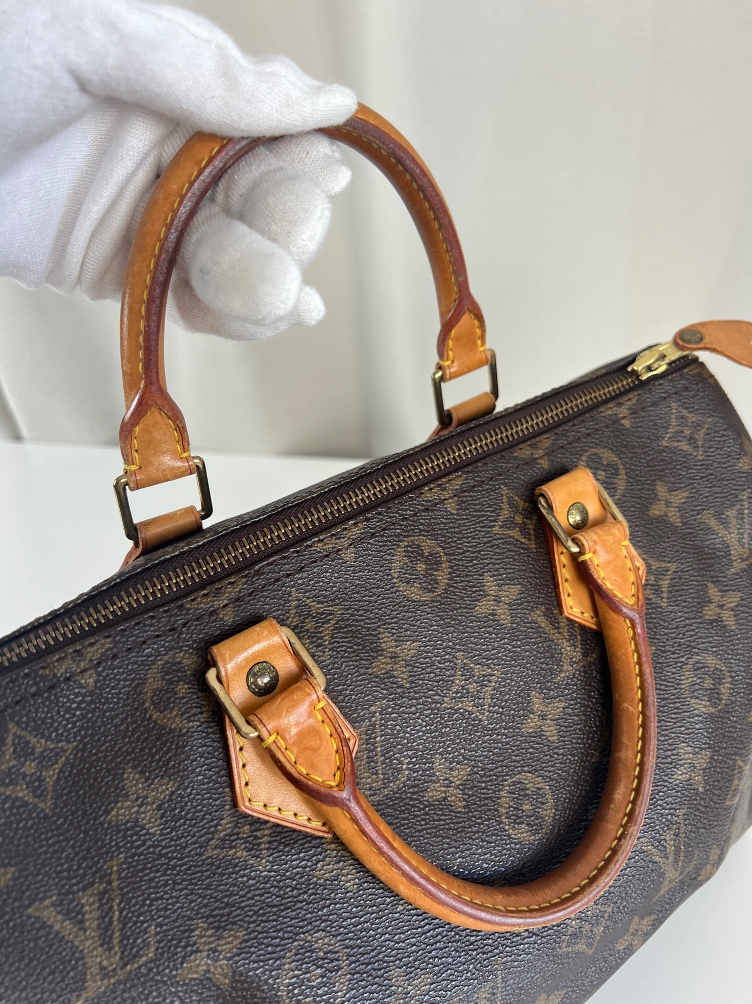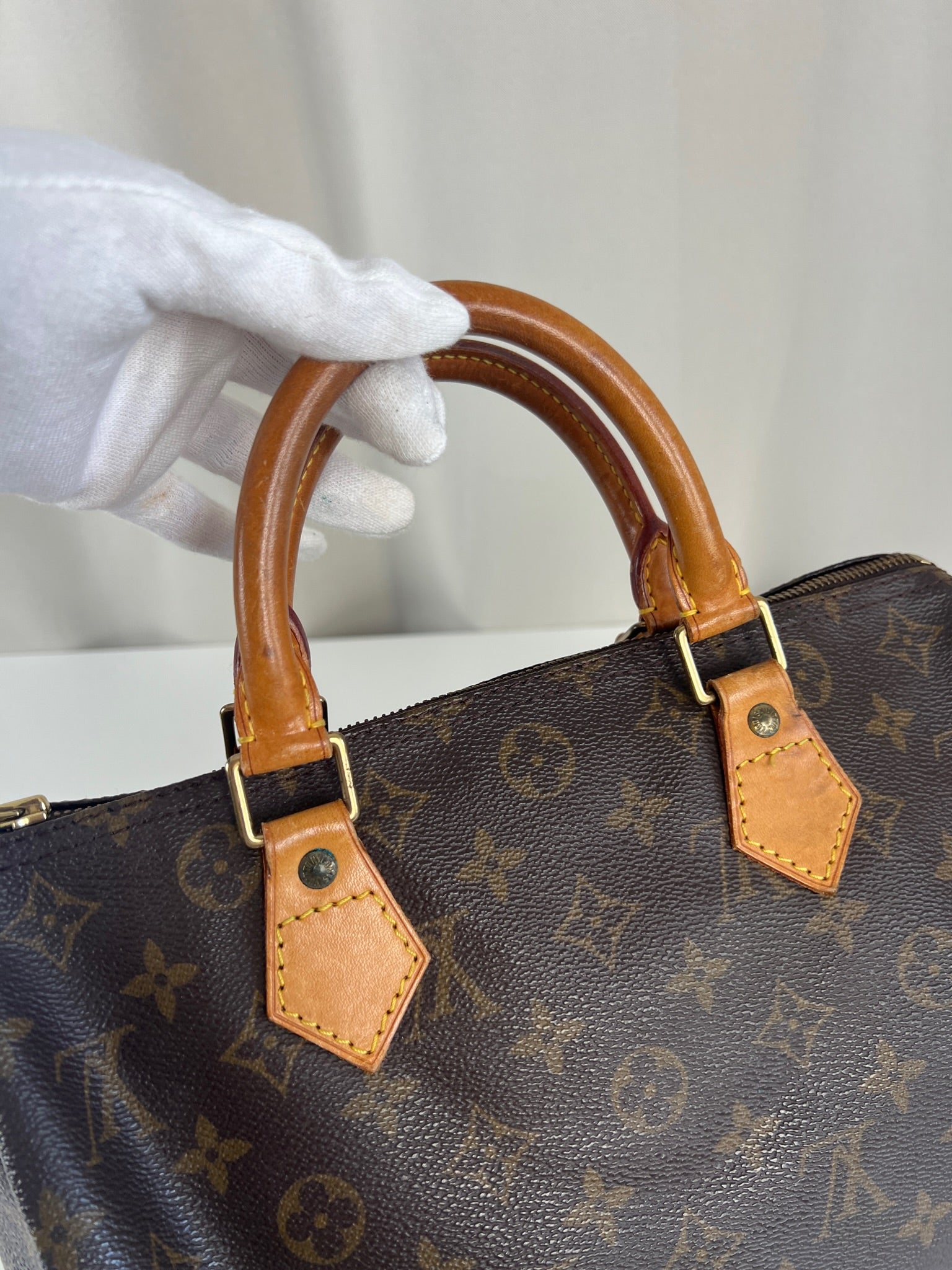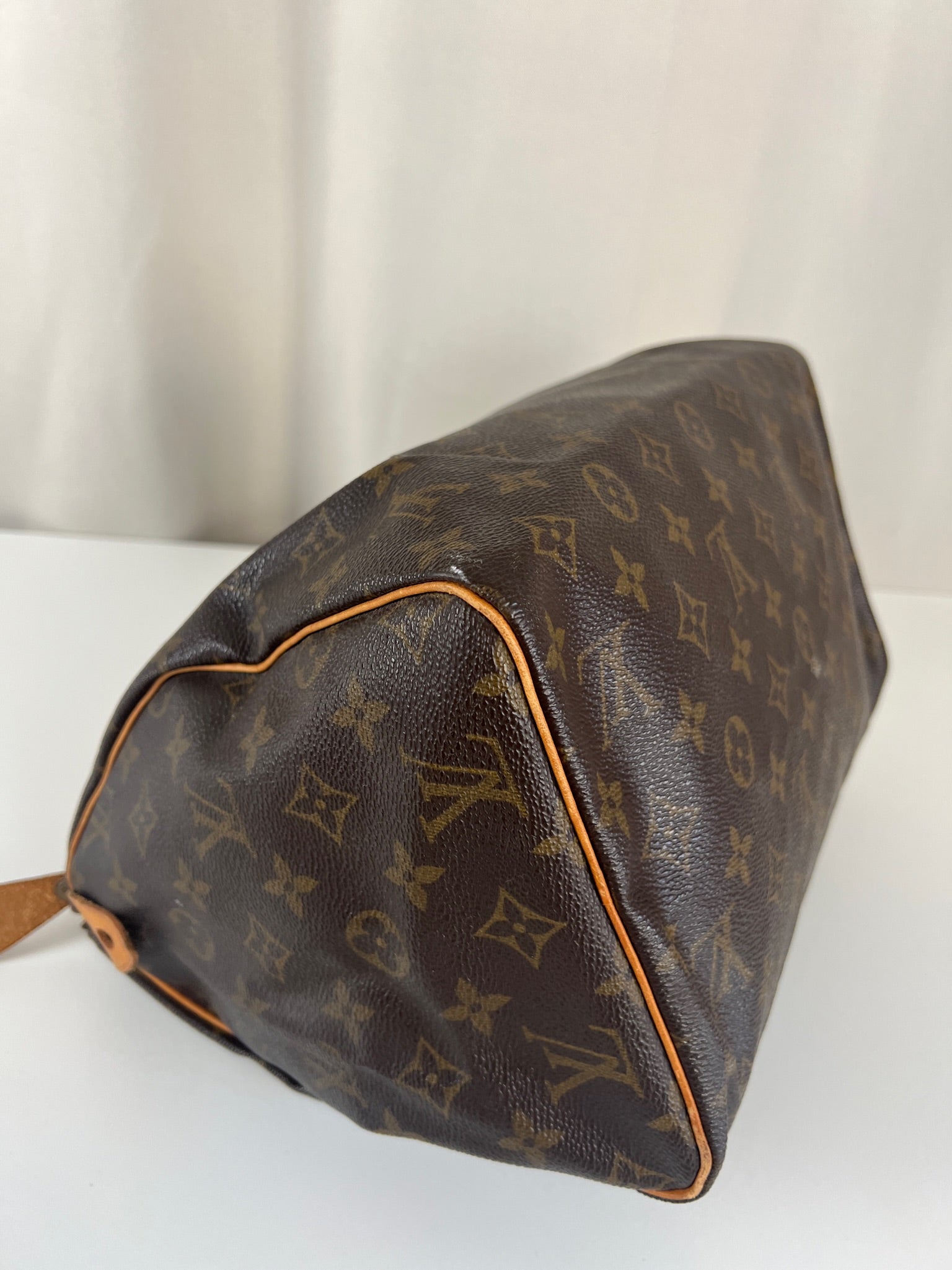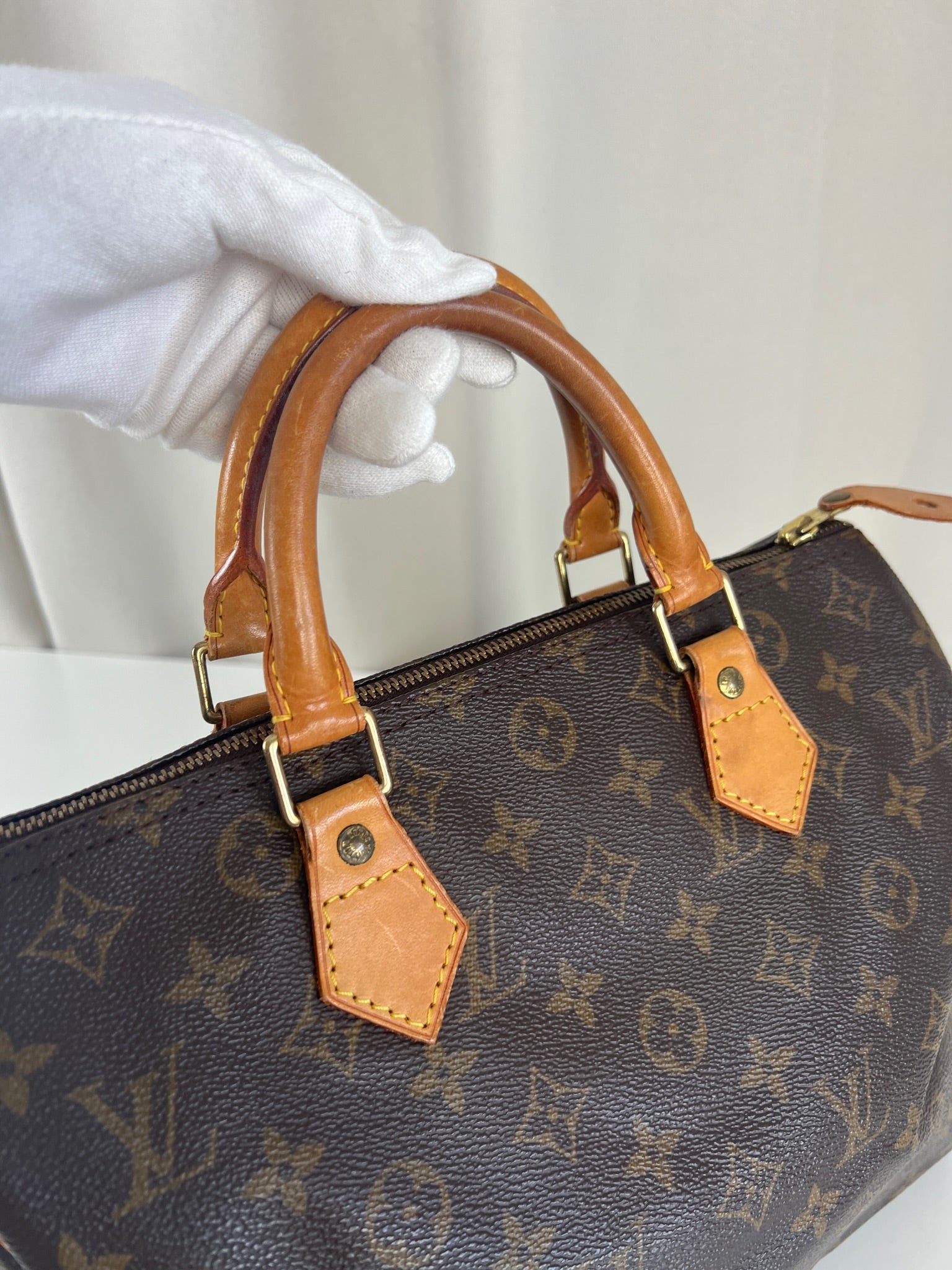This Louis Vuitton Speedy 30 Monogram is in very good condition. The corners are little rubbed. The canvas is in very good condition.  The handles are tanned and in good condition. The leather parts on the zipper is in good condition. The interior is in good condition.