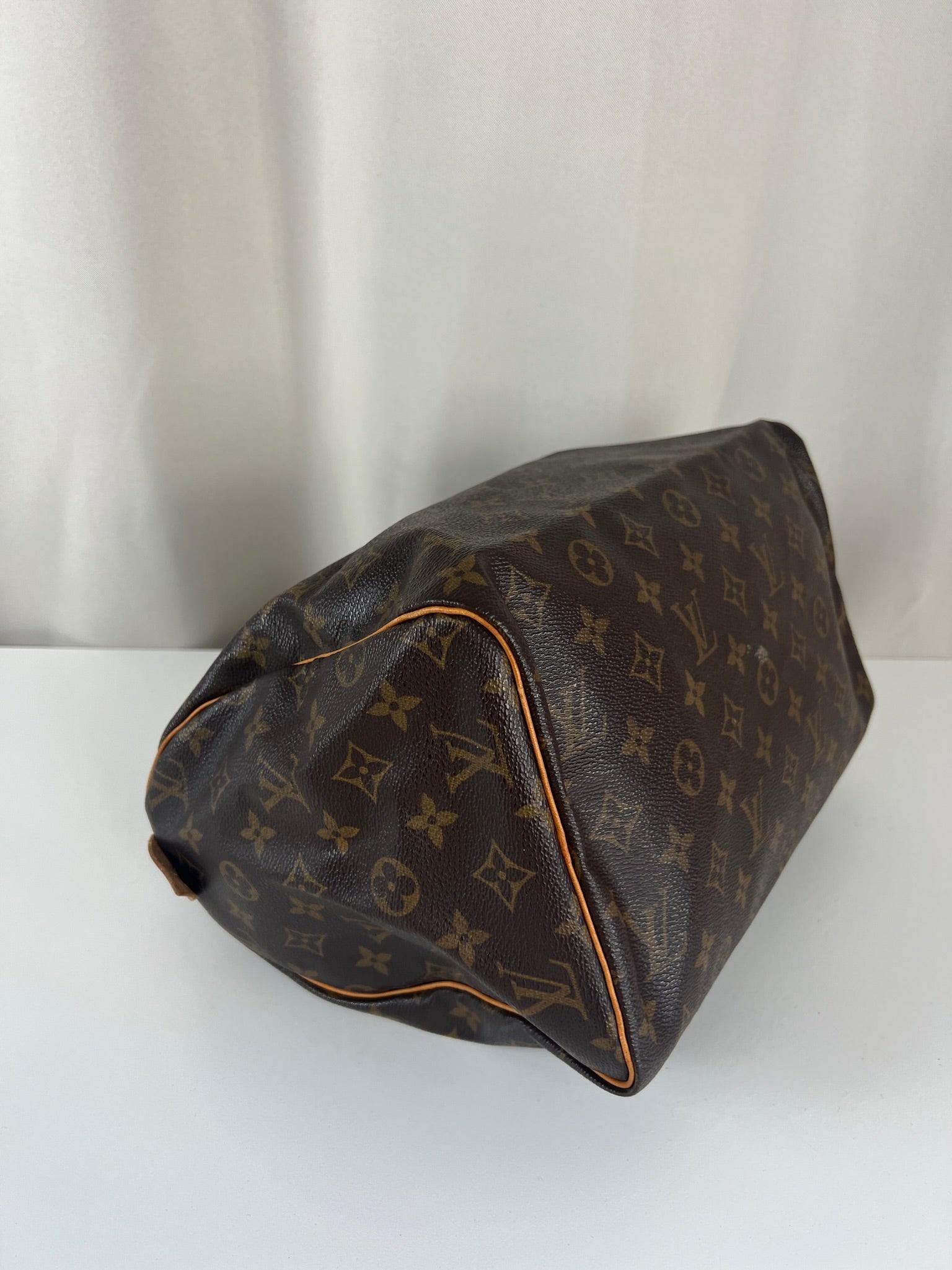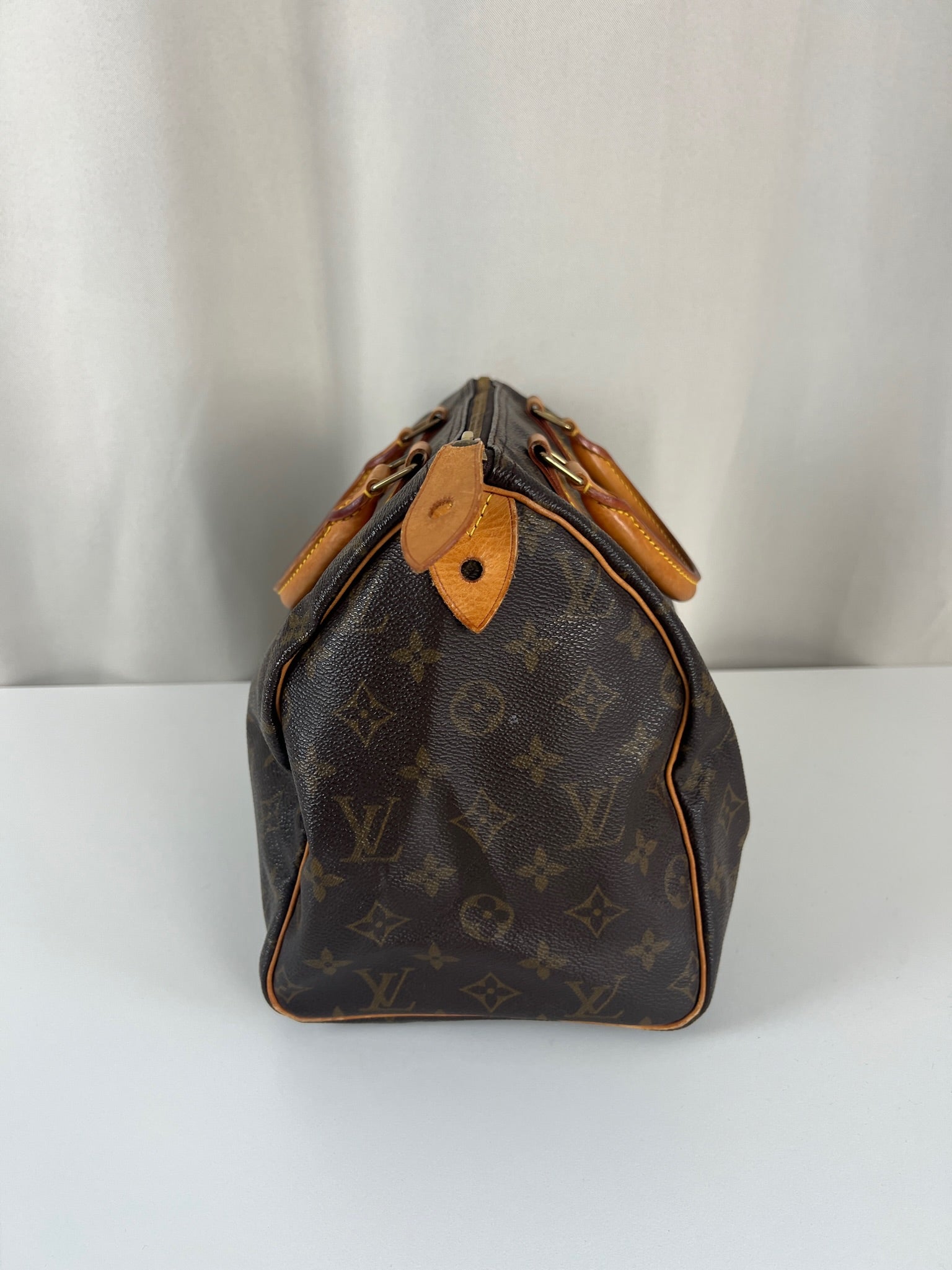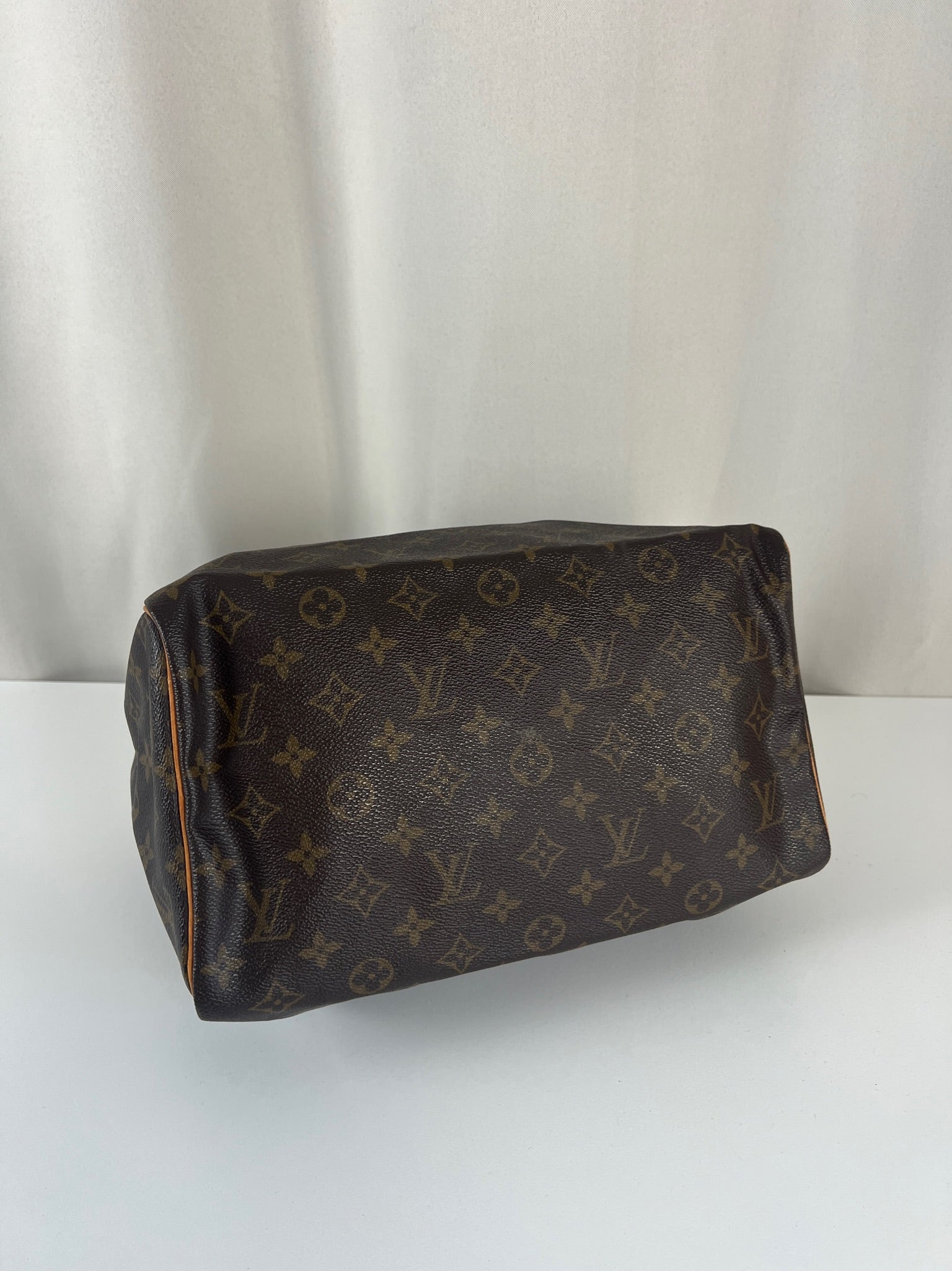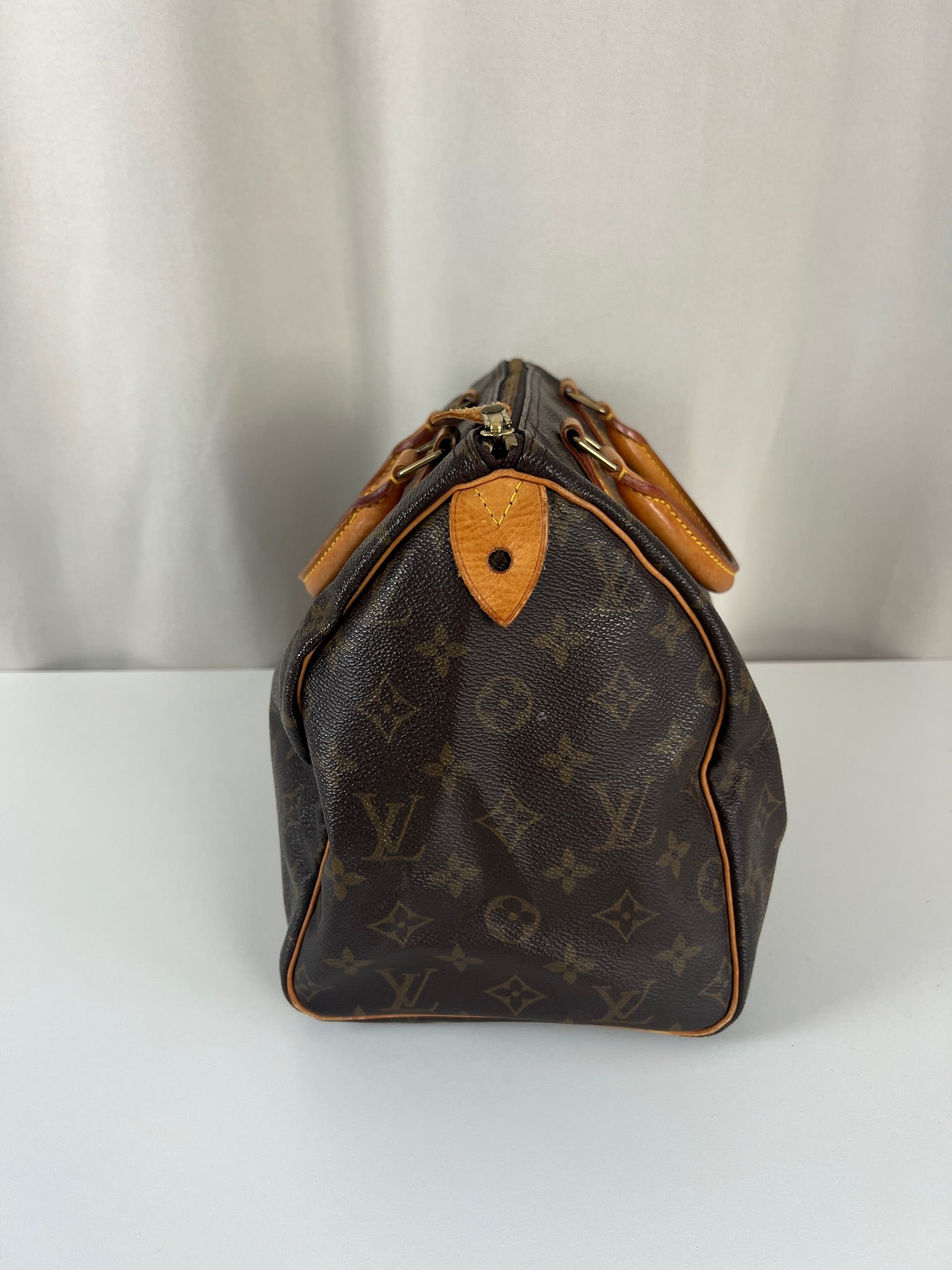 This Louis Vuitton Speedy 30 Monogram is in very good condition. The corners are little rubbed. The canvas is in very good condition.  The handles are tanned and in good condition. The leather parts on the zipper is in good condition. The interior is in good condition.