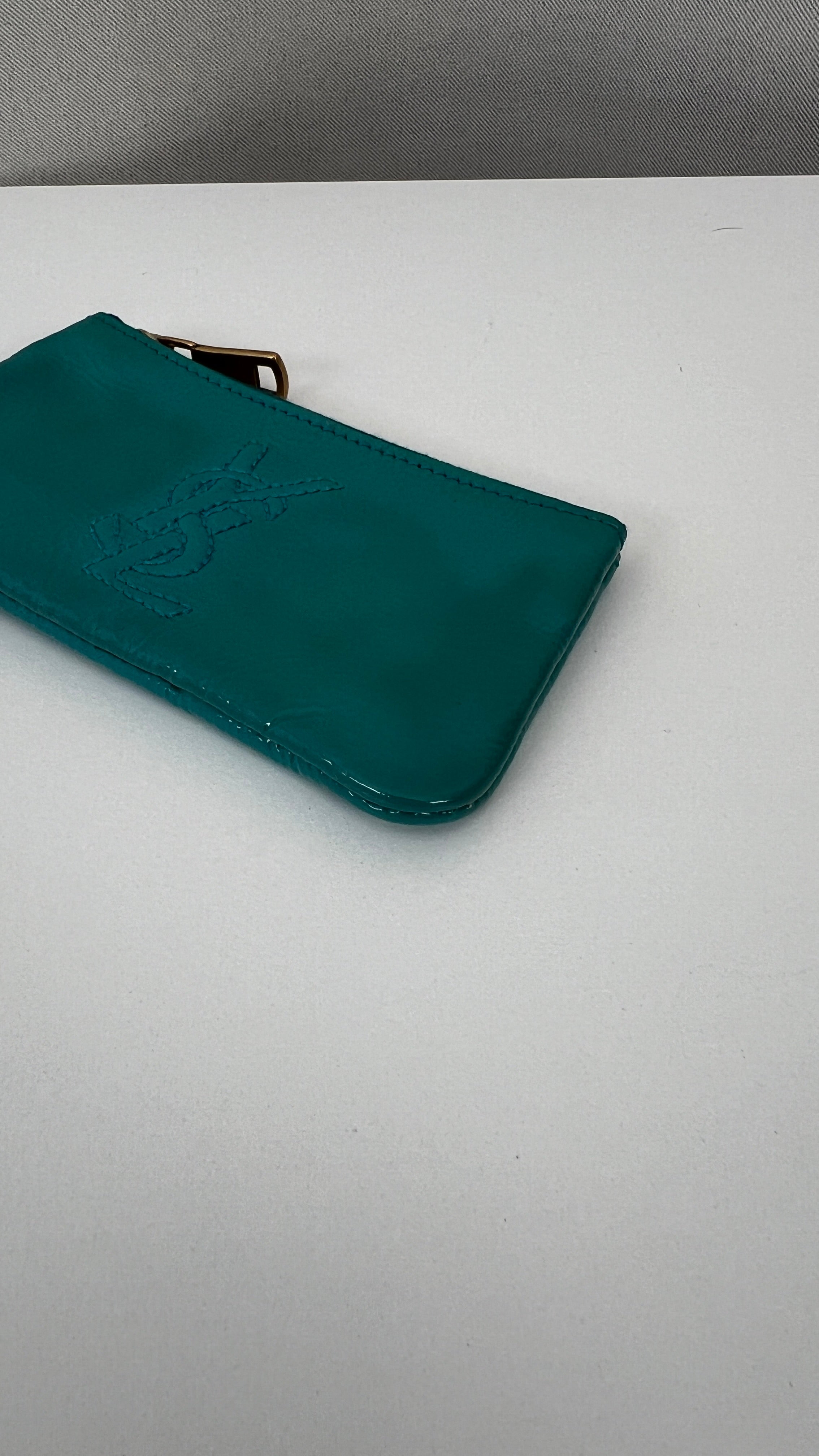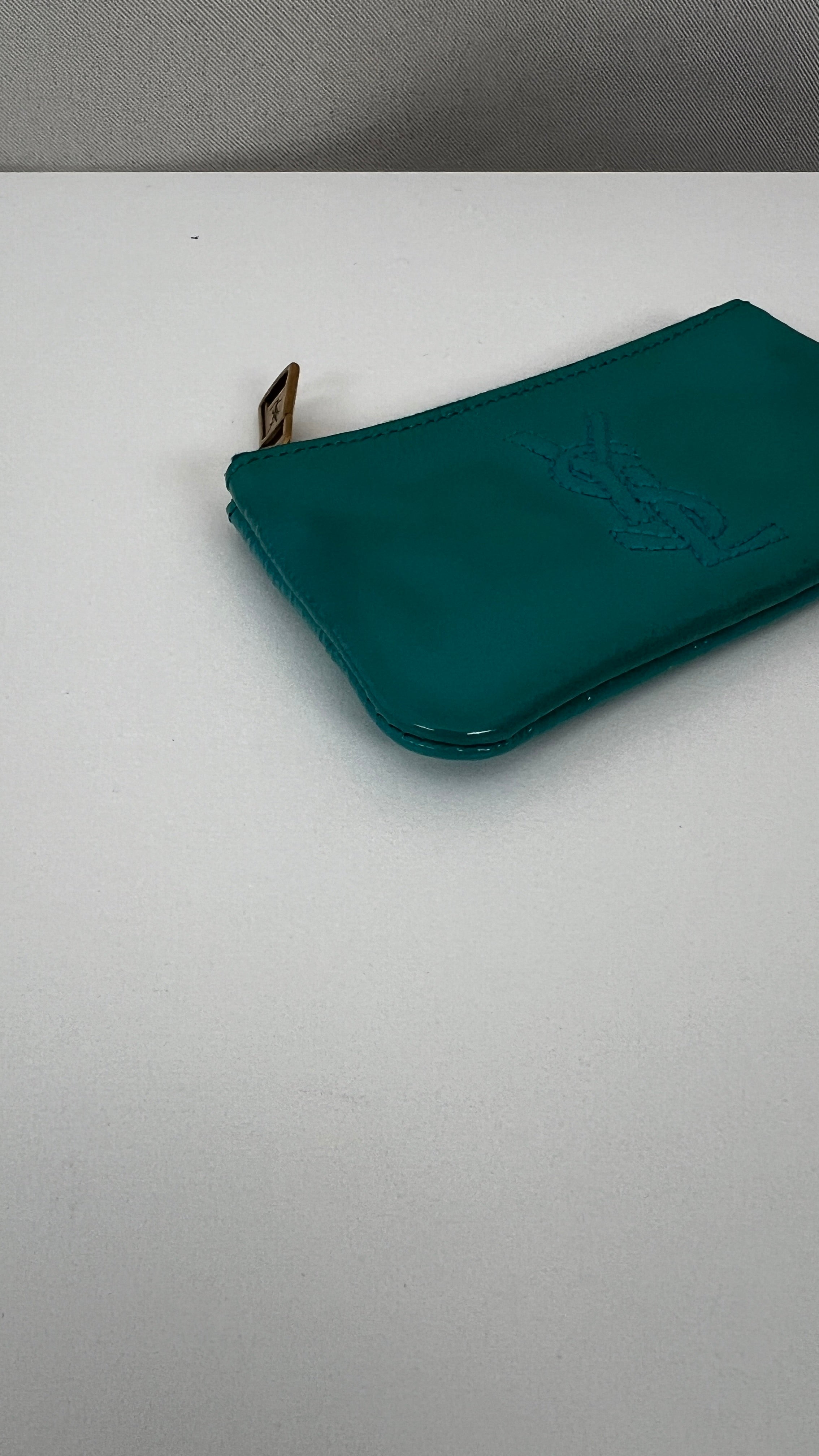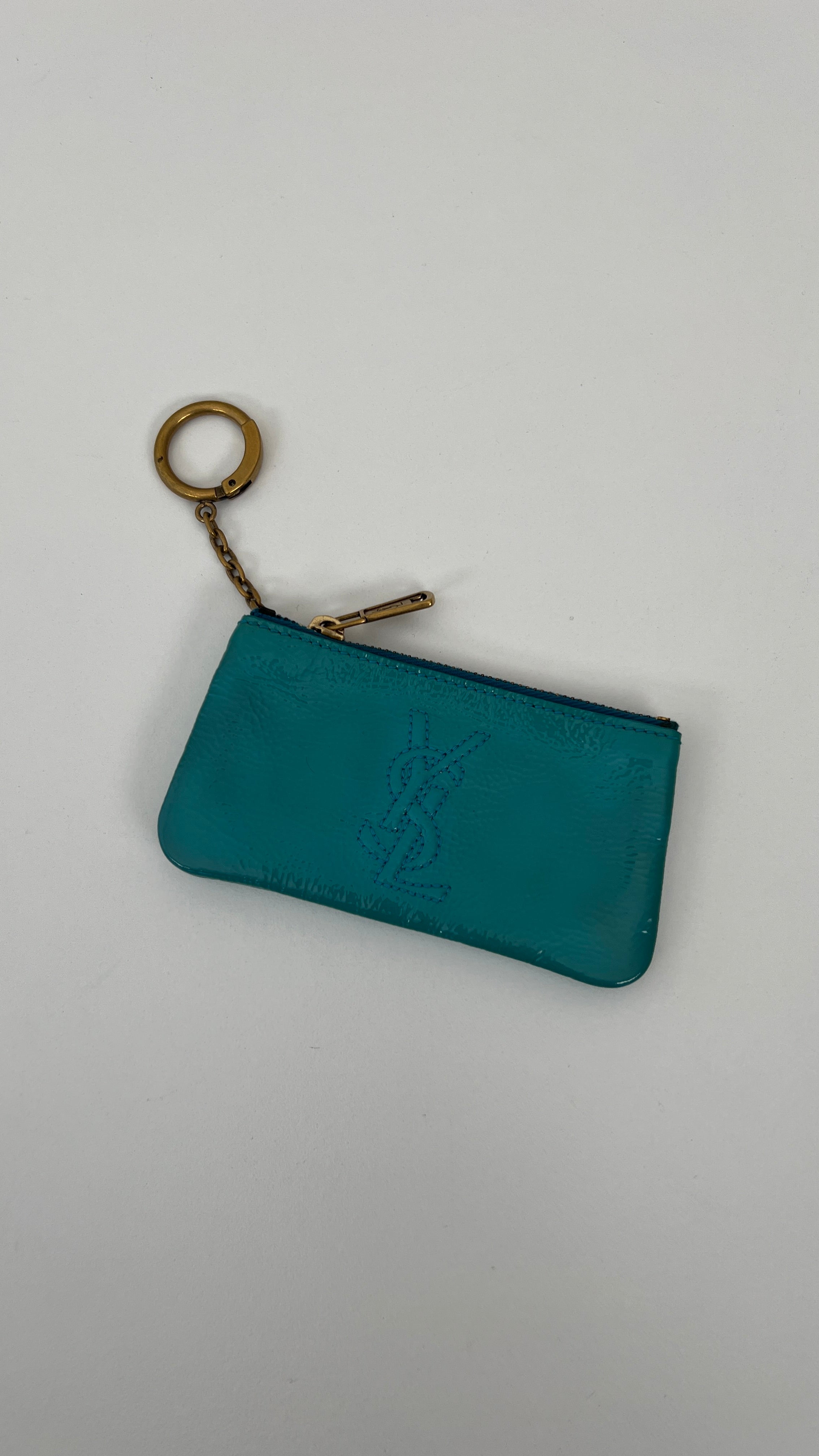 This Saint Laurent key pouch is in very good condition. Turquoise patent leather. The patent leather is in very good condition, a little bit sticky as per usual on patent leather, it's very little. Very good interior. It comes with the dustbag. You can use it for your keys or for a wallet.