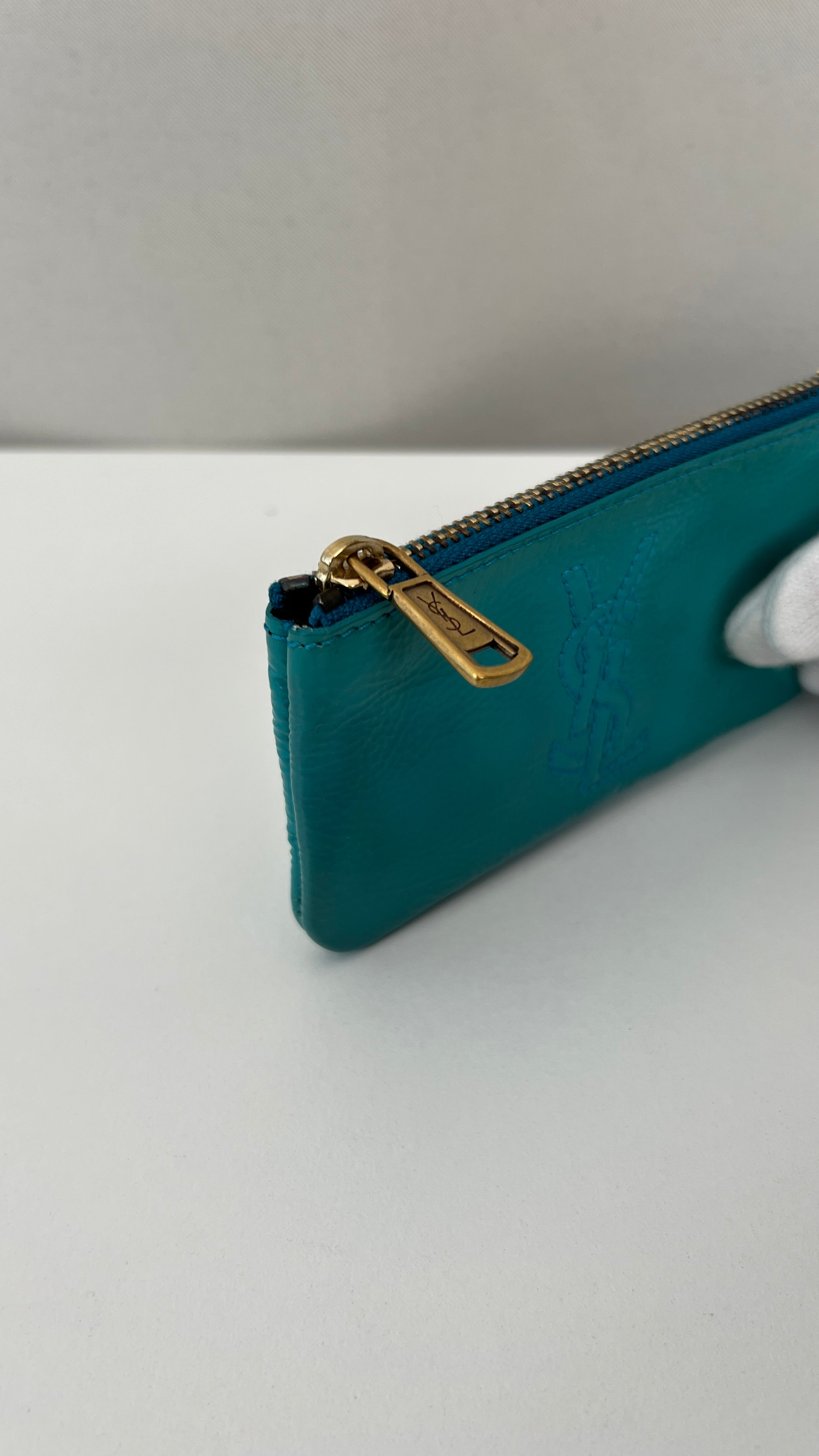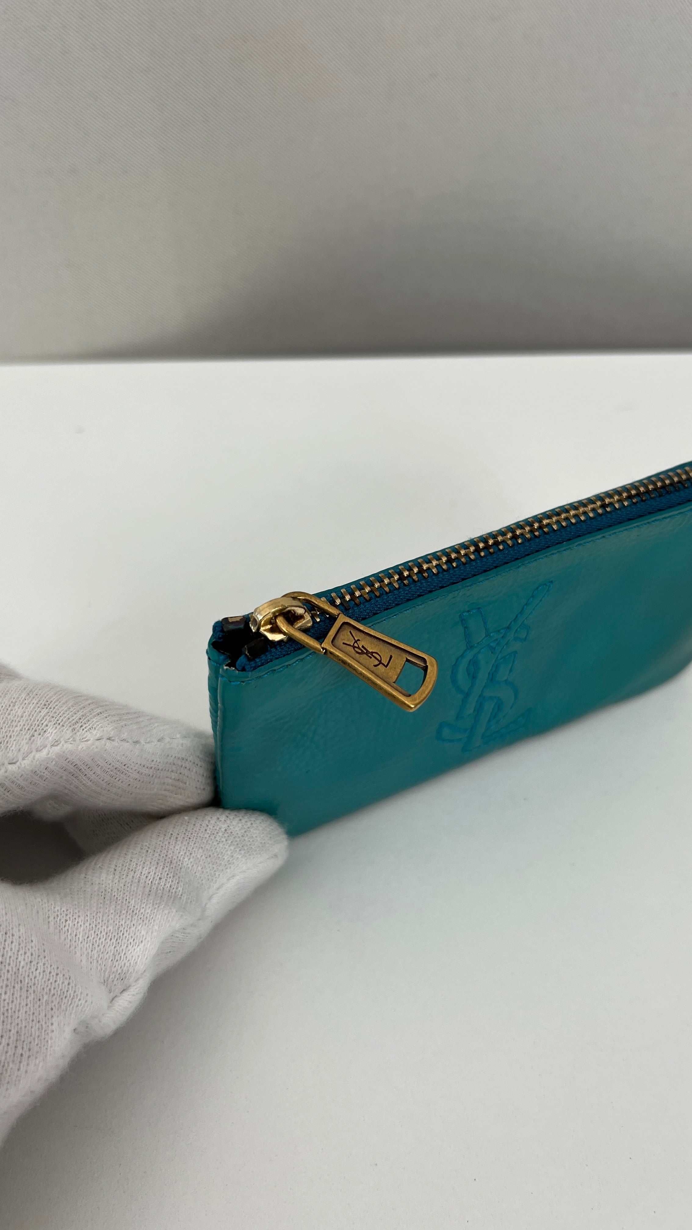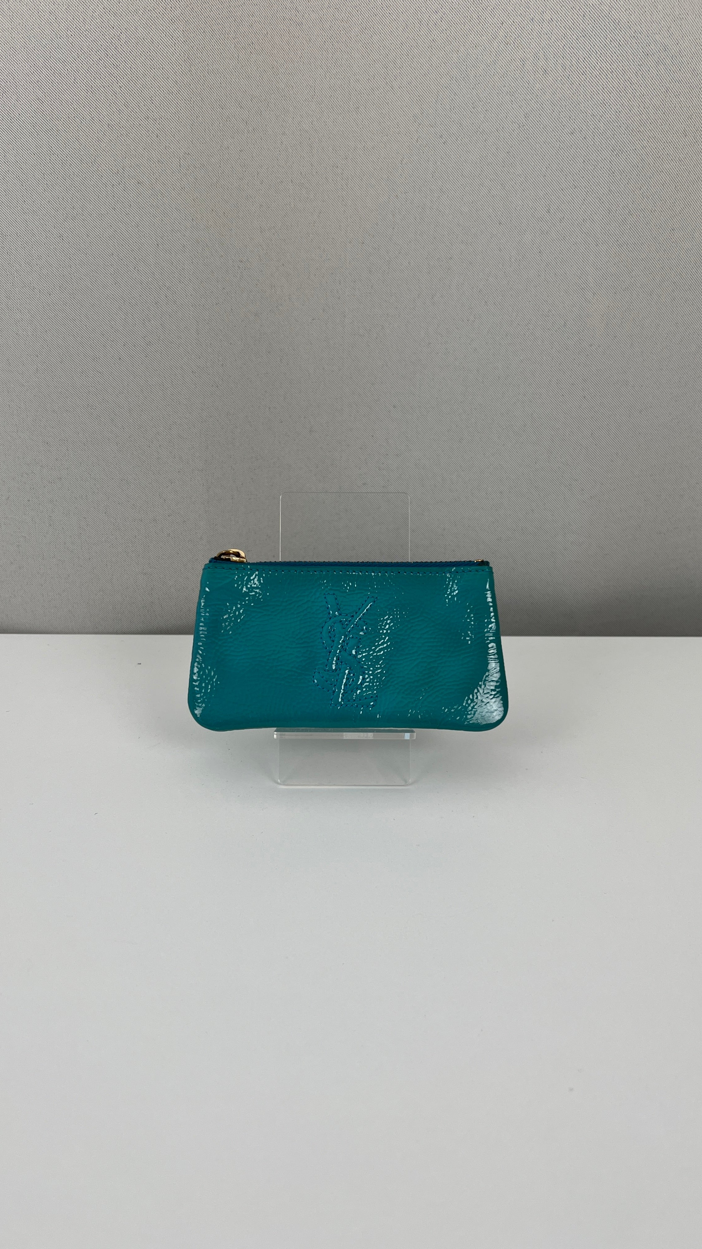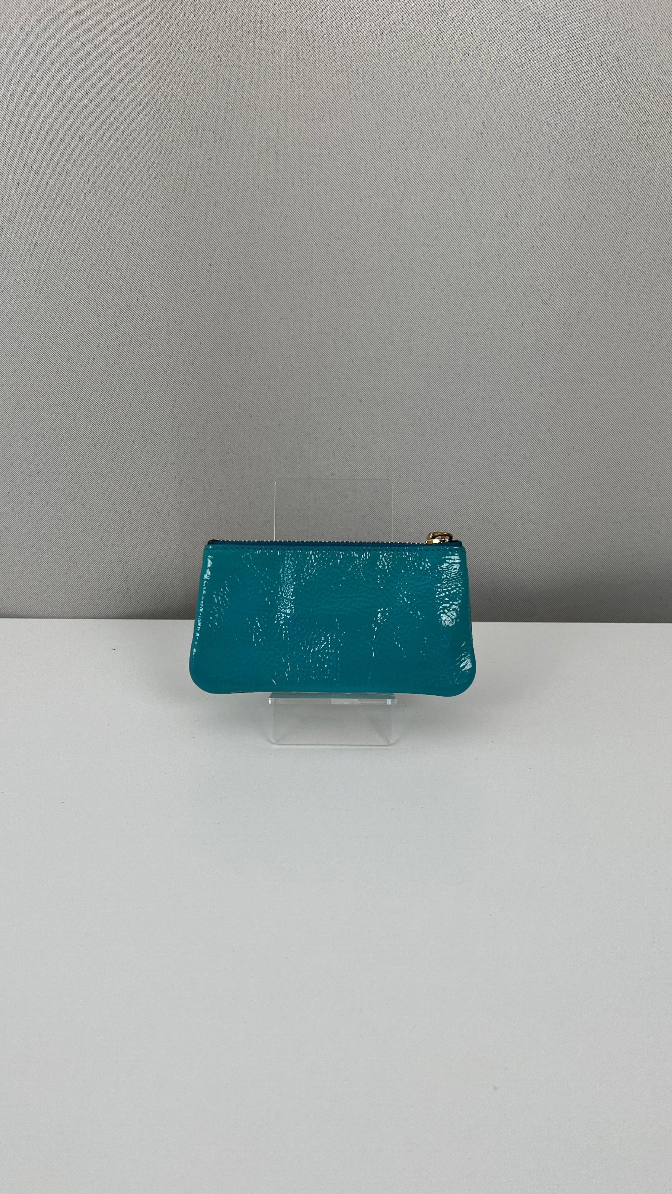 This Saint Laurent key pouch is in very good condition. Turquoise patent leather. The patent leather is in very good condition, a little bit sticky as per usual on patent leather, it's very little. Very good interior. It comes with the dustbag. You can use it for your keys or for a wallet.