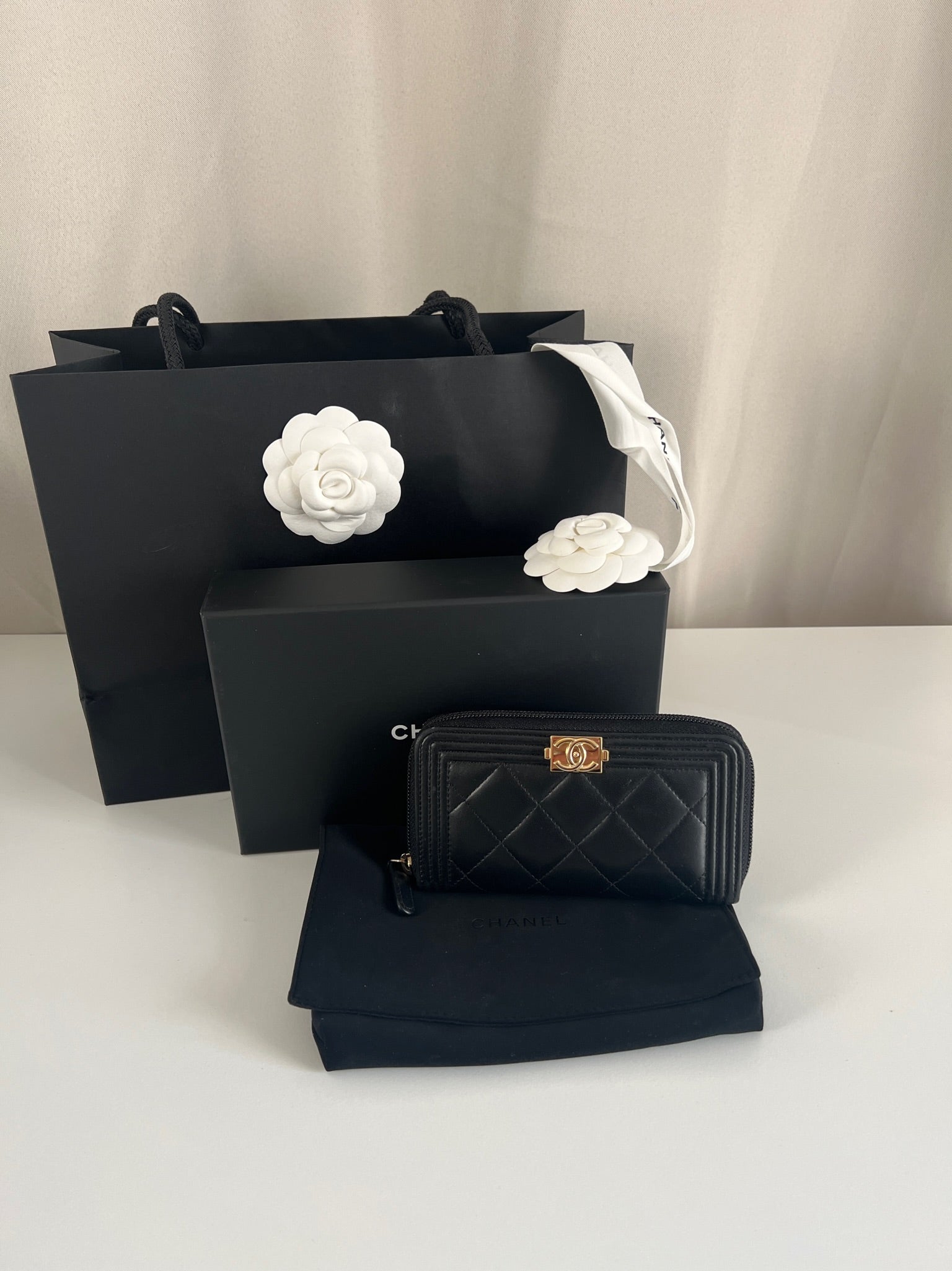 Chanel wallet boy small black leather champagne hardware