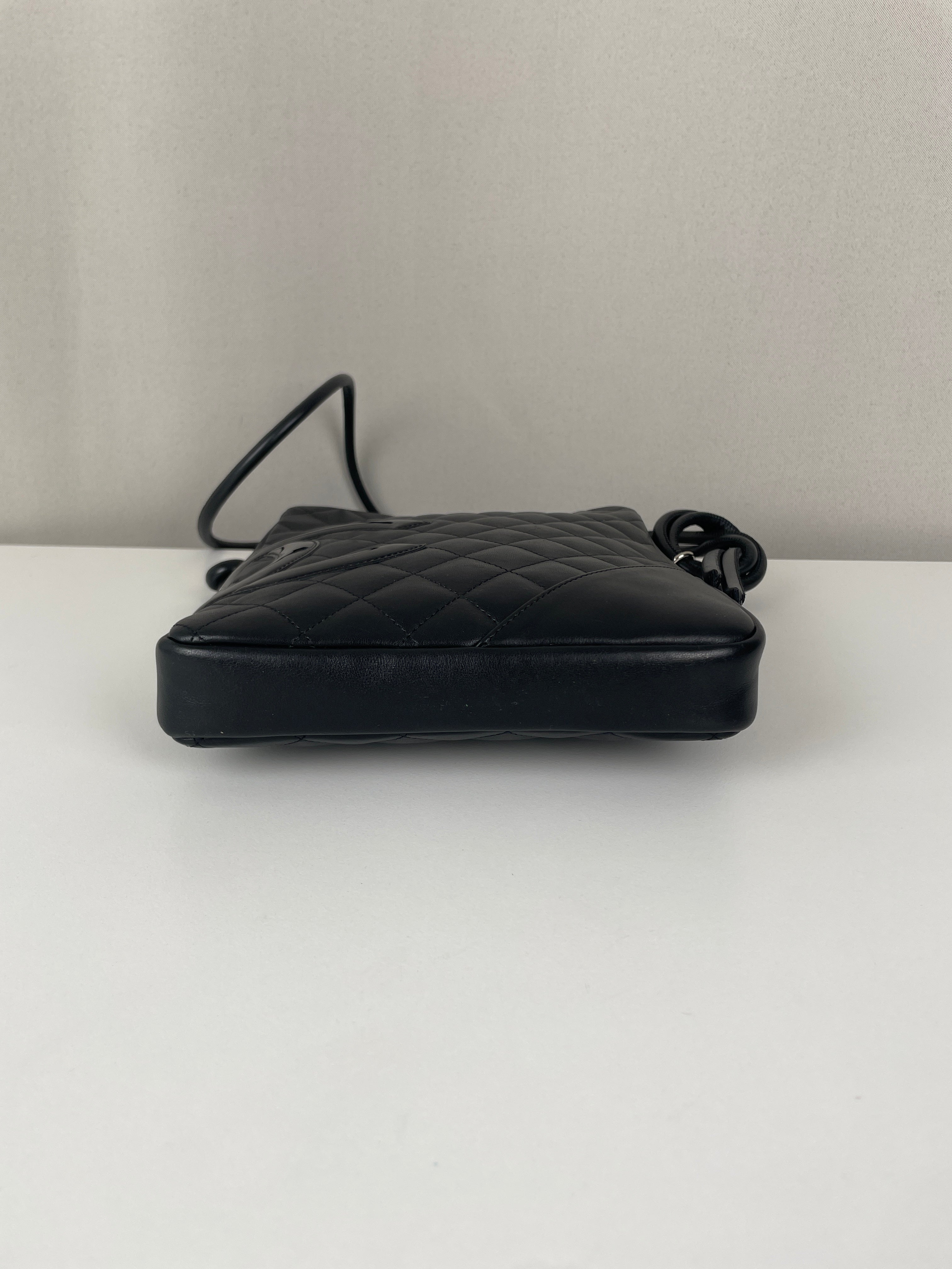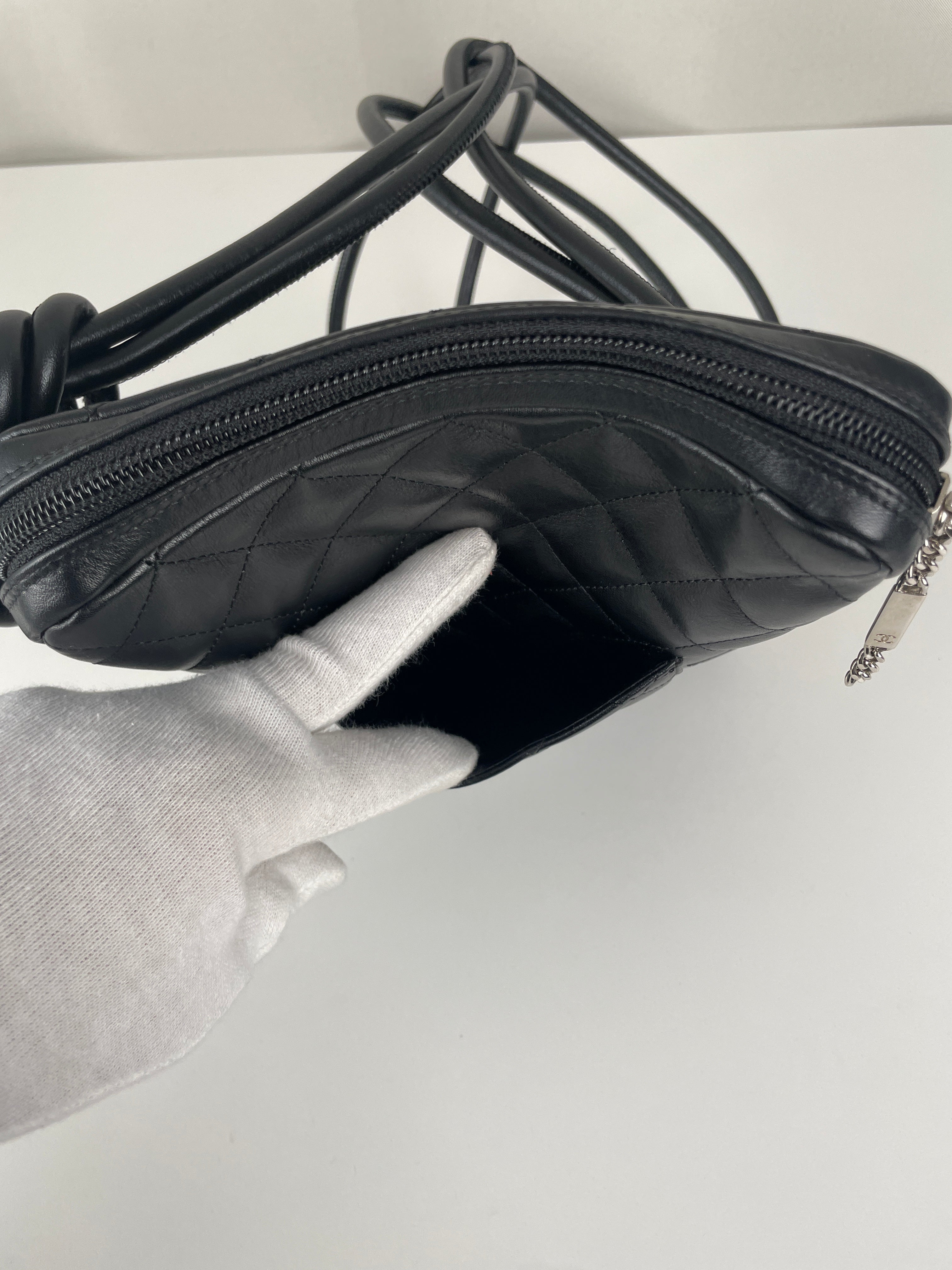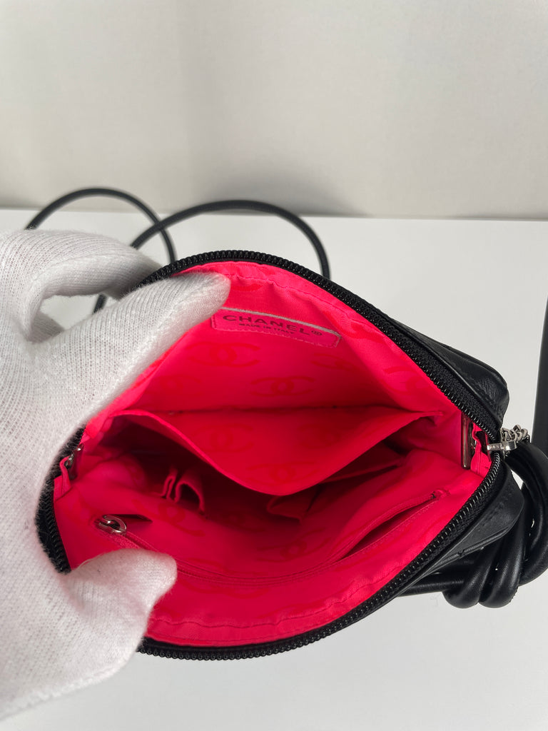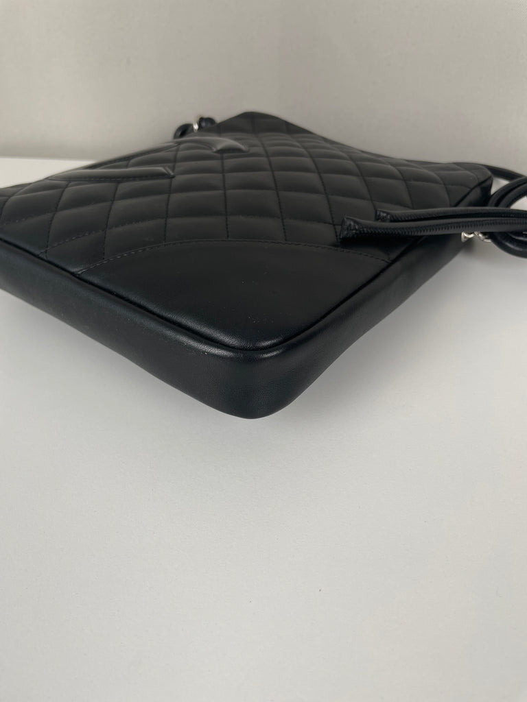 The Chanel Cambon collection represents one of the most coveted and distinctive lines from the early 2000s. This black leather pochette from 2005-2006 showcases Chanel's exceptional craftsmanship with its signature quilted pattern and iconic CC logo. The Cambon line, with its bold graphic aesthetic, marked a modern evolution in Chanel's design heritage. This vintage piece embodies nearly two decades of authentic luxury character while maintaining excellent structural integrity and timeless Parisian elegance.
