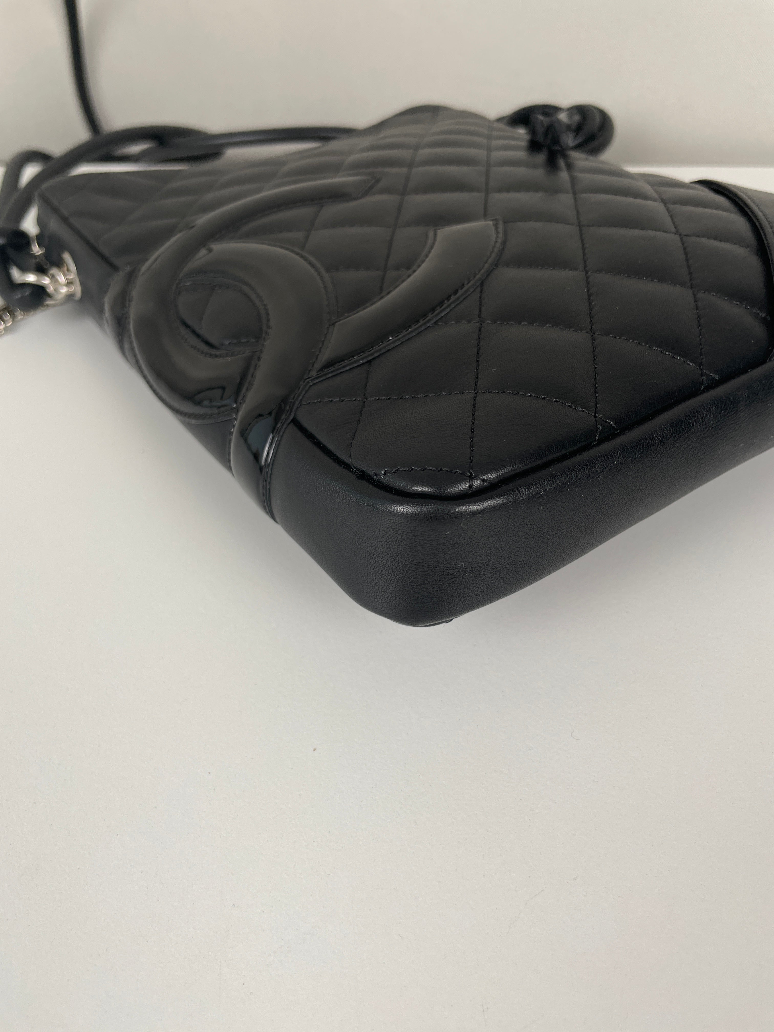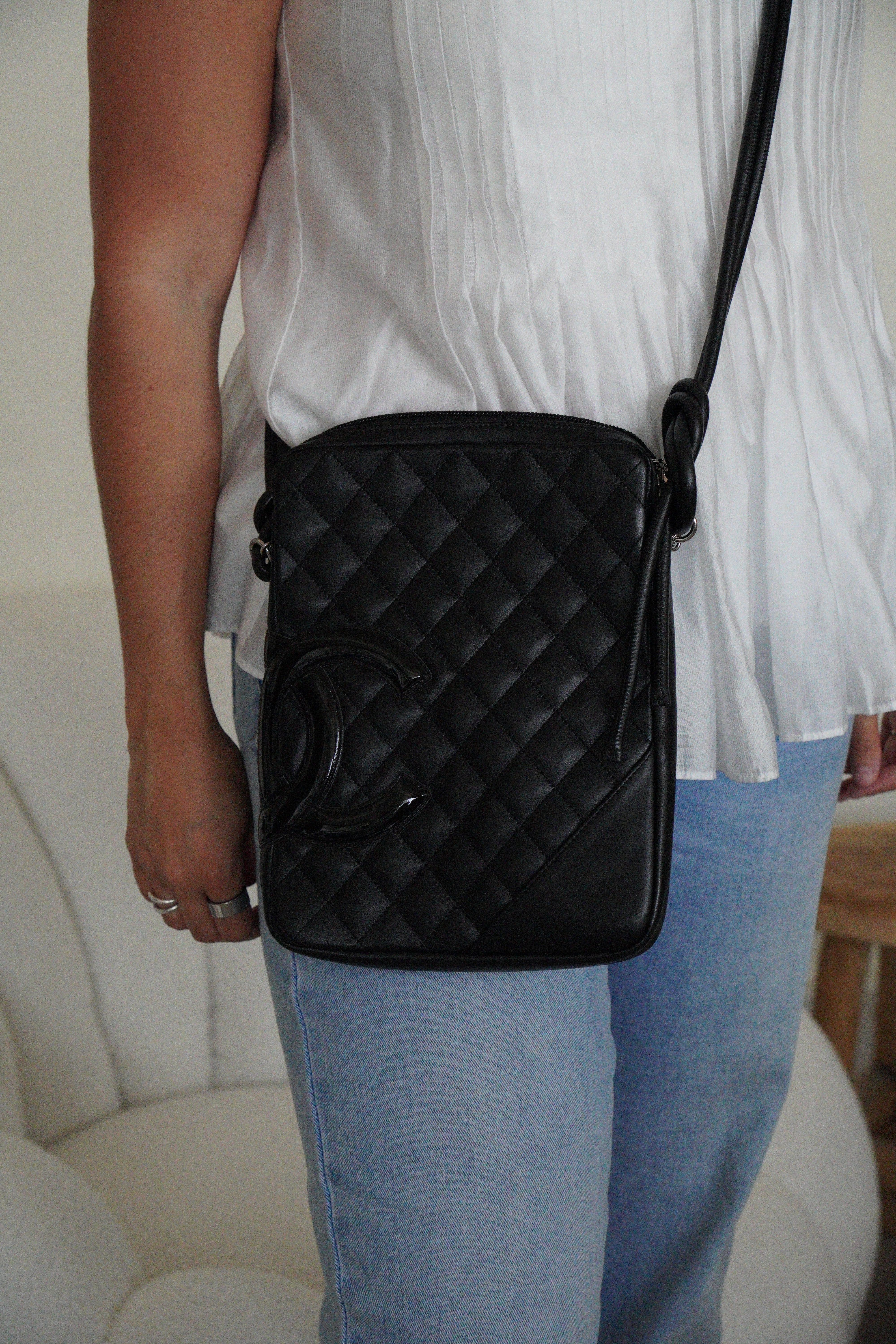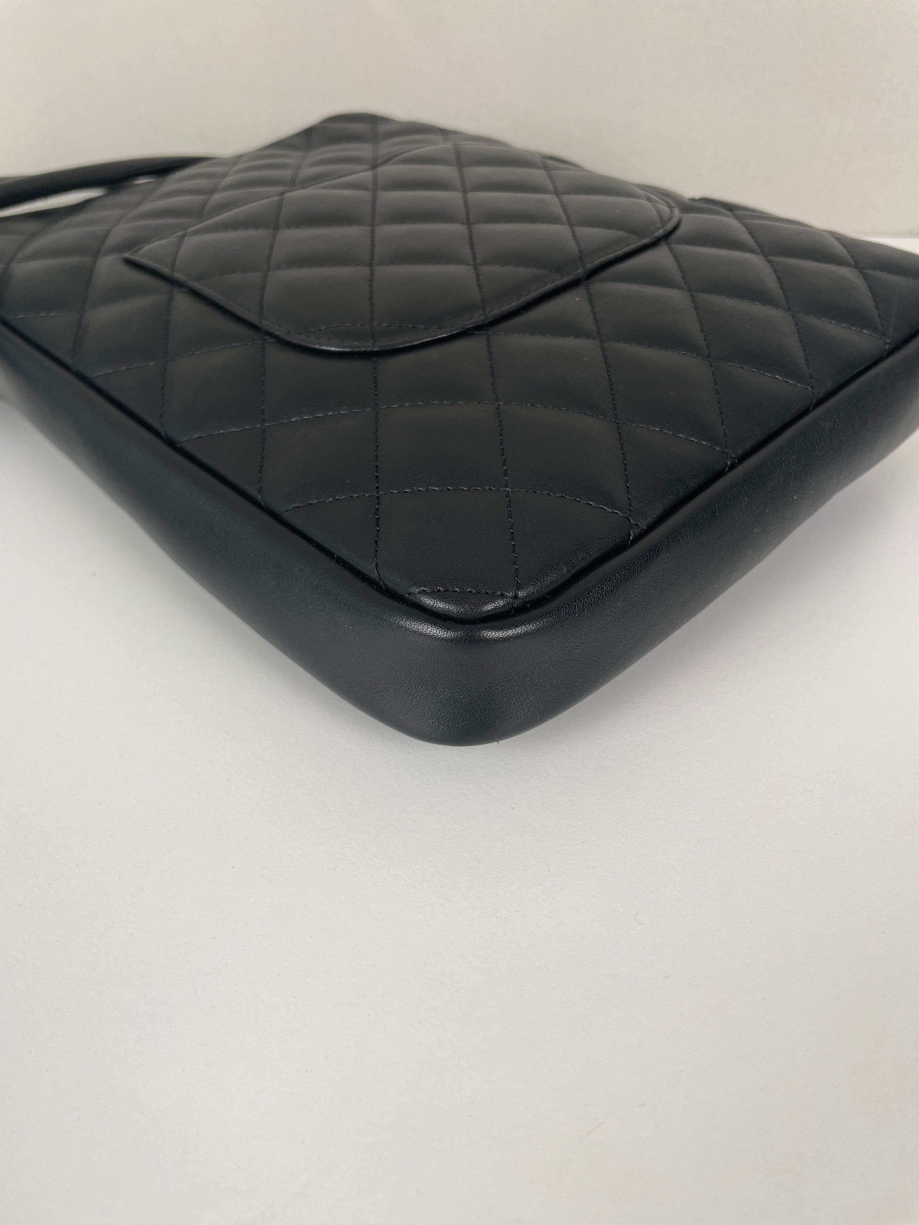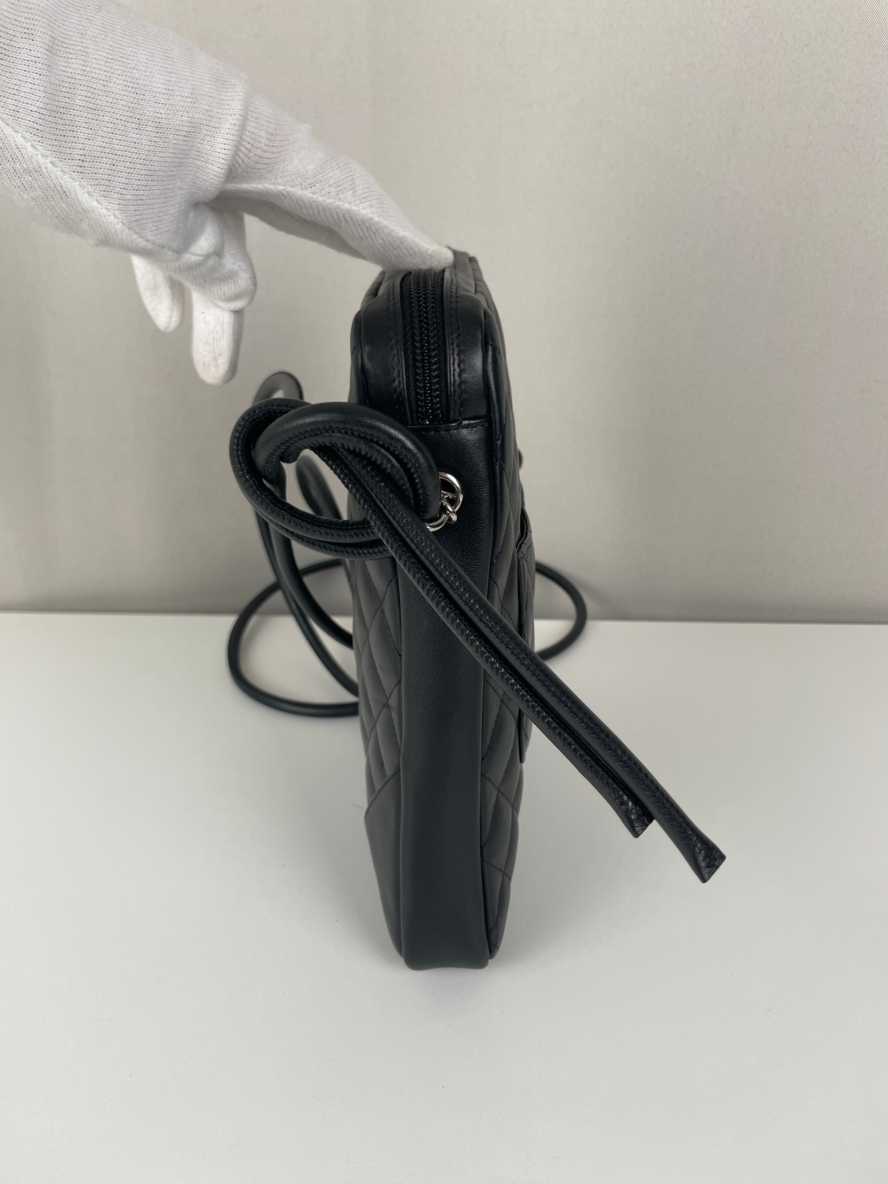 The Chanel Cambon collection represents one of the most coveted and distinctive lines from the early 2000s. This black leather pochette from 2005-2006 showcases Chanel's exceptional craftsmanship with its signature quilted pattern and iconic CC logo. The Cambon line, with its bold graphic aesthetic, marked a modern evolution in Chanel's design heritage. This vintage piece embodies nearly two decades of authentic luxury character while maintaining excellent structural integrity and timeless Parisian elegance.