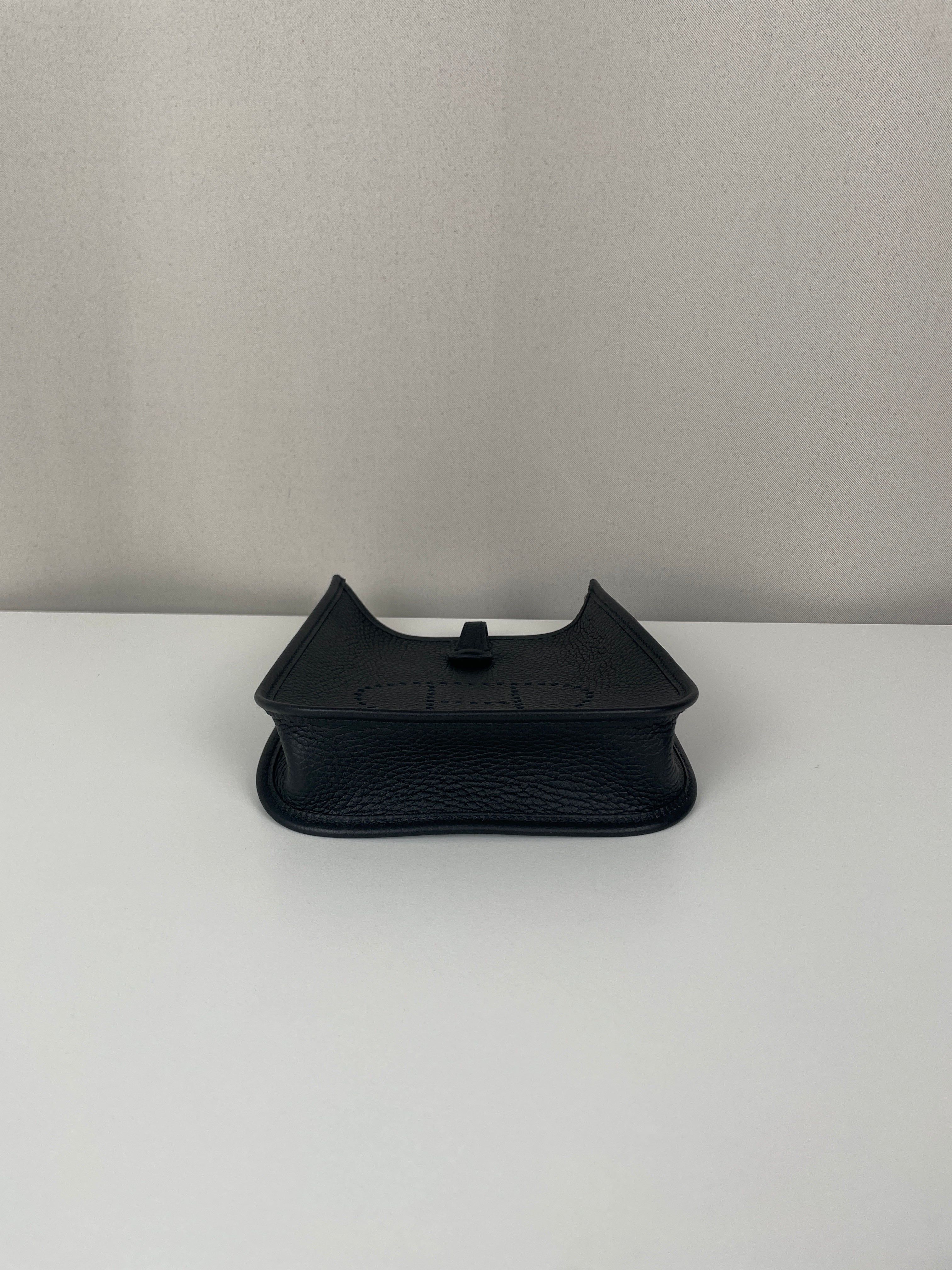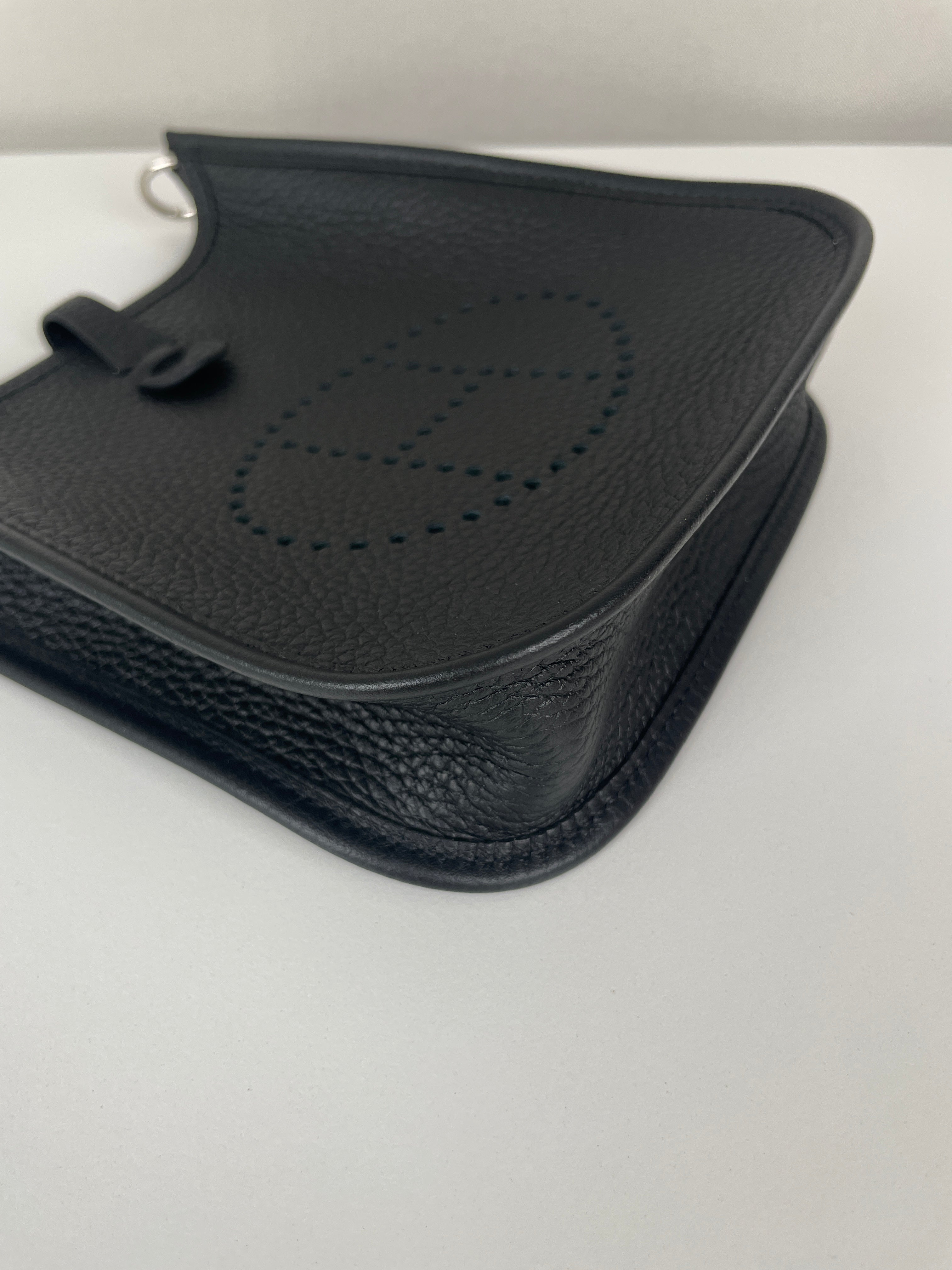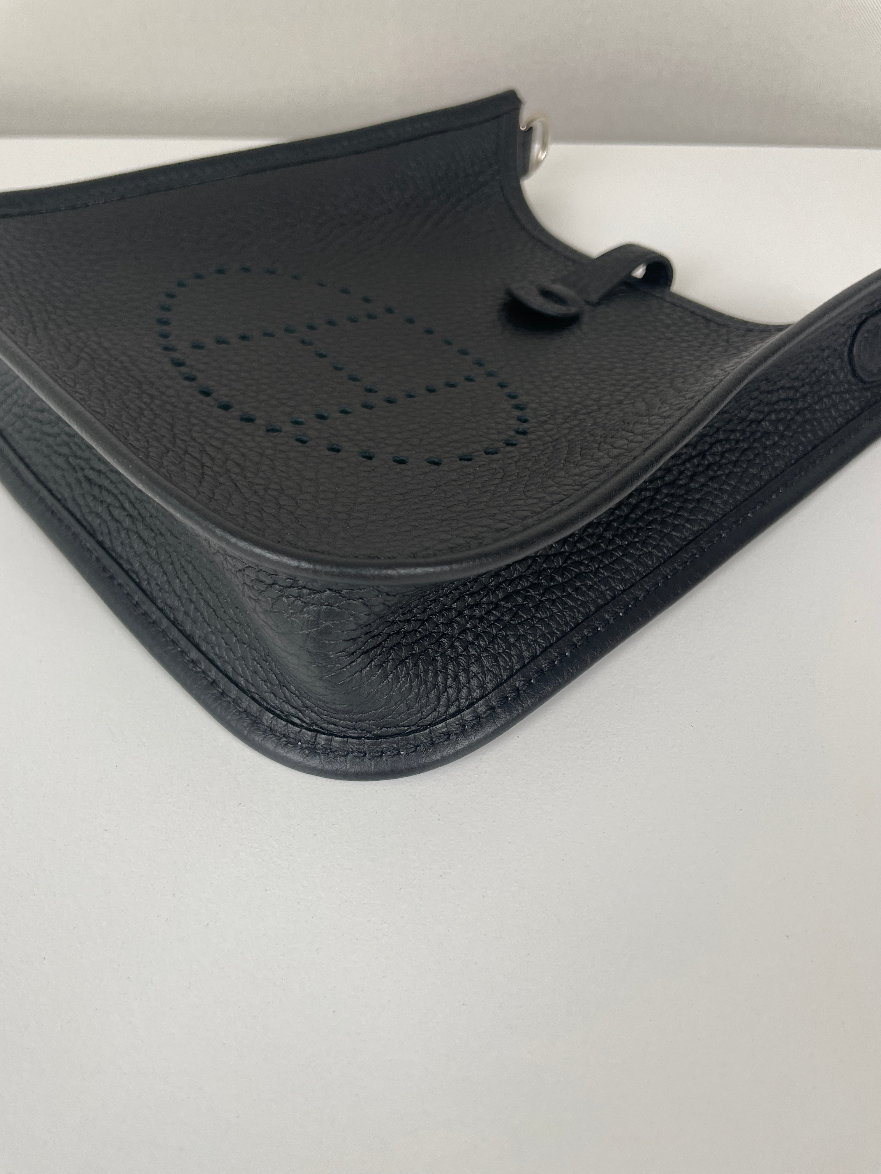 The Mini Evelyn is one of Hermès' most coveted contemporary designs. This 2022 edition in exquisite black leather showcases the maison's exceptional craftsmanship. The leather remains in pristine condition with beautiful texture and depth, while the corners show no signs of wear. The distinctive perforated H creates the bag's signature silhouette.