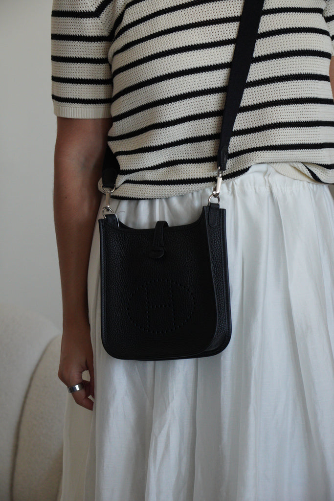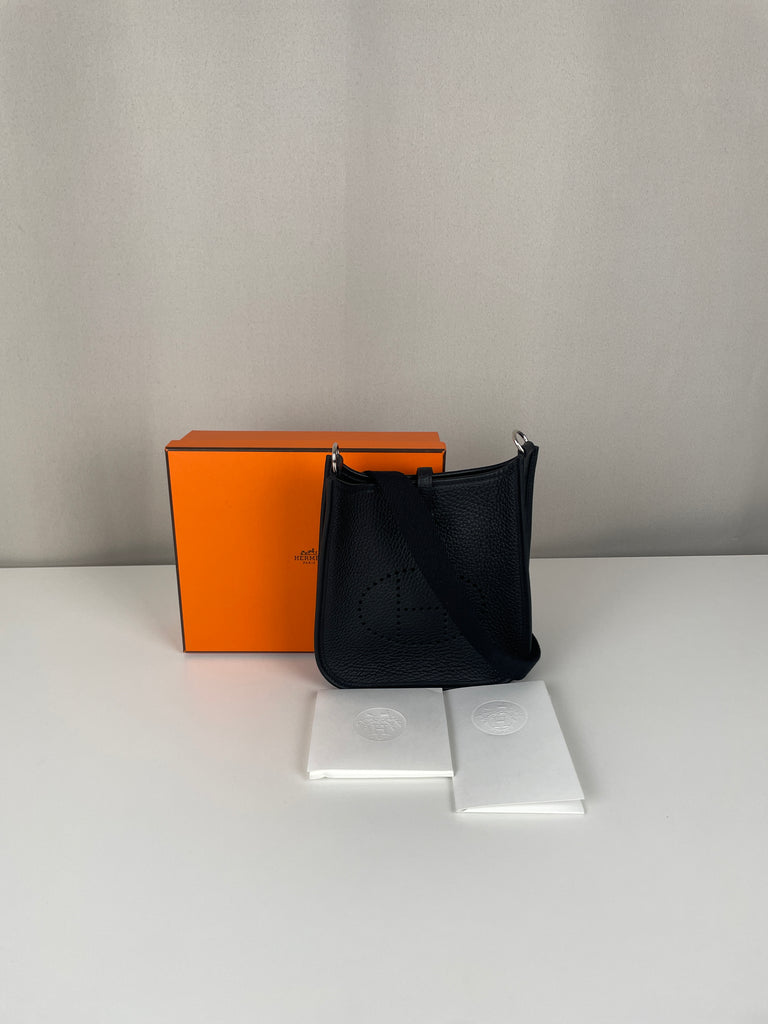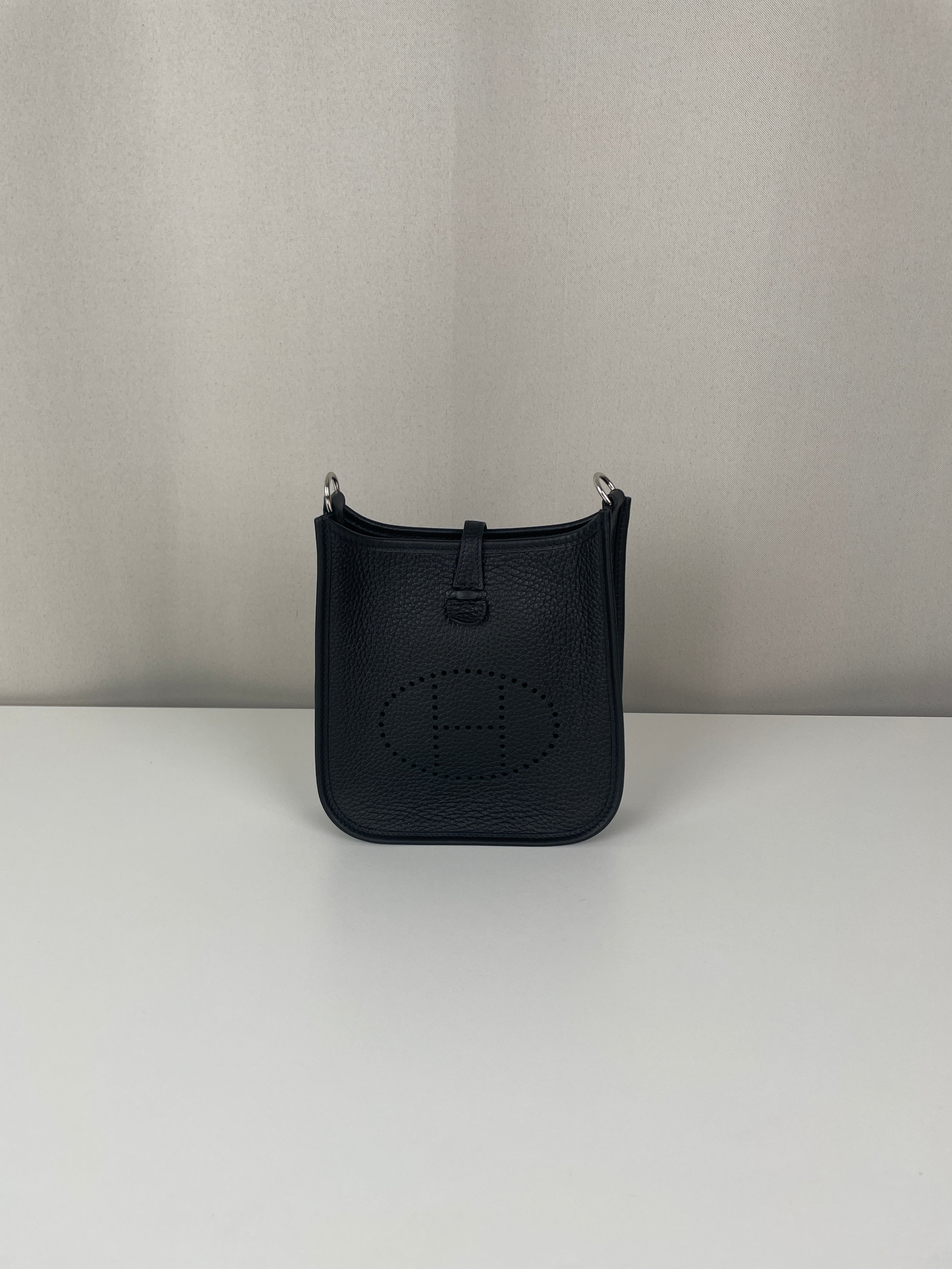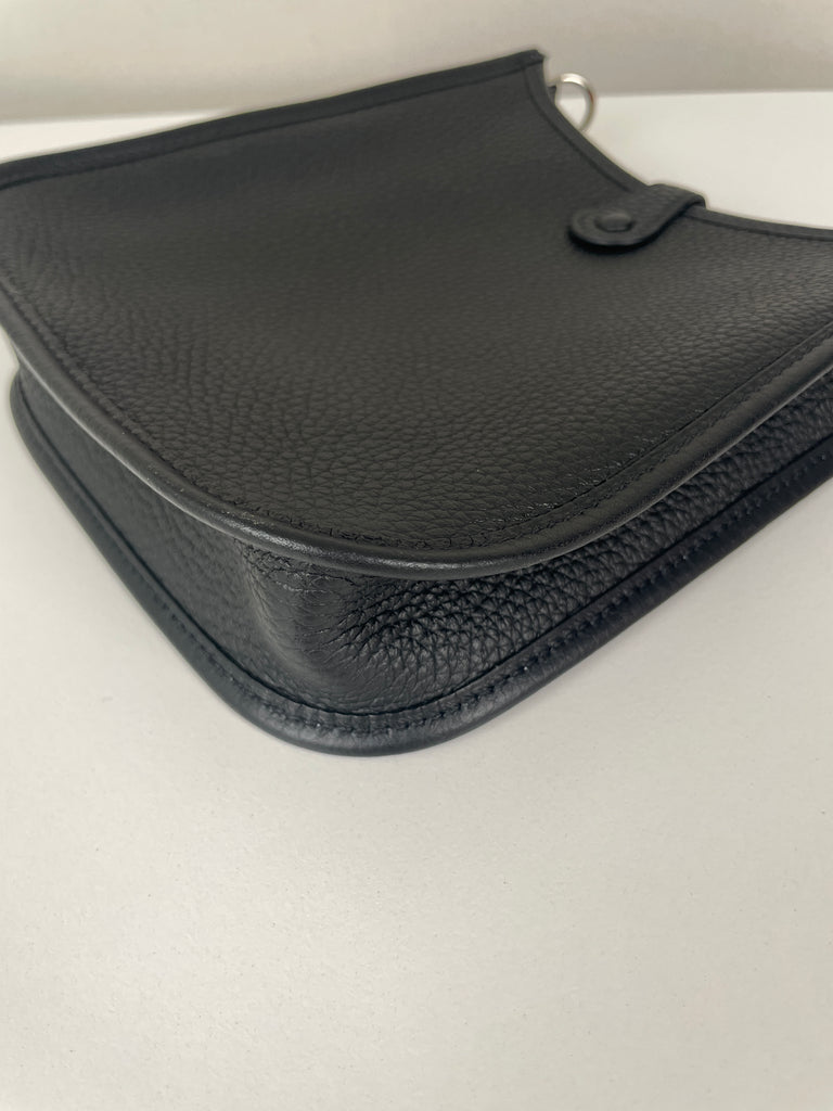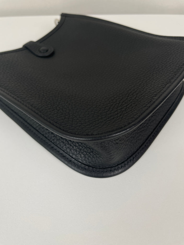 The Mini Evelyn is one of Hermès' most coveted contemporary designs. This 2022 edition in exquisite black leather showcases the maison's exceptional craftsmanship. The leather remains in pristine condition with beautiful texture and depth, while the corners show no signs of wear. The distinctive perforated H creates the bag's signature silhouette.
