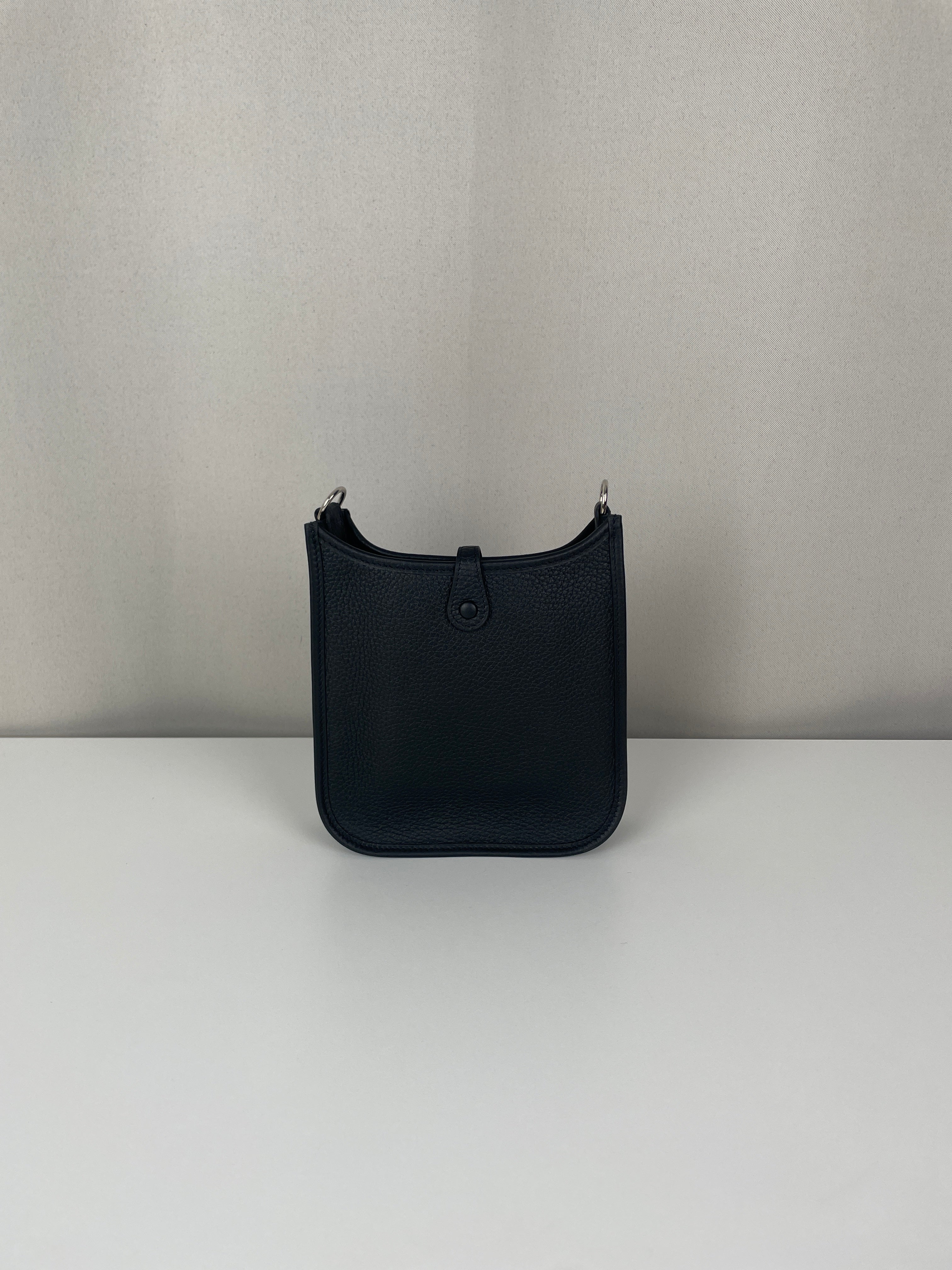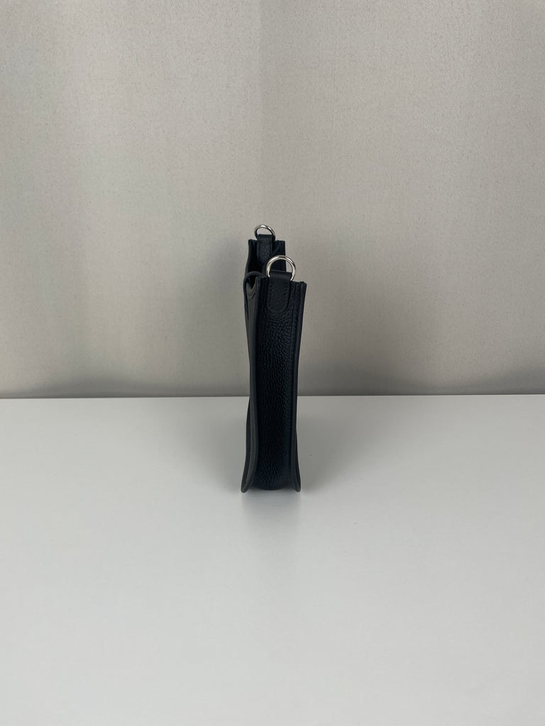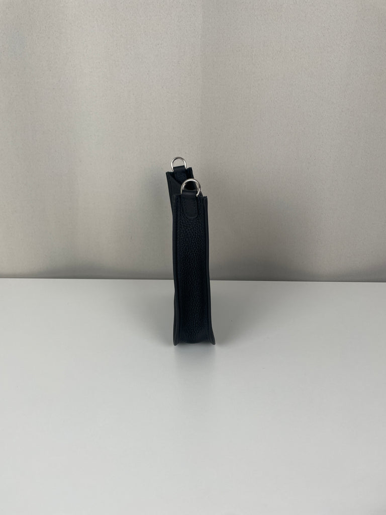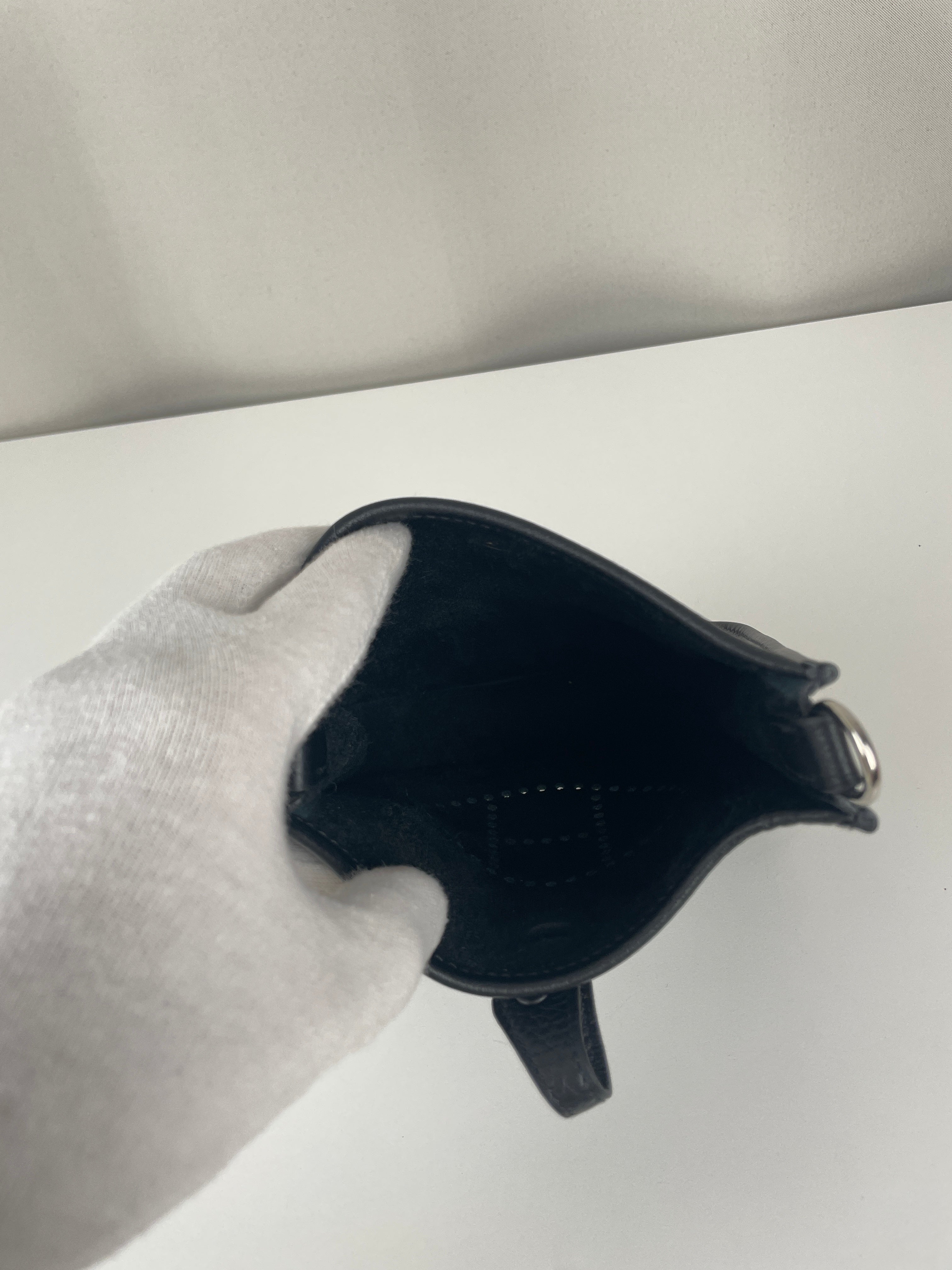 The adjustable strap is supple and strong, and the interior is immaculate throughout. The silver hardware provides elegant contrast against the rich black leather. A compact yet practical piece that embodies Hermès' timeless sophistication with modern versatility.