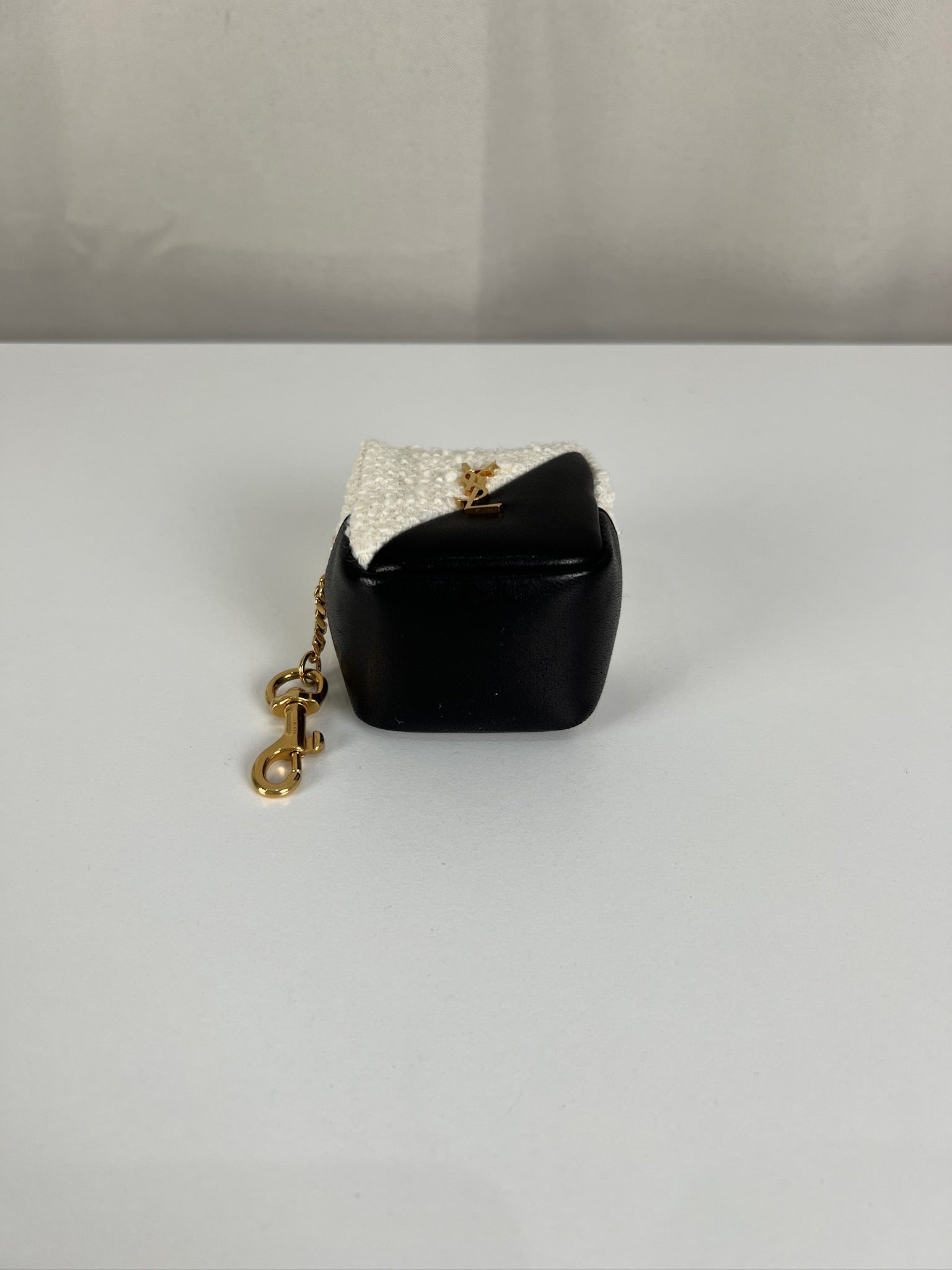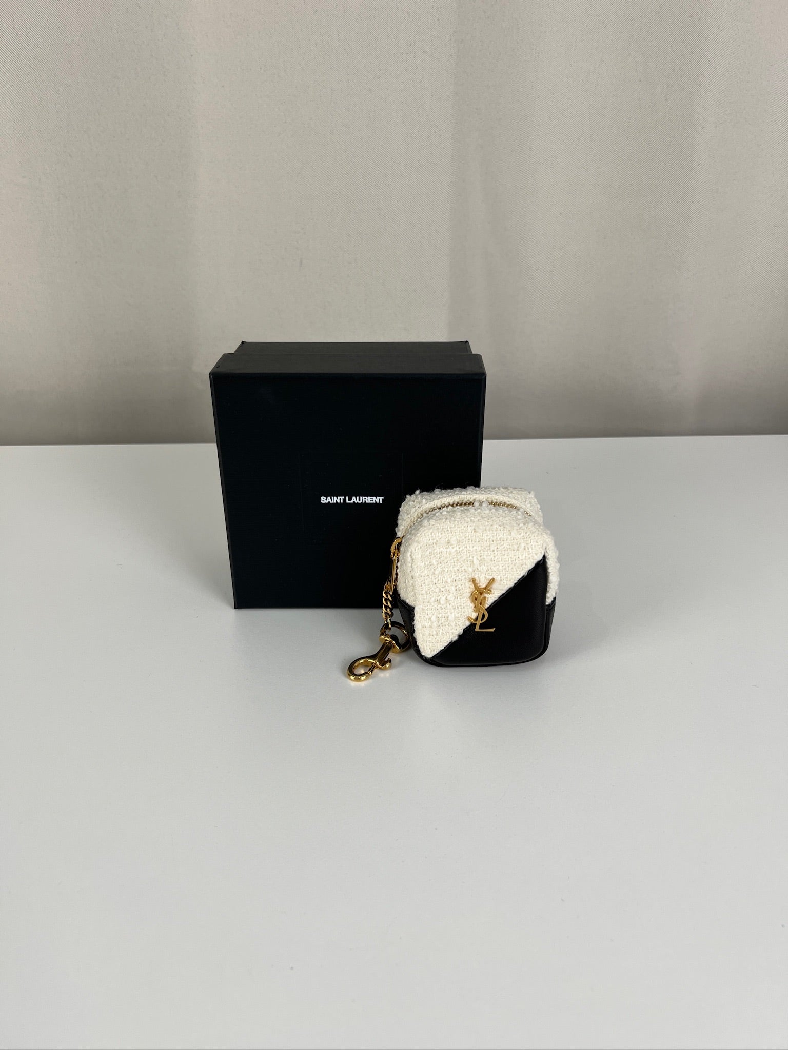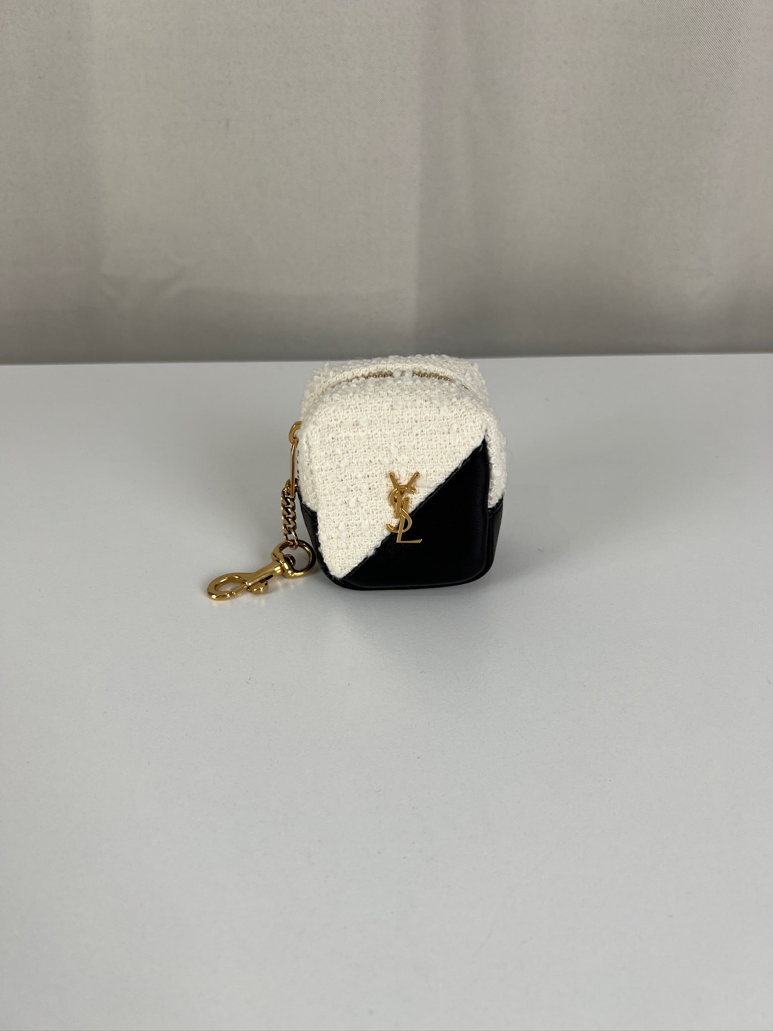 This Saint Laurent Jamie cube is in very good condition, as new. The leather is amazing. Corners are very good. The hardware is in very good condition. The interior is in very good condition too no stains. You can fit airpods for example, you can attach it to a bag. It comes with the box.