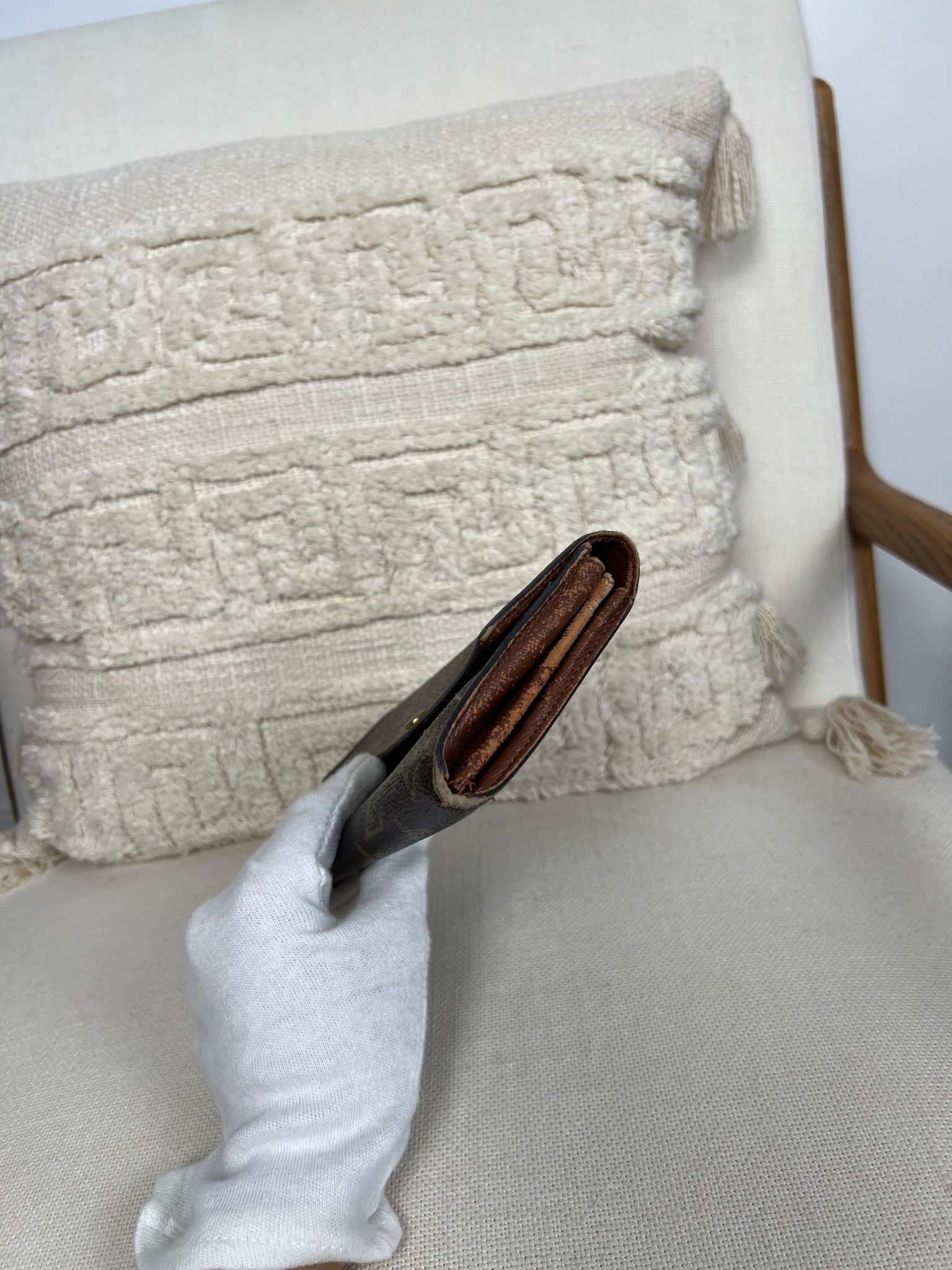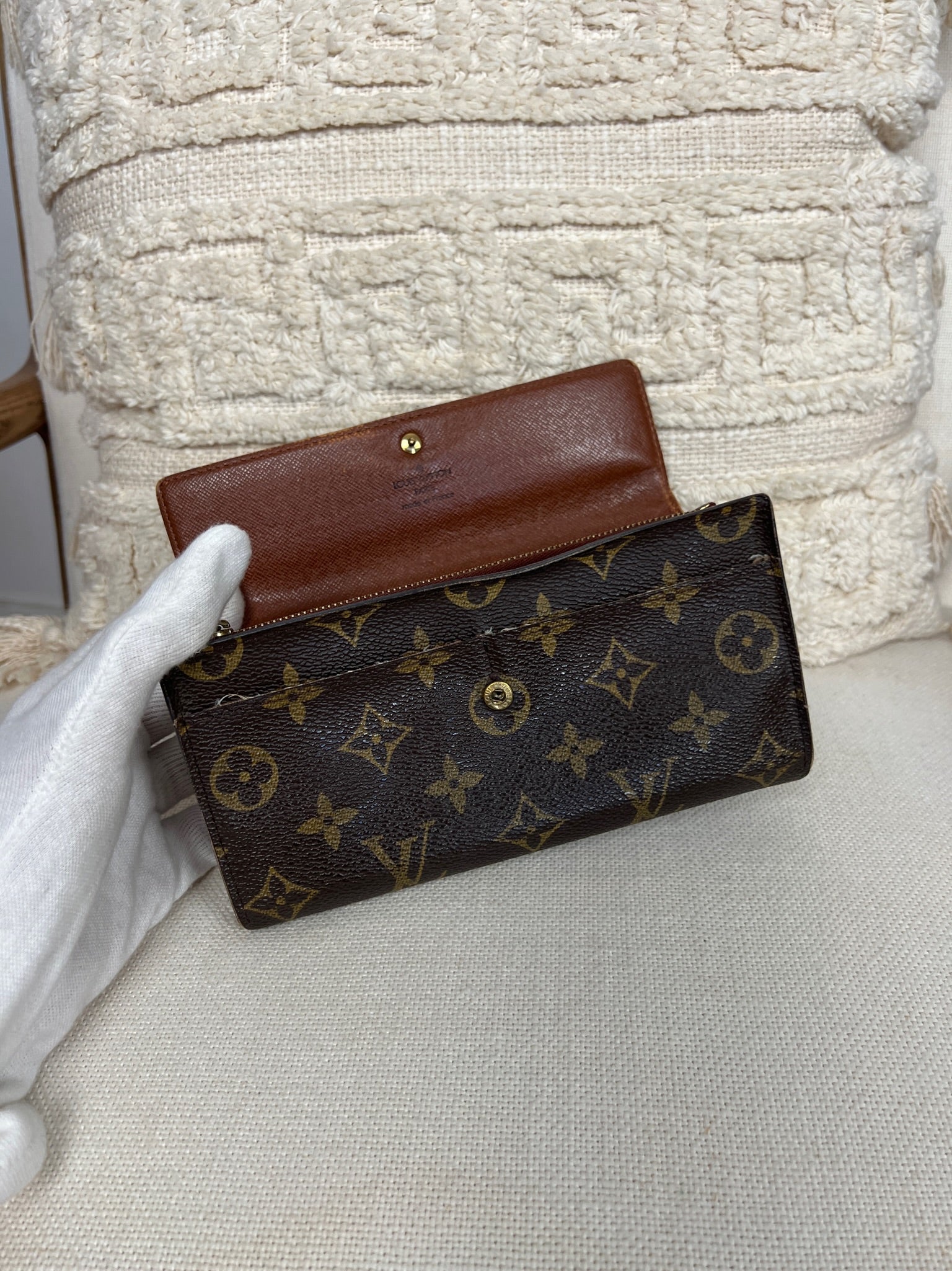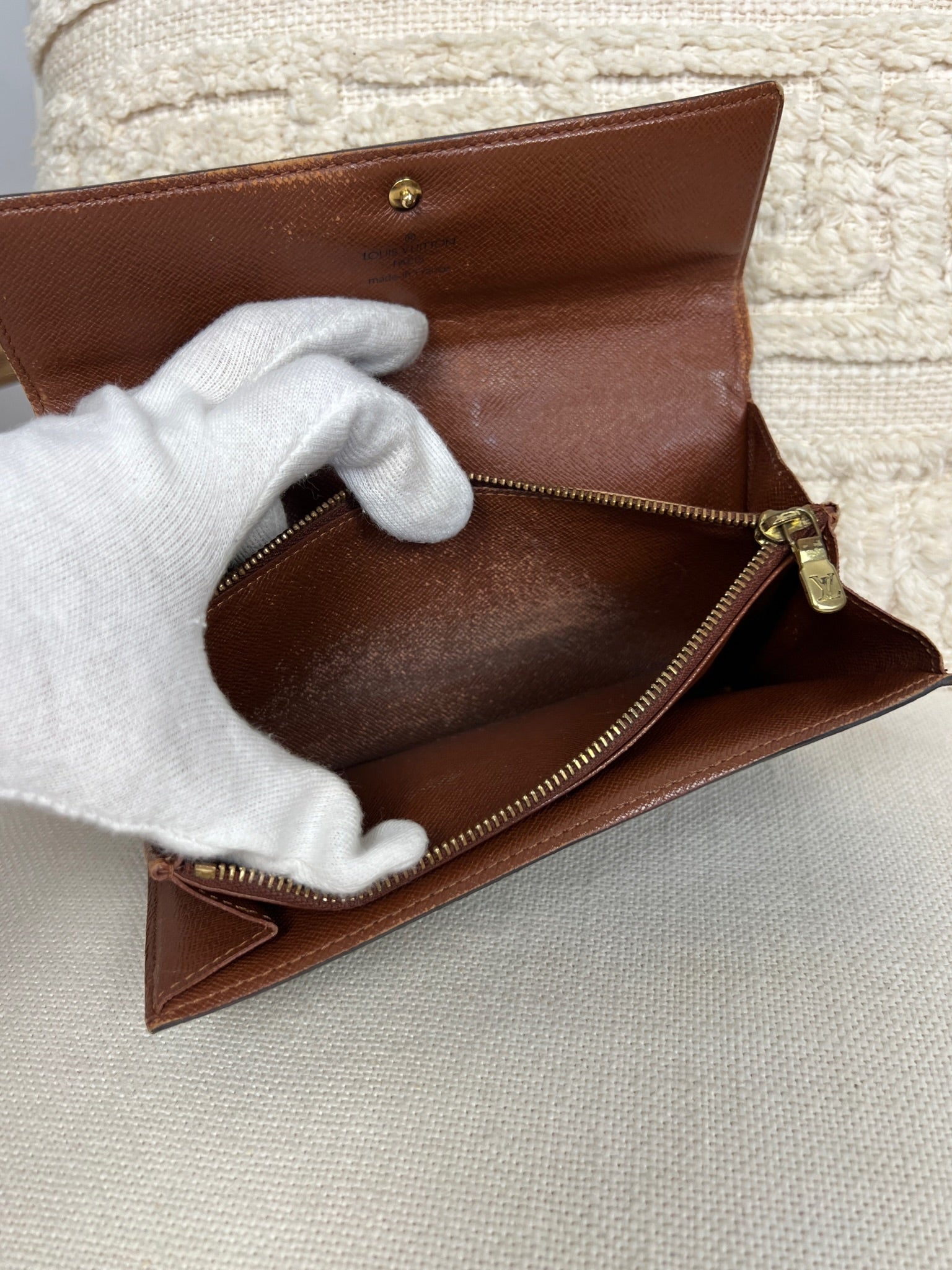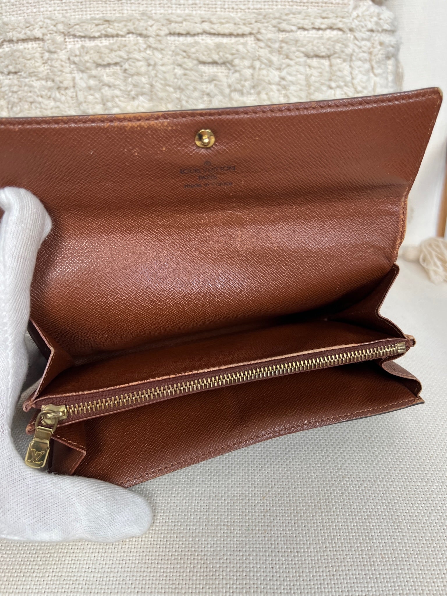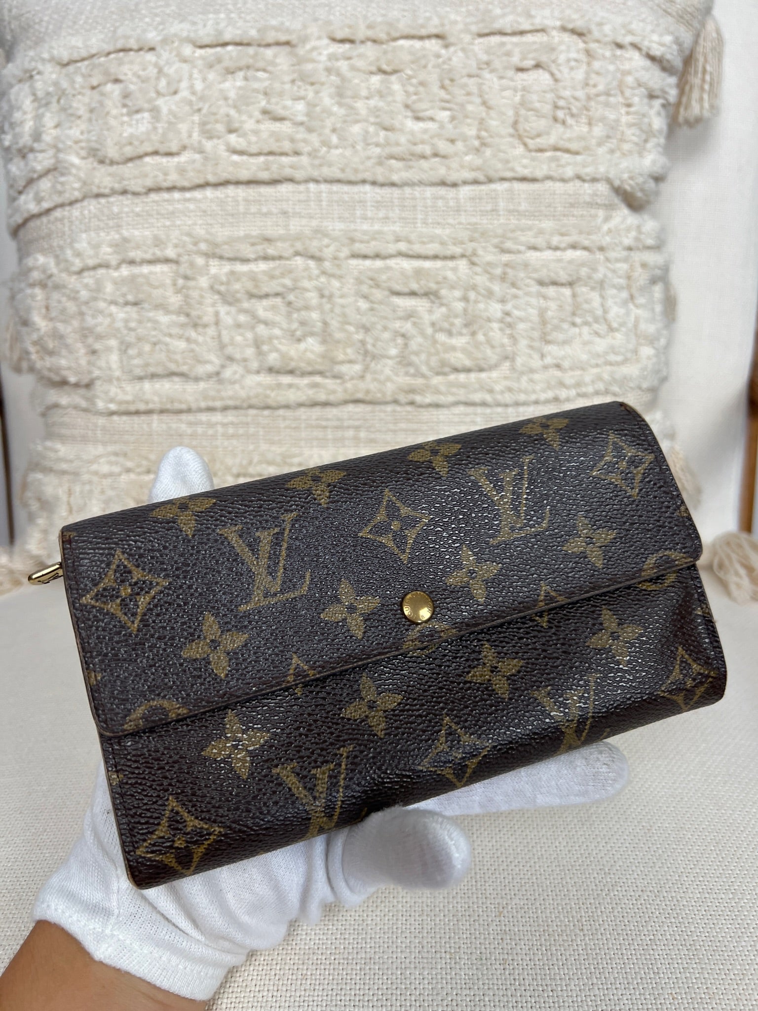 This Louis Vuitton Sarah wallet is in fair / good condition. The canva is in very good condition. The corners are in used condition, you can see some damaged on them. The interior is in ok / good condition, but has signs of wear on the zipper pocket and flap. The button is worn from normal use. Sides also shows some signs of wear.