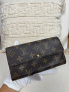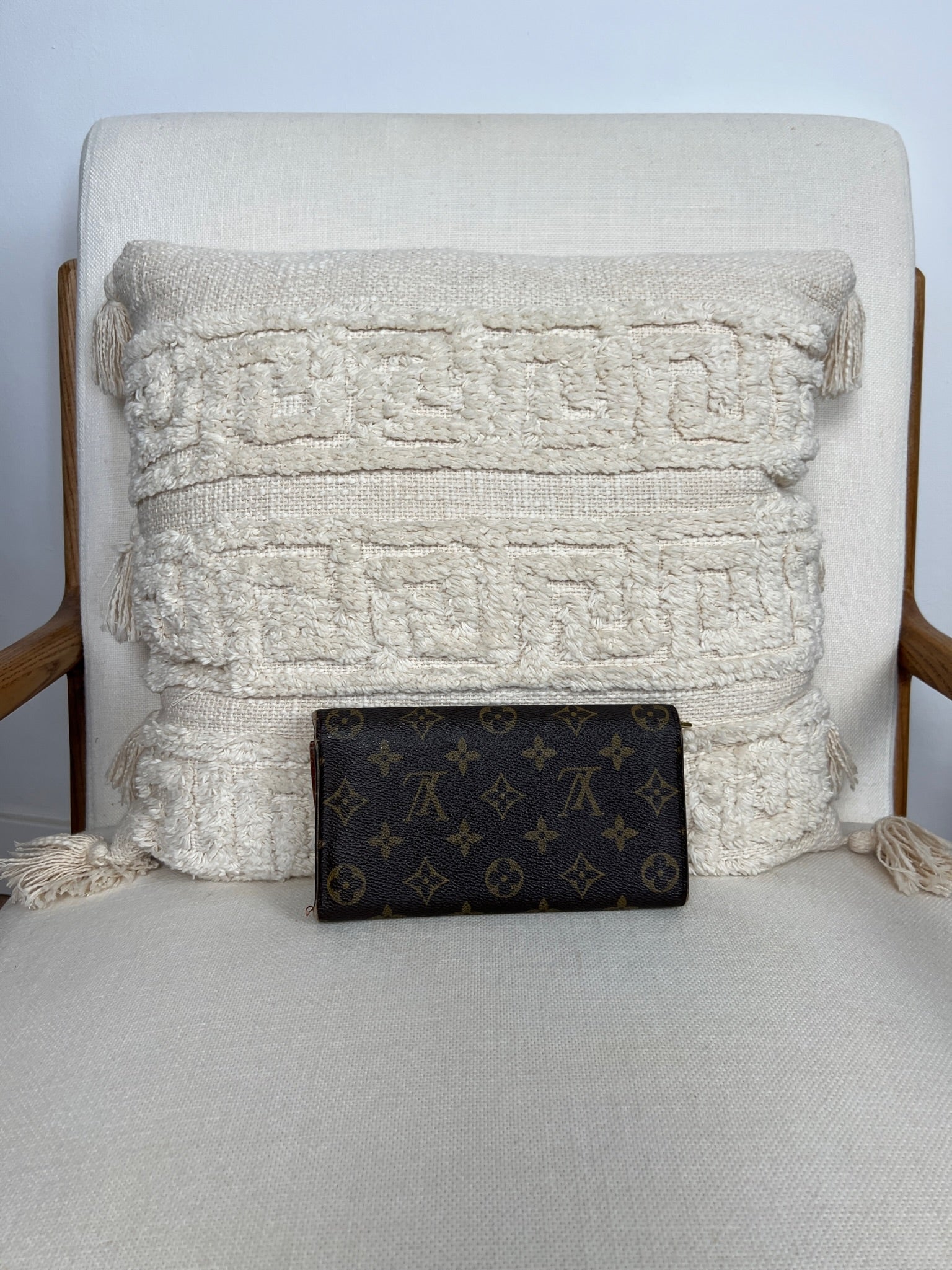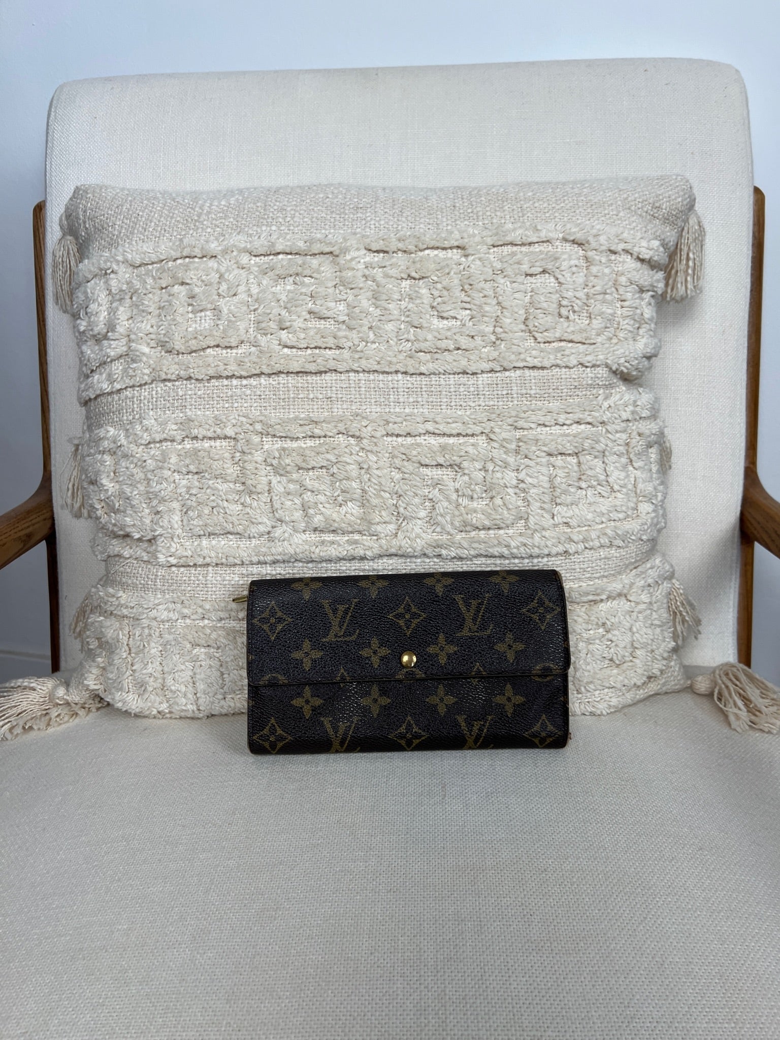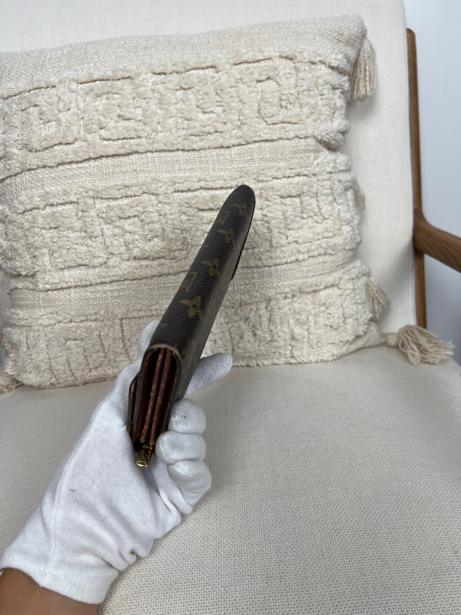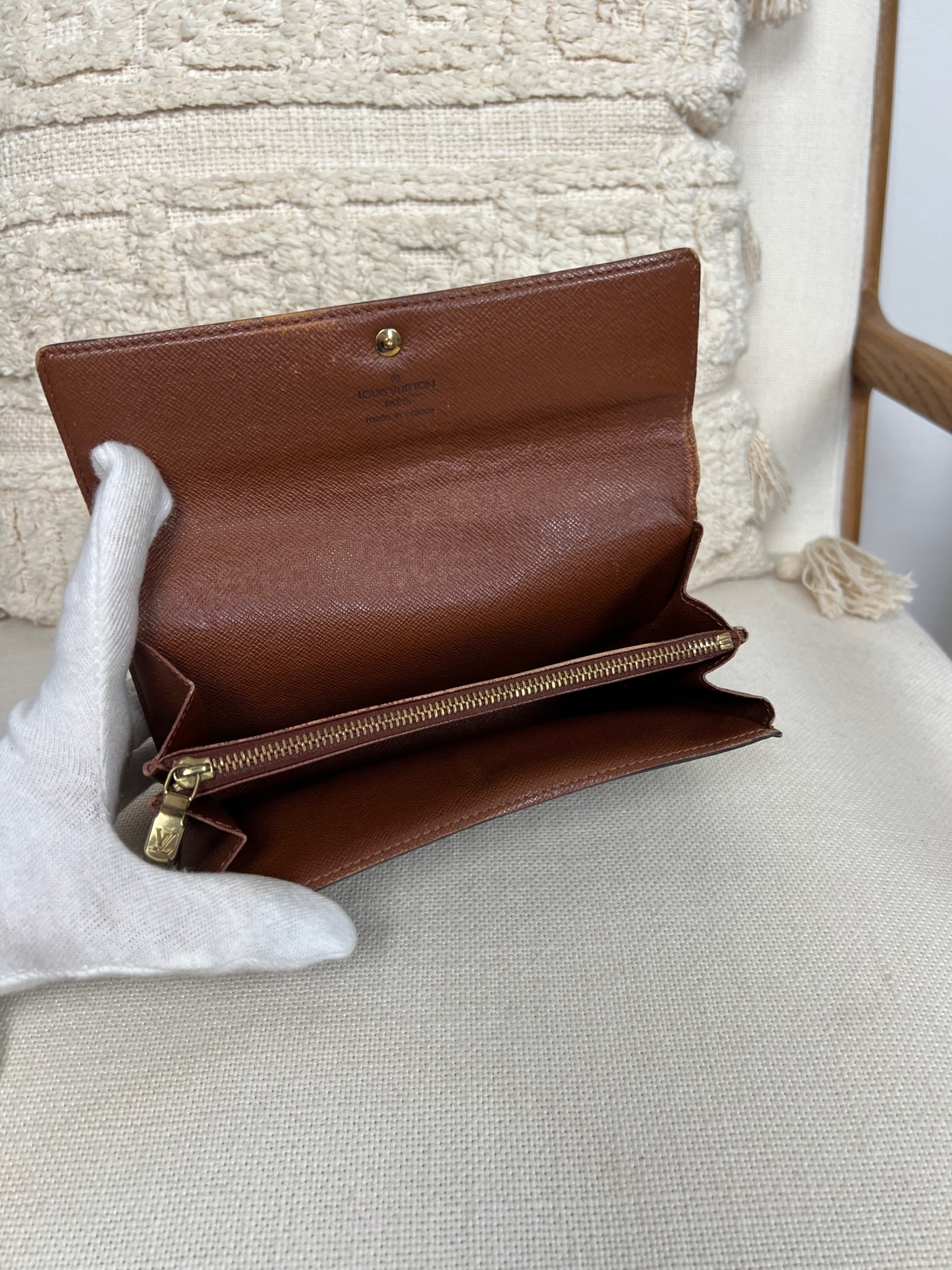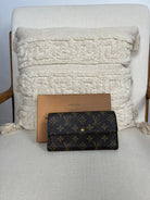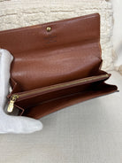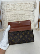 This Louis Vuitton Sarah wallet is in fair / good condition. The canva is in very good condition. The corners are in used condition, you can see some damaged on them. The interior is in ok / good condition, but has signs of wear on the zipper pocket and flap. The button is worn from normal use. Sides also shows some signs of wear.