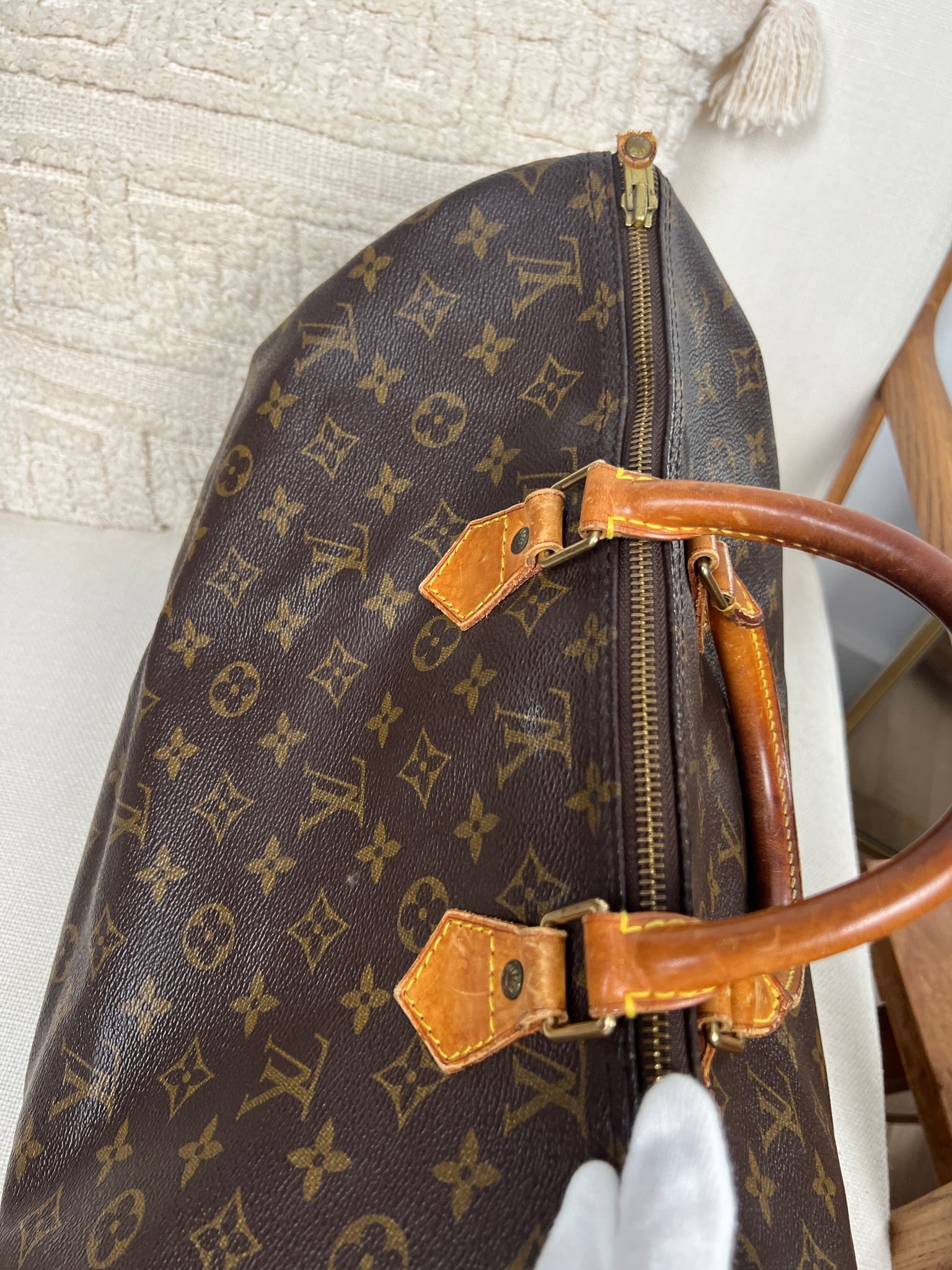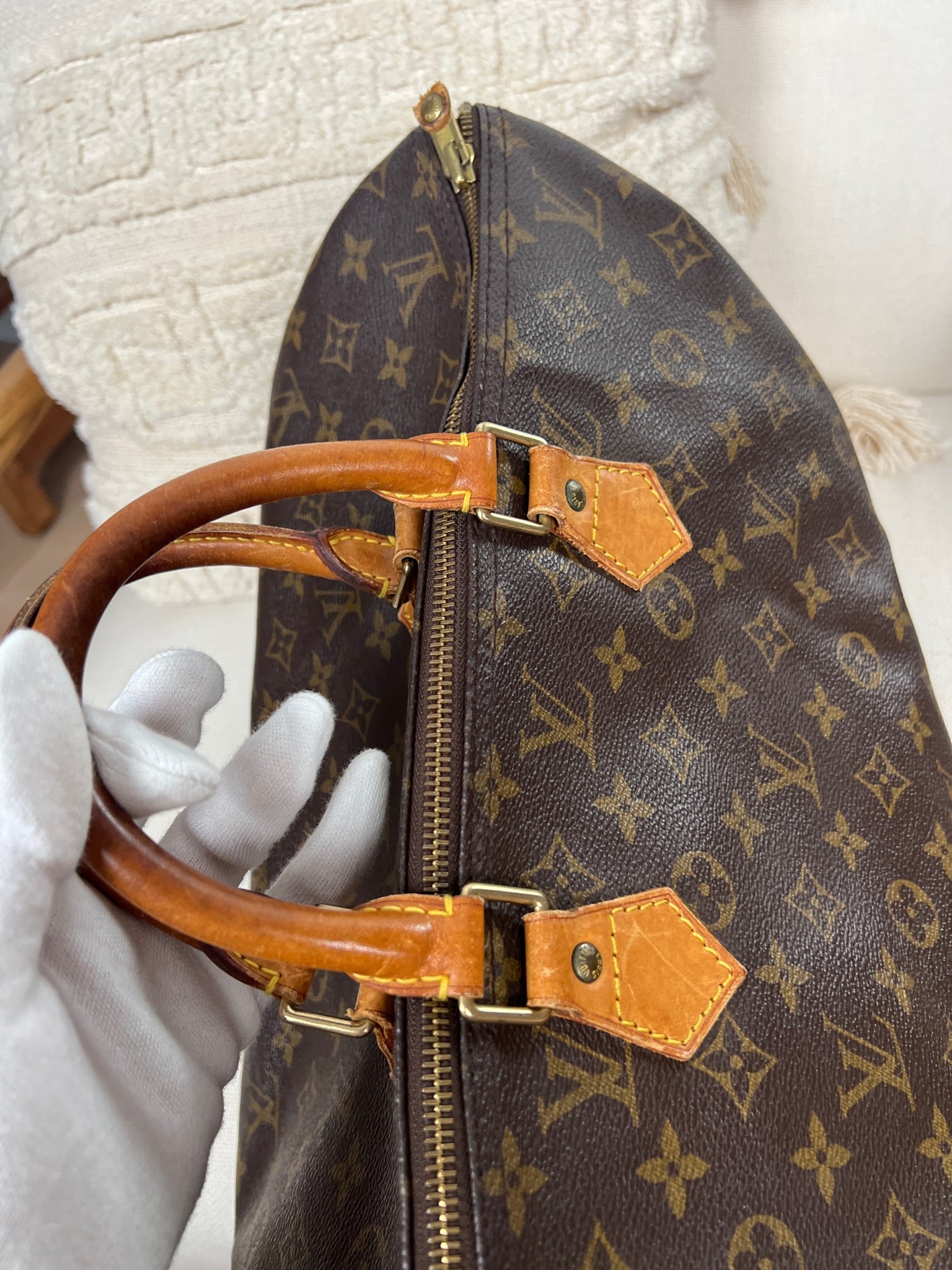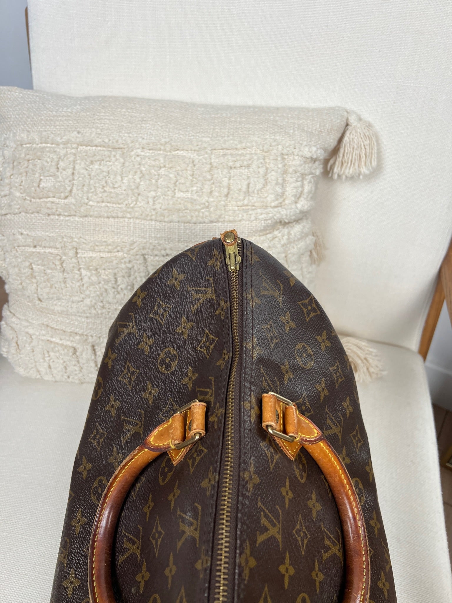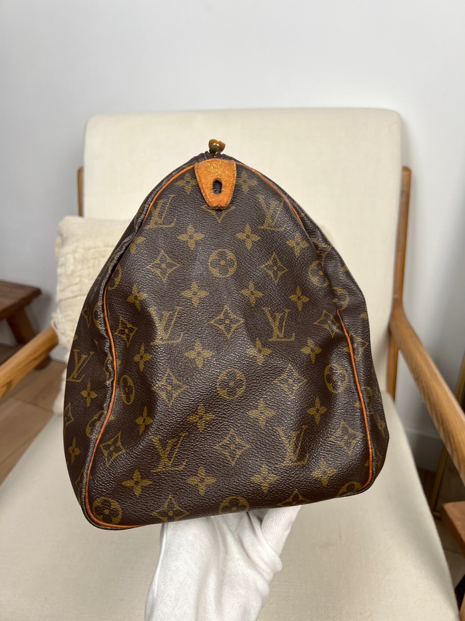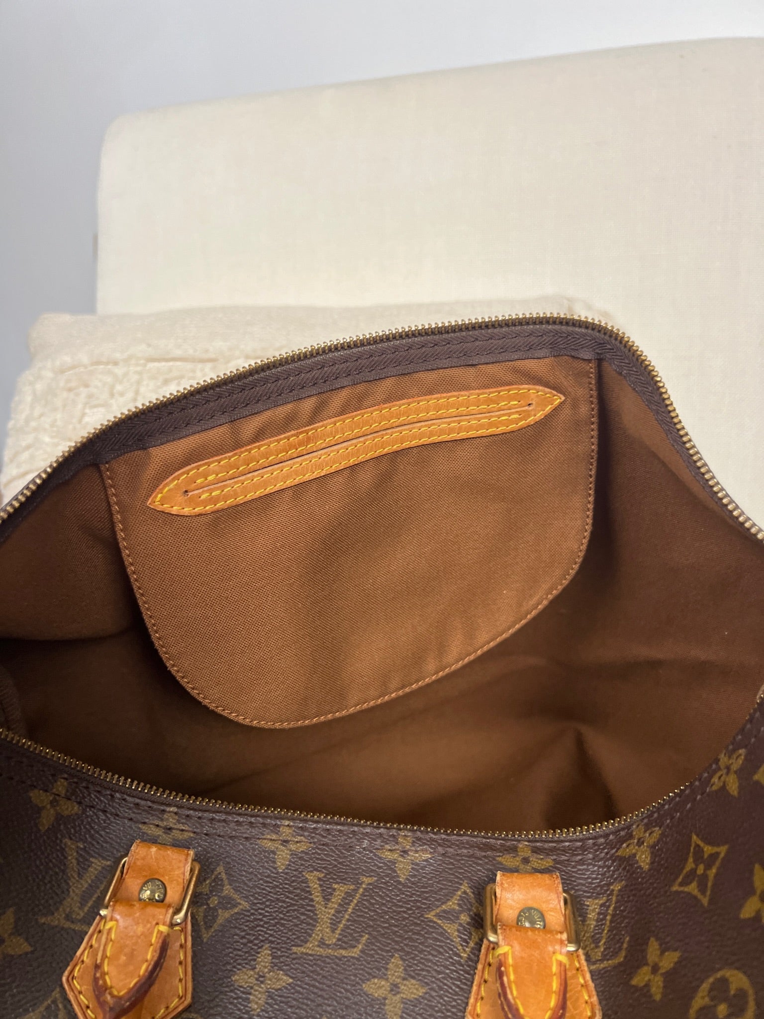 This Louis Vuitton Speedy 40 is in lightly used. The canvas is in good condition. The corners are in good condition. The handles have some trace of wear. The zipper leather part is missing. The interior is in good condition.