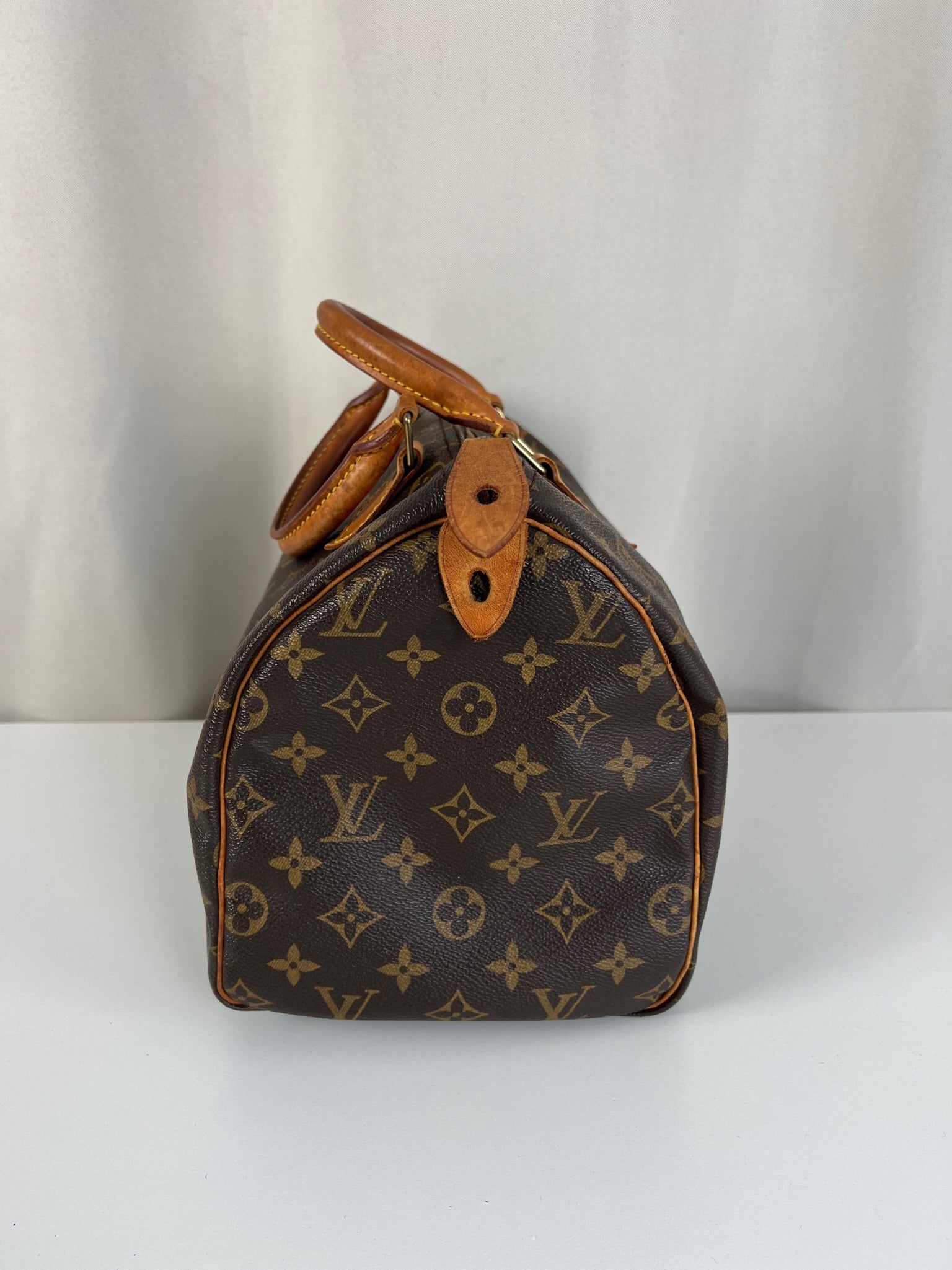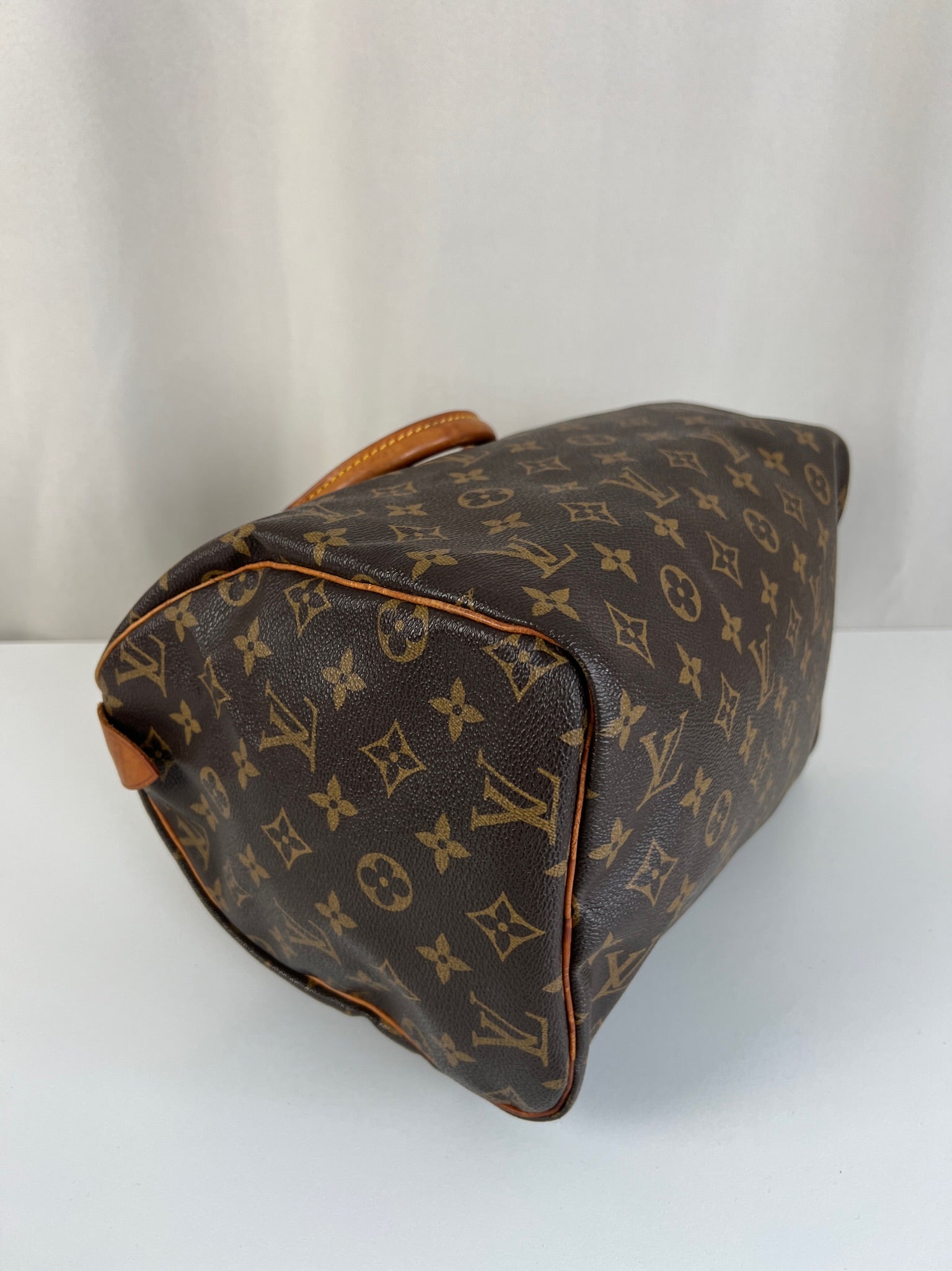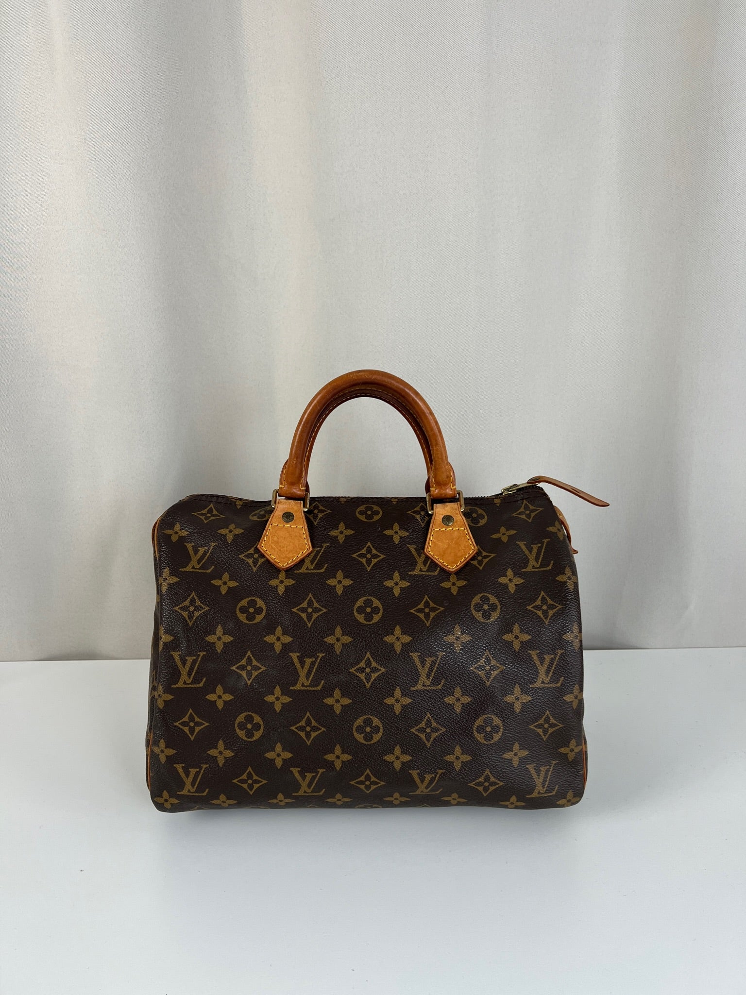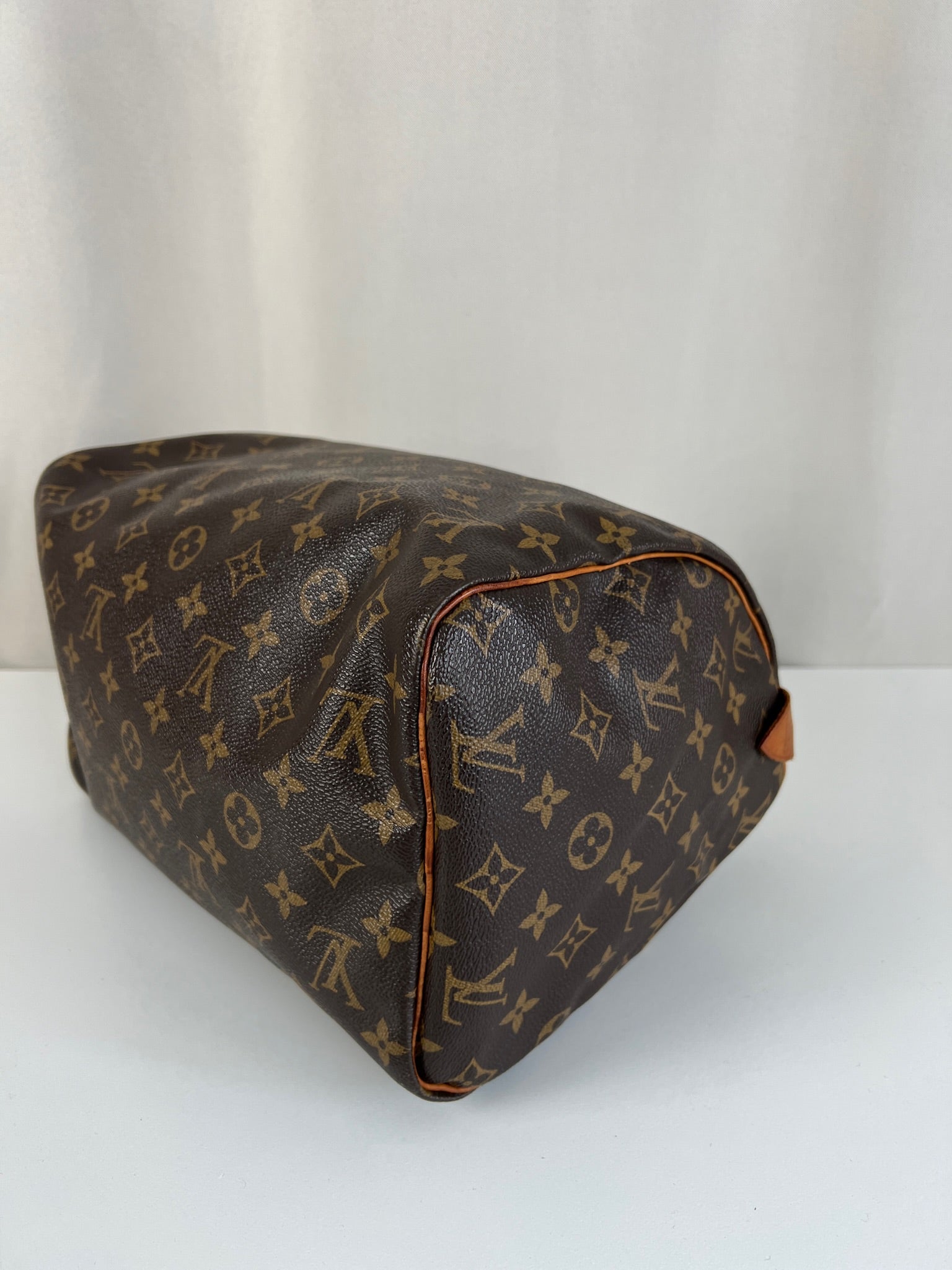 This Louis Vuitton Speedy is in good condition. The canvas is in very good condition. The leather part and the corner are in good condition, tanned. The handles are tanned and in good condition. The interior is in good condition but have little stains inside.