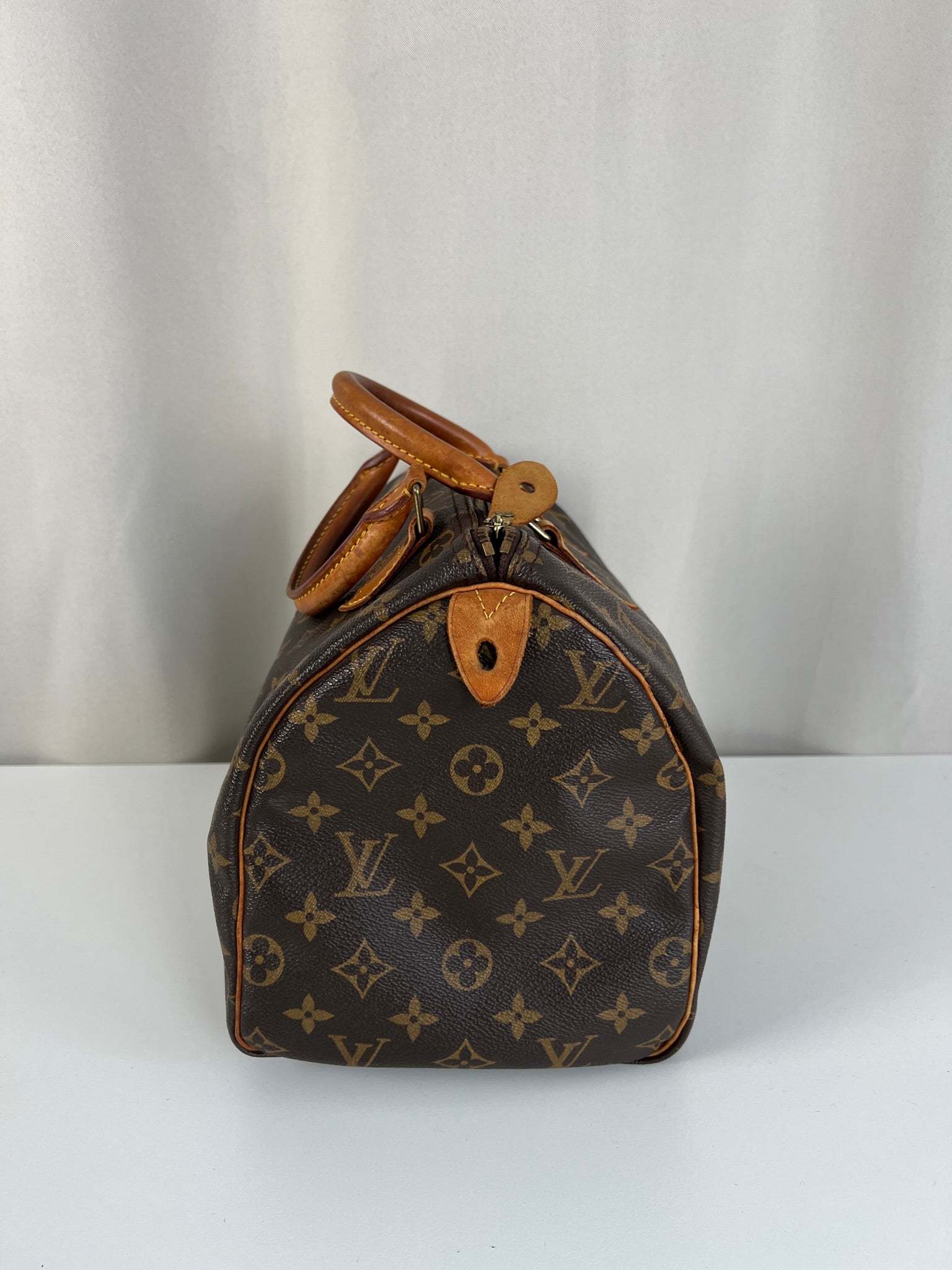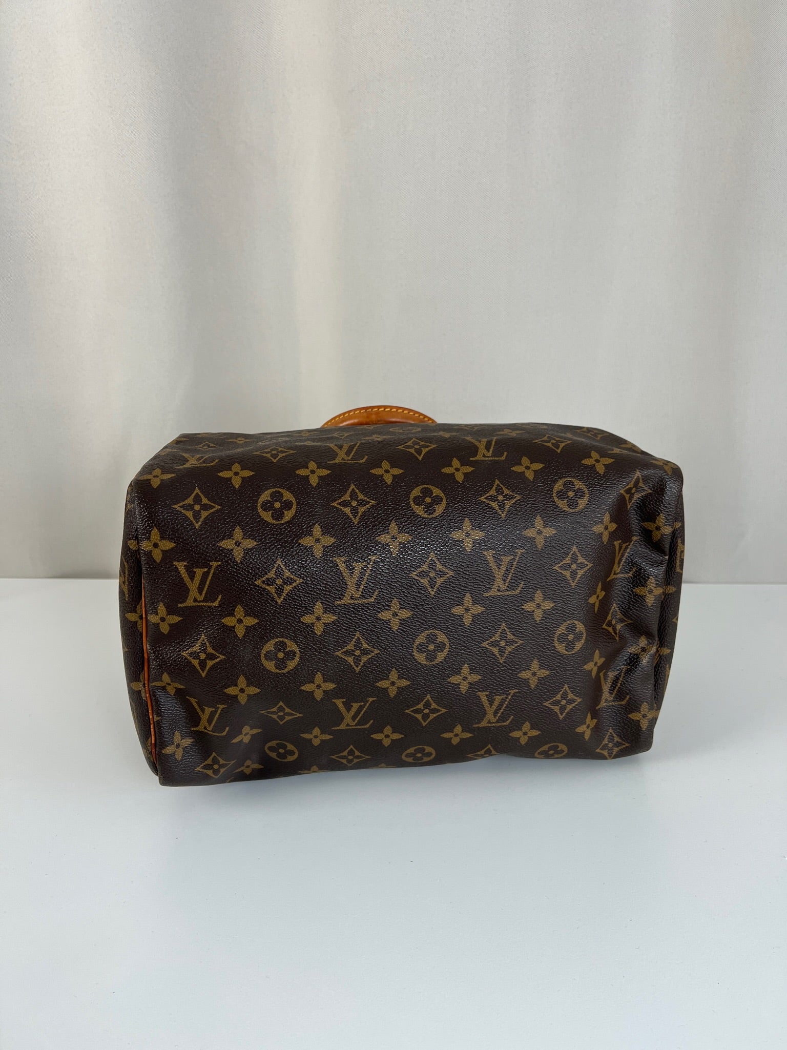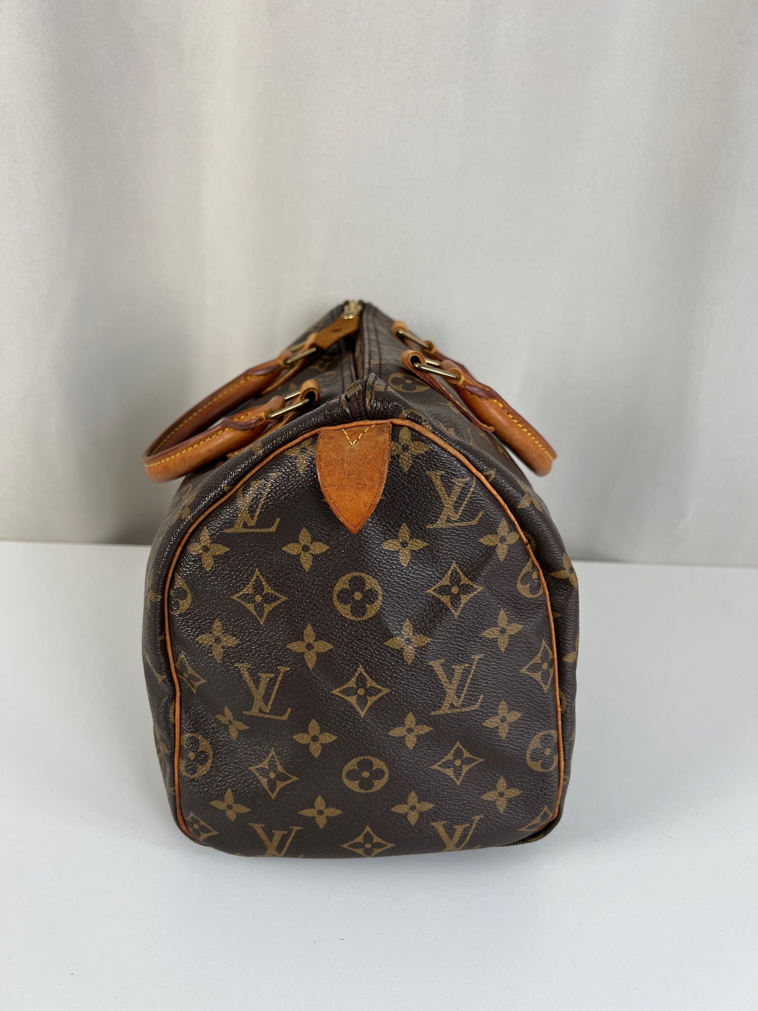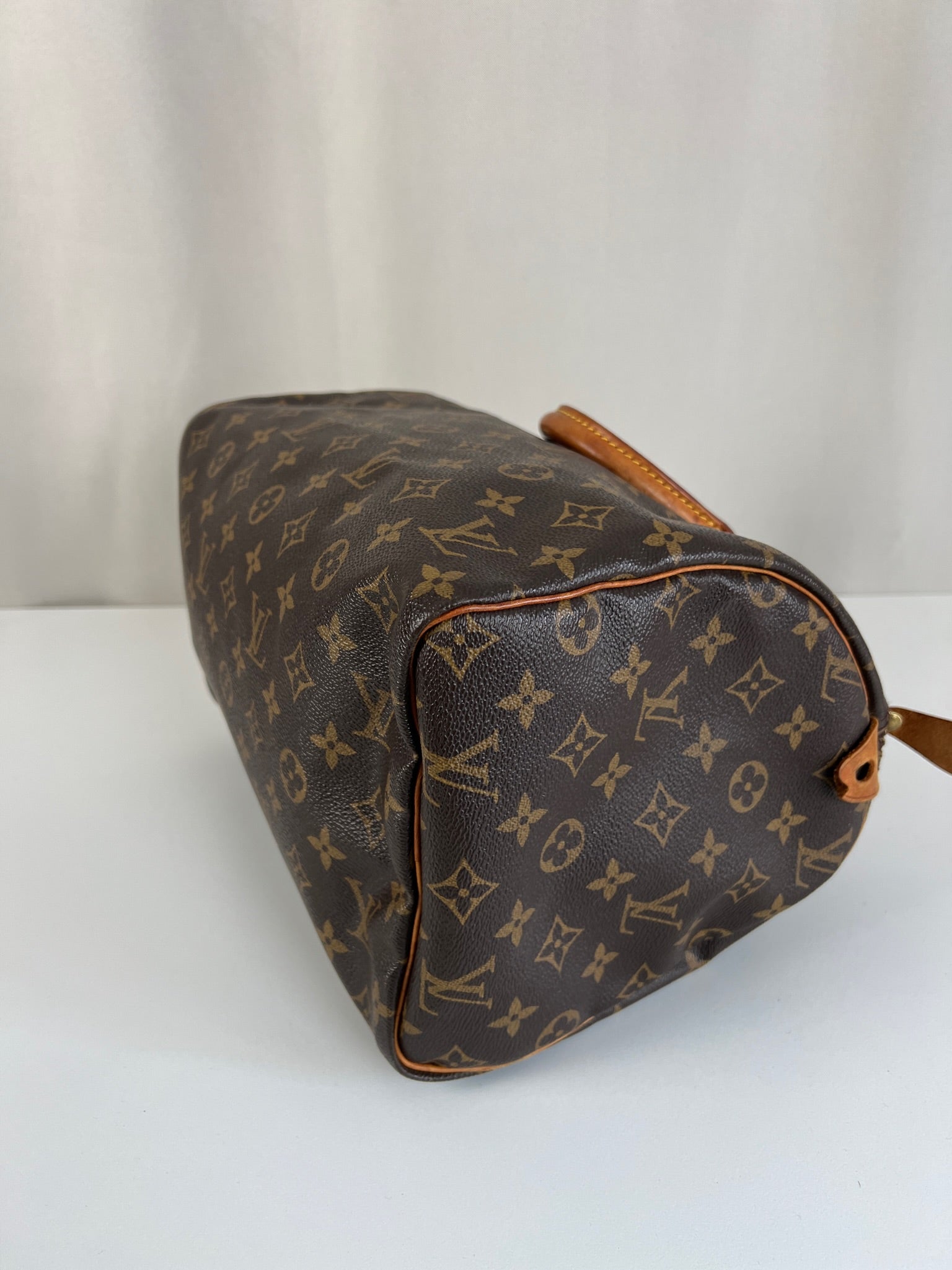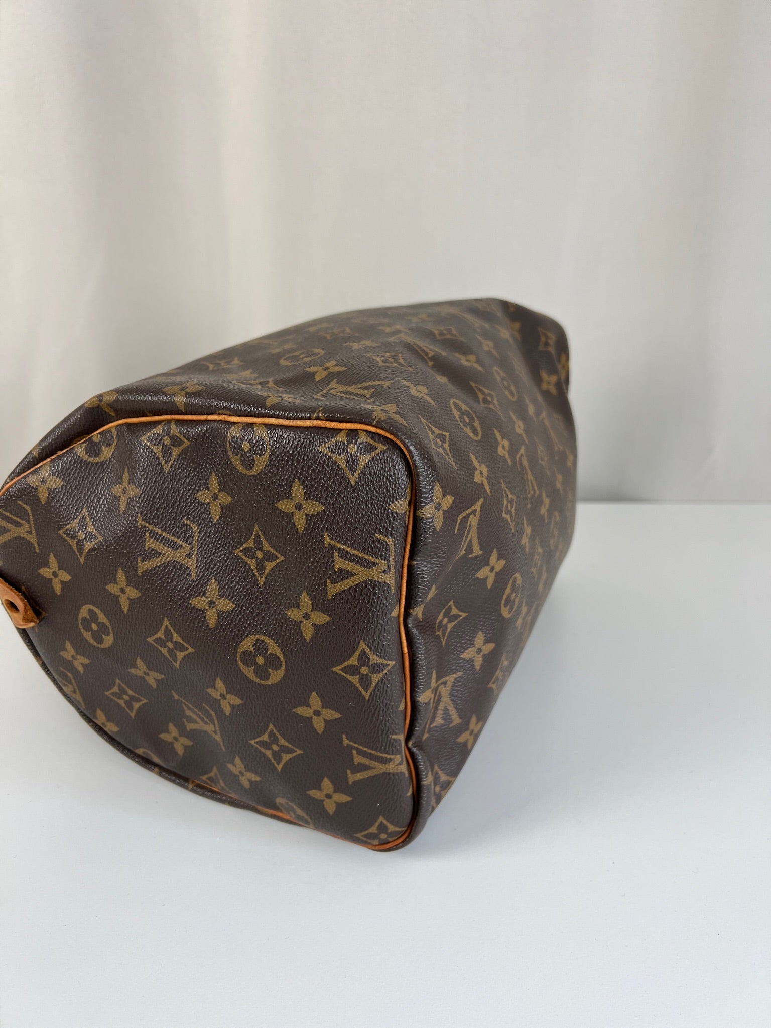 This Louis Vuitton Speedy is in good condition. The canvas is in very good condition. The leather part and the corner are in good condition, tanned. The handles are tanned and in good condition. The interior is in good condition but have little stains inside.