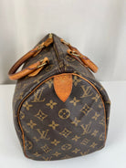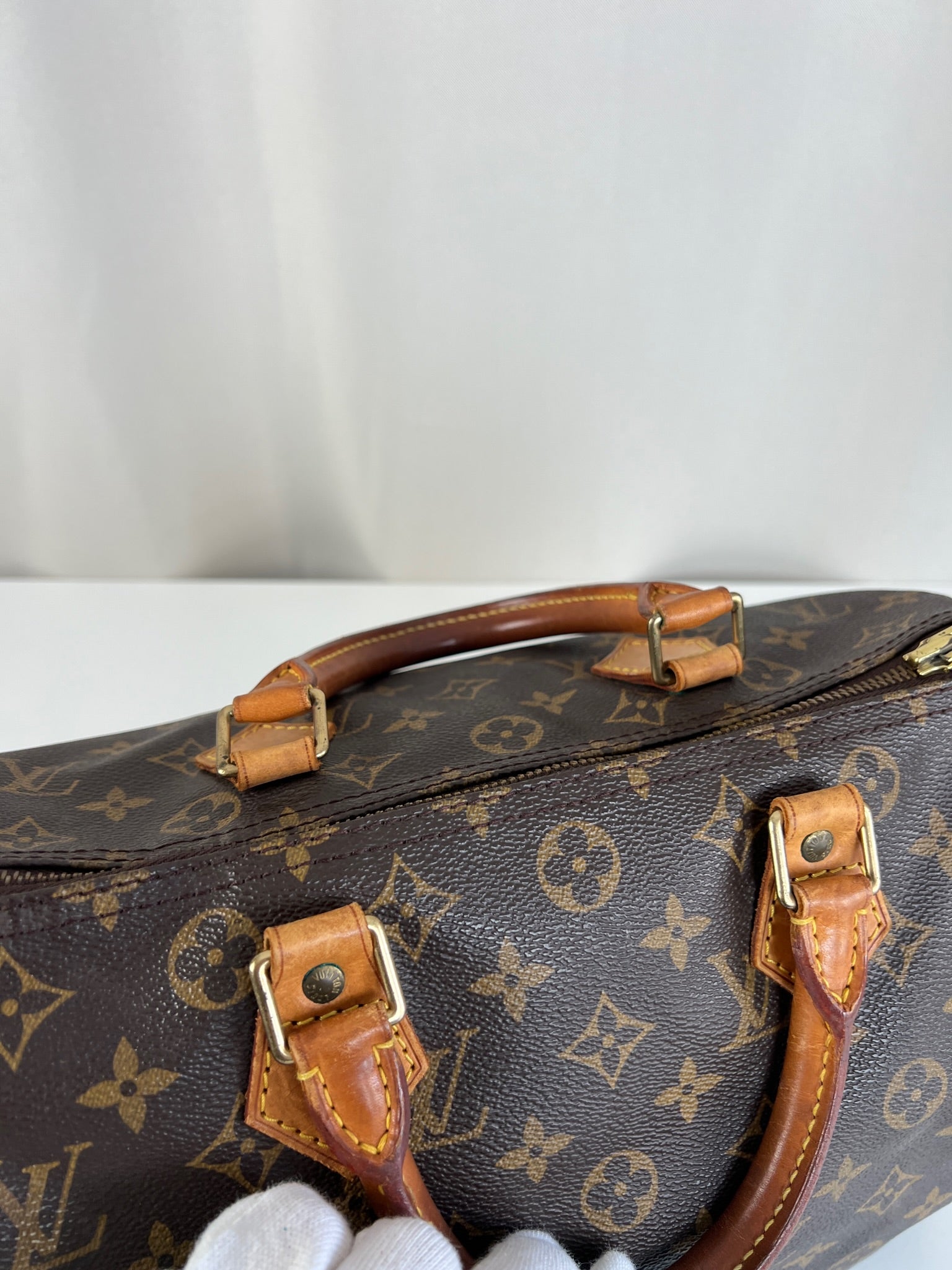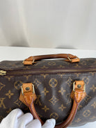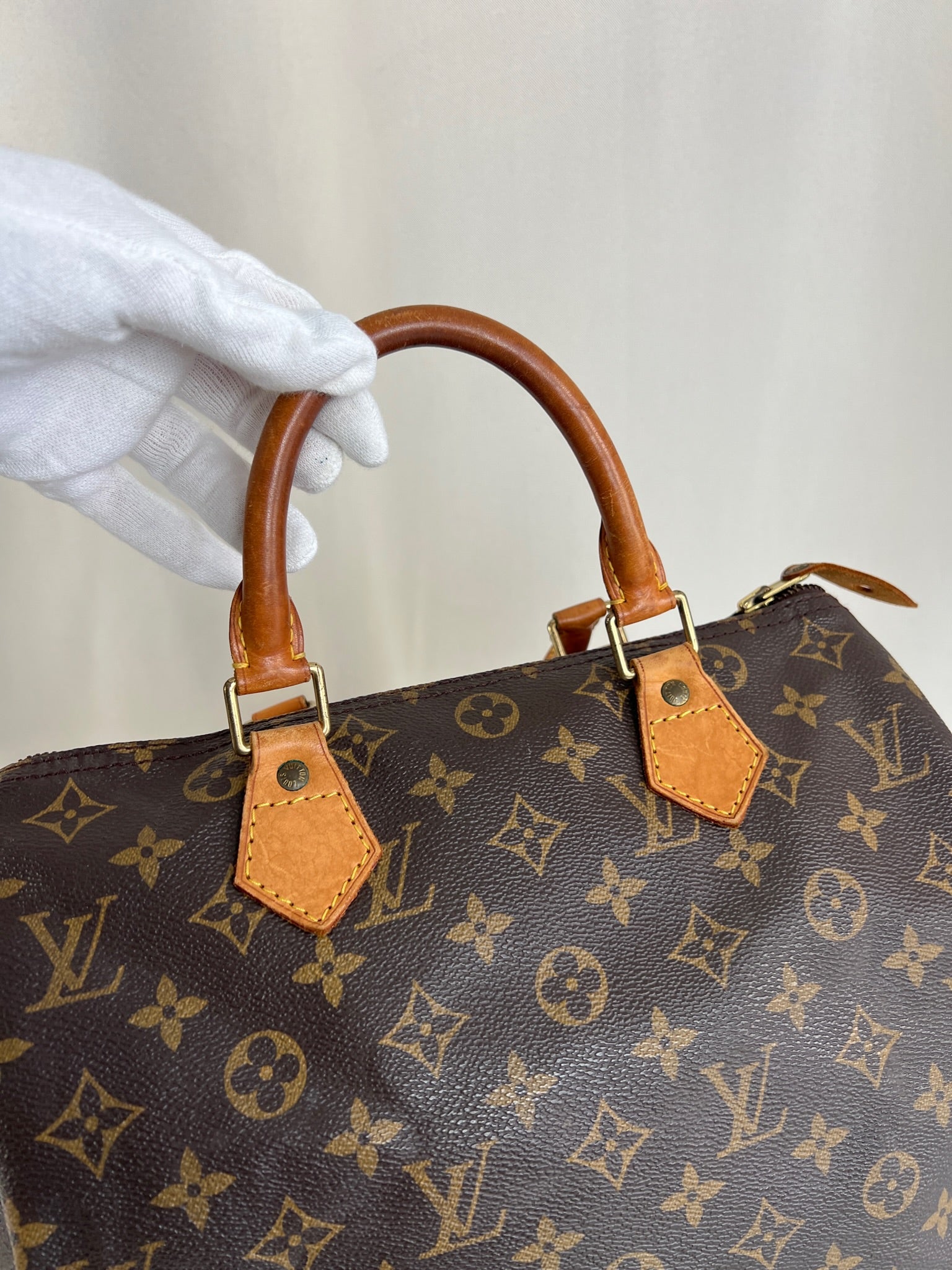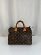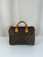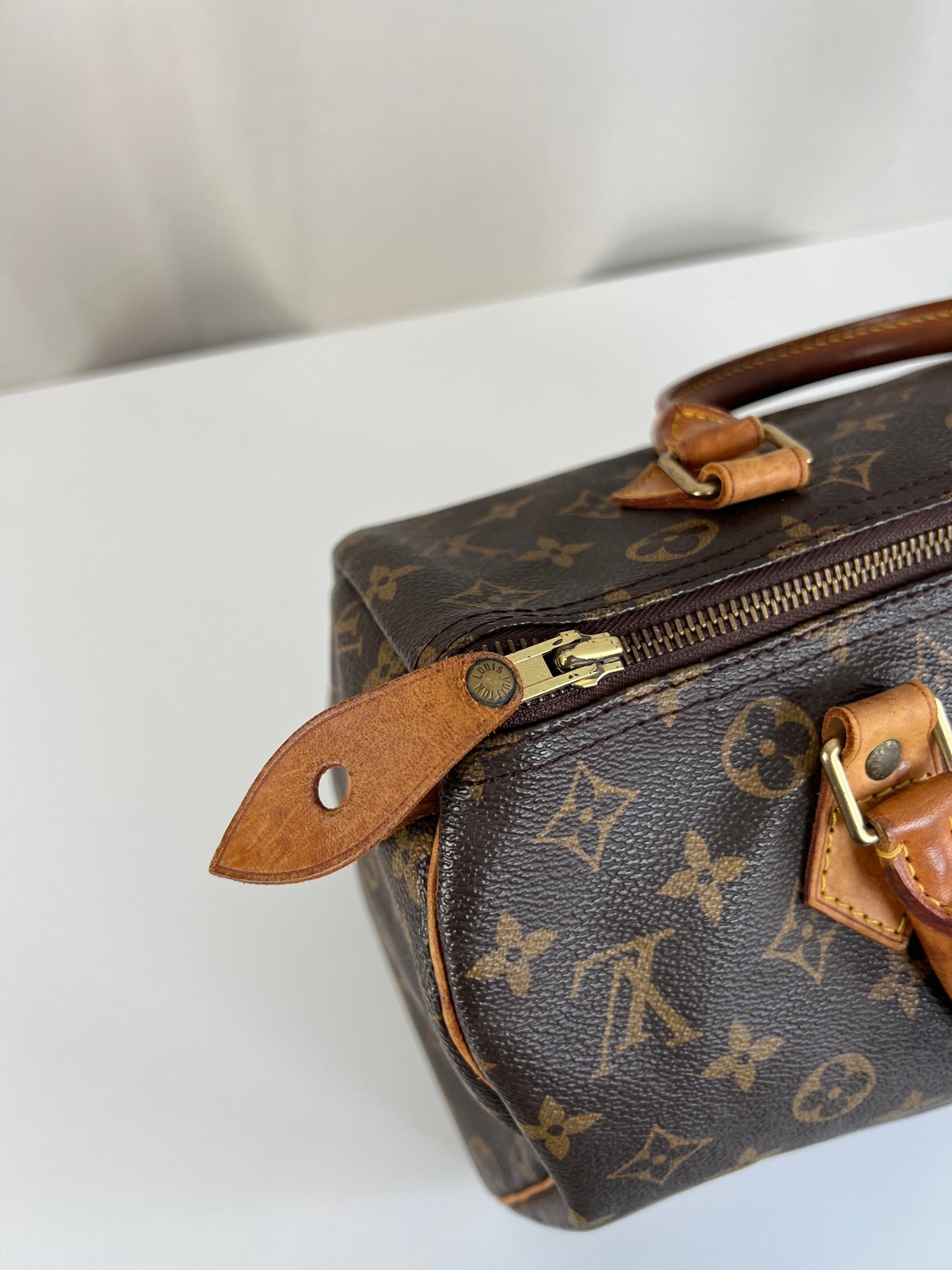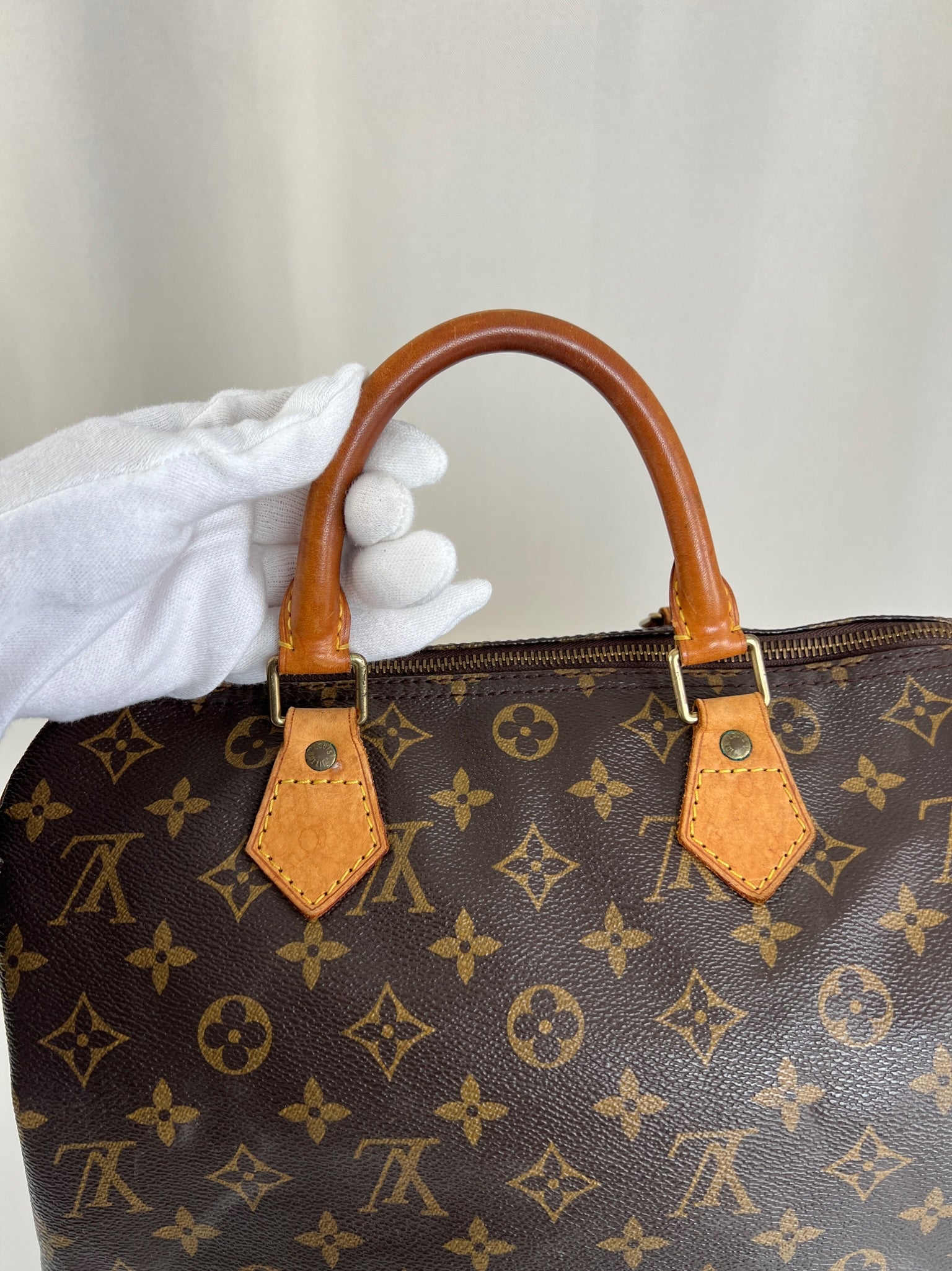 This Louis Vuitton Speedy is in good condition. The canvas is in very good condition. The leather part and the corner are in good condition, tanned. The handles are tanned and in good condition. The interior is in good condition but have little stains inside.