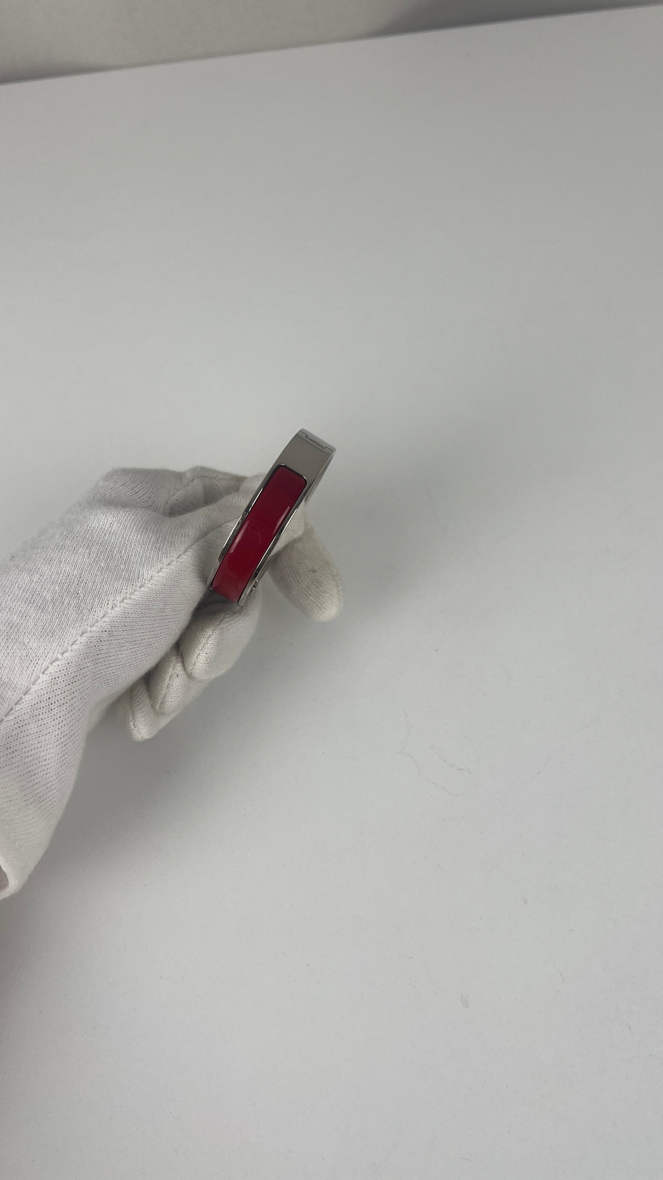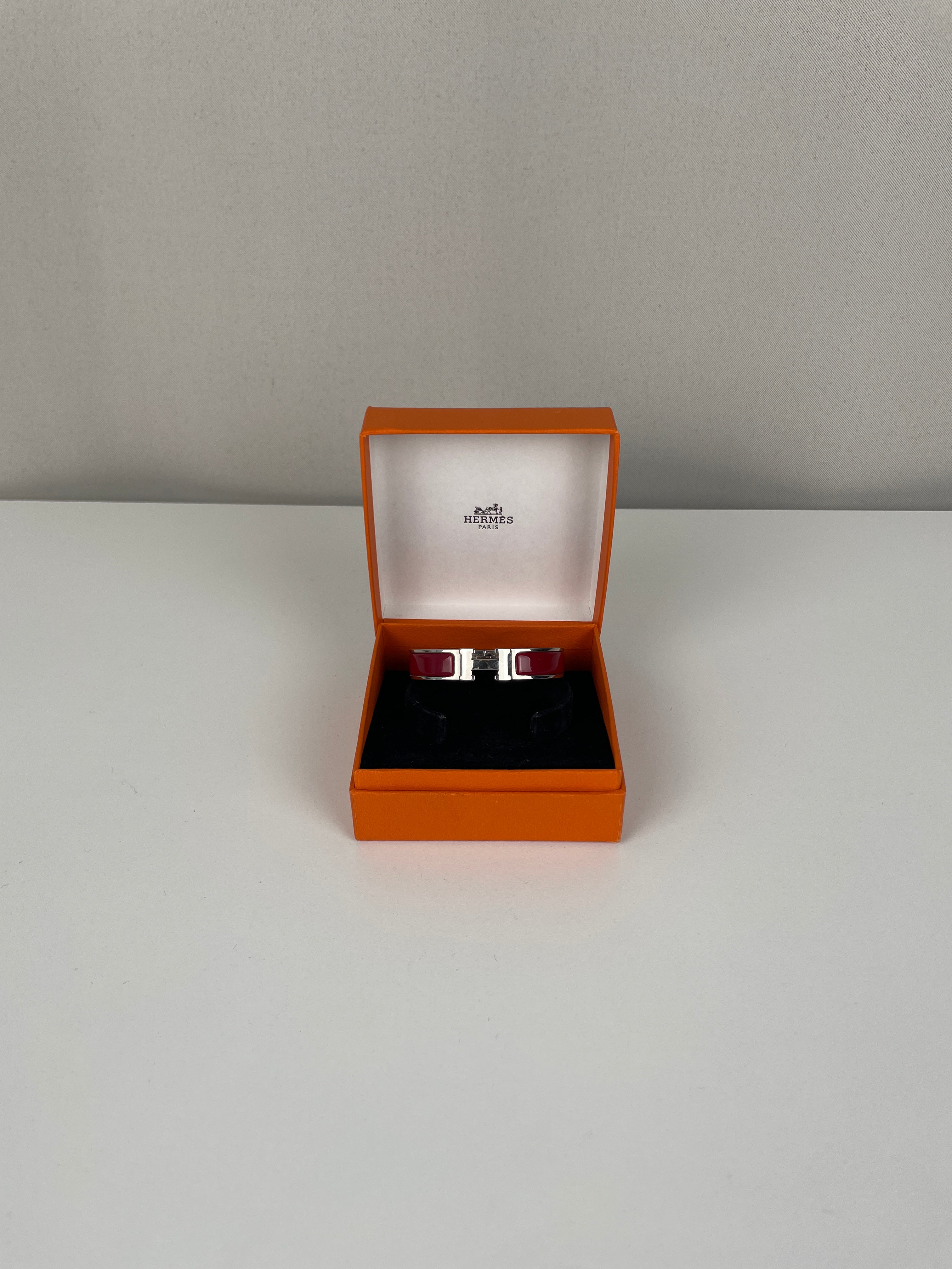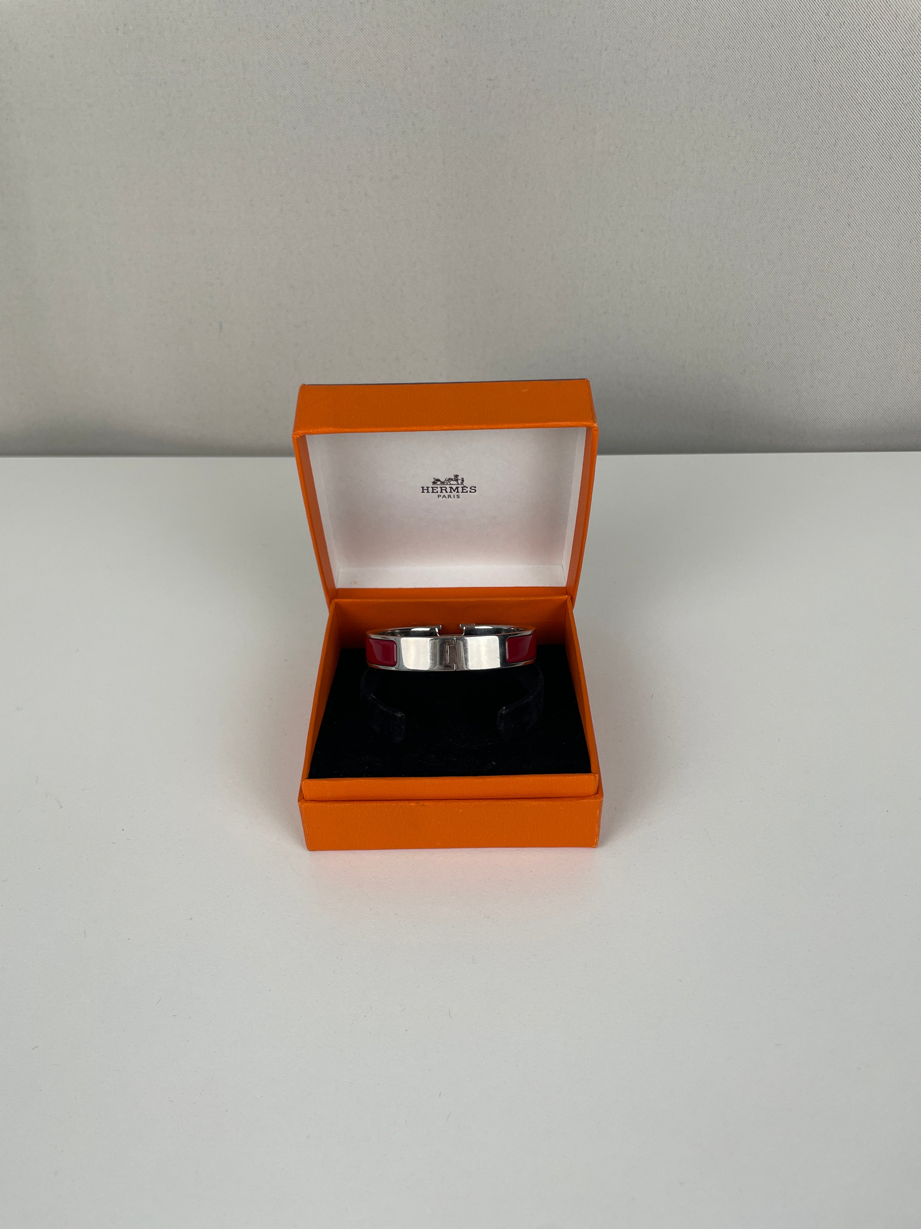The Click H is one of Hermès' most iconic and contemporary accessory designs. This red and silver edition showcases the maison's exceptional craftsmanship and modern sophistication. A distinctive piece that embodies Hermès' heritage of luxury accessories and represents the perfect blend of functionality with elegant simplicity in the signature H design.