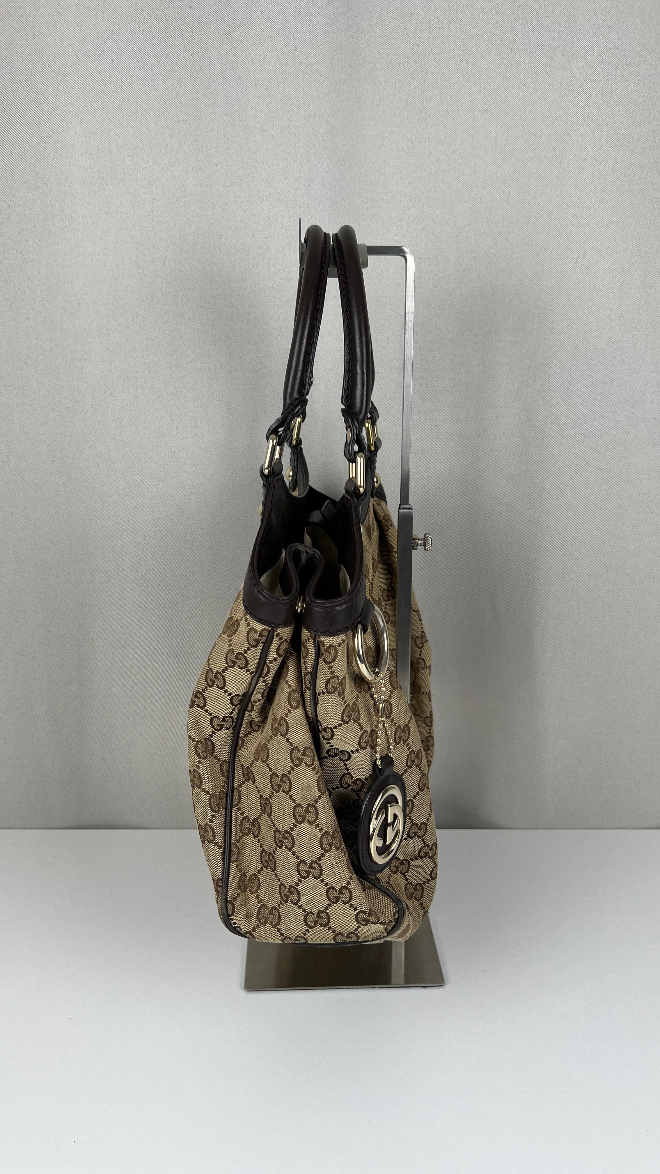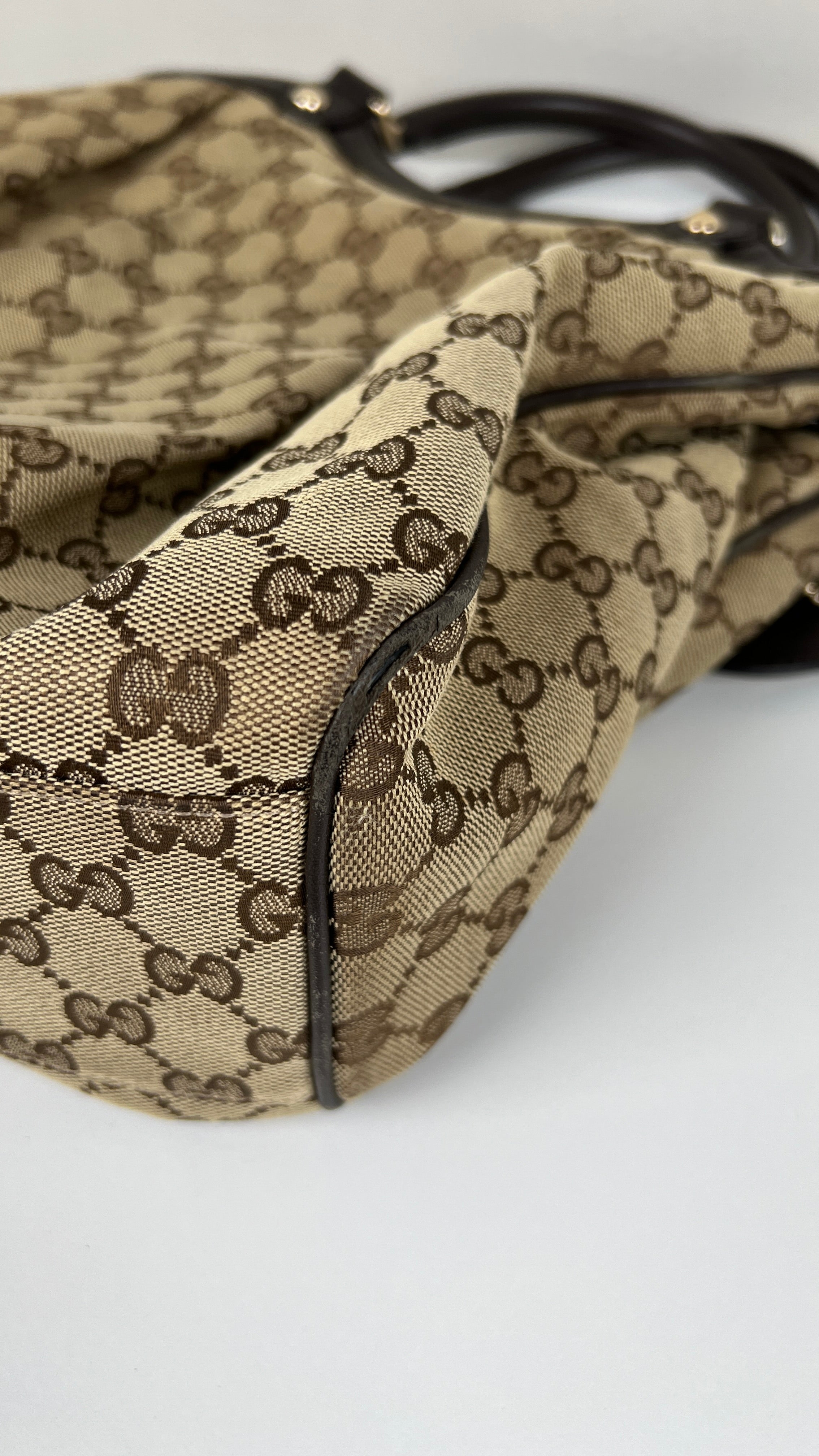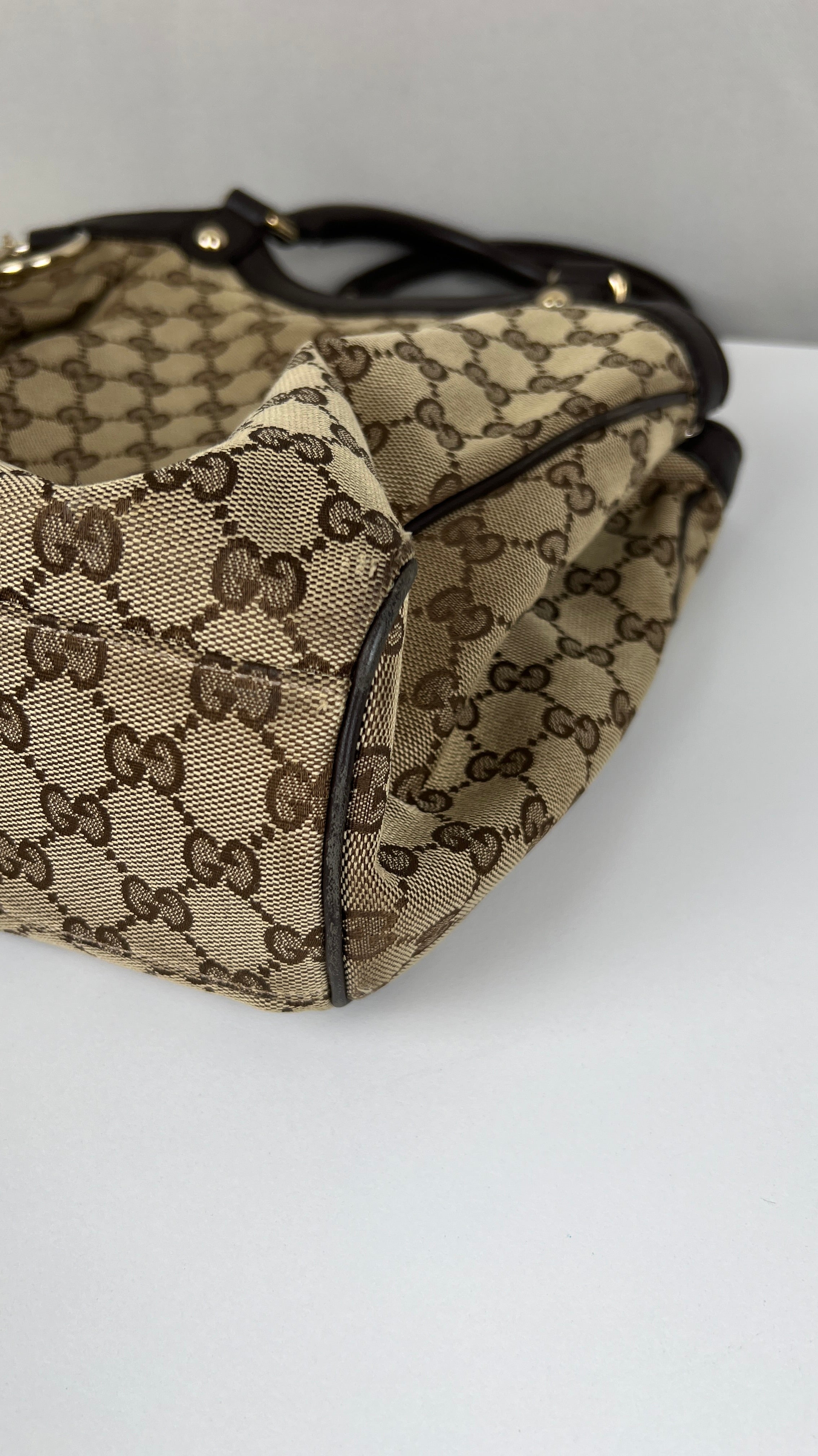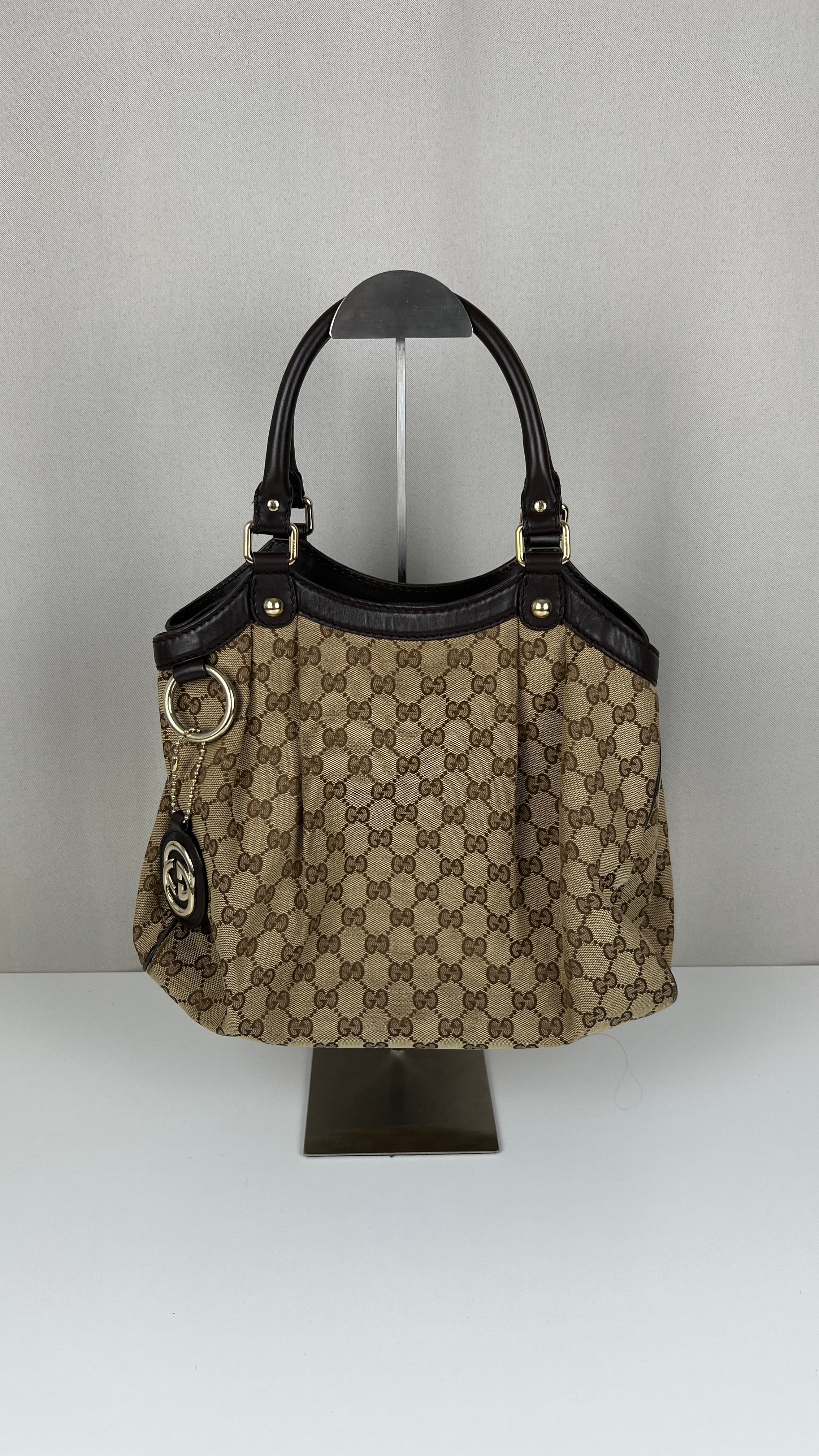 This Gucci Bag Canvas GG is in good condition. There are some little stains on the canvas corners. The corners are used and rubbed. The handles are in very good condition. The interior is in very good condition with only one little stain.