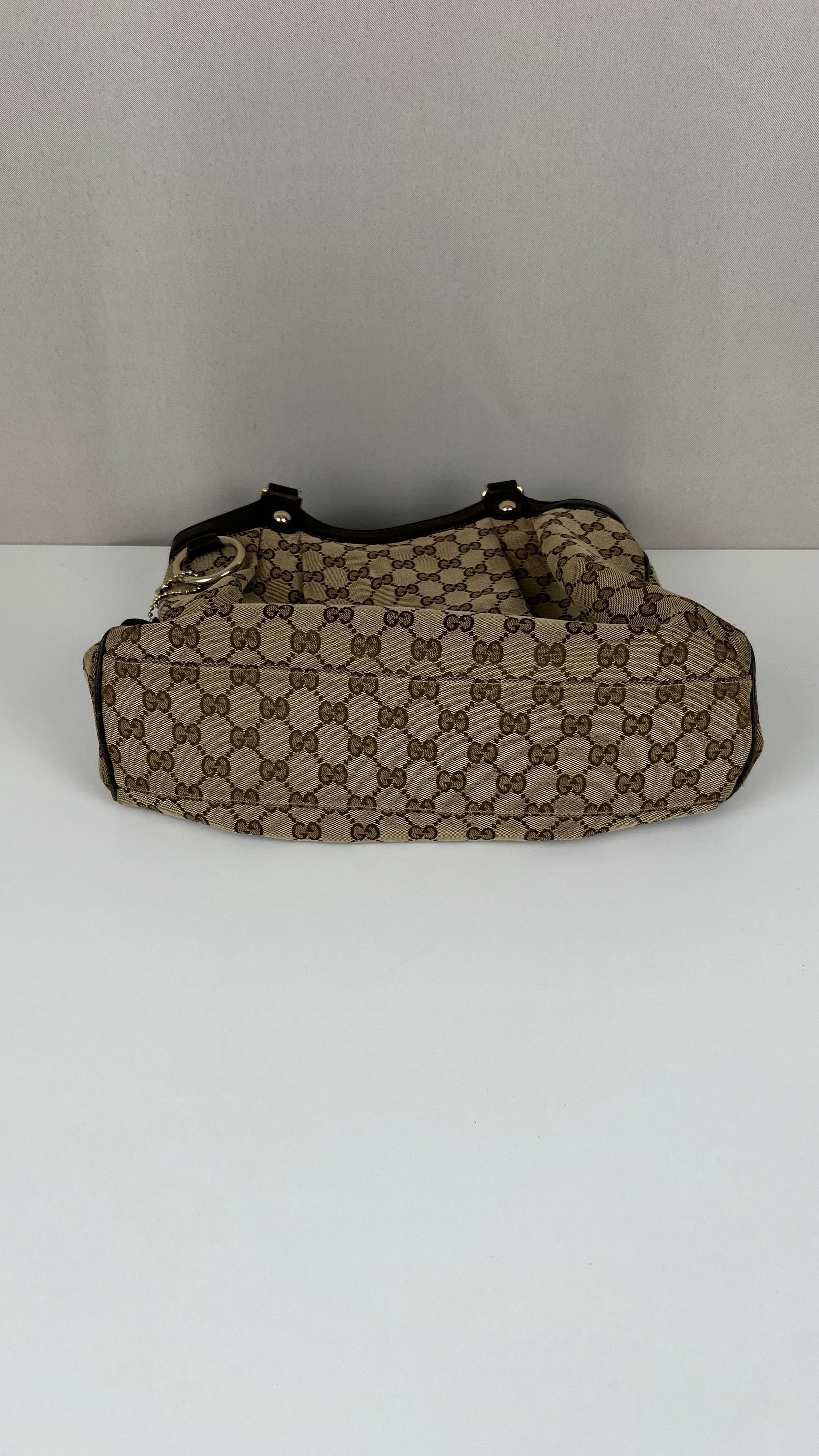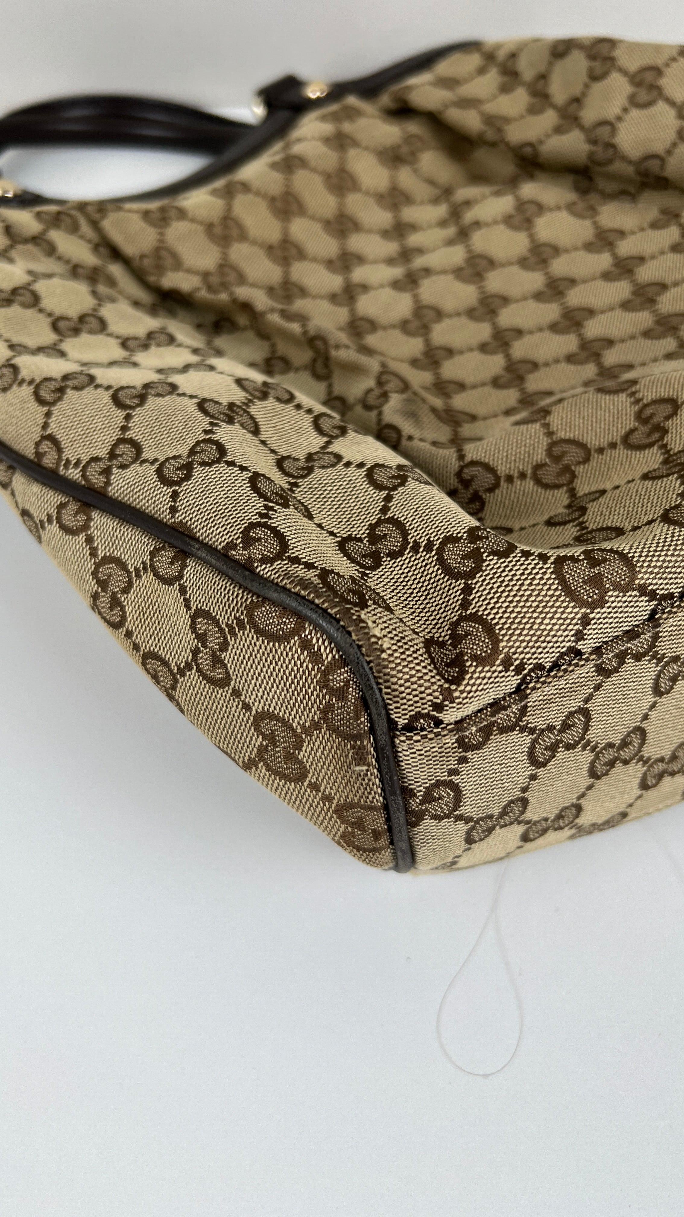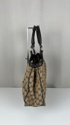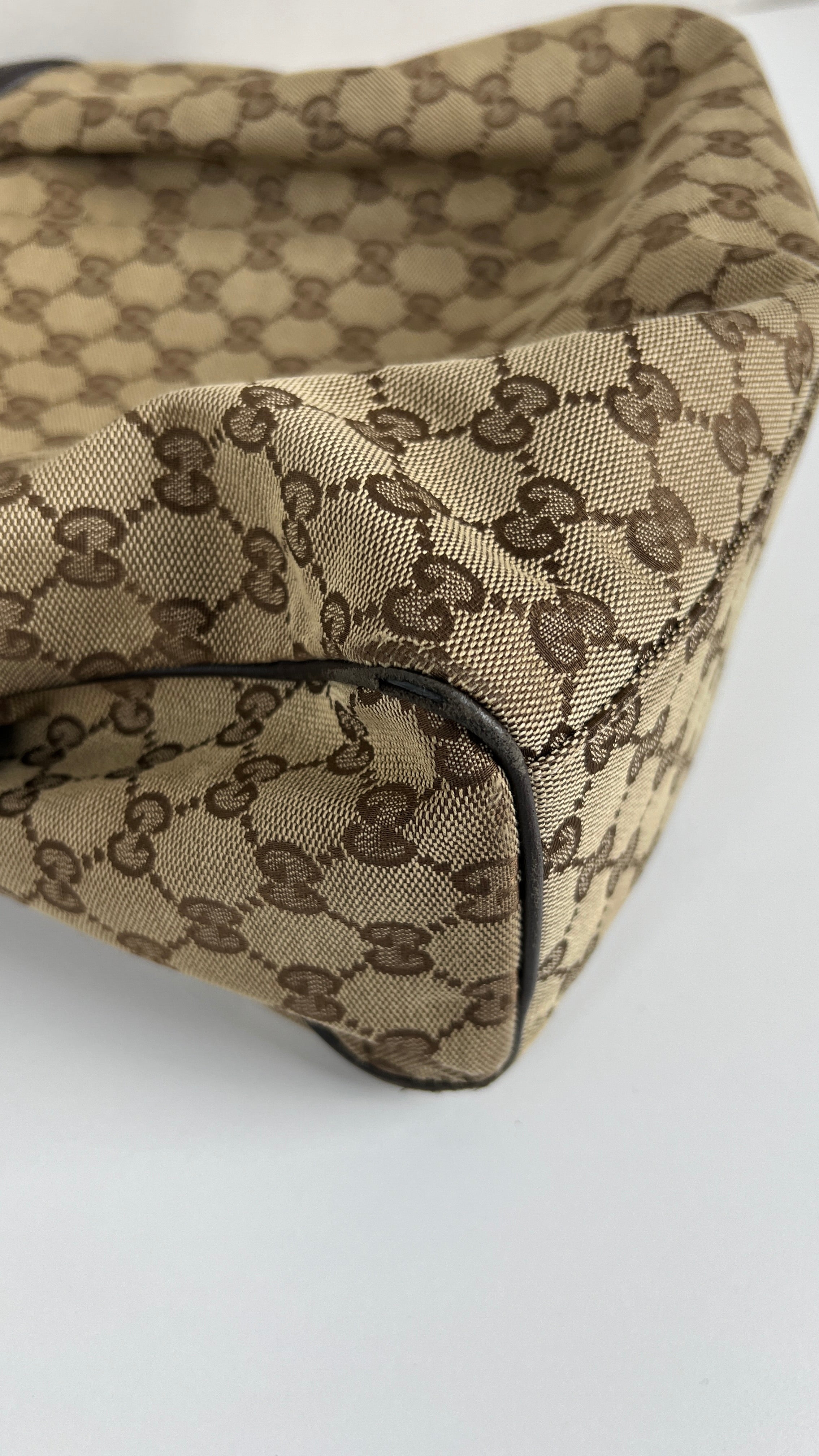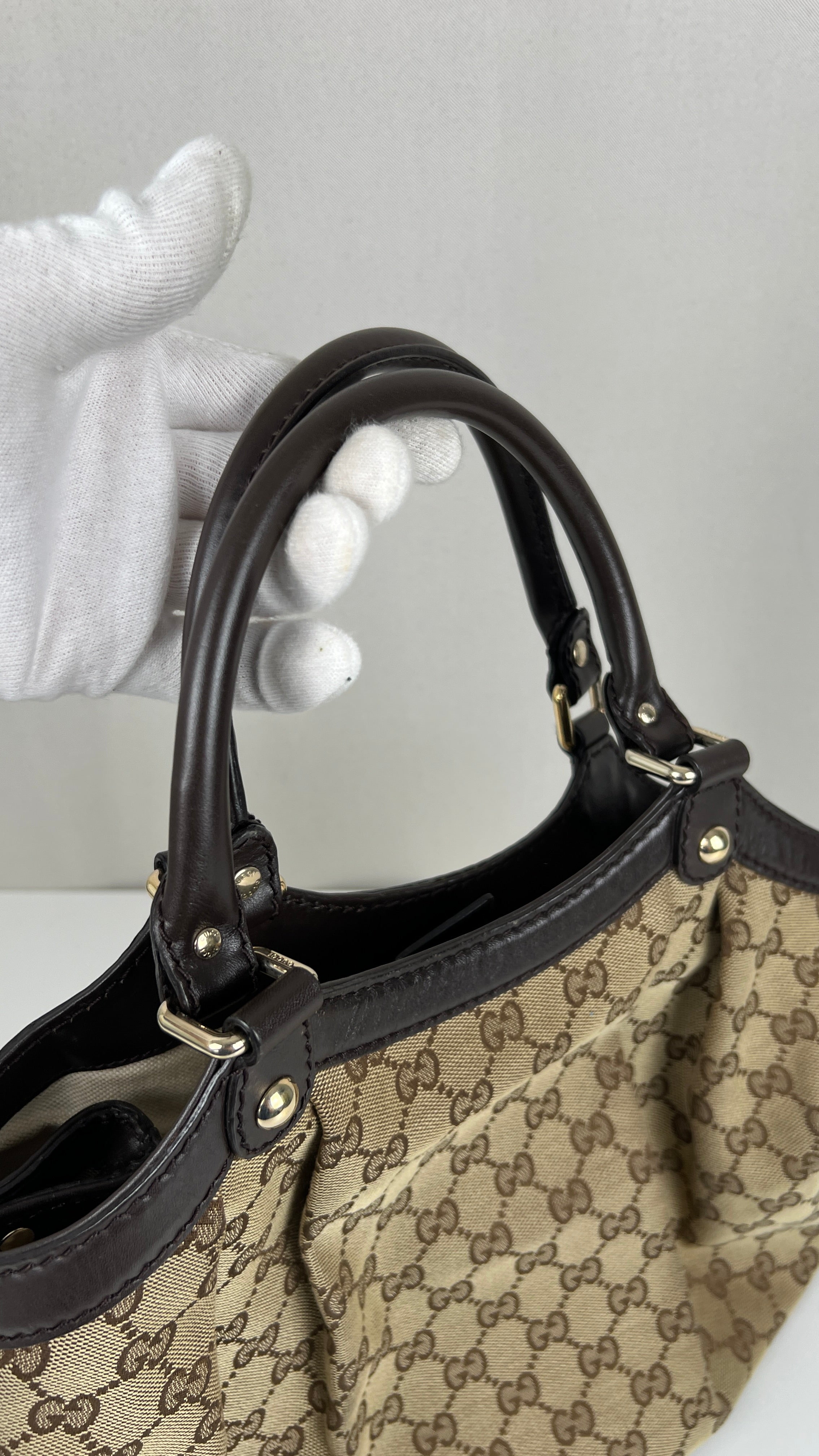 This Gucci Bag Canvas GG is in good condition. There are some little stains on the canvas corners. The corners are used and rubbed. The handles are in very good condition. The interior is in very good condition with only one little stain.
