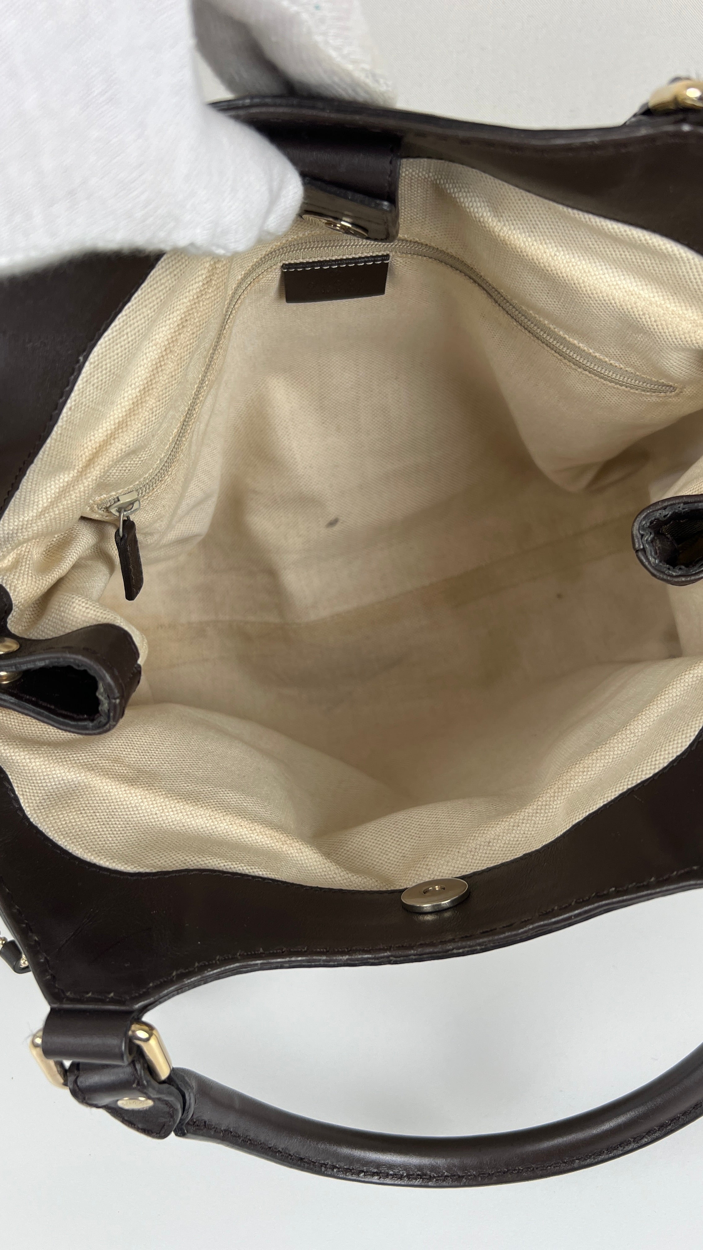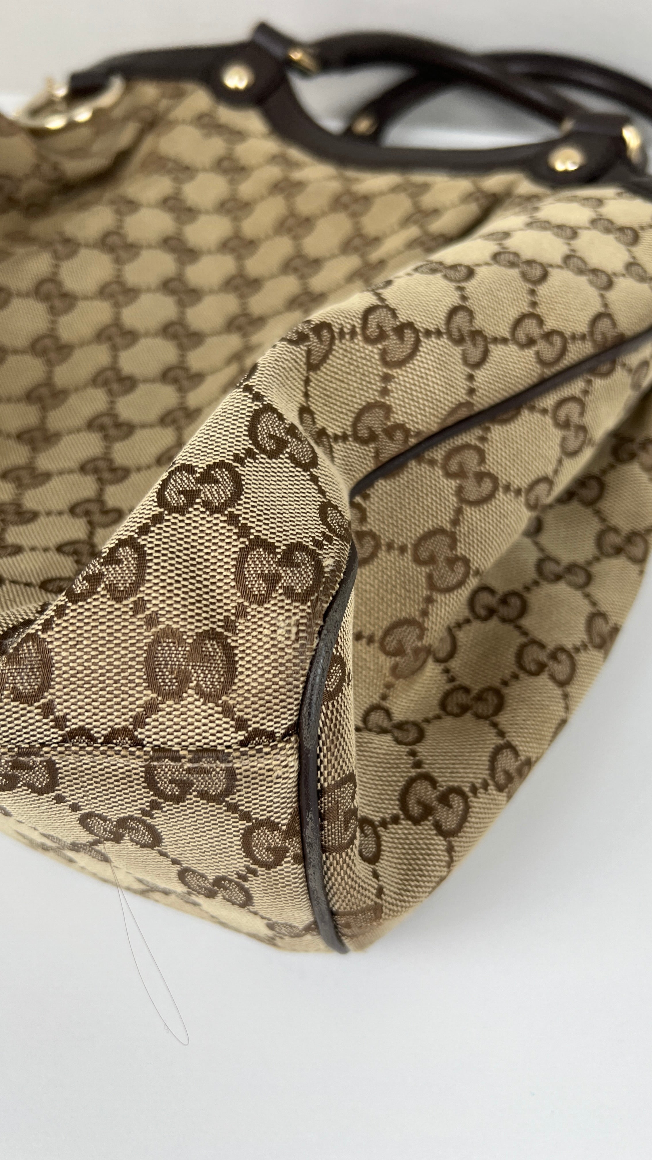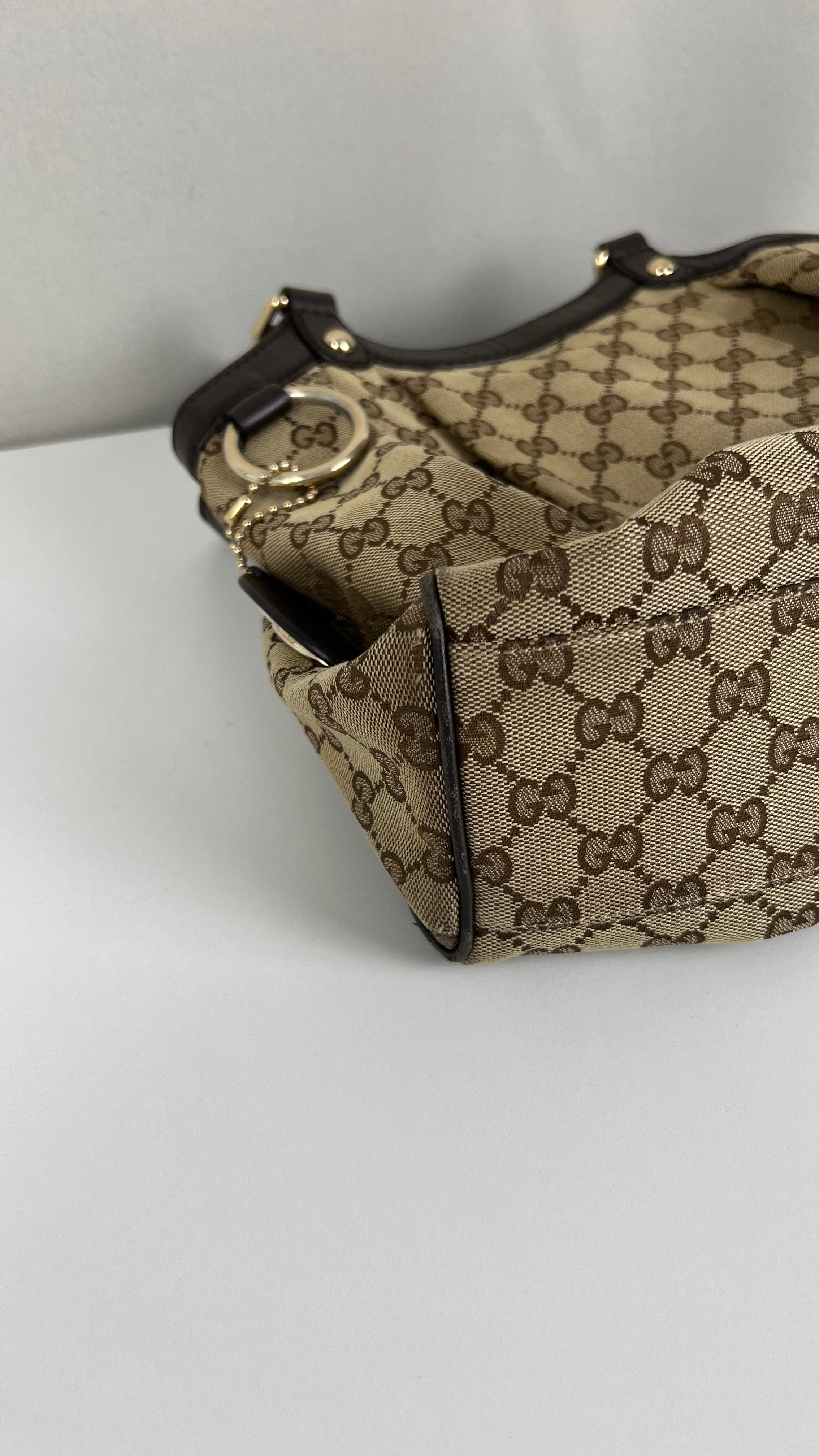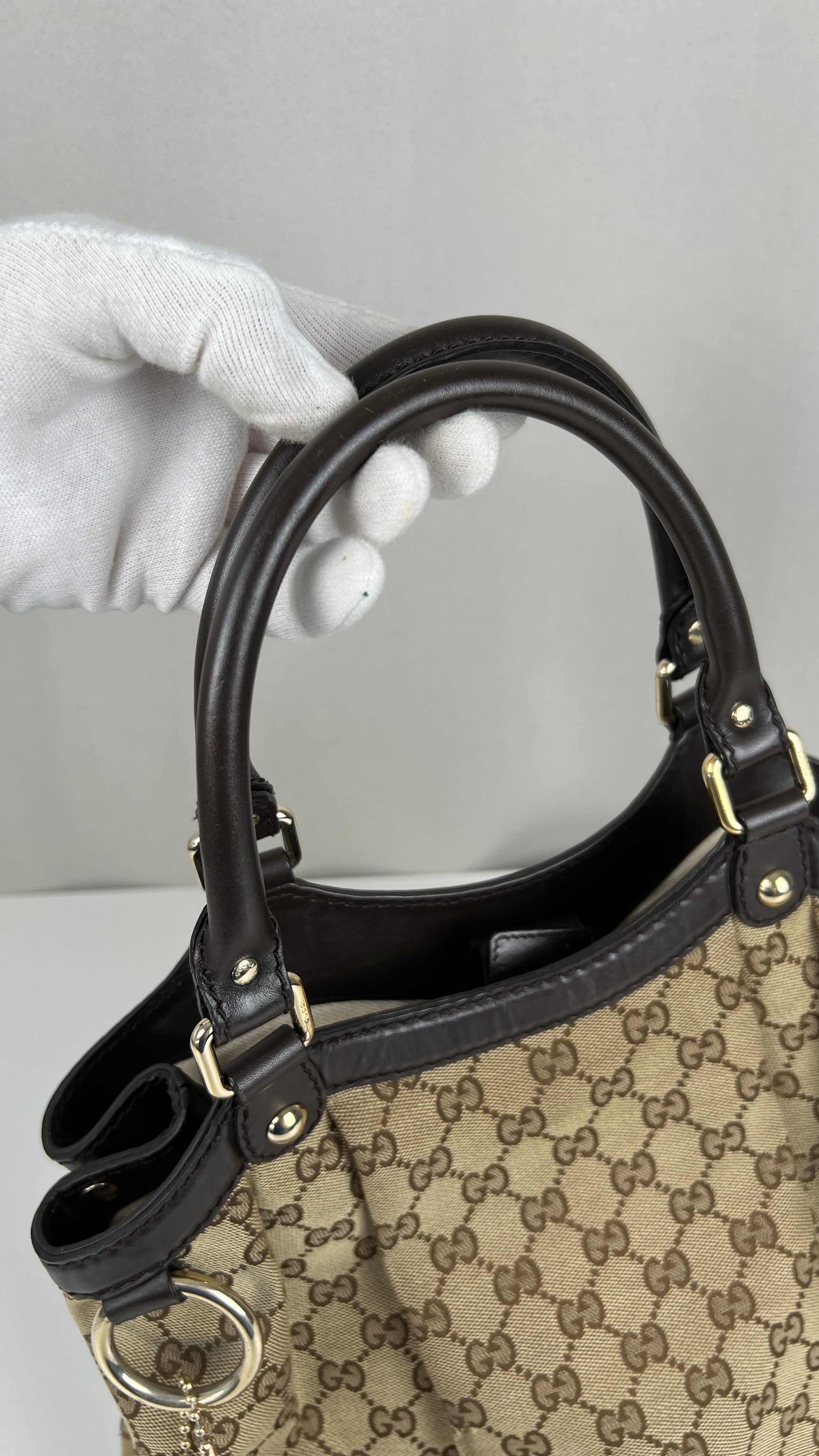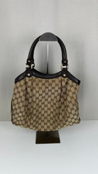 This Gucci Bag Canvas GG is in good condition. There are some little stains on the canvas corners. The corners are used and rubbed. The handles are in very good condition. The interior is in very good condition with only one little stain.