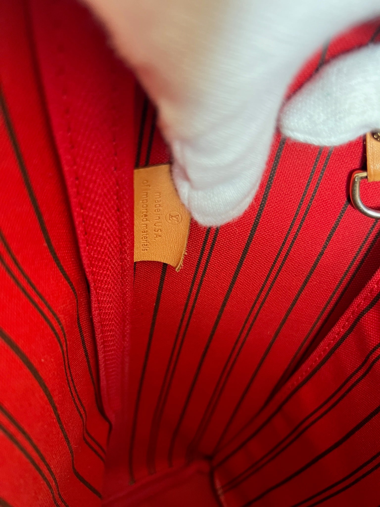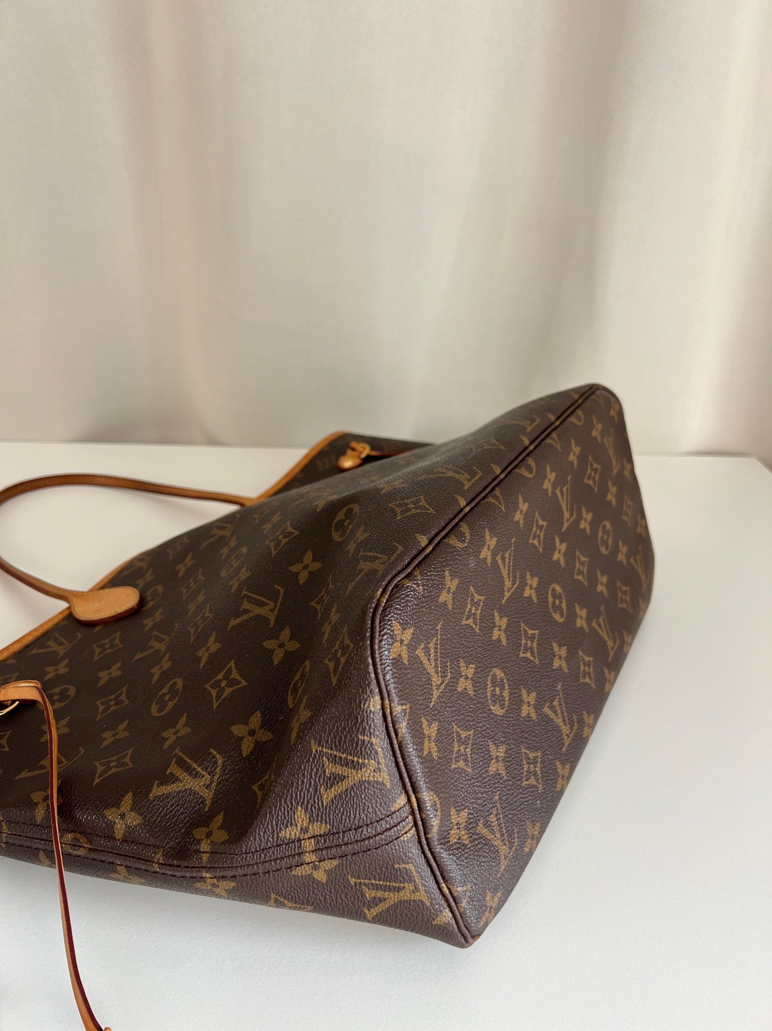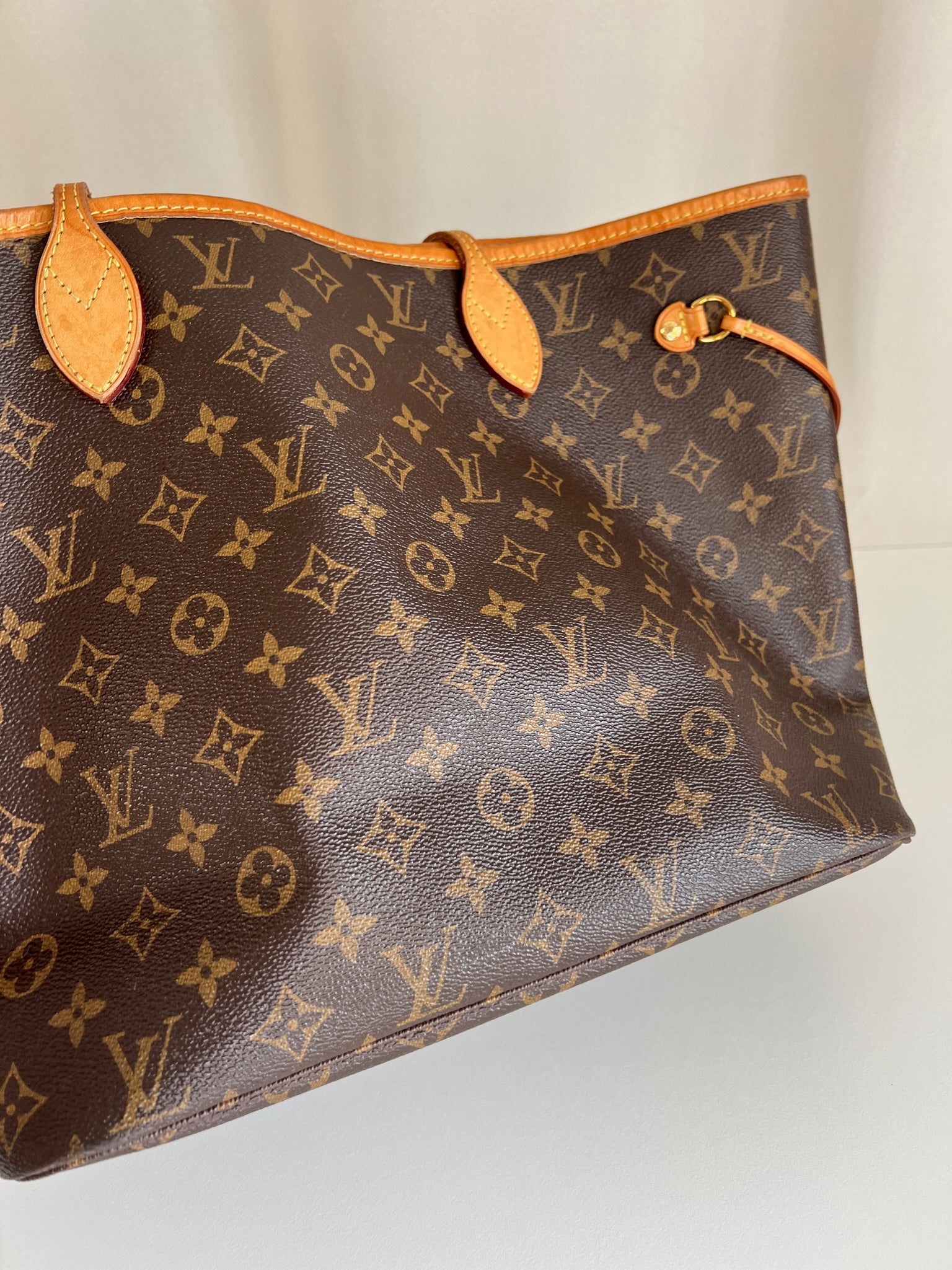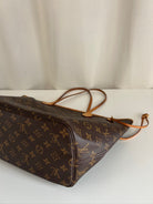 This Louis Vuitton Neverfull MM Monogram bag is in very good condition. The leather is tanned but still pretty light. The canva is in very good condition as well. The handles are in good condition but are darker due to use on top. The interior is in very good condition. The hardware is a little used. It is a "made in USA". It comes with its dustbag.