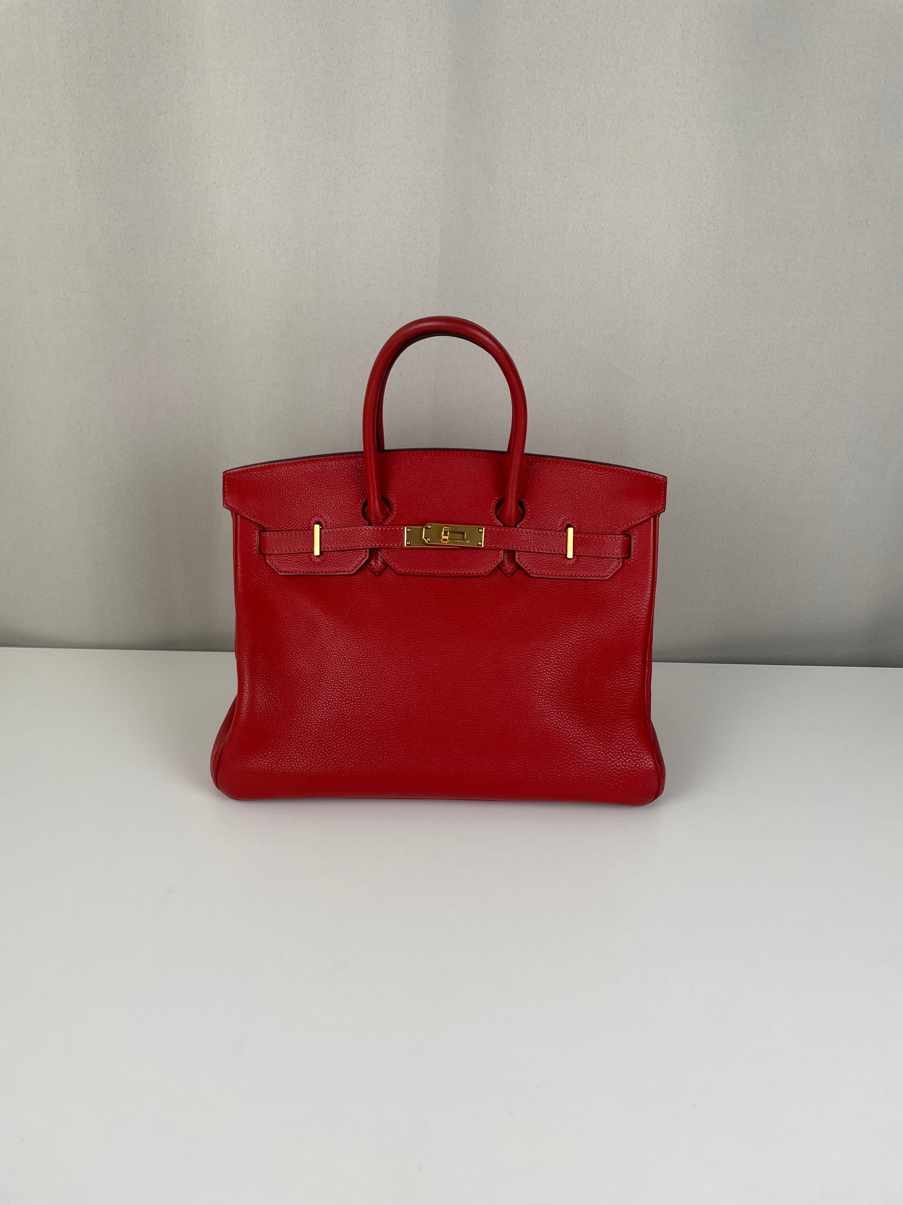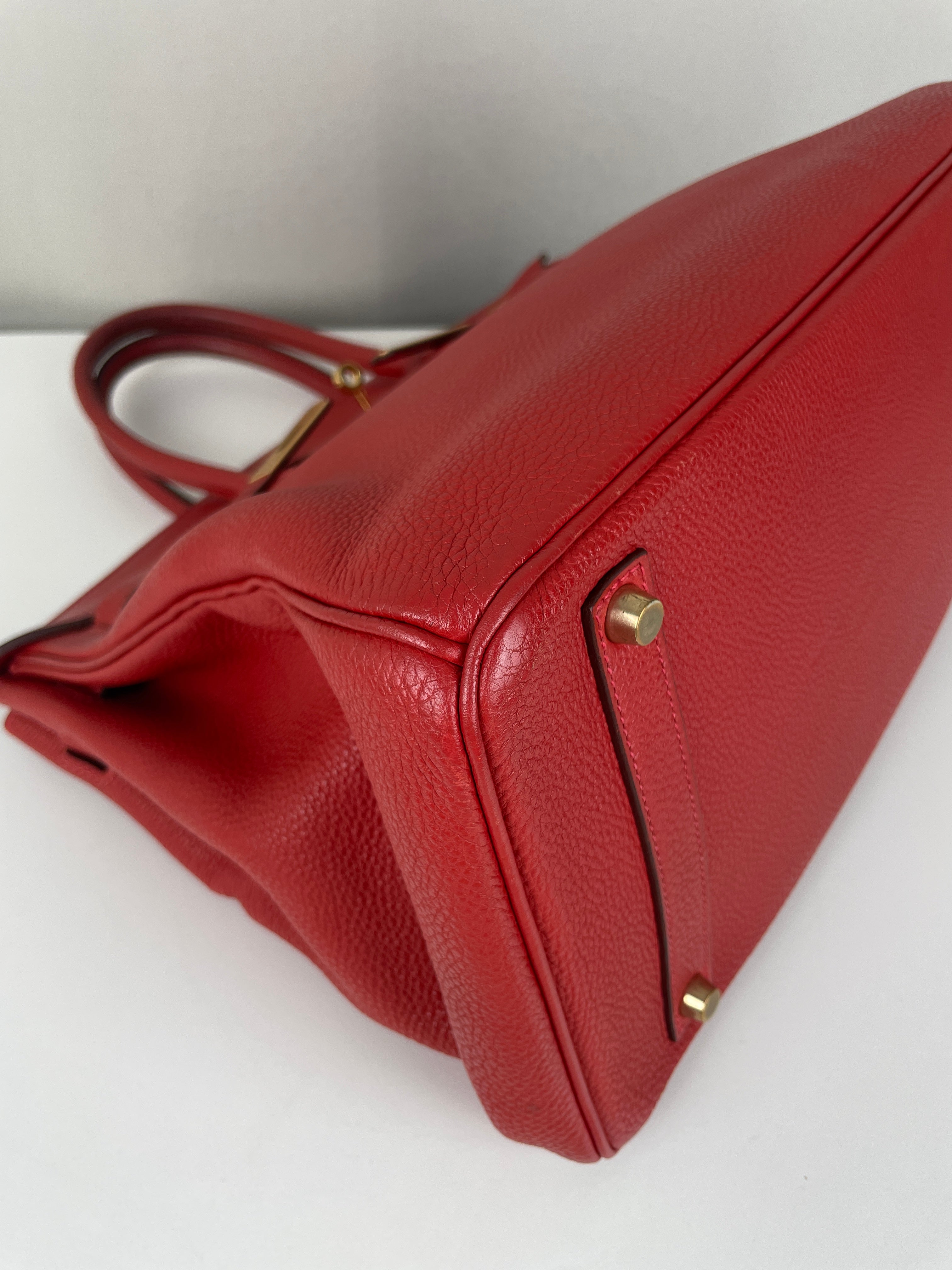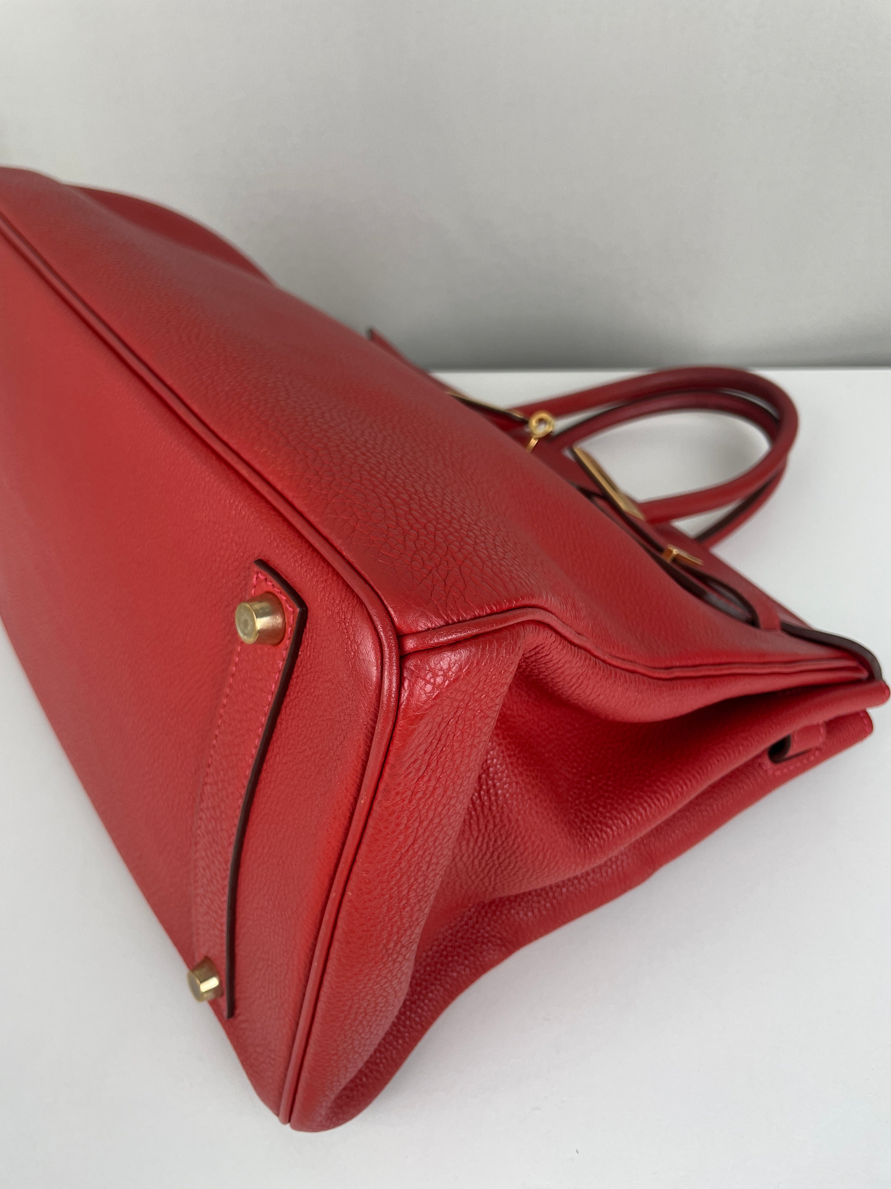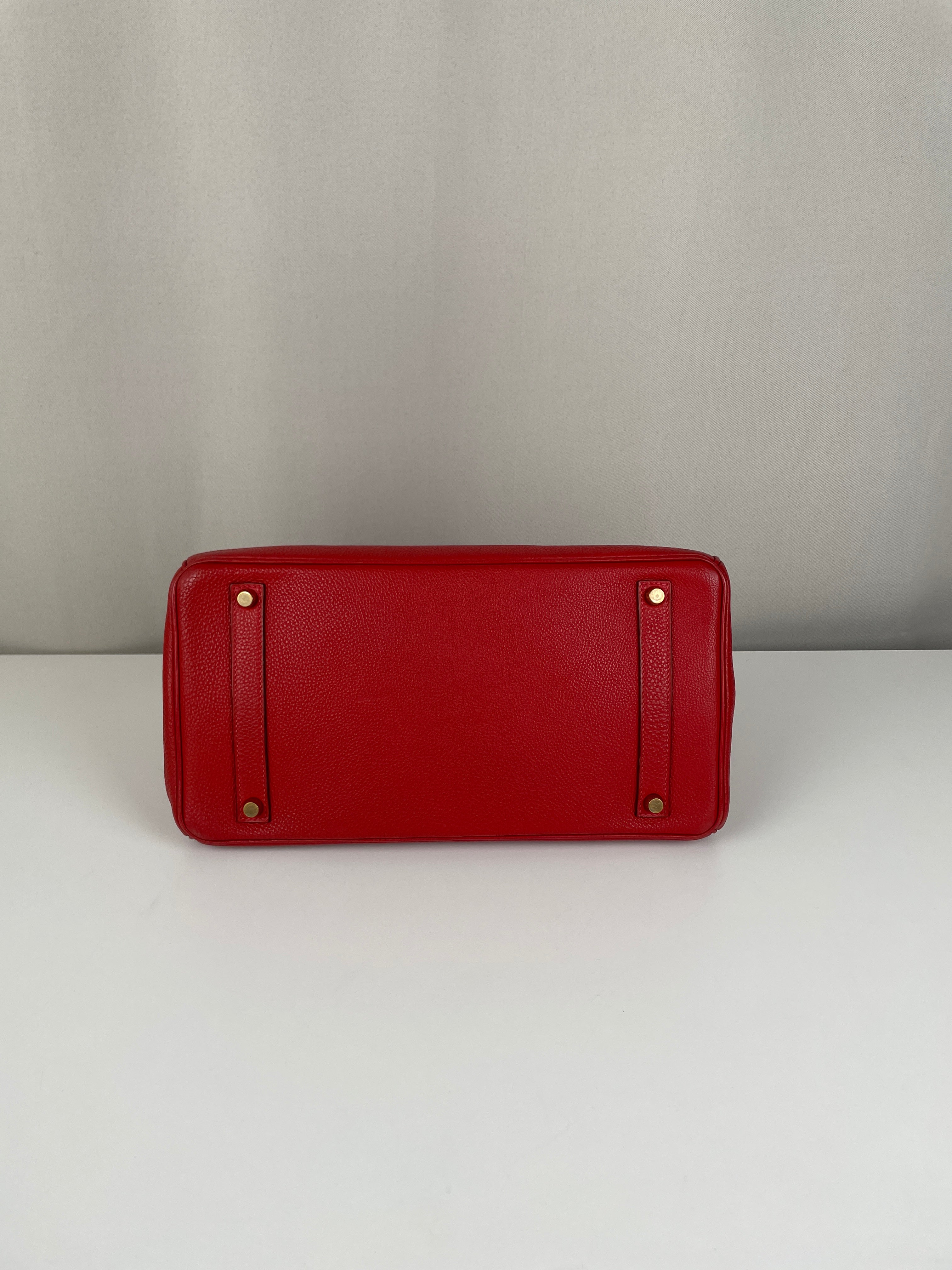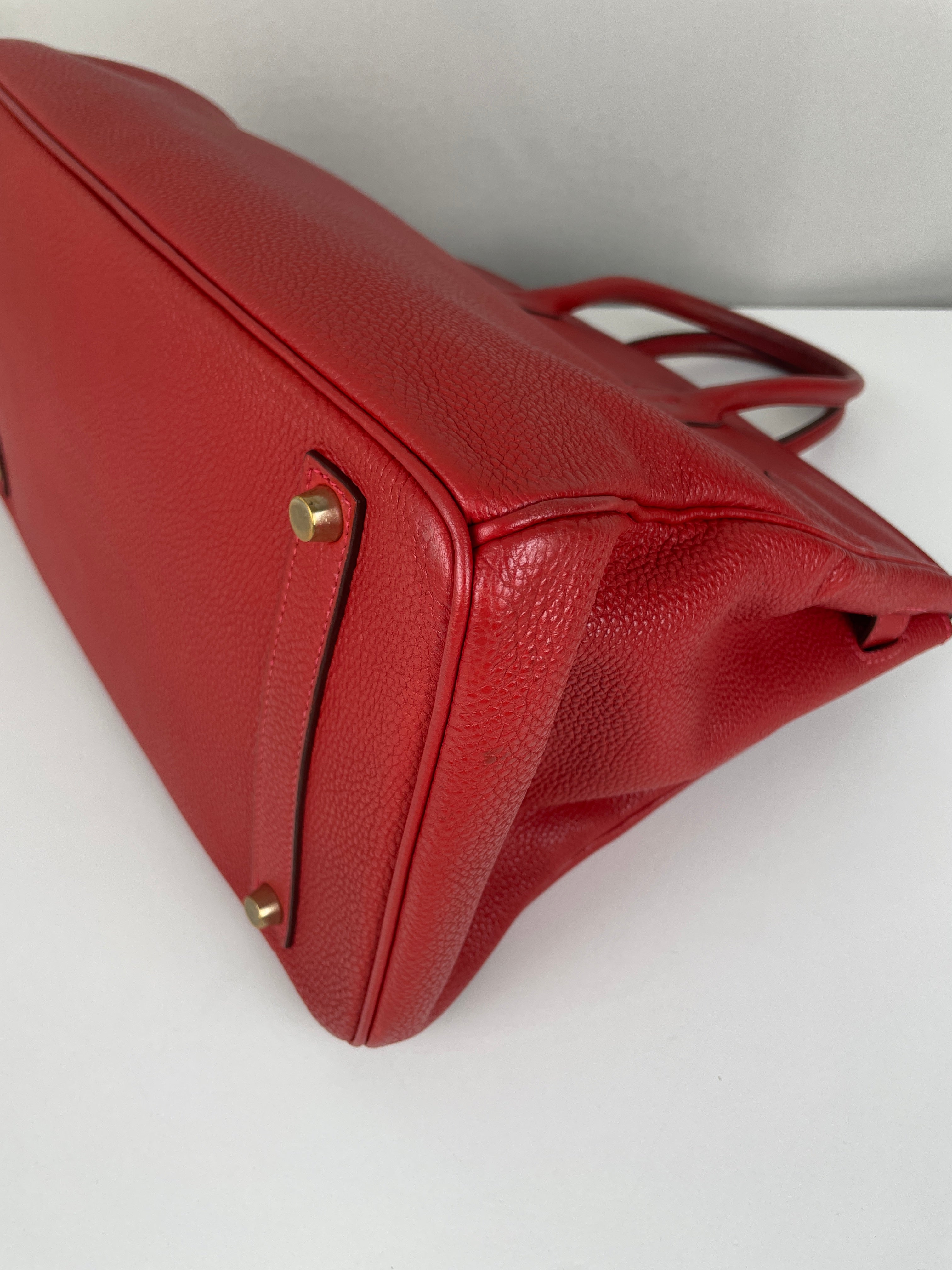 This elegant Hermès Birkin 35 red togo leather and gold hardware handbag is in good condition. The two leather handles are in very good condition. The leather is in very good condition you can see some sign of wear in general, and in one part on the front side some wrinkles very natural. Corners are in very good condition. The interior has some trace of wear, more in the pocket but it's in the inside. The hardware is in perfect condition, with the protective stickers as it was changed by Hermès. The leather parts of the bag on the side where you can close the bag has minor signs of wear. The bag went to the Hermès spa before selling.
