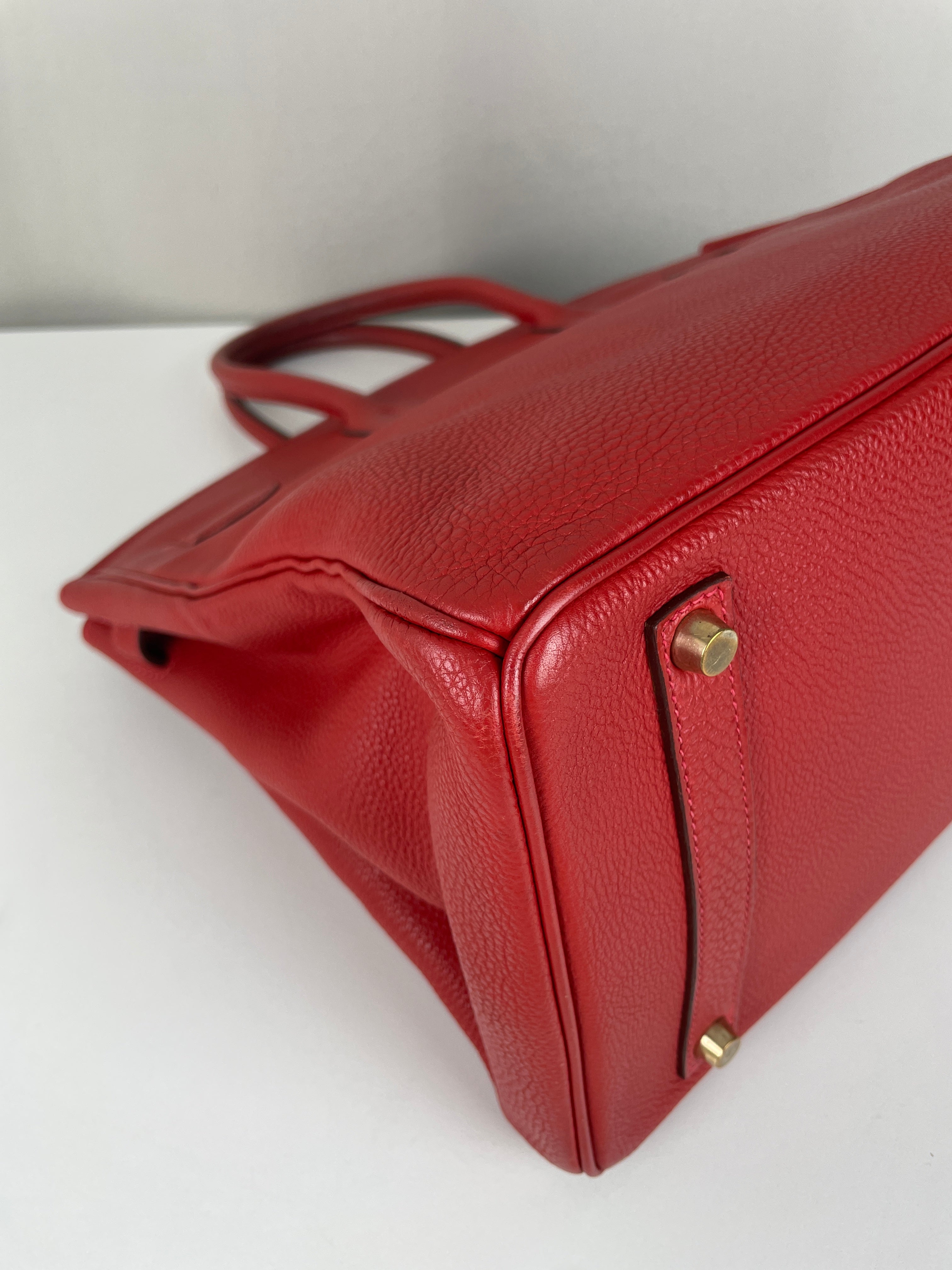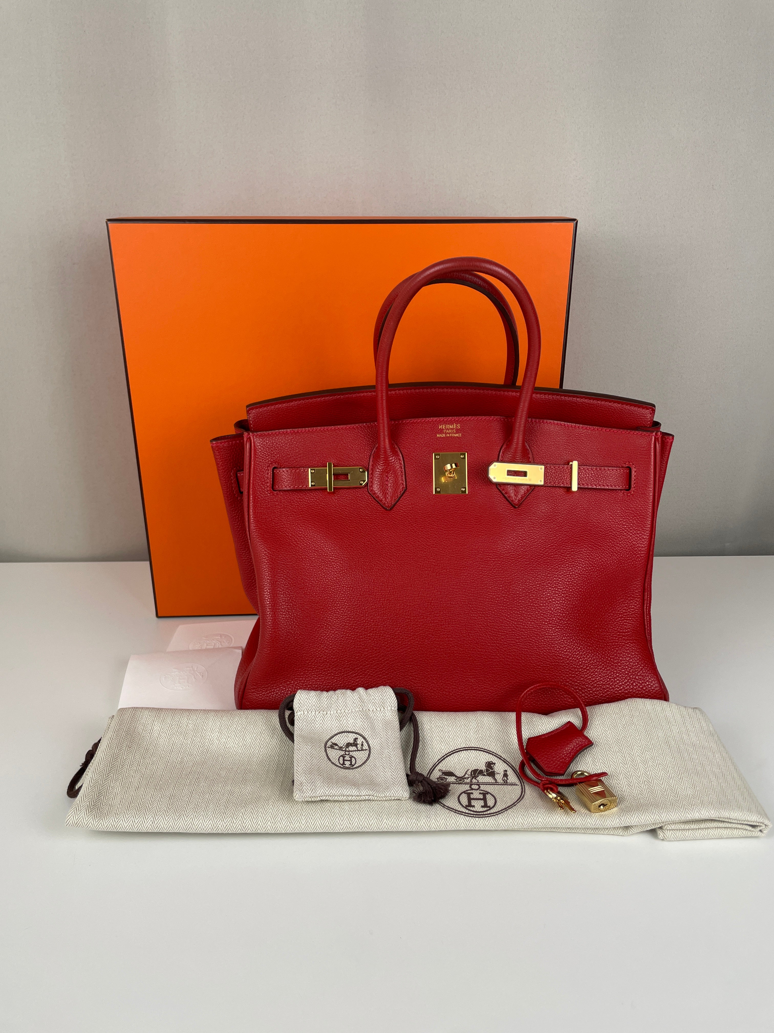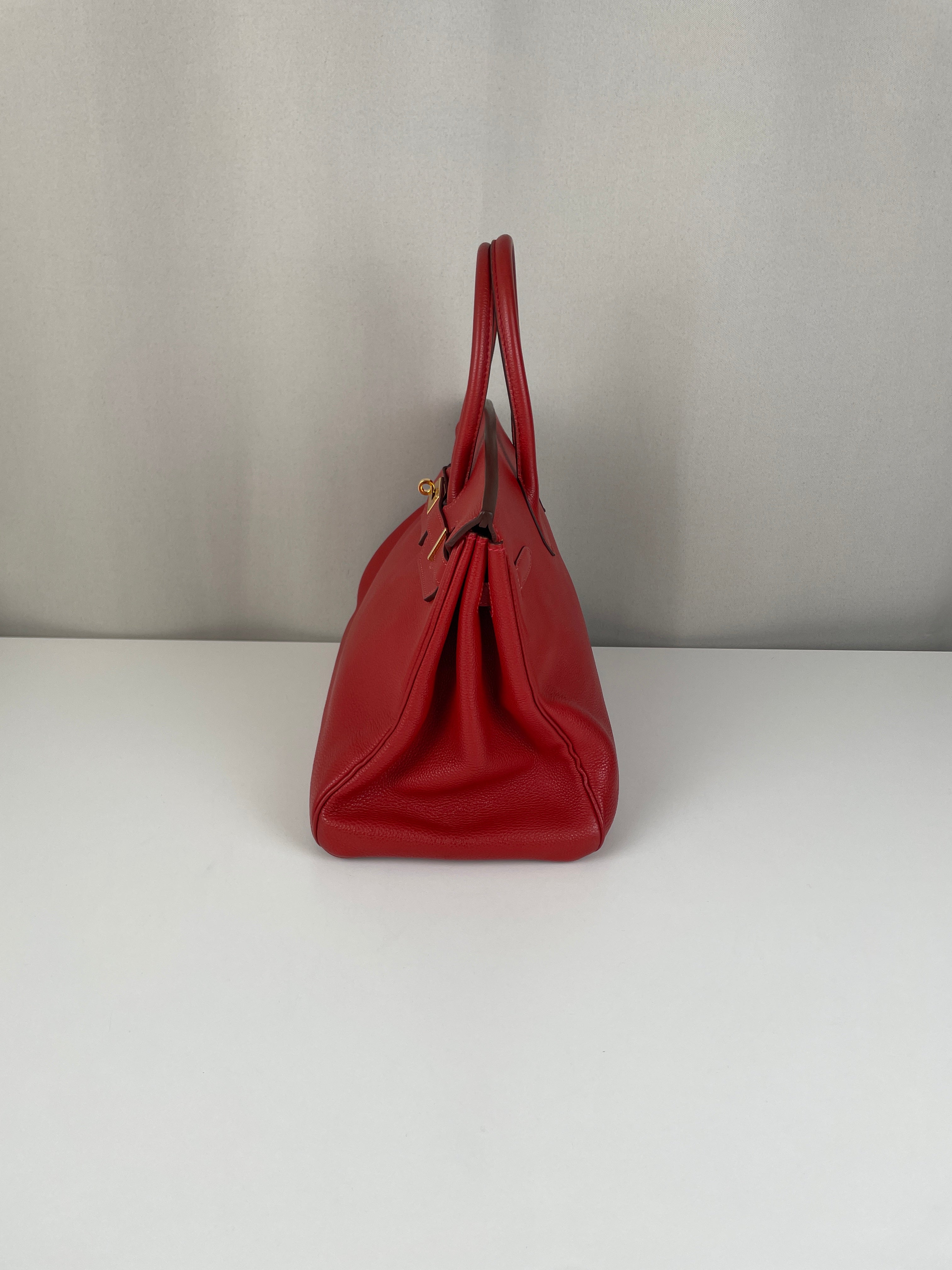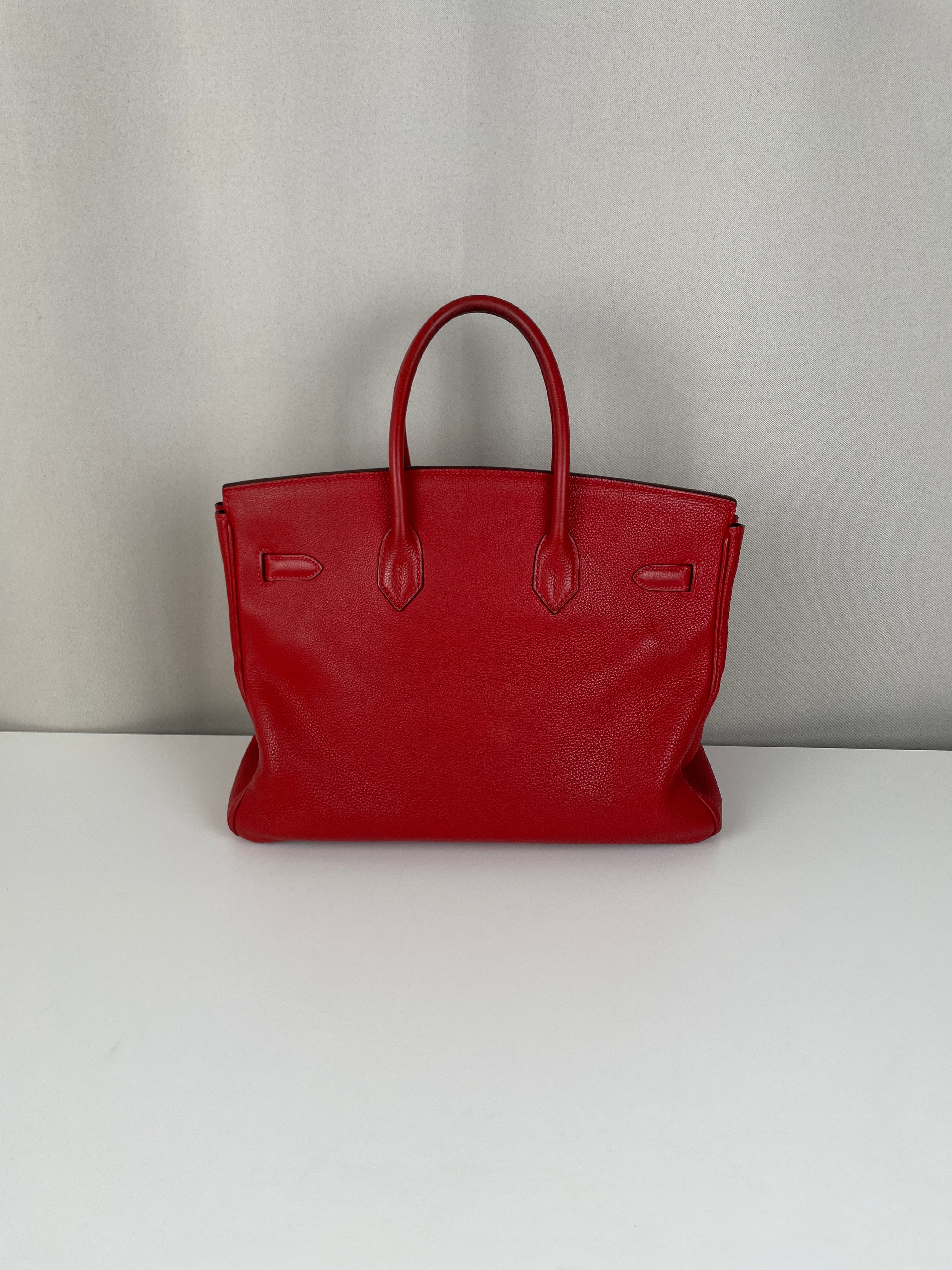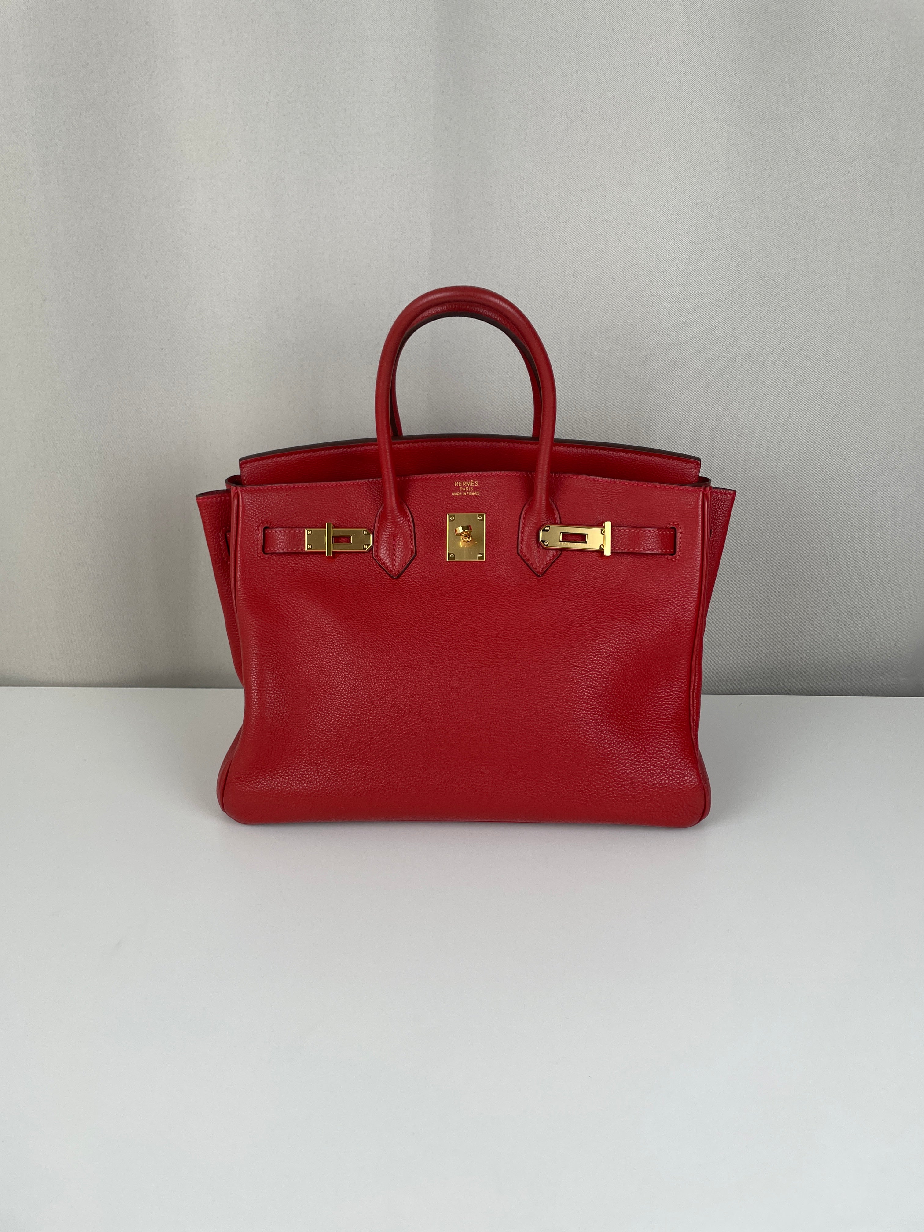 This elegant Hermès Birkin 35 red togo leather and gold hardware handbag is in good condition. The two leather handles are in very good condition. The leather is in very good condition you can see some sign of wear in general, and in one part on the front side some wrinkles very natural. Corners are in very good condition. The interior has some trace of wear, more in the pocket but it's in the inside. The hardware is in perfect condition, with the protective stickers as it was changed by Hermès. The leather parts of the bag on the side where you can close the bag has minor signs of wear. The bag went to the Hermès spa before selling.