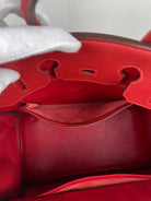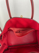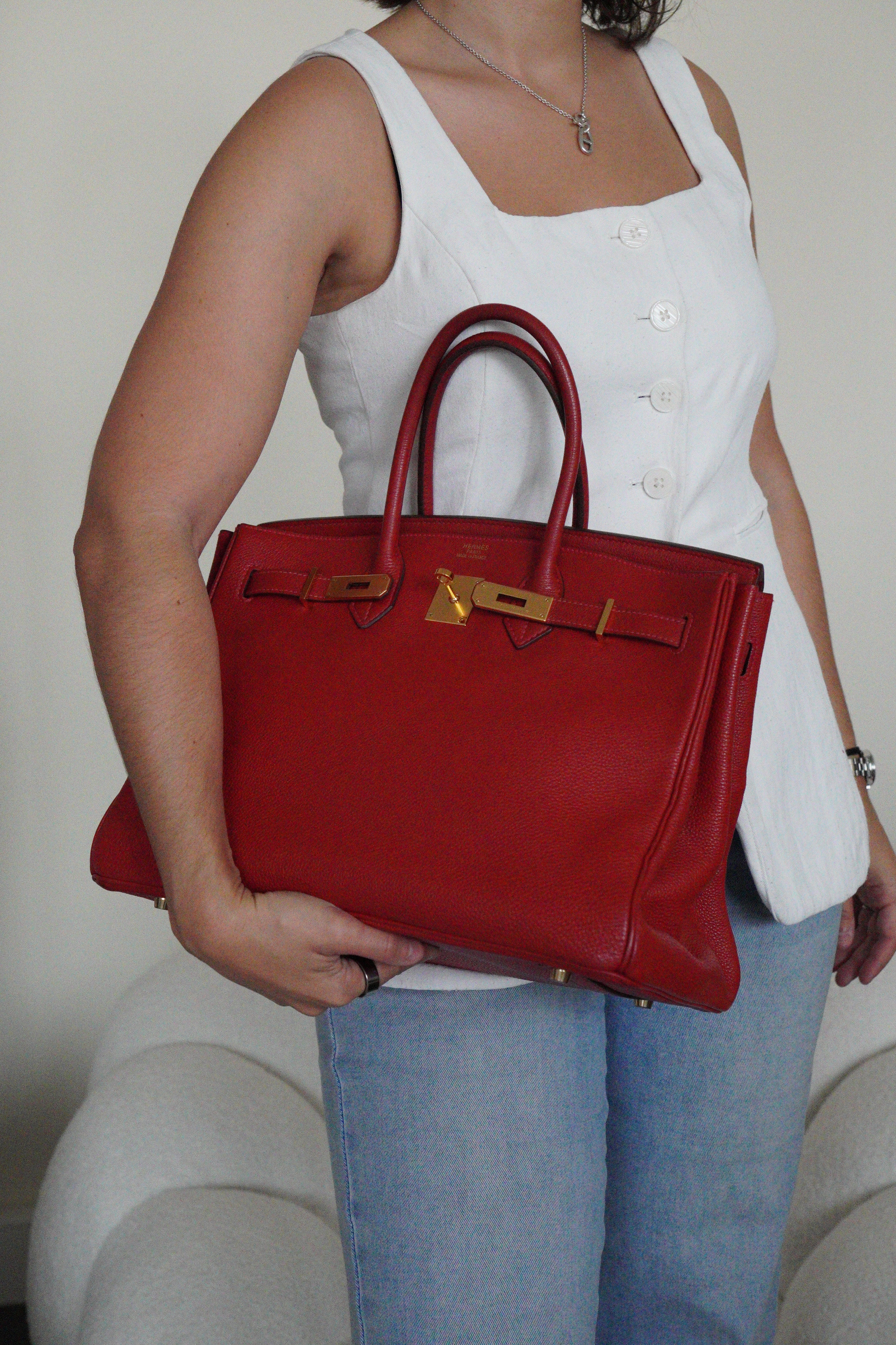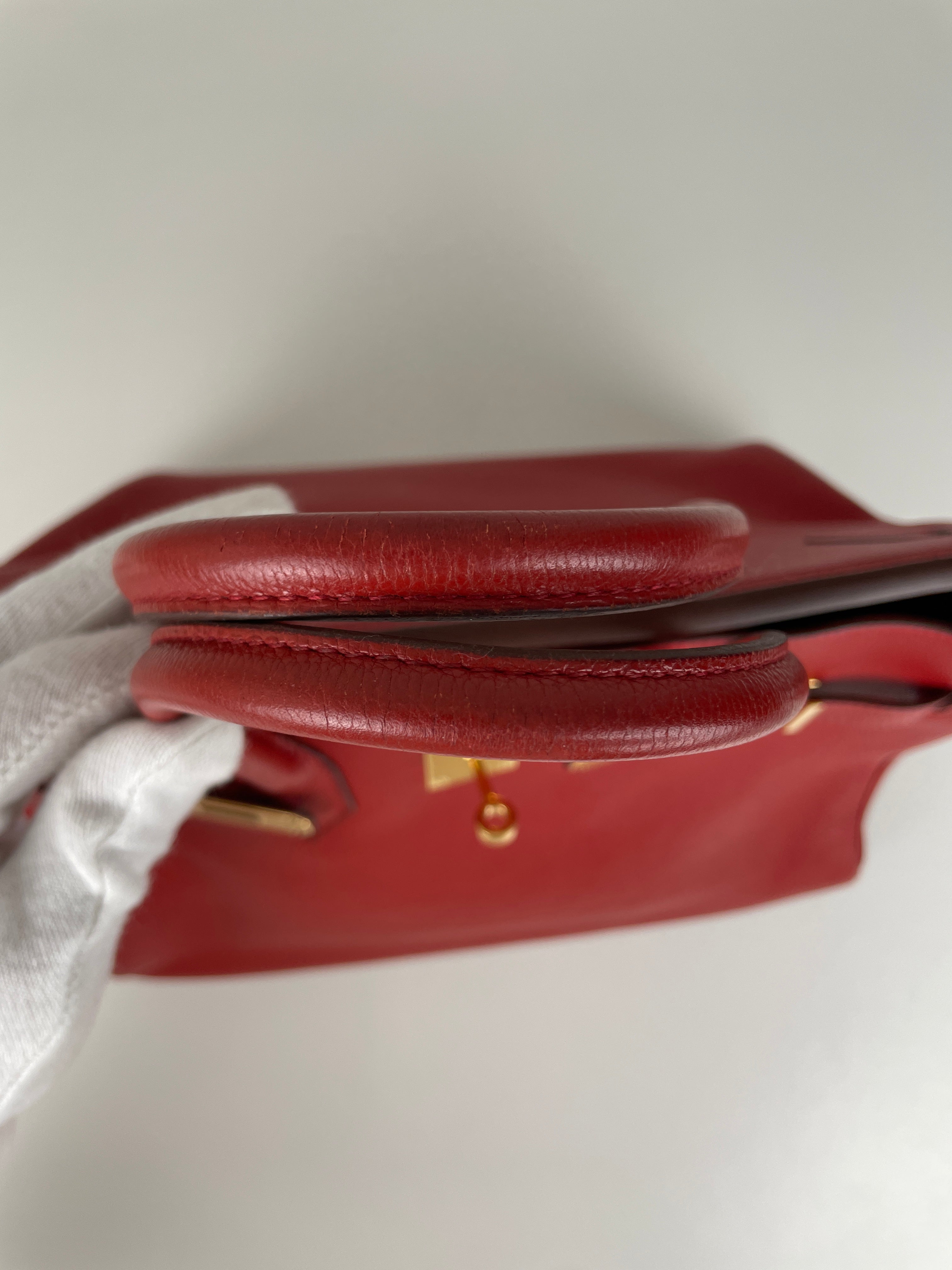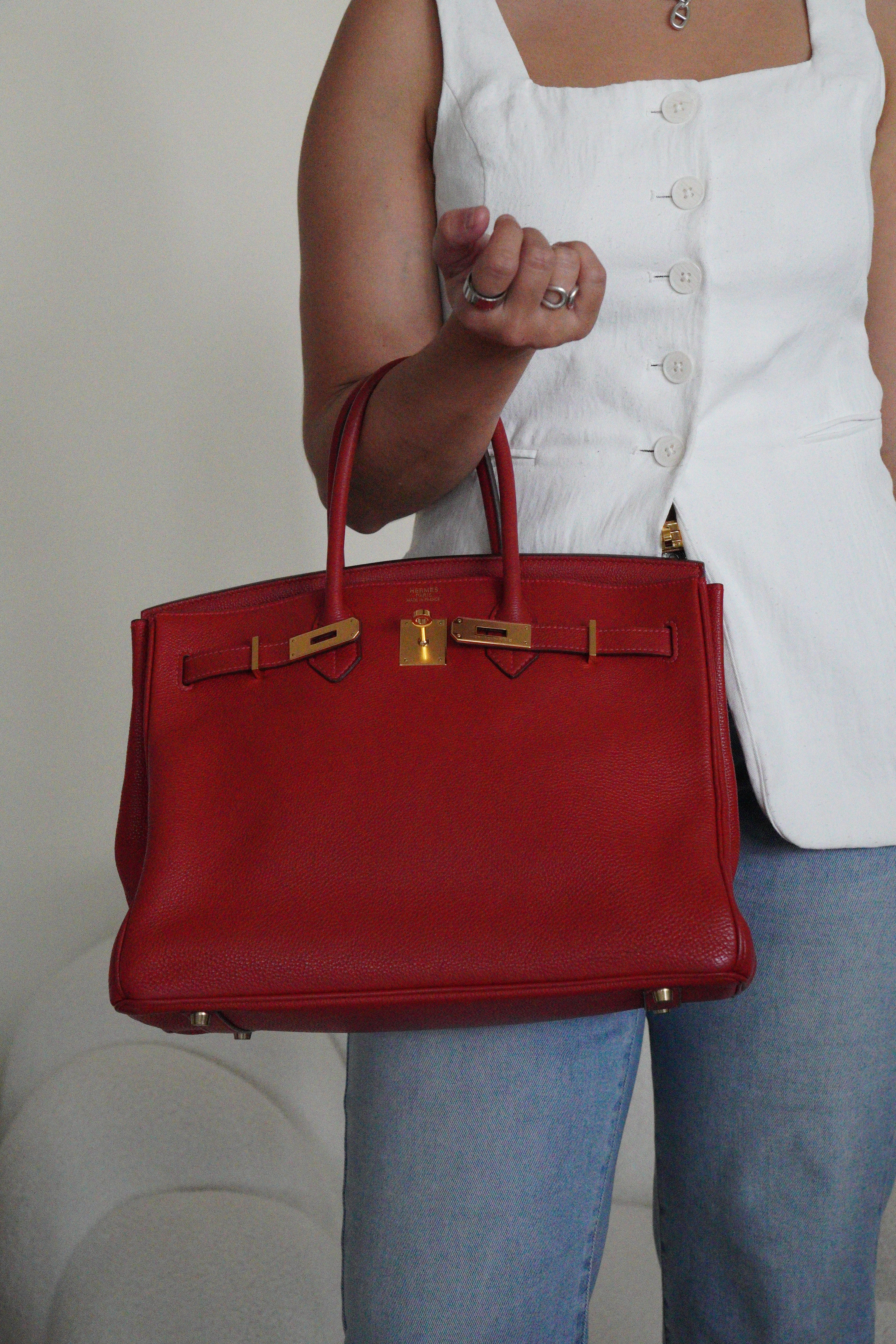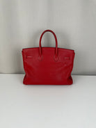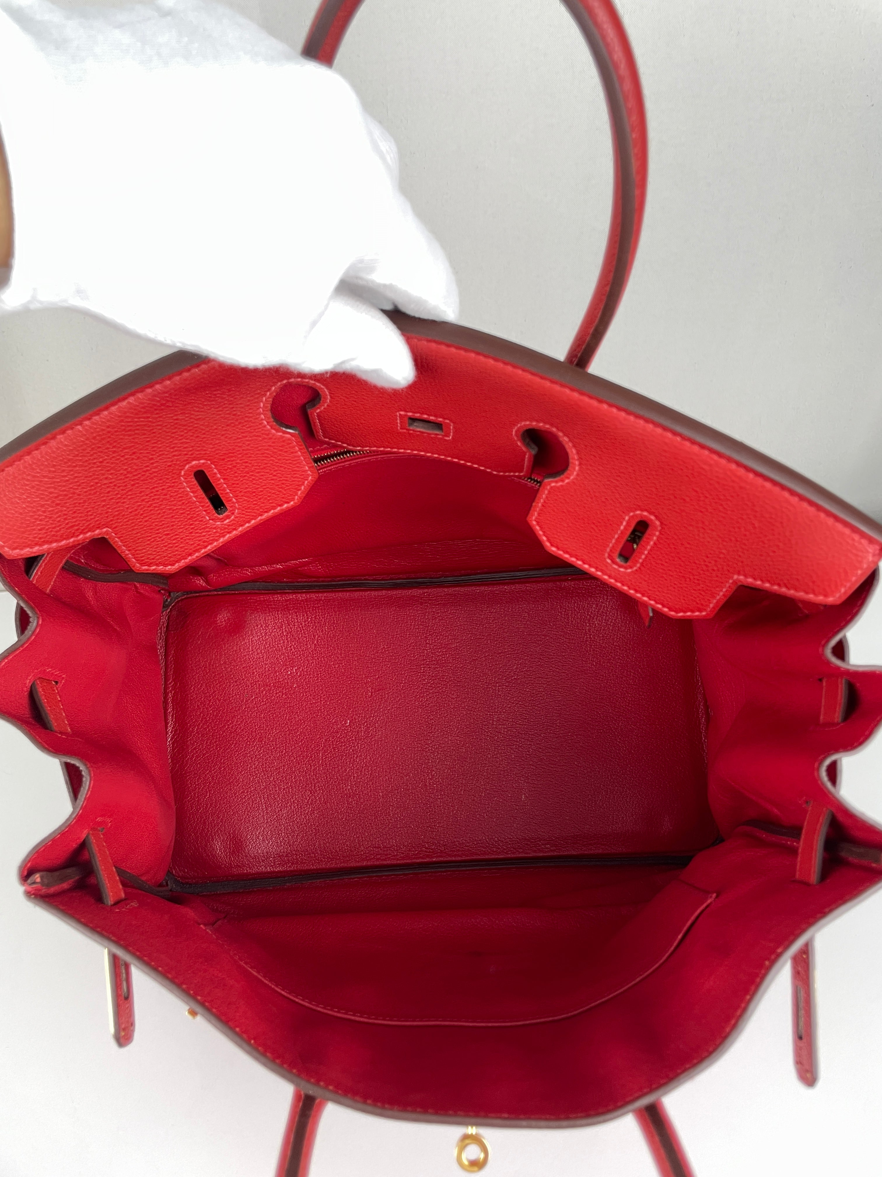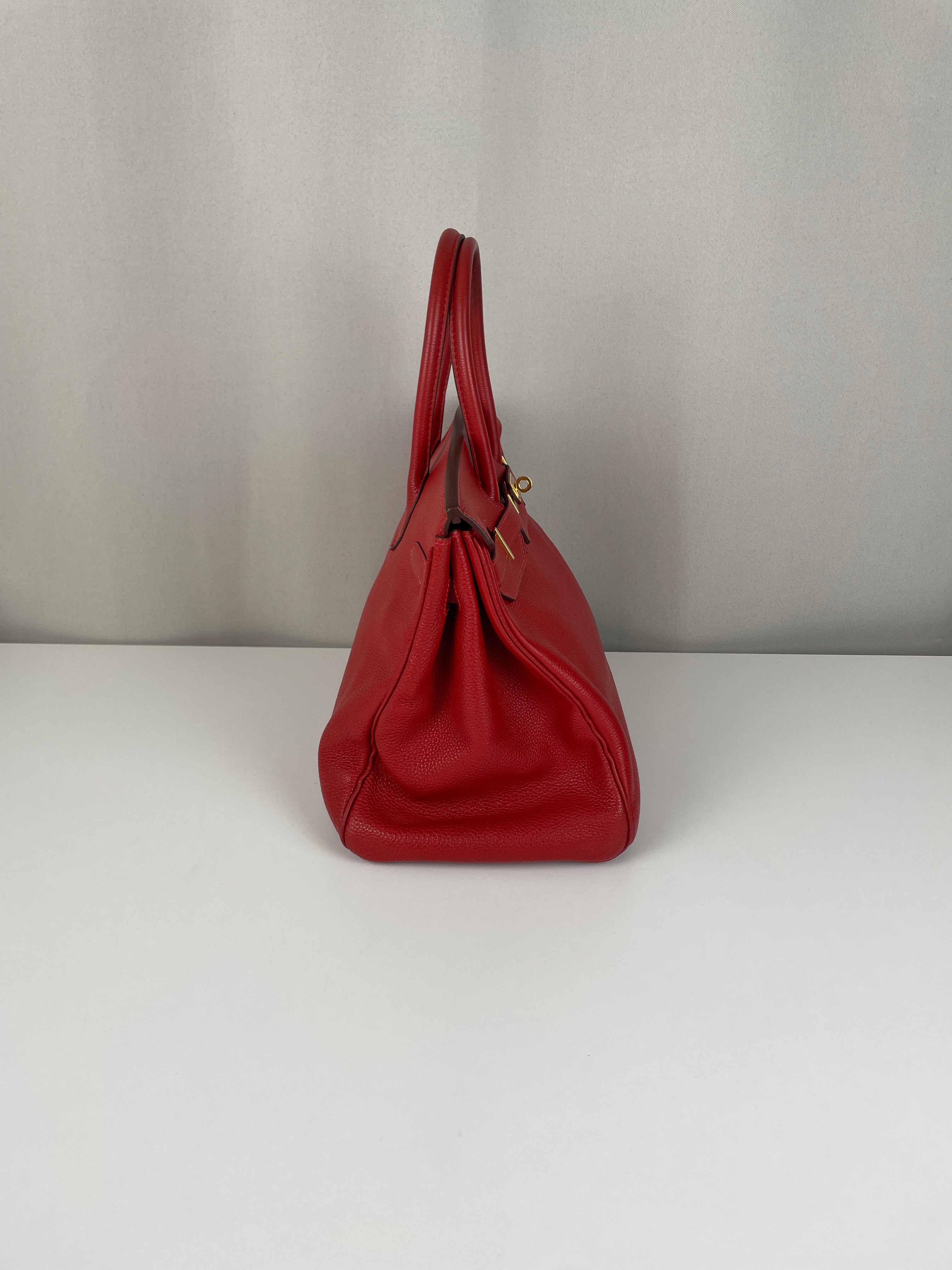 This elegant Hermès Birkin 35 red togo leather and gold hardware handbag is in good condition. The two leather handles are in very good condition. The leather is in very good condition you can see some sign of wear in general, and in one part on the front side some wrinkles very natural. Corners are in very good condition. The interior has some trace of wear, more in the pocket but it's in the inside. The hardware is in perfect condition, with the protective stickers as it was changed by Hermès. The leather parts of the bag on the side where you can close the bag has minor signs of wear. The bag went to the Hermès spa before selling.